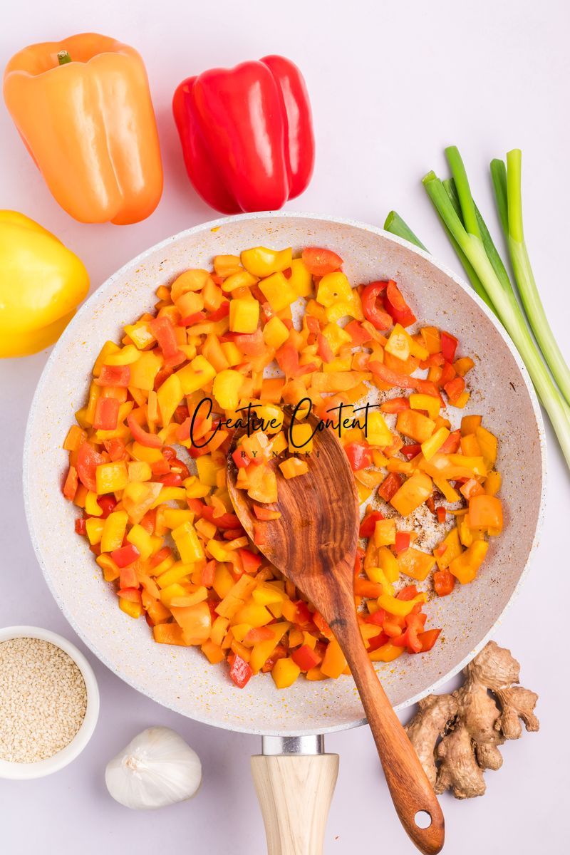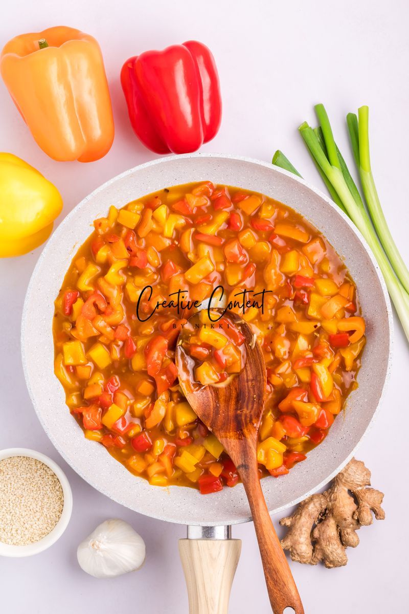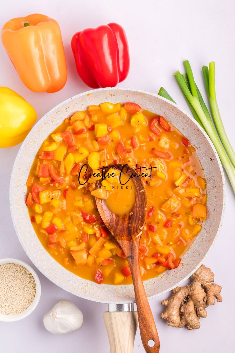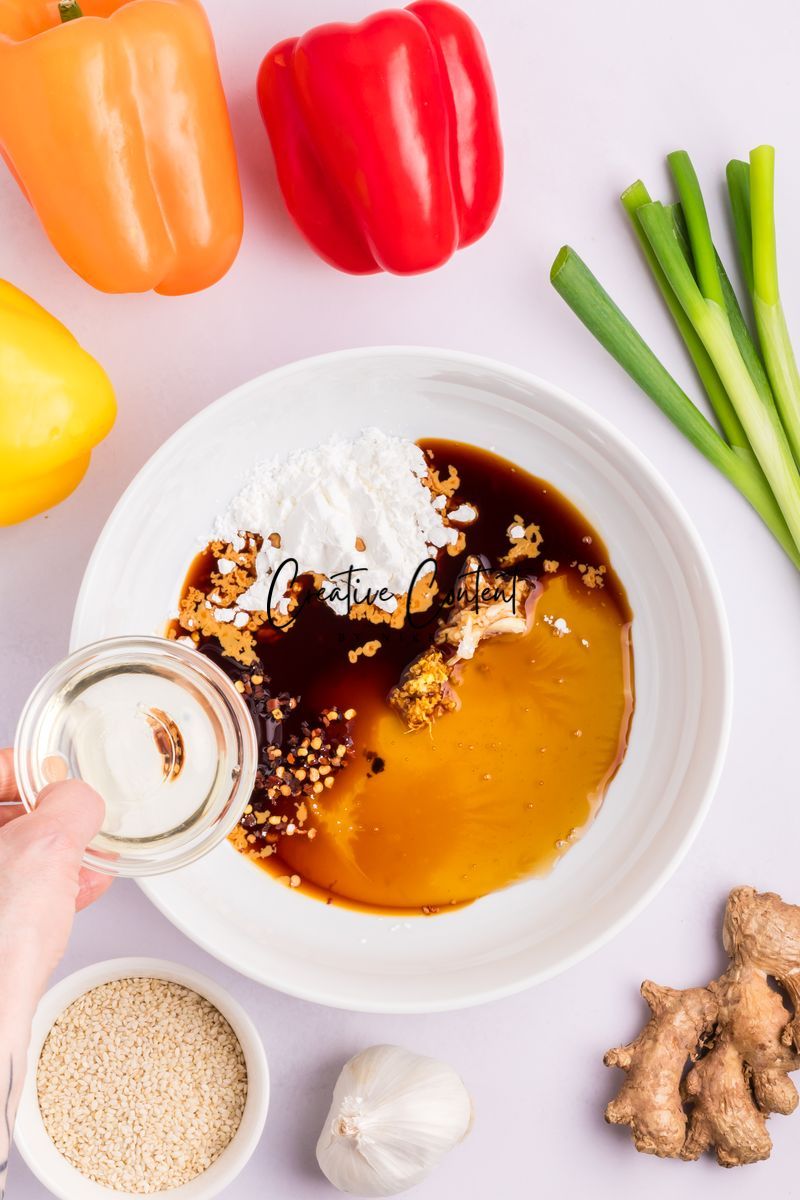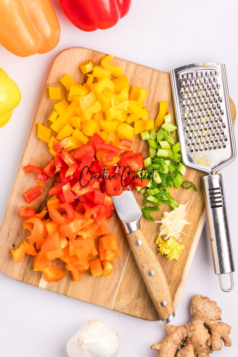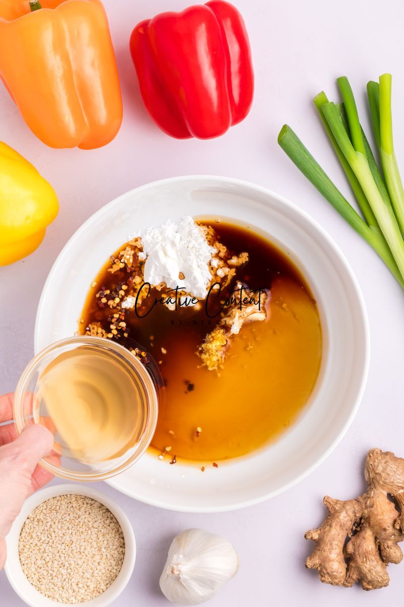 - Featured Ingredients; pineapple juice, chicken stock, soy sauce, honey, rice vinegar, garlic clove, ginger, red pepper flakes, water cornstarch, avocado oil, boneless skinless chicken, coarse kosher salt, black pepper, red, orange, and yellow bell peppers, and pineapple chunks.
