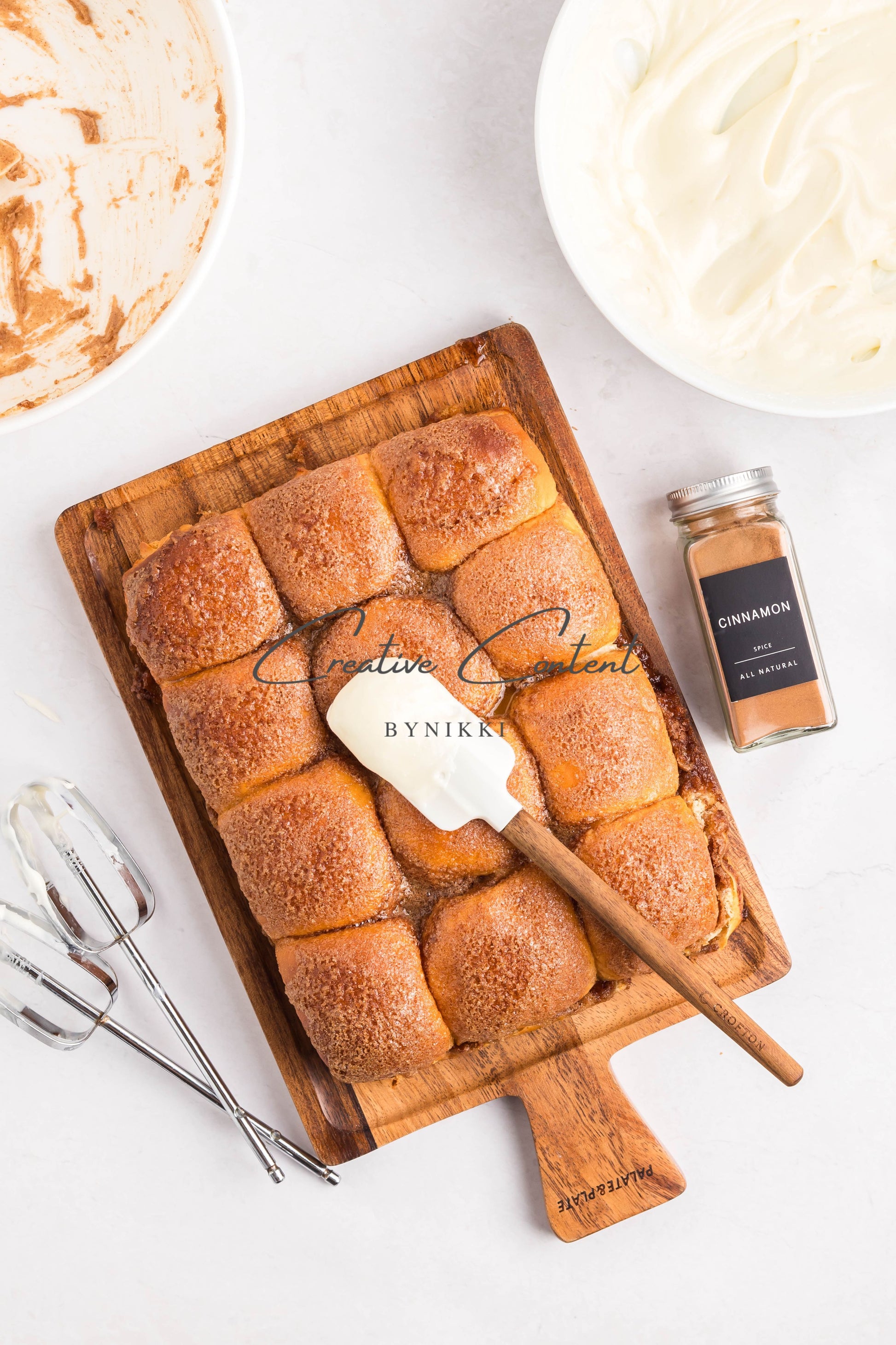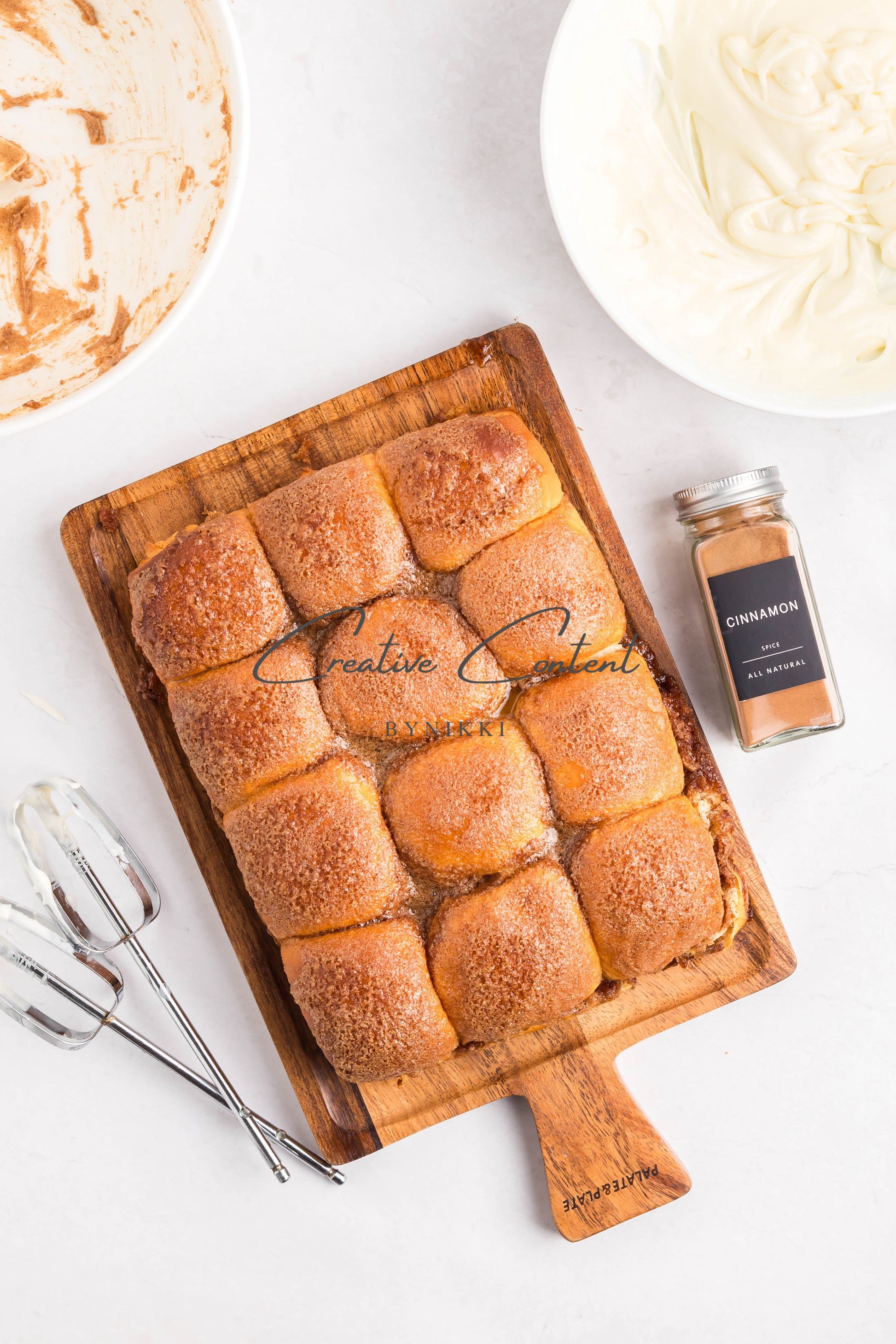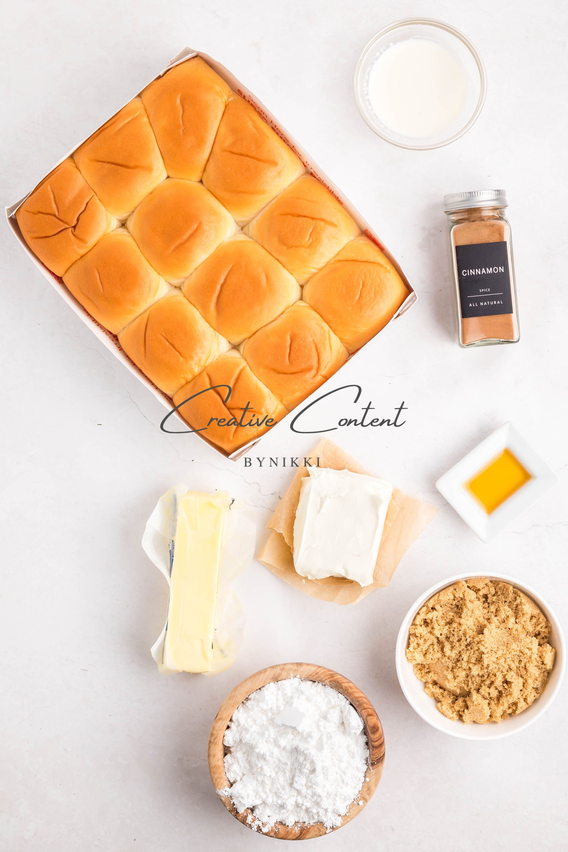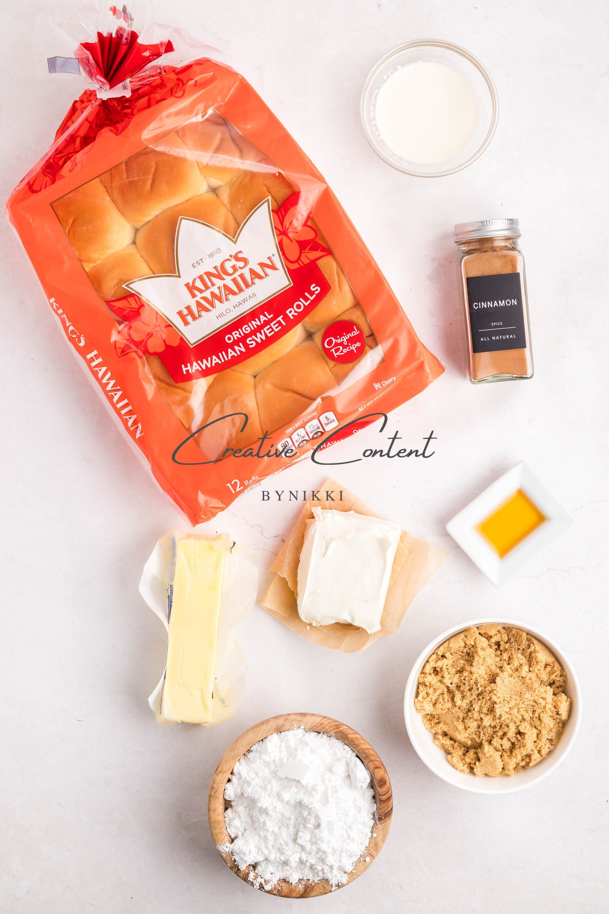 - Ingredients: salted butter, brown sugar, cinnamon, vanilla extract, Hawaiian rolls, cream cheese, heavy cream, powdered sugar