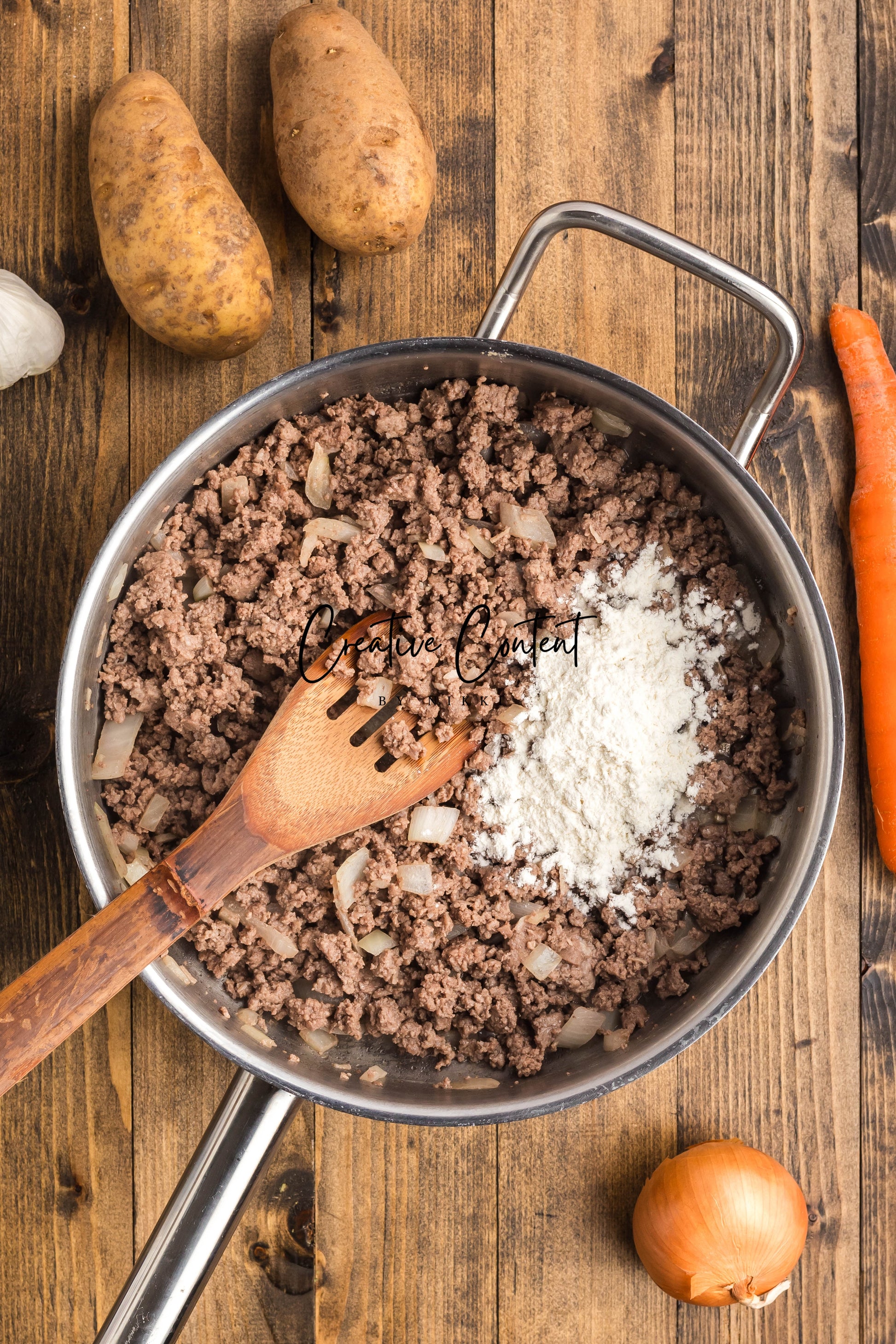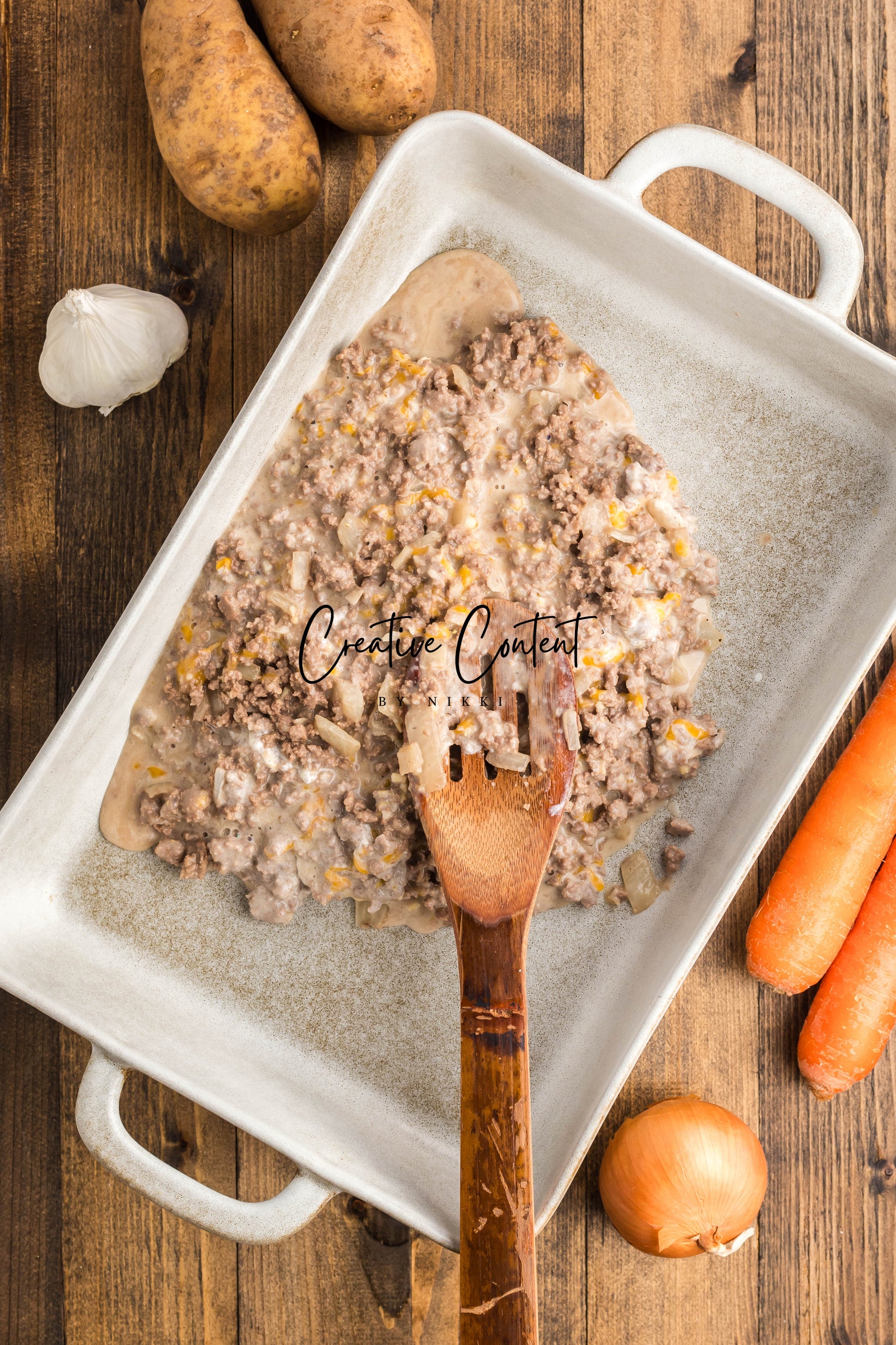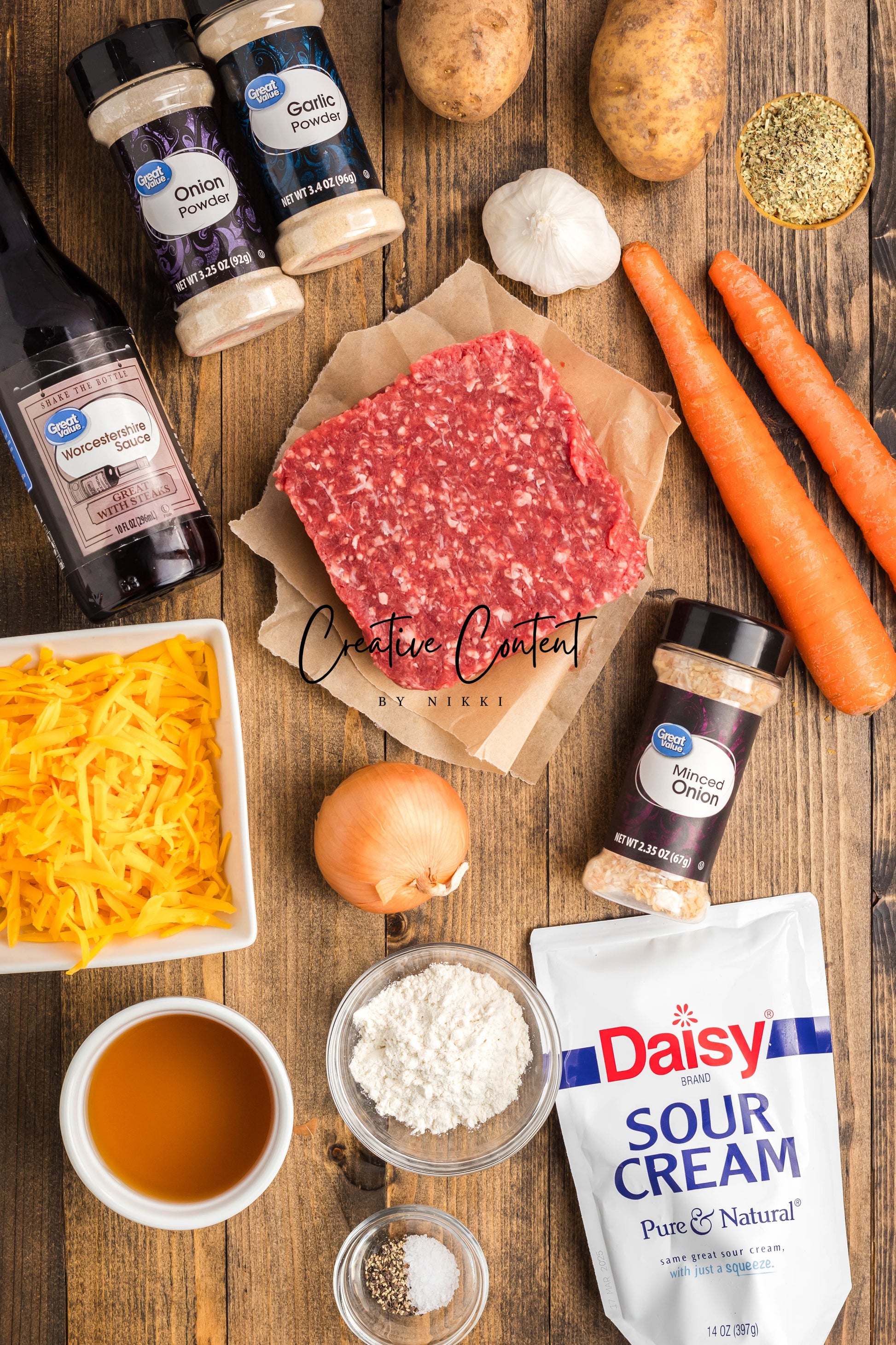 - Ingredients: ground beef, yellow onion, garlic, all-purpose flour, beef broth, dried onion flakes, onion powder, garlic powder, Worcestershire sauce, kosher salt, black pepper, cheddar cheese, sour cream, russet potatoes, carrots.
