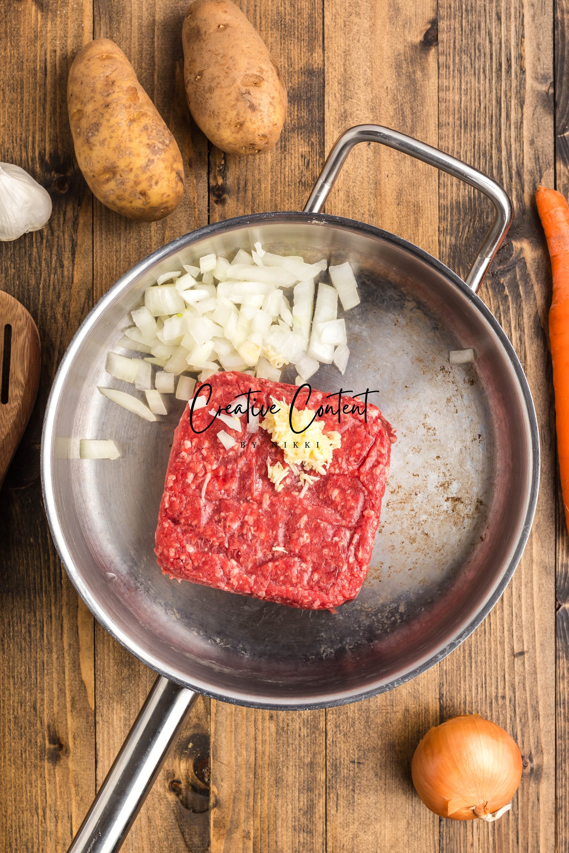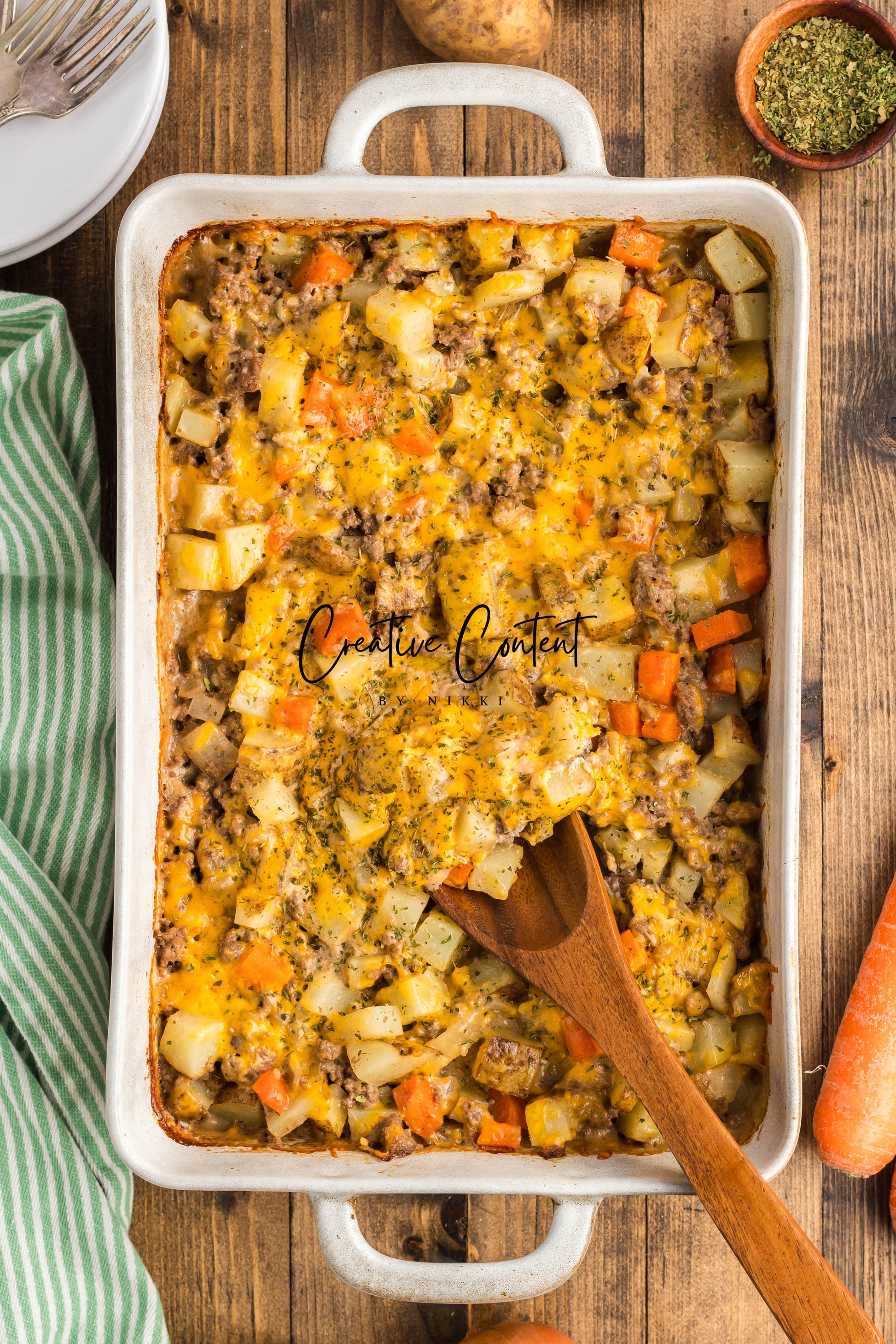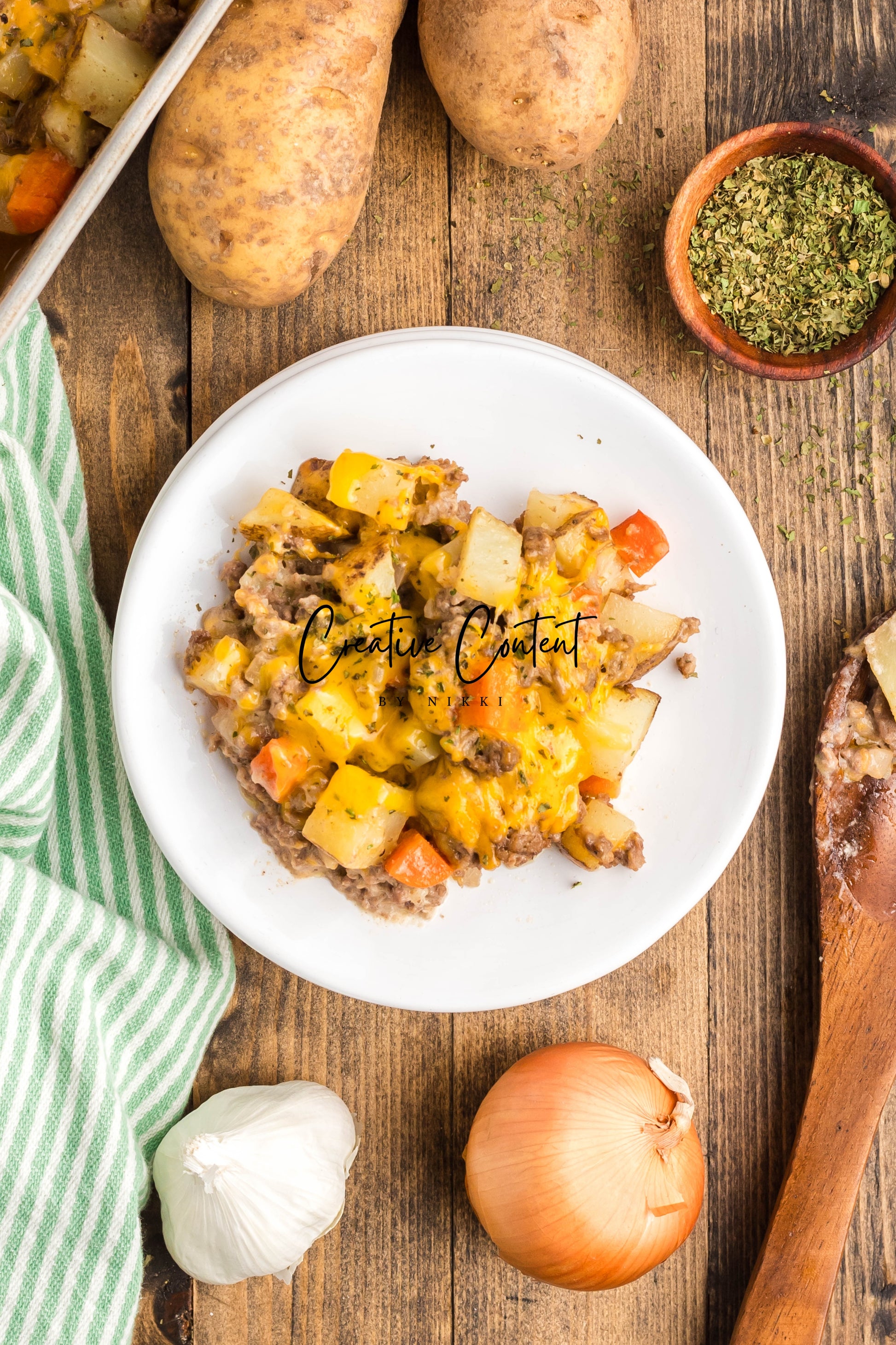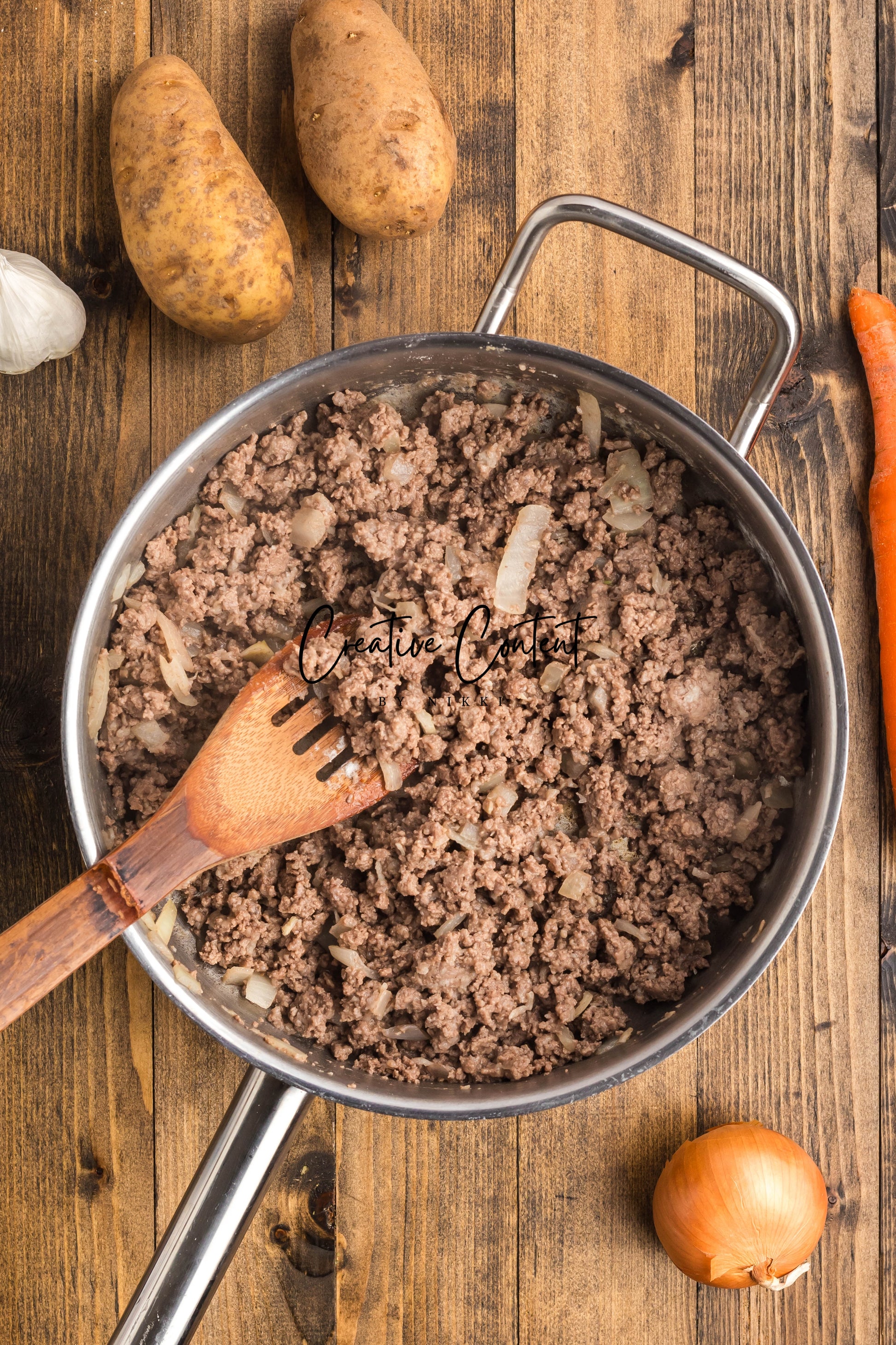 - Ingredients: ground beef, yellow onion, garlic, all-purpose flour, beef broth, dried onion flakes, onion powder, garlic powder, Worcestershire sauce, kosher salt, black pepper, cheddar cheese, sour cream, russet potatoes, carrots.