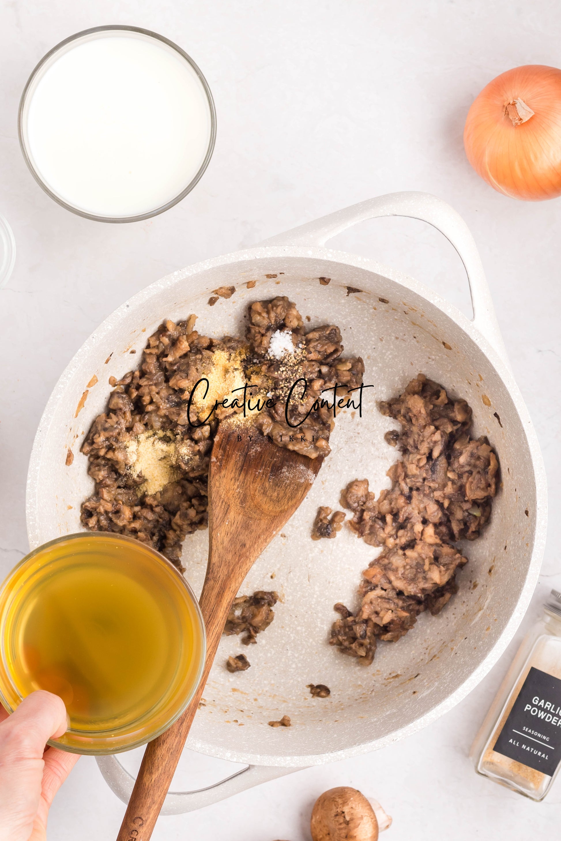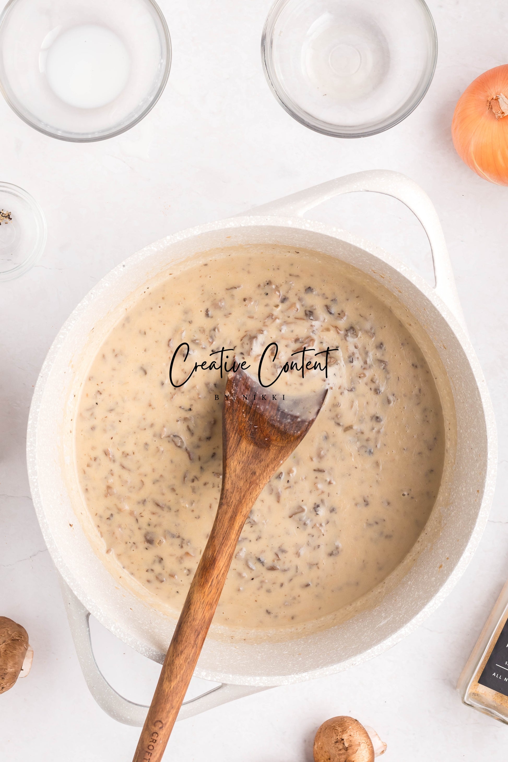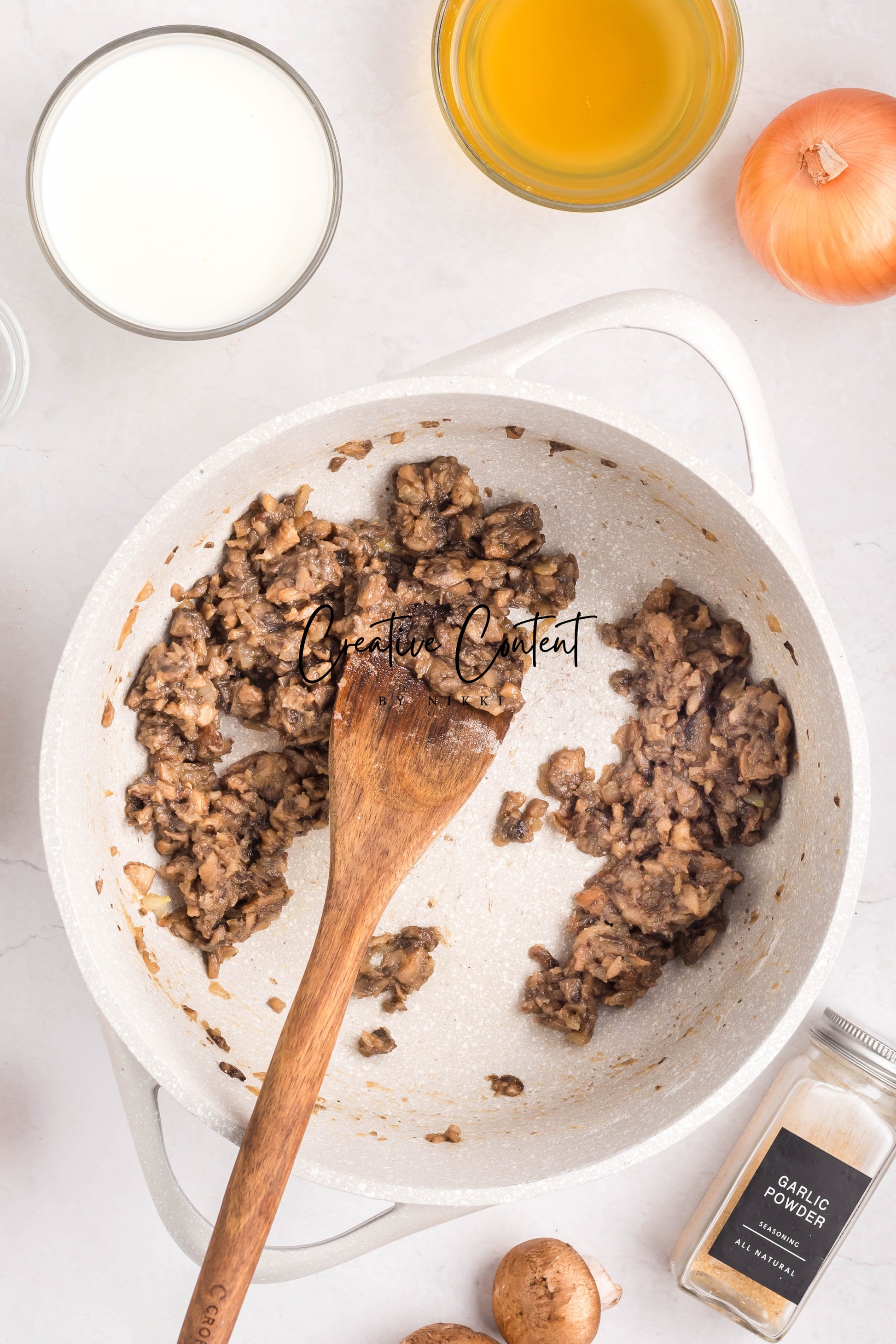 - Ingredients: Unsalted butter, baby bella mushrooms, yellow onion, all-purpose flour, minced onion, garlic powder, onion powder, salt, black pepper, chicken broth, milk.