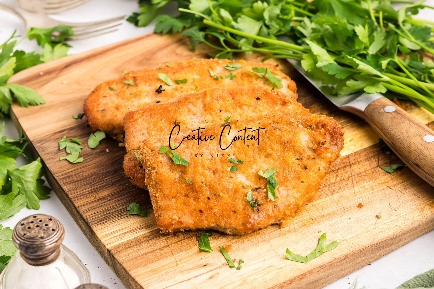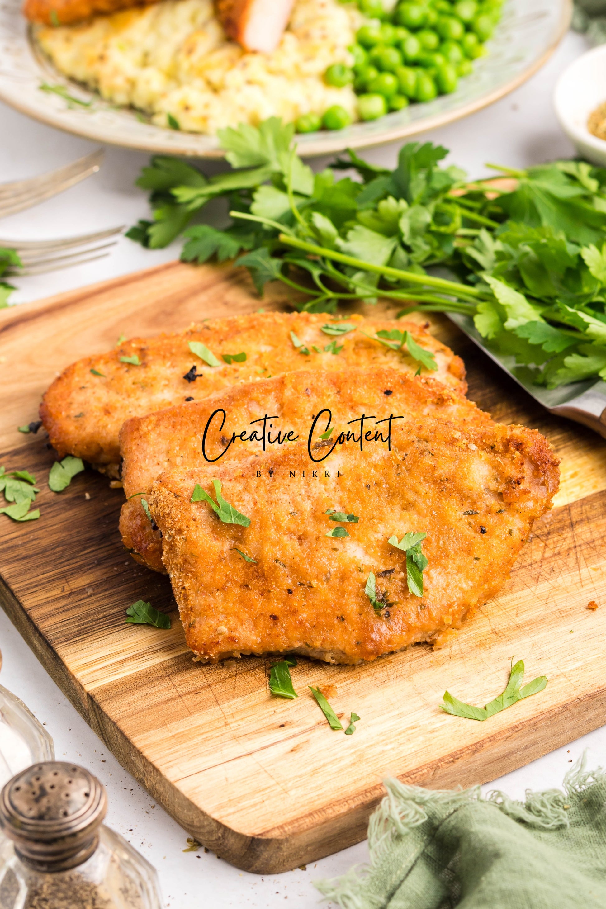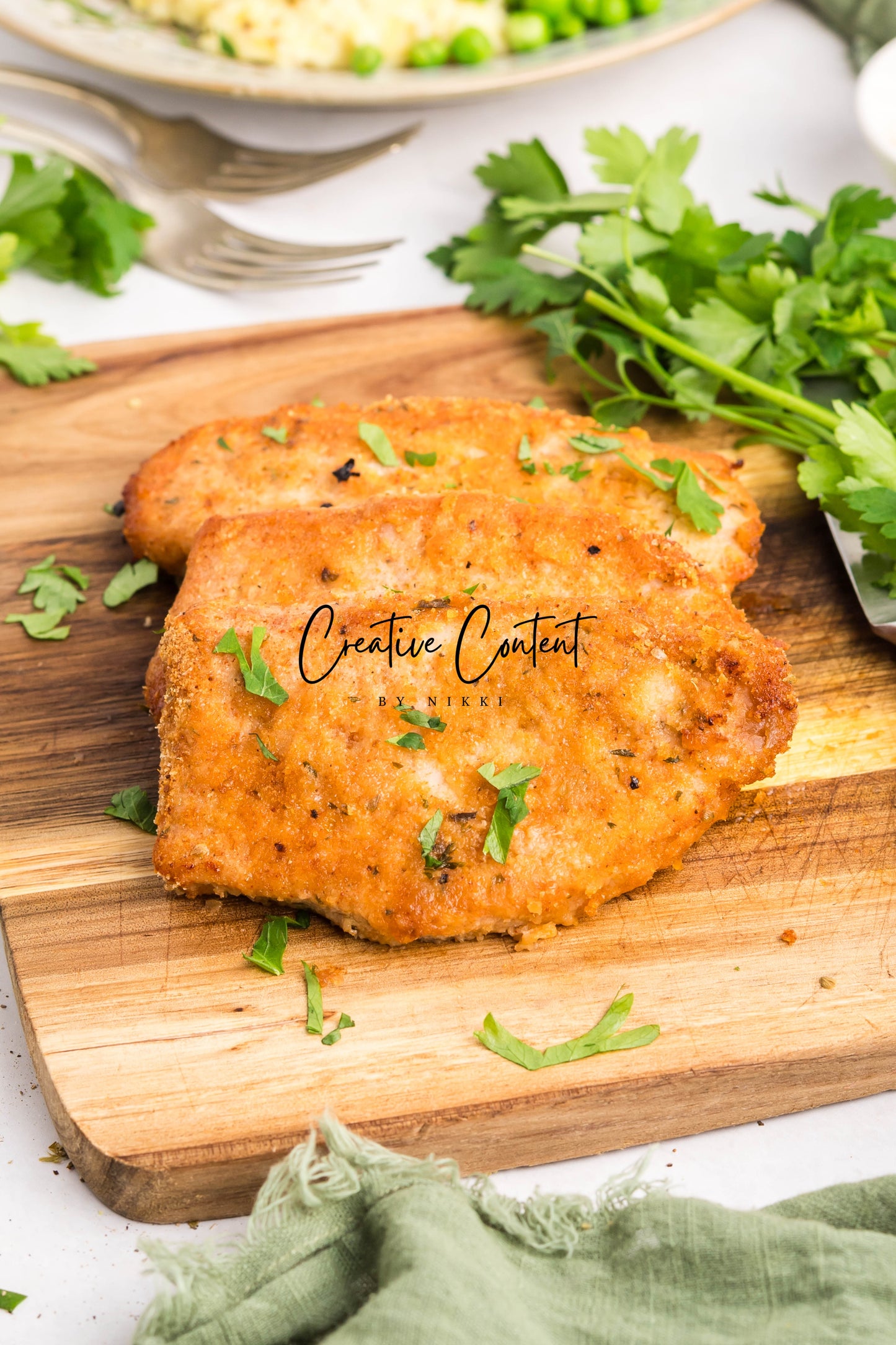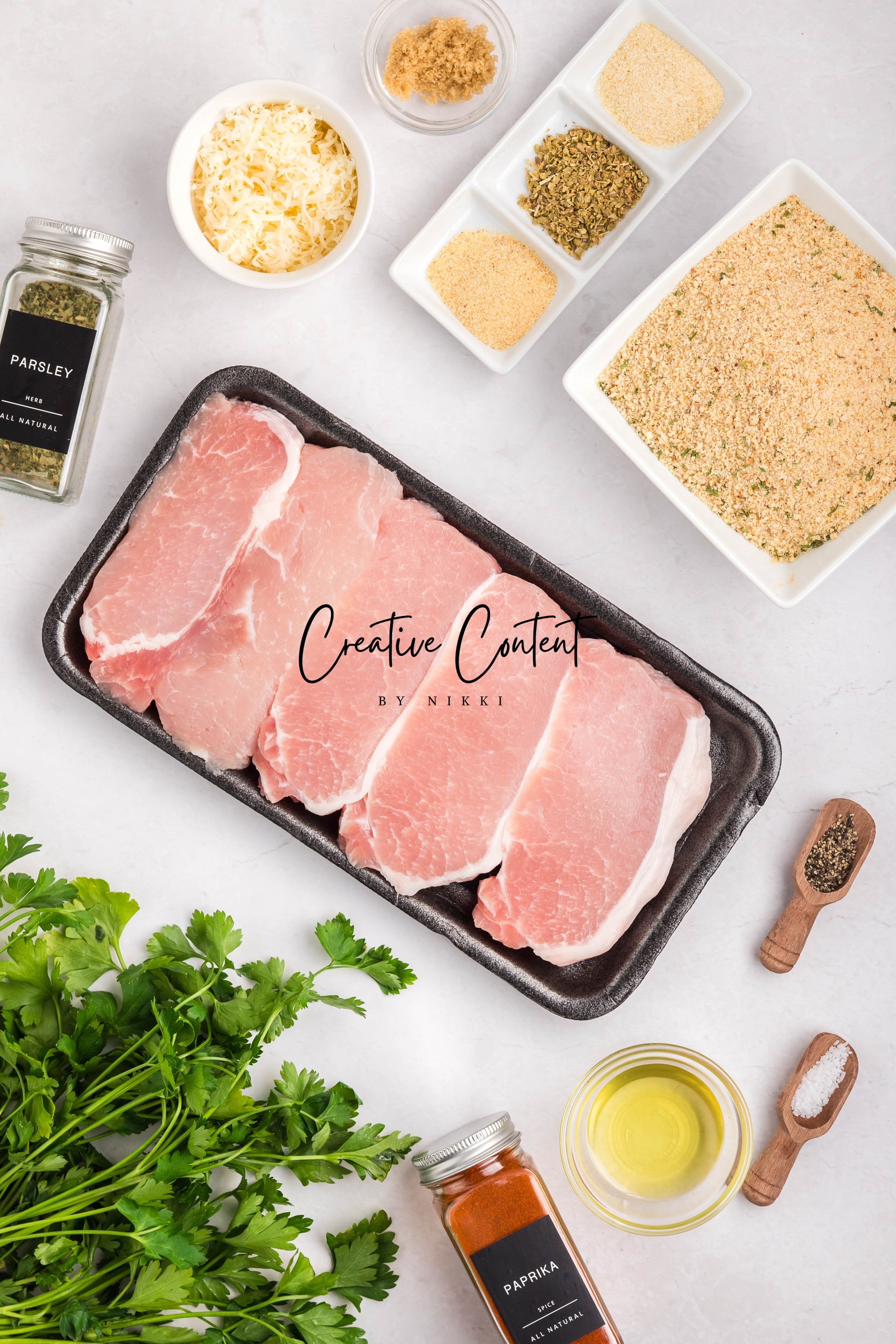 - Ingredients: Italian bread crumbs, parmesan breadcrumbs, avocado oil, paprika, light brown sugar, onion powder, garlic powder, dried oregano, dried parsley, coarse kosher salt, parsley, and boneless pork chops
