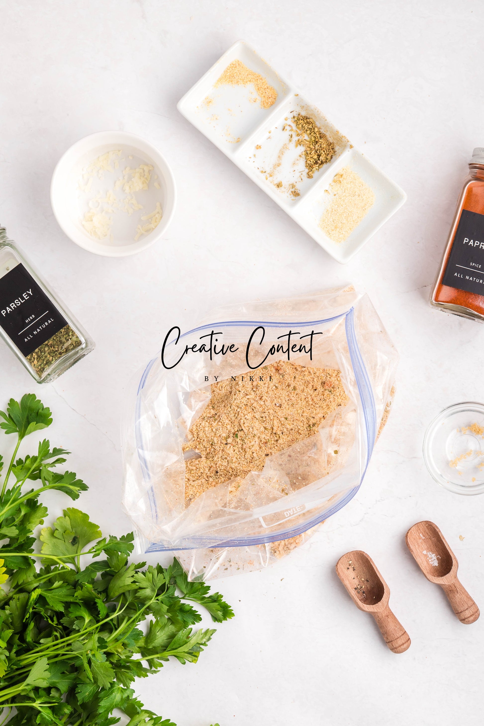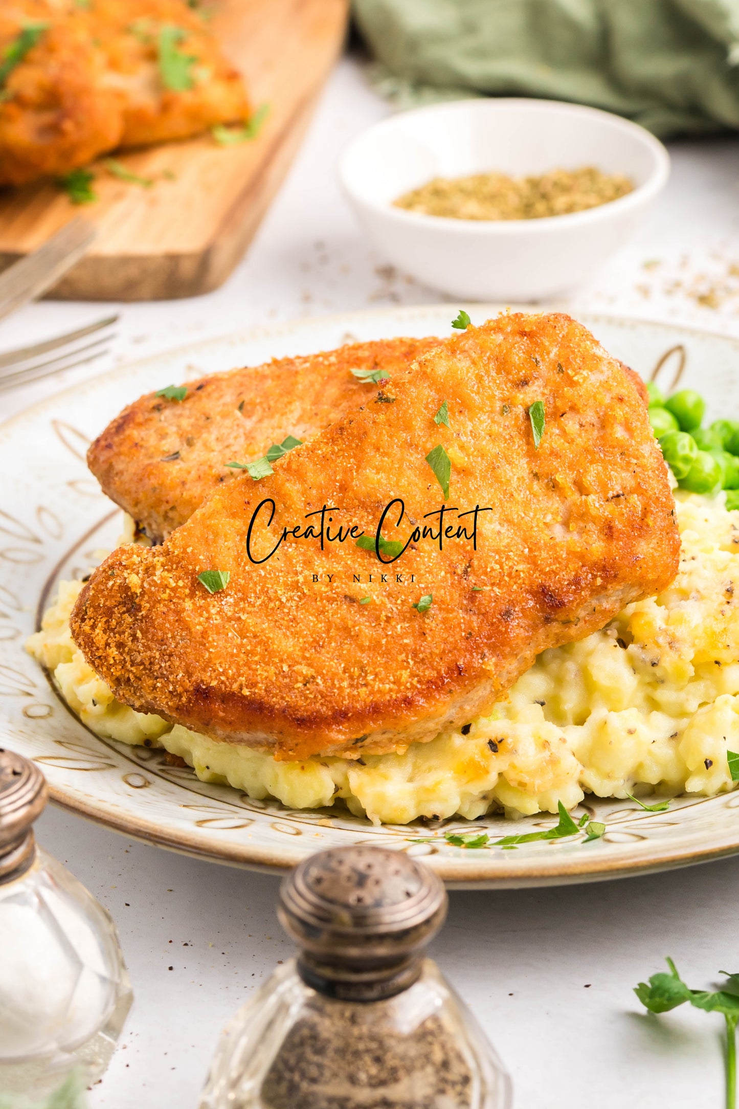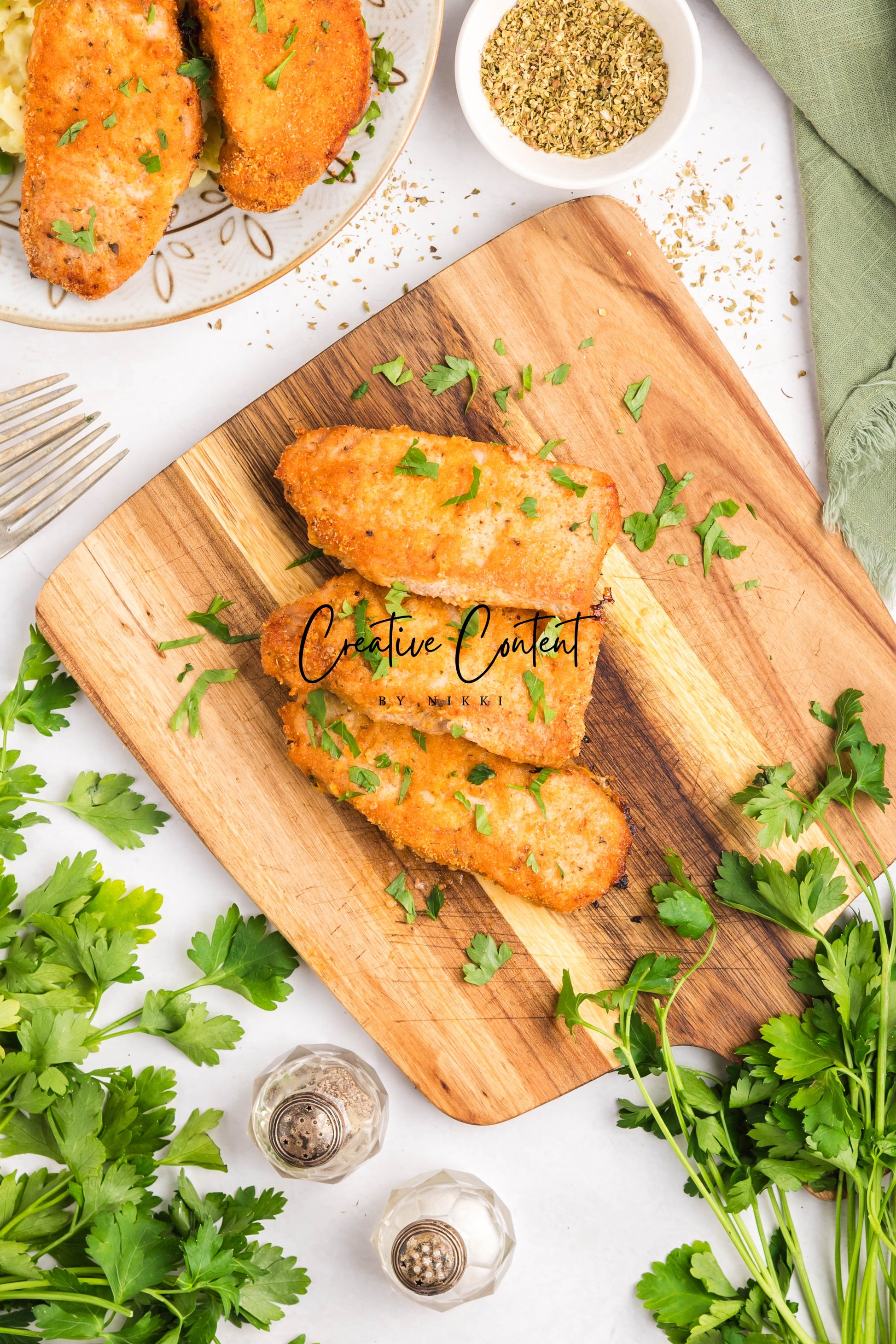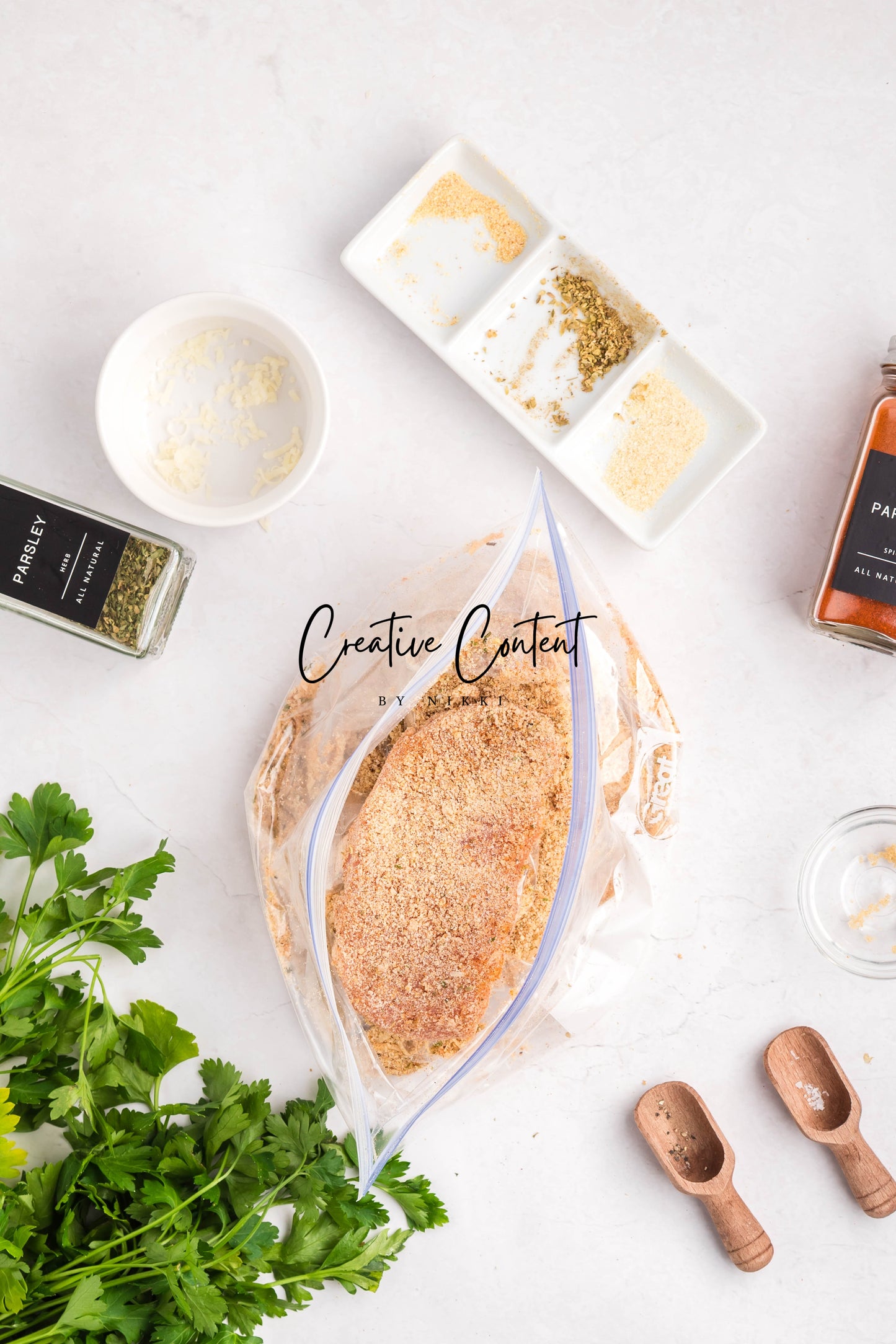 - Ingredients: Italian bread crumbs, parmesan breadcrumbs, avocado oil, paprika, light brown sugar, onion powder, garlic powder, dried oregano, dried parsley, coarse kosher salt, parsley, and boneless pork chops