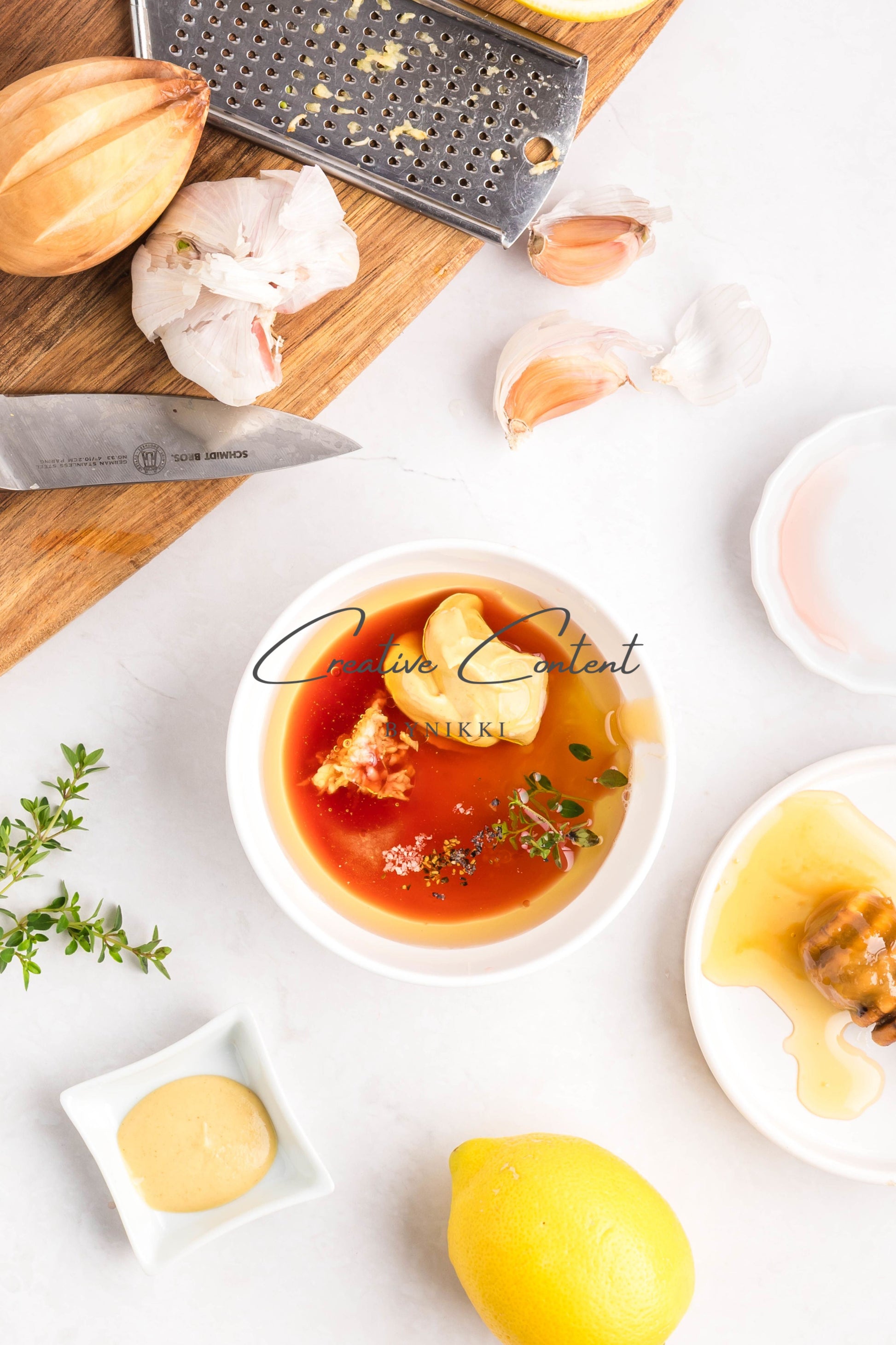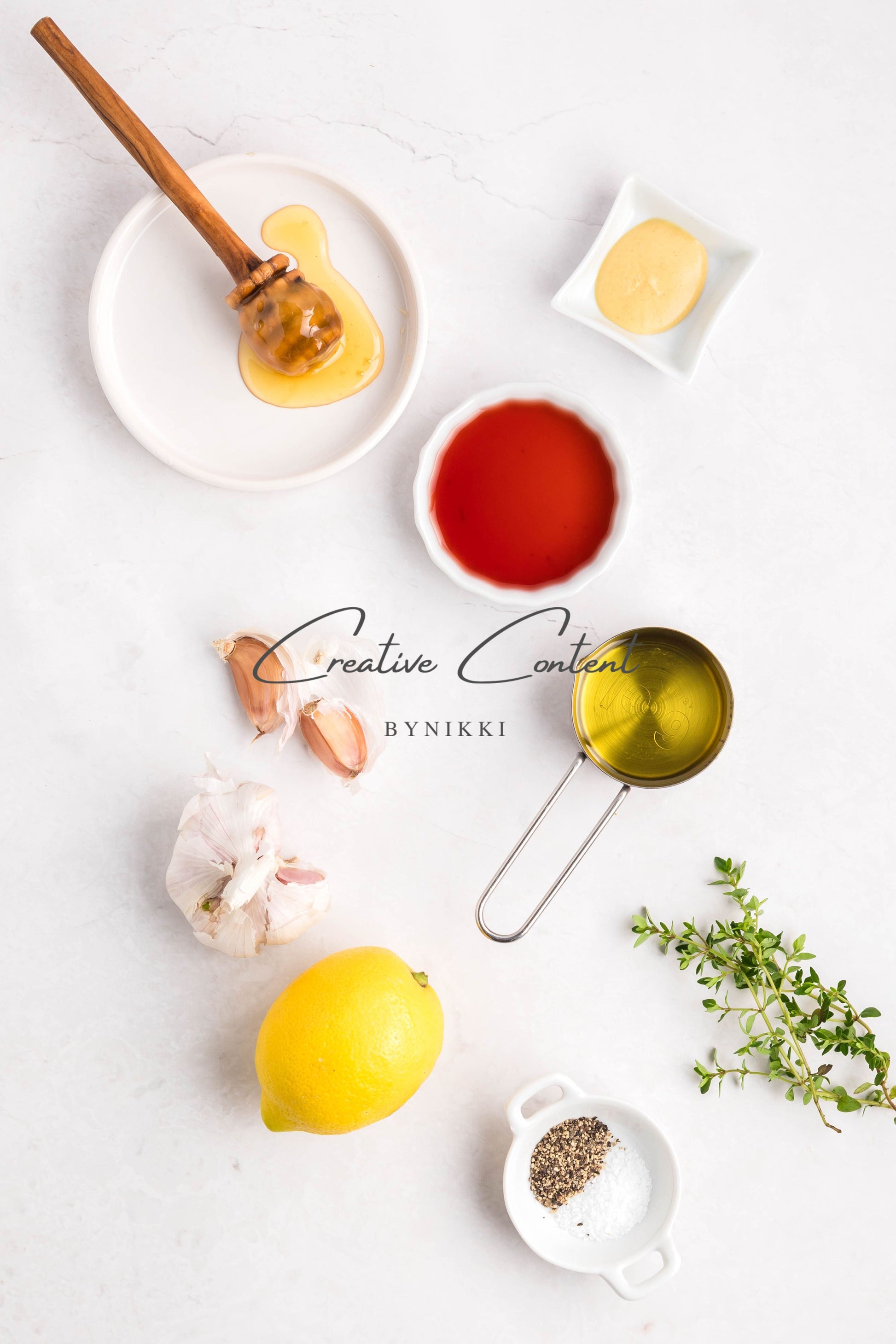 - Ingredients: avocado oil, thyme leaves, honey, red wine vinegar, Dijon mustard, garlic, lemon juice, kosher salt, black pepper