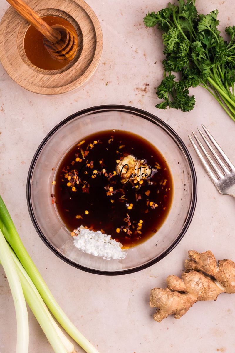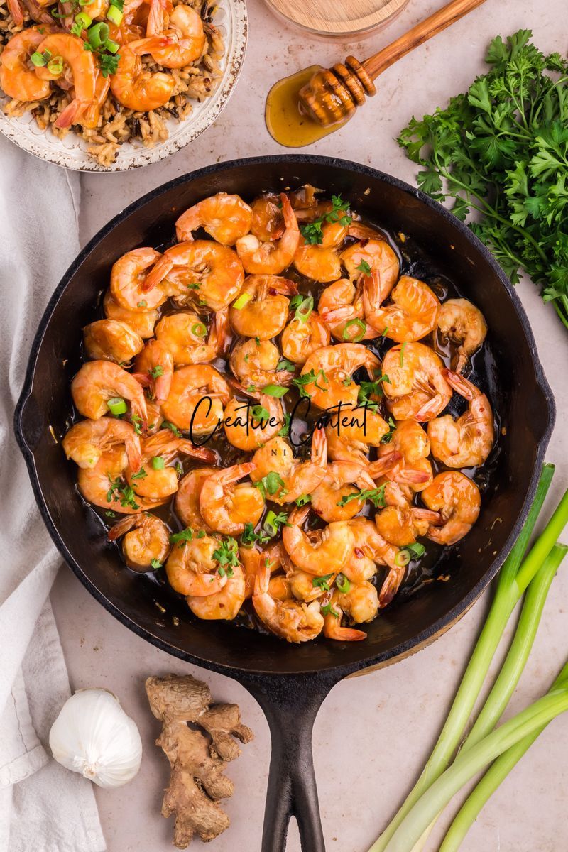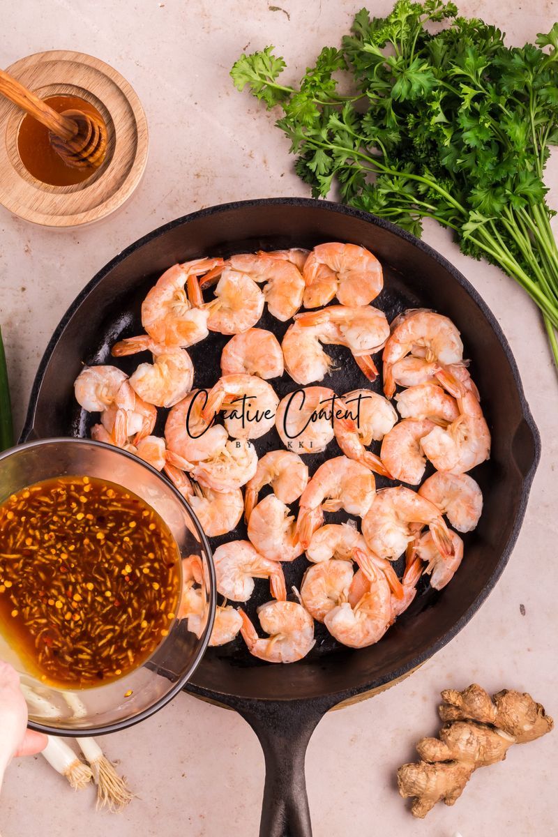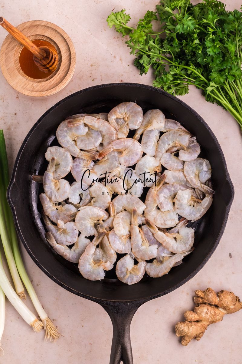 - Ingredients needed; honey, low-sodium soy sauce, garlic cloves, rice vinegar, ginger, cornstarch, red pepper flakes, avocado oil, 1 pound medium uncooked shrimp (peeled and deveined), green onions, and parsley.