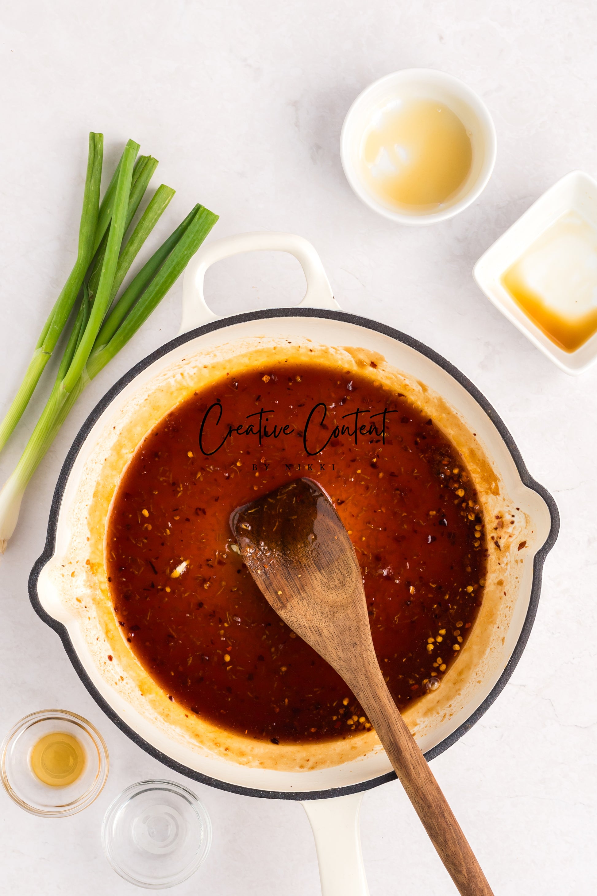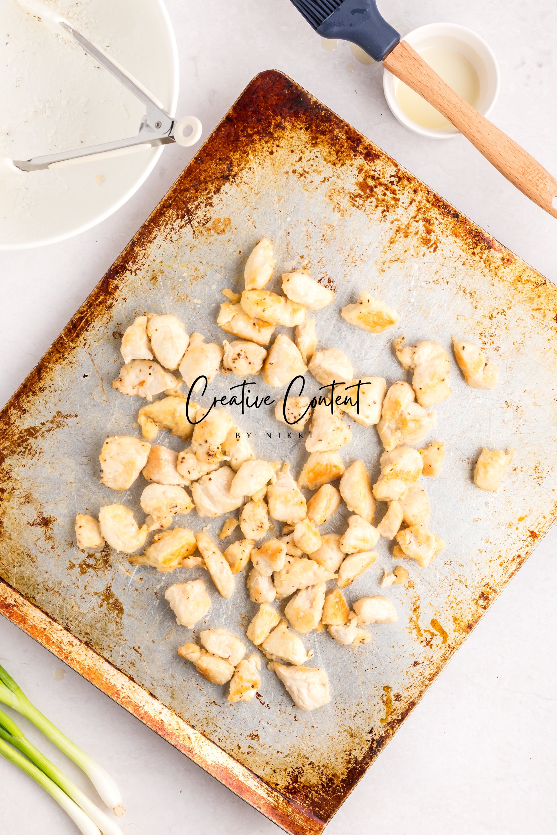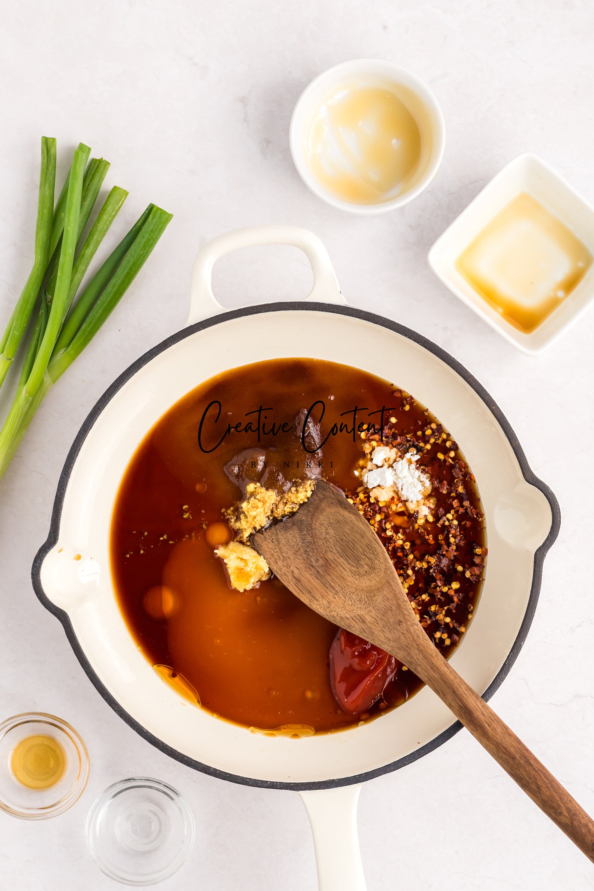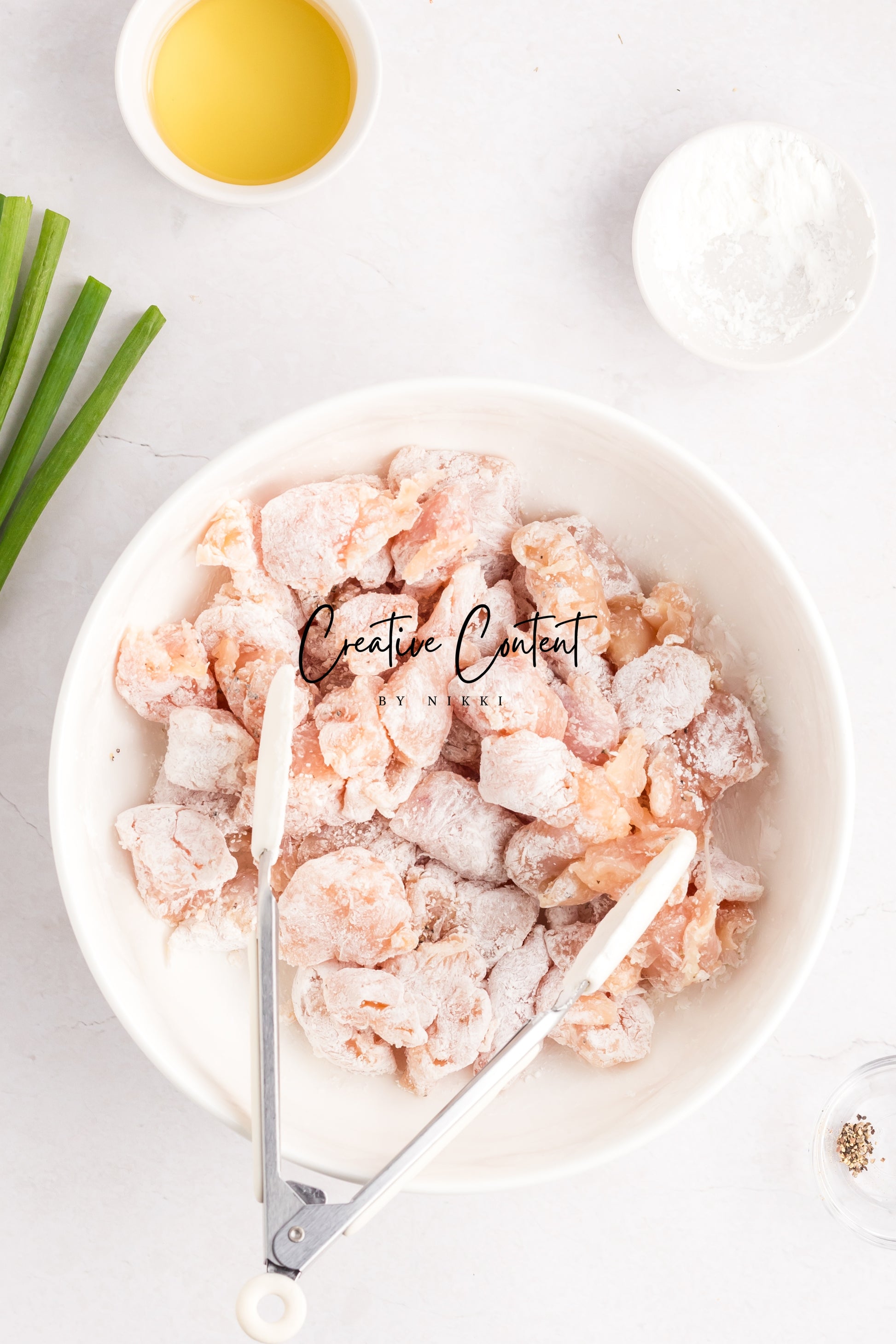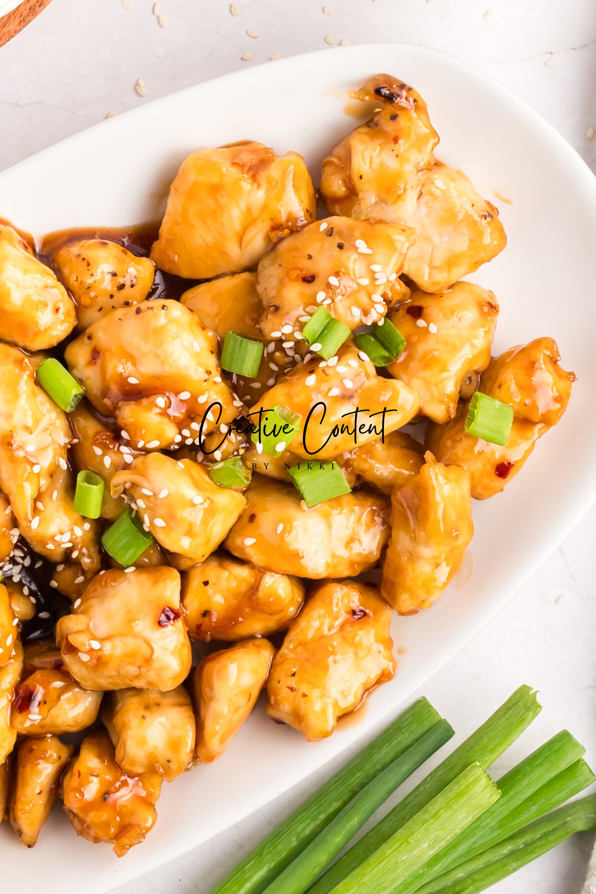 - Featured Ingredients; skinless chicken, cornstarch, salt, pepper, avocado oil, honey, low sodium soy sauce, brown sugar, ketchup, rice vinegar, sesame oil, red pepper flakes, ginger, cornstarch, garlic cloves, scallions, and sesame seeds.