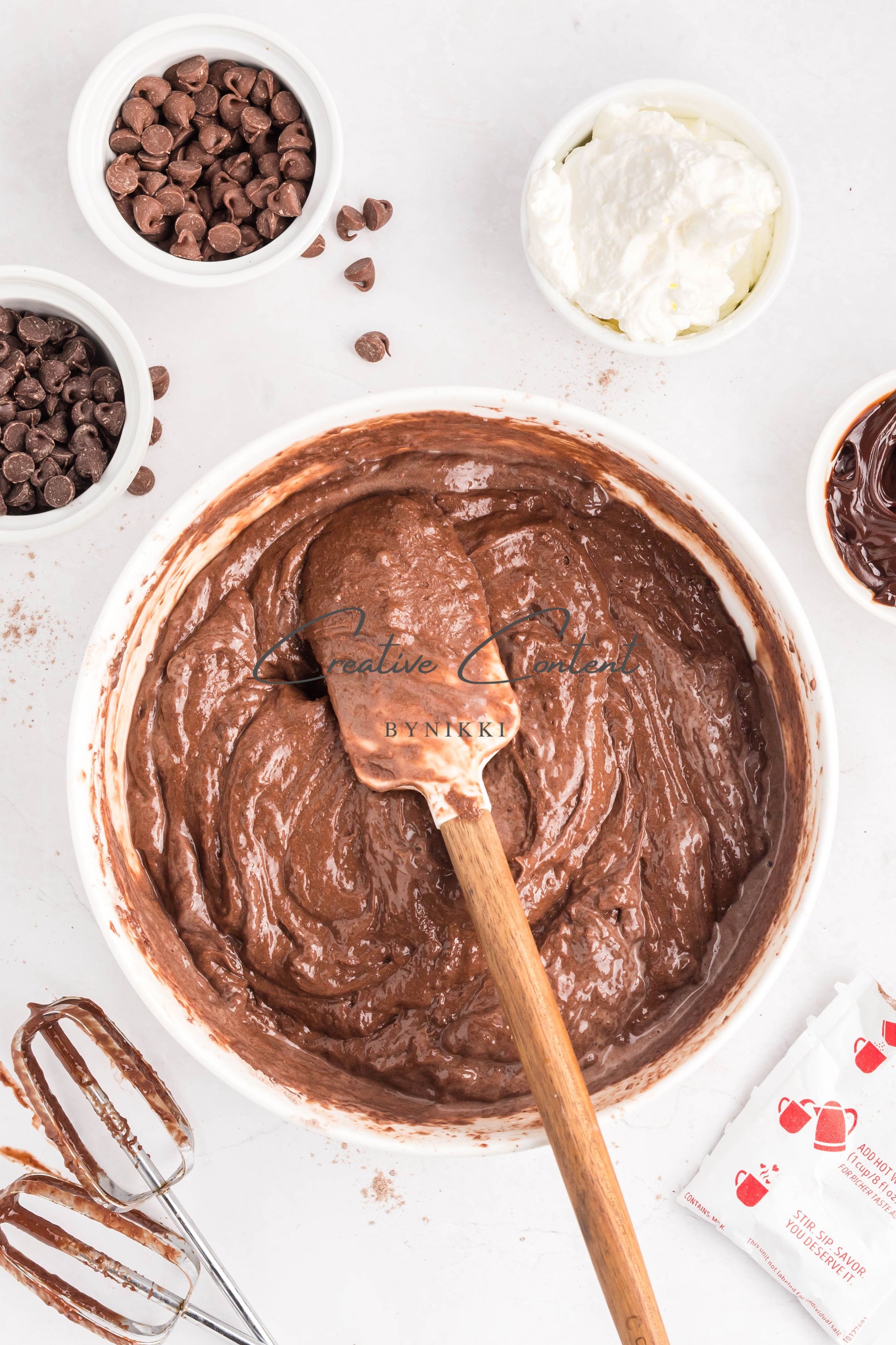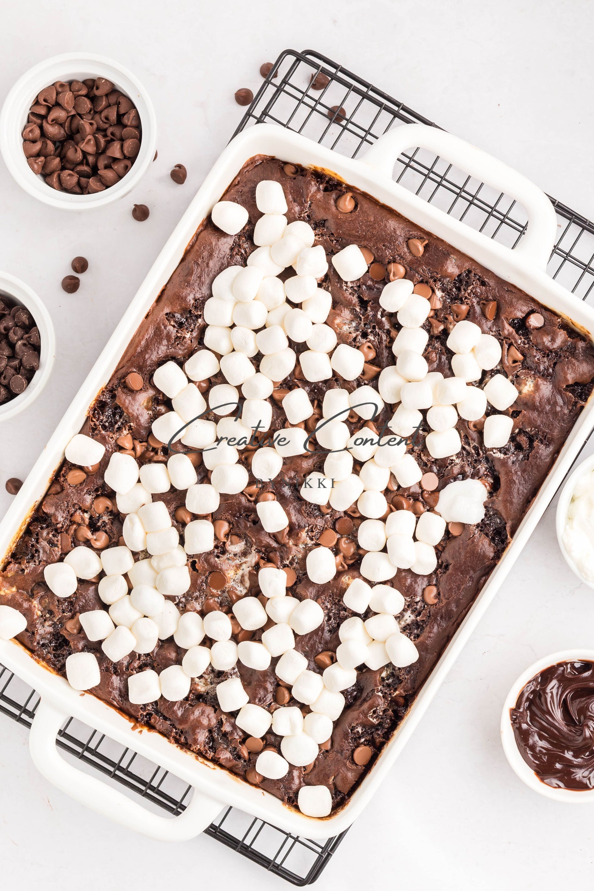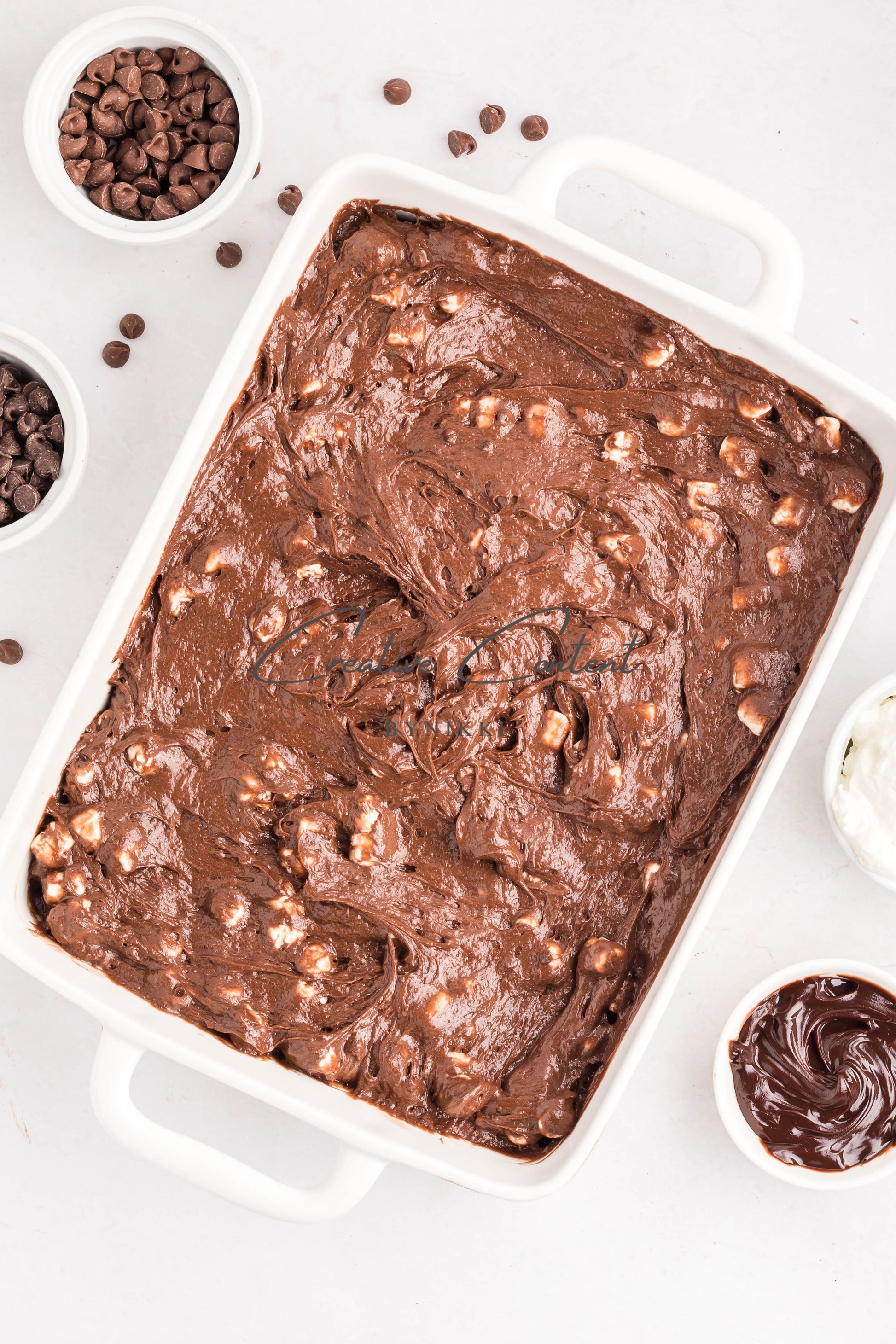- Ingredients: Chocolate fudge instant pudding mix, cocoa mix, whole milk, dark chocolate fudge cake mix, mini marshmallows, semi-sweet chocolate chips, milk chocolate chips, whipped cream, chocolate fudge topping