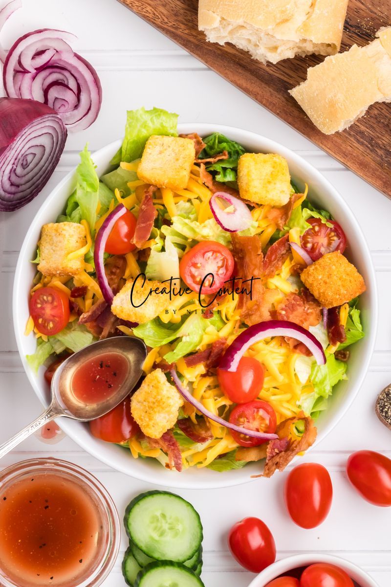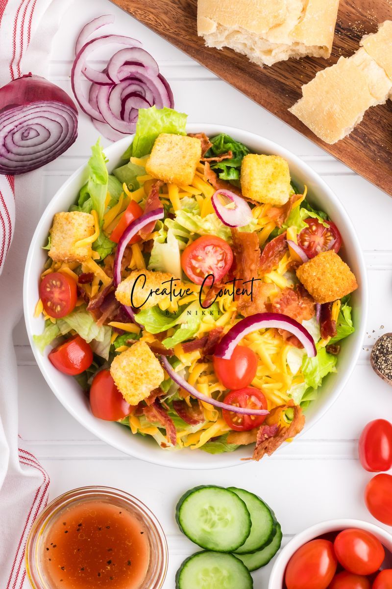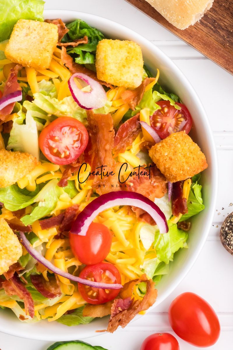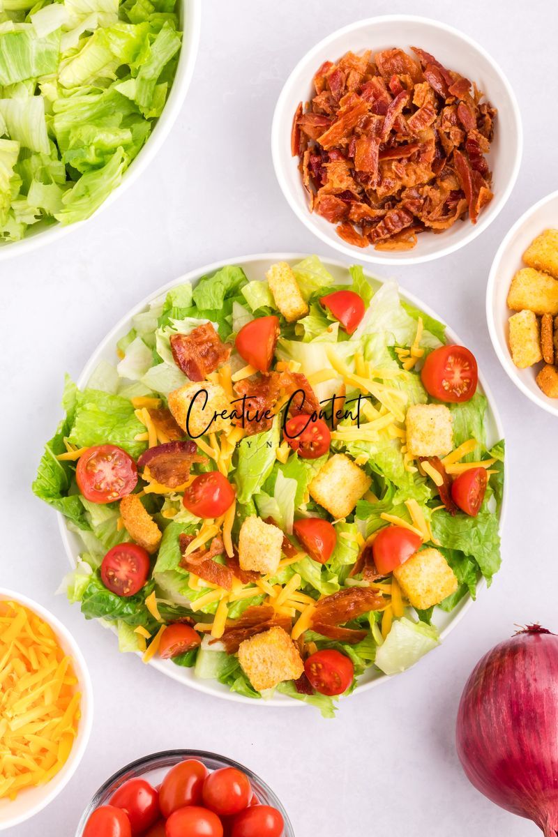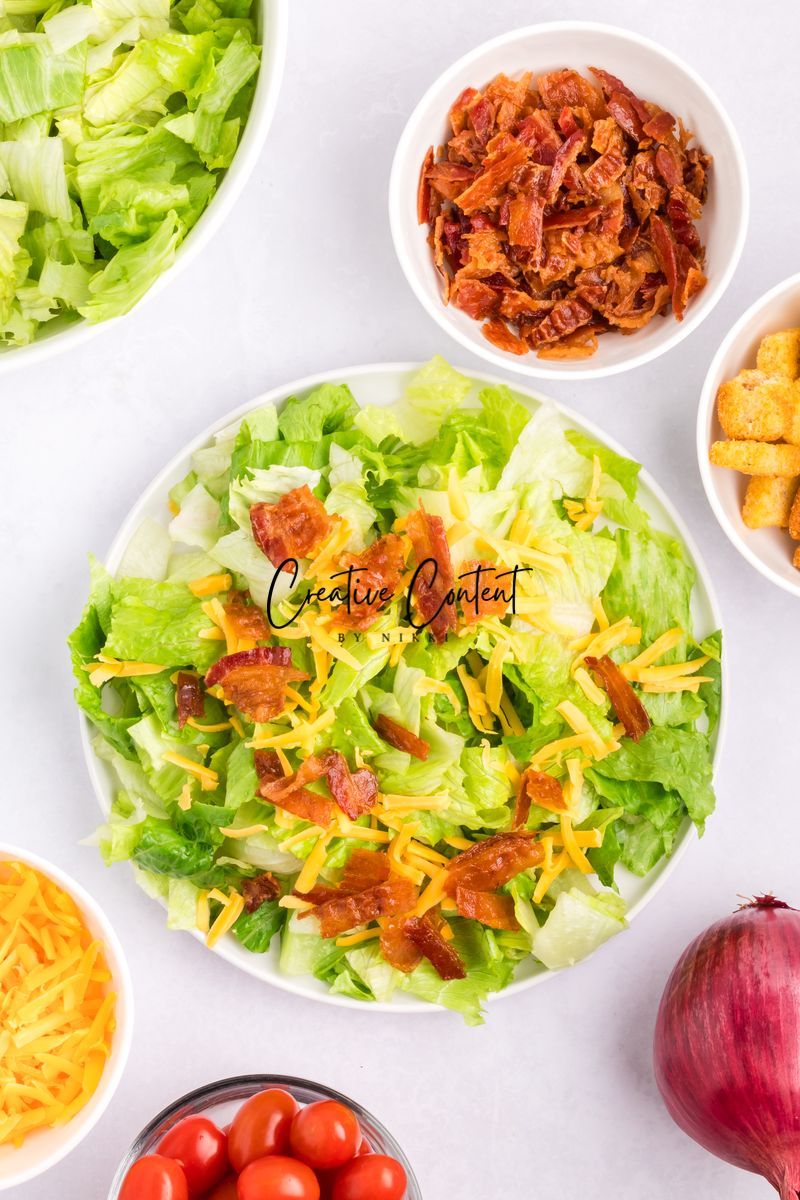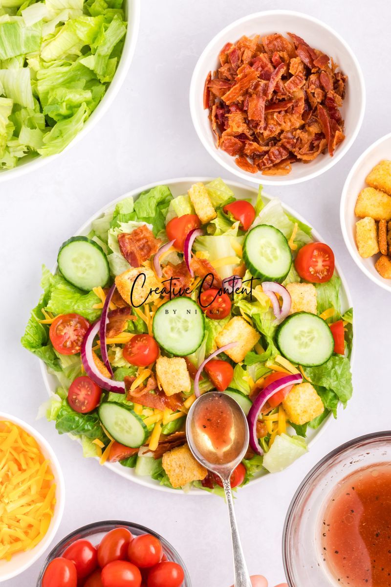 - Ingredients needed; avocado oil, red wine vinegar, Dijon mustard, coarse kosher salt, black pepper, garlic powder, honey, romaine hearts, iceberg lettuce, cherry tomatoes, cucumber, croutons, cheddar cheese, red onion, and bacon crumbles.