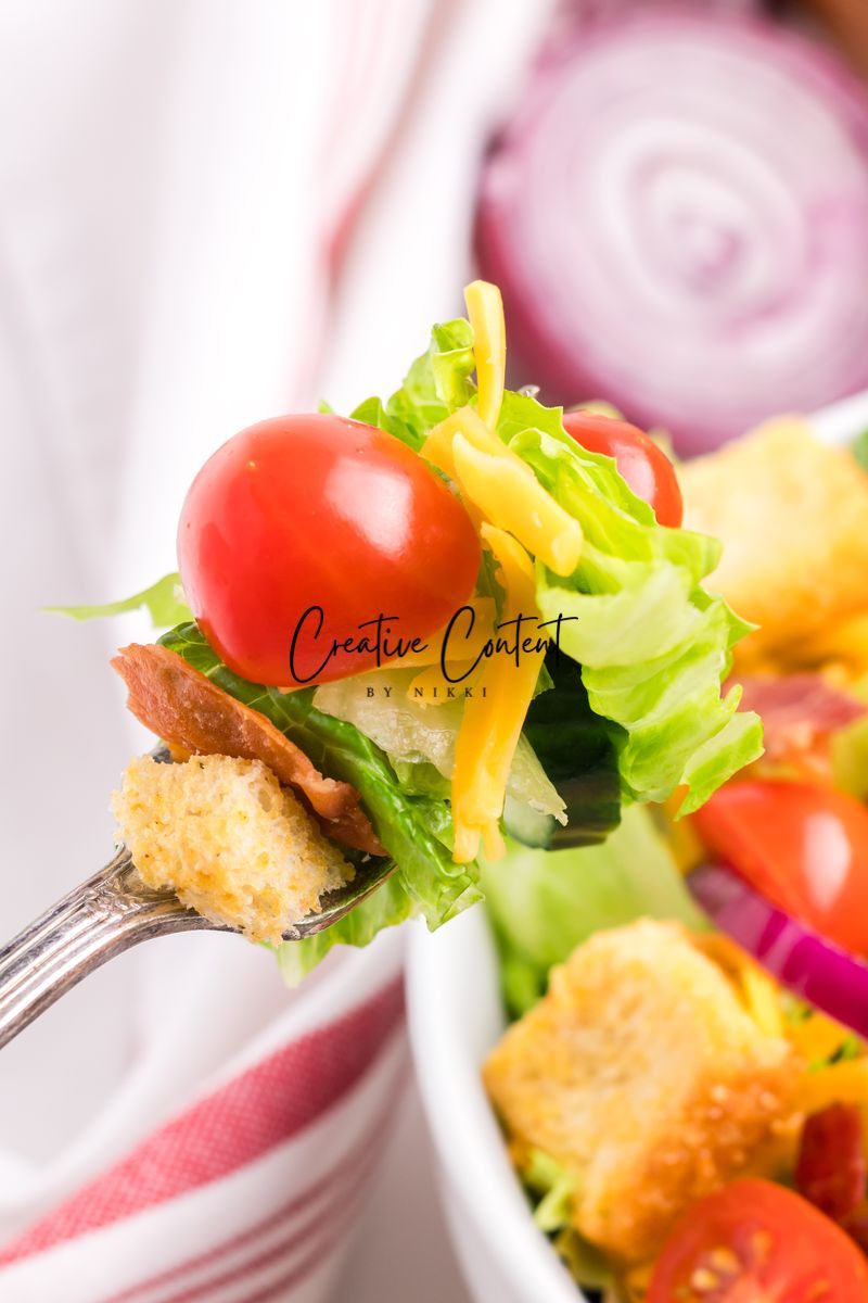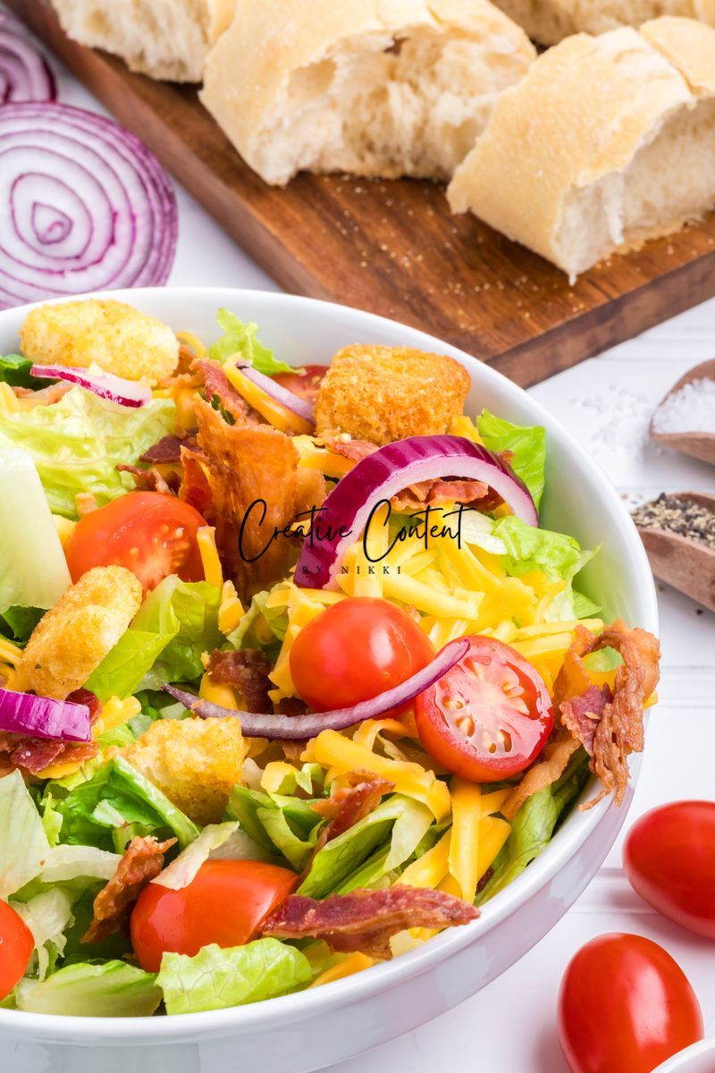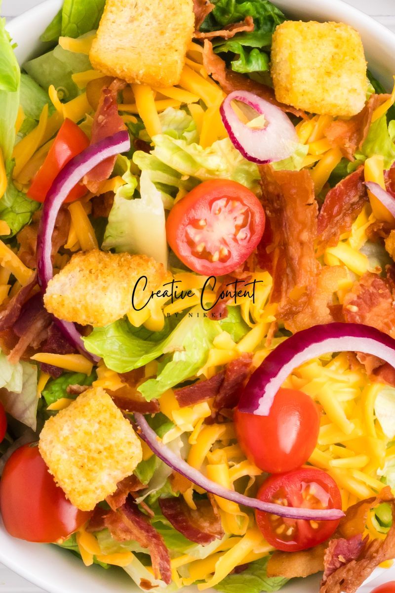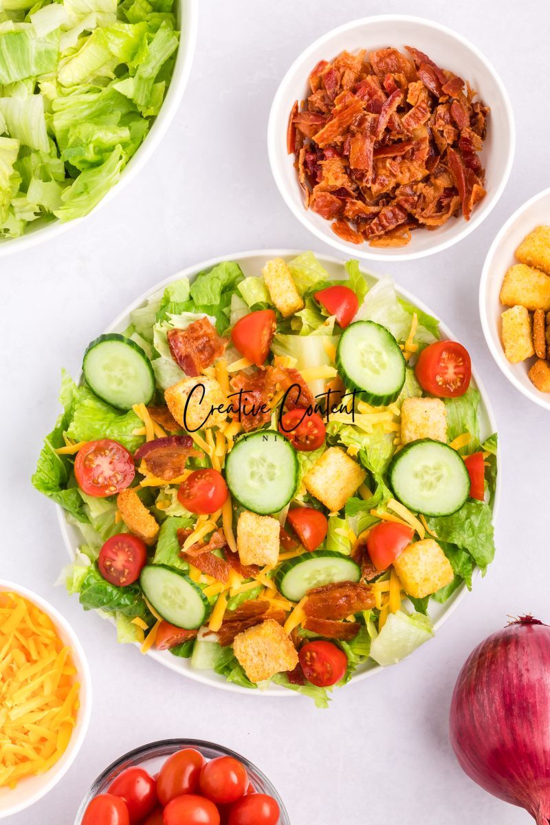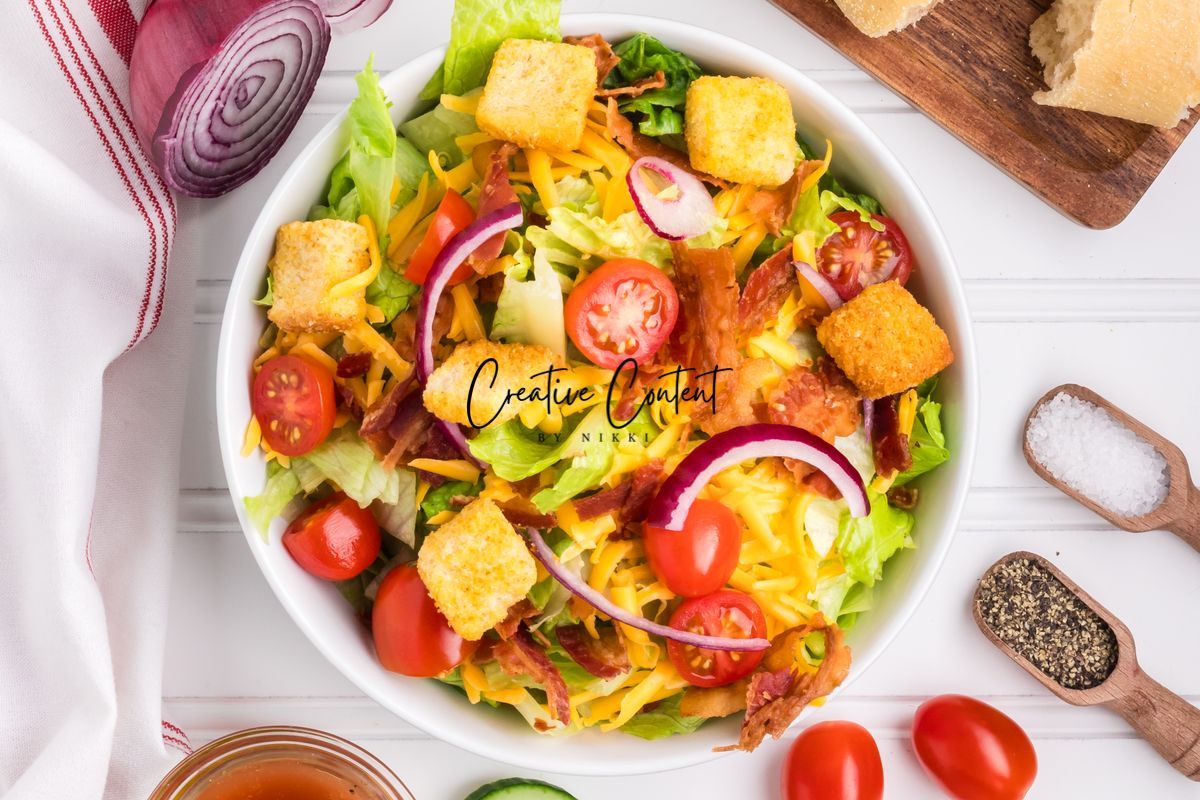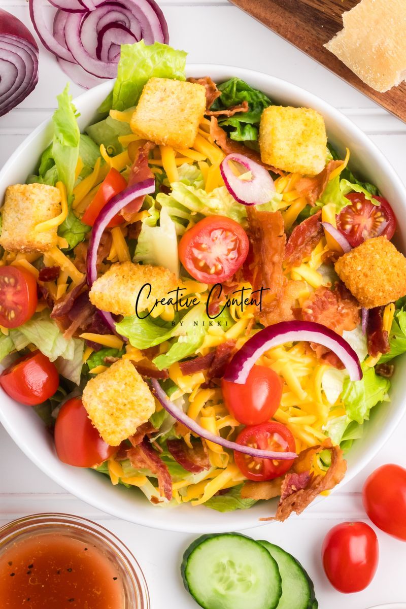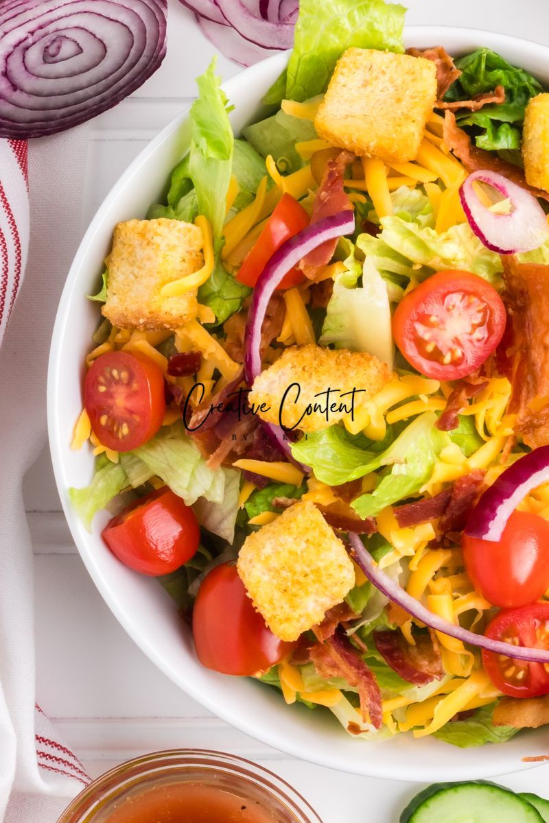 - Ingredients needed; avocado oil, red wine vinegar, Dijon mustard, coarse kosher salt, black pepper, garlic powder, honey, romaine hearts, iceberg lettuce, cherry tomatoes, cucumber, croutons, cheddar cheese, red onion, and bacon crumbles.