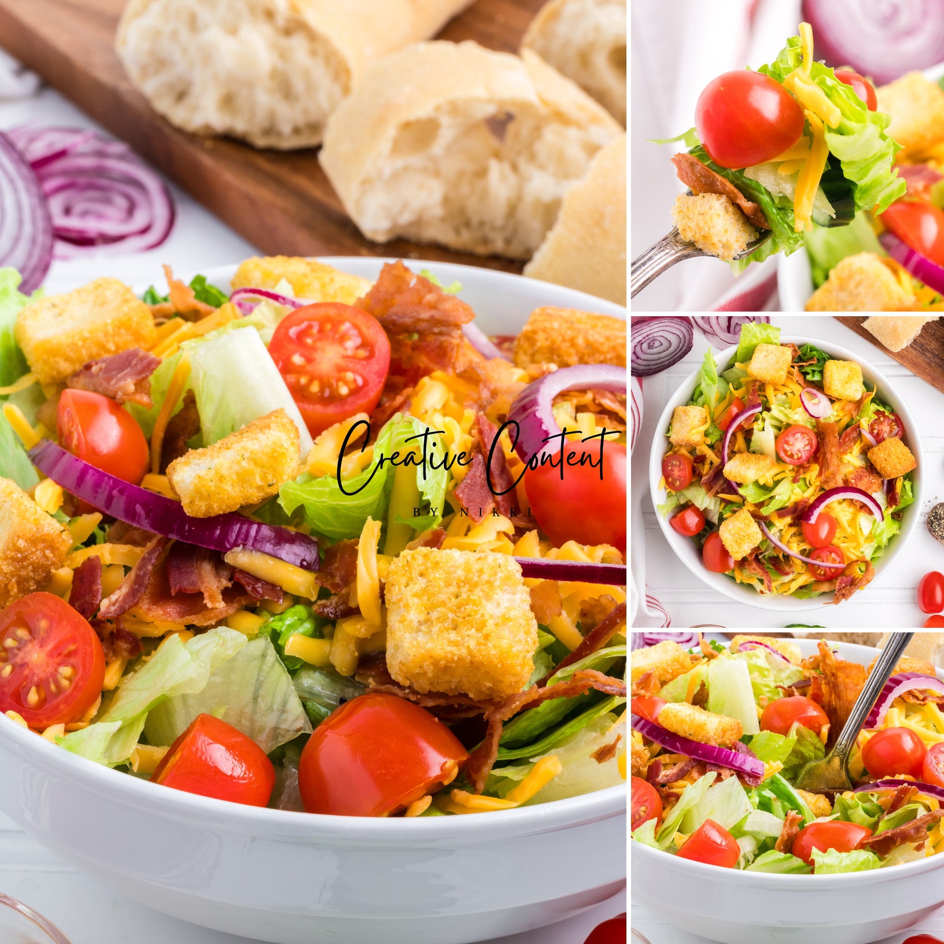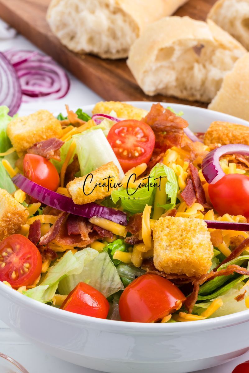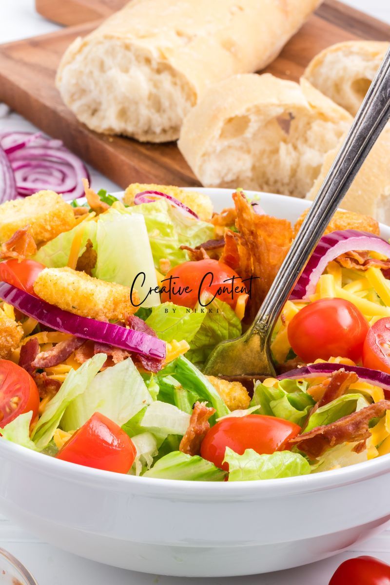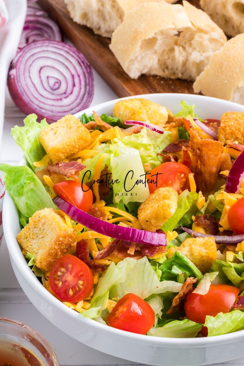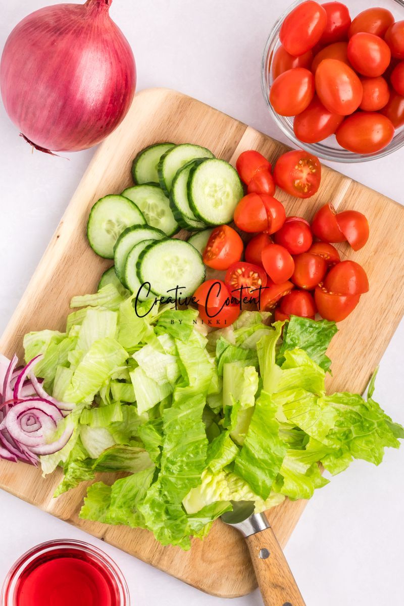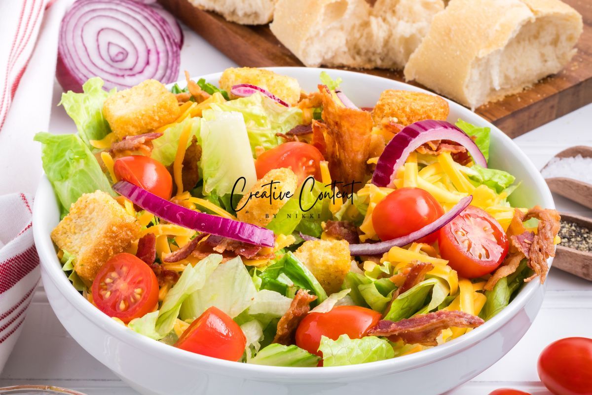 - Ingredients needed; avocado oil, red wine vinegar, Dijon mustard, coarse kosher salt, black pepper, garlic powder, honey, romaine hearts, iceberg lettuce, cherry tomatoes, cucumber, croutons, cheddar cheese, red onion, and bacon crumbles.