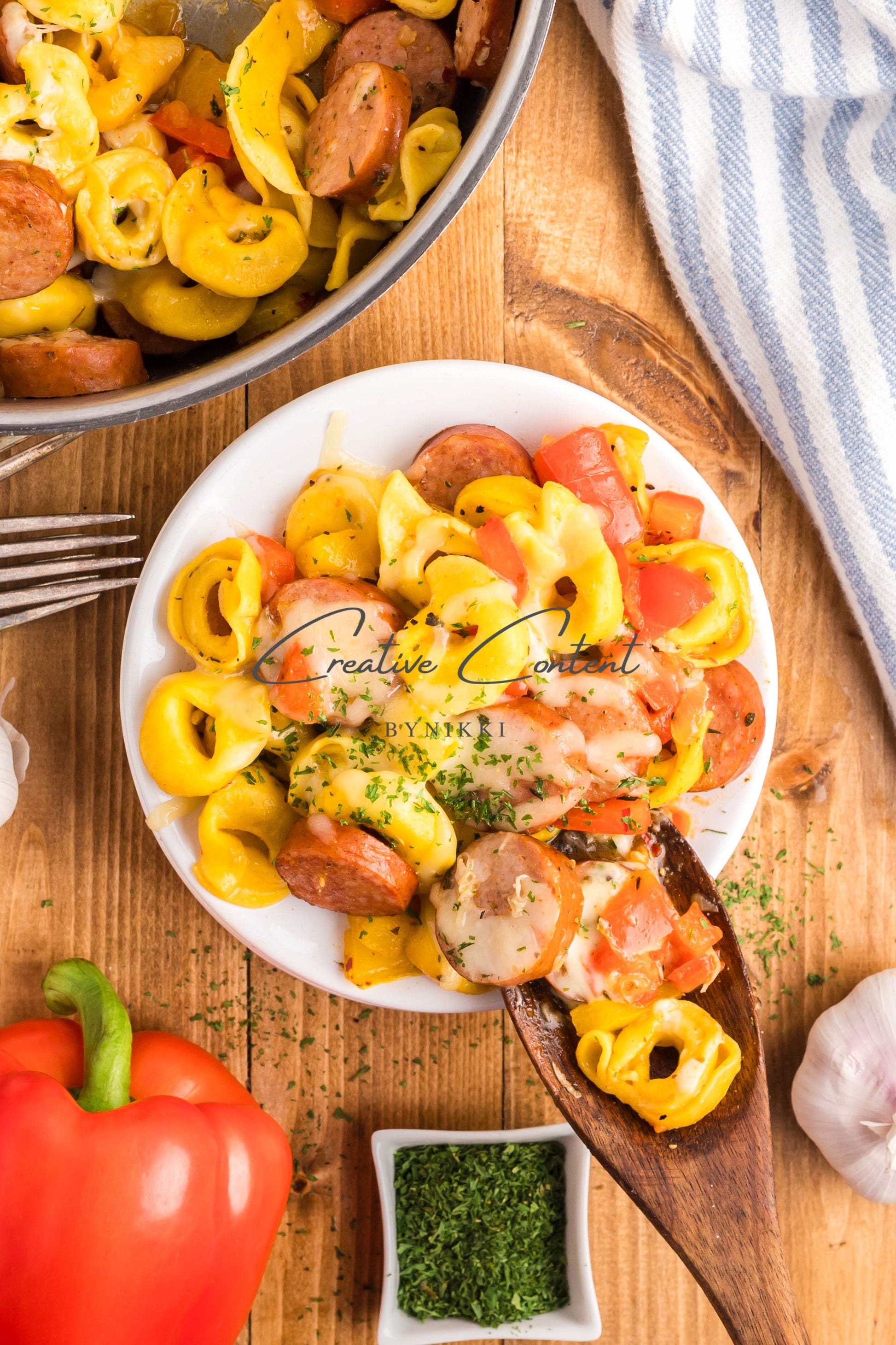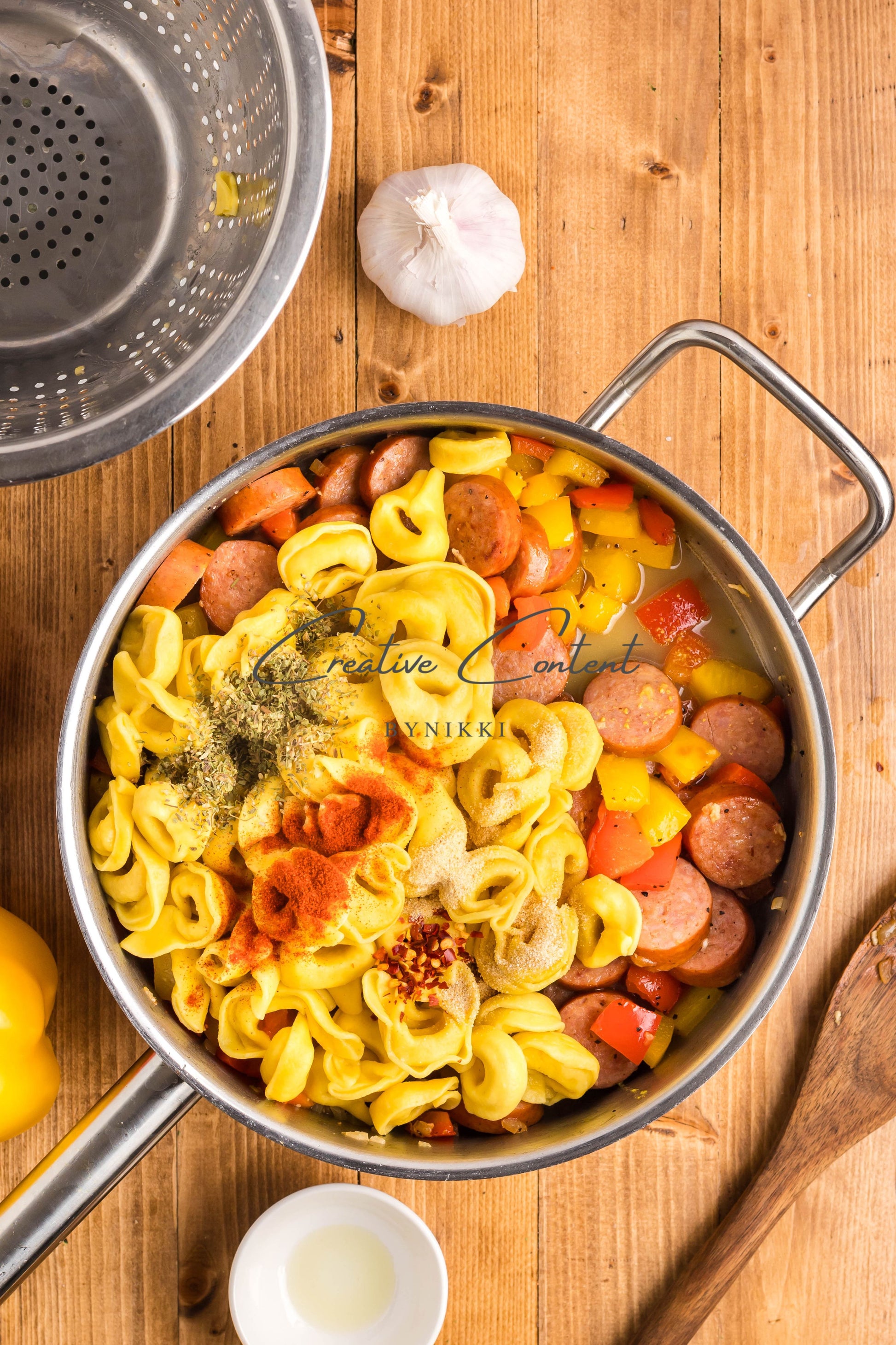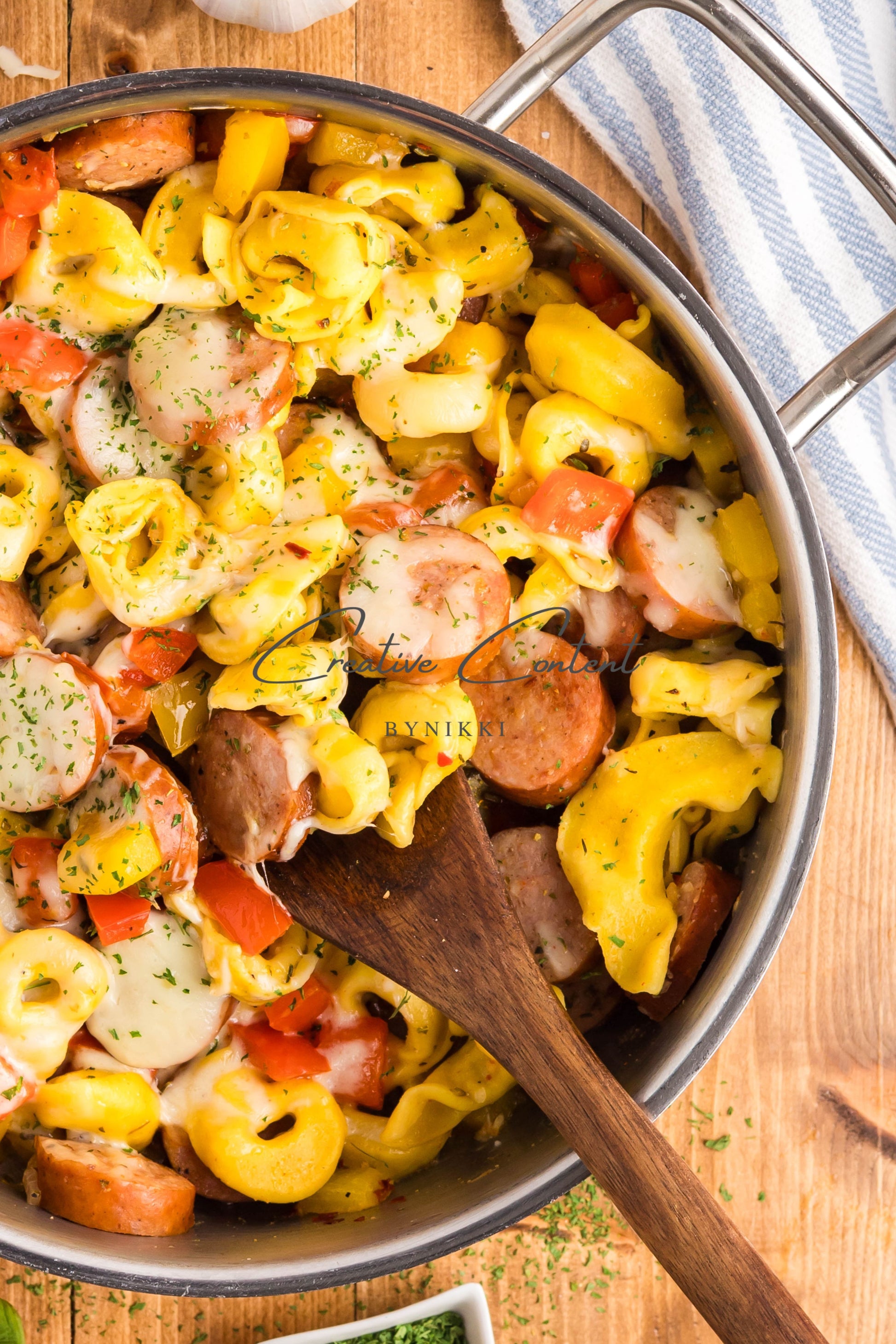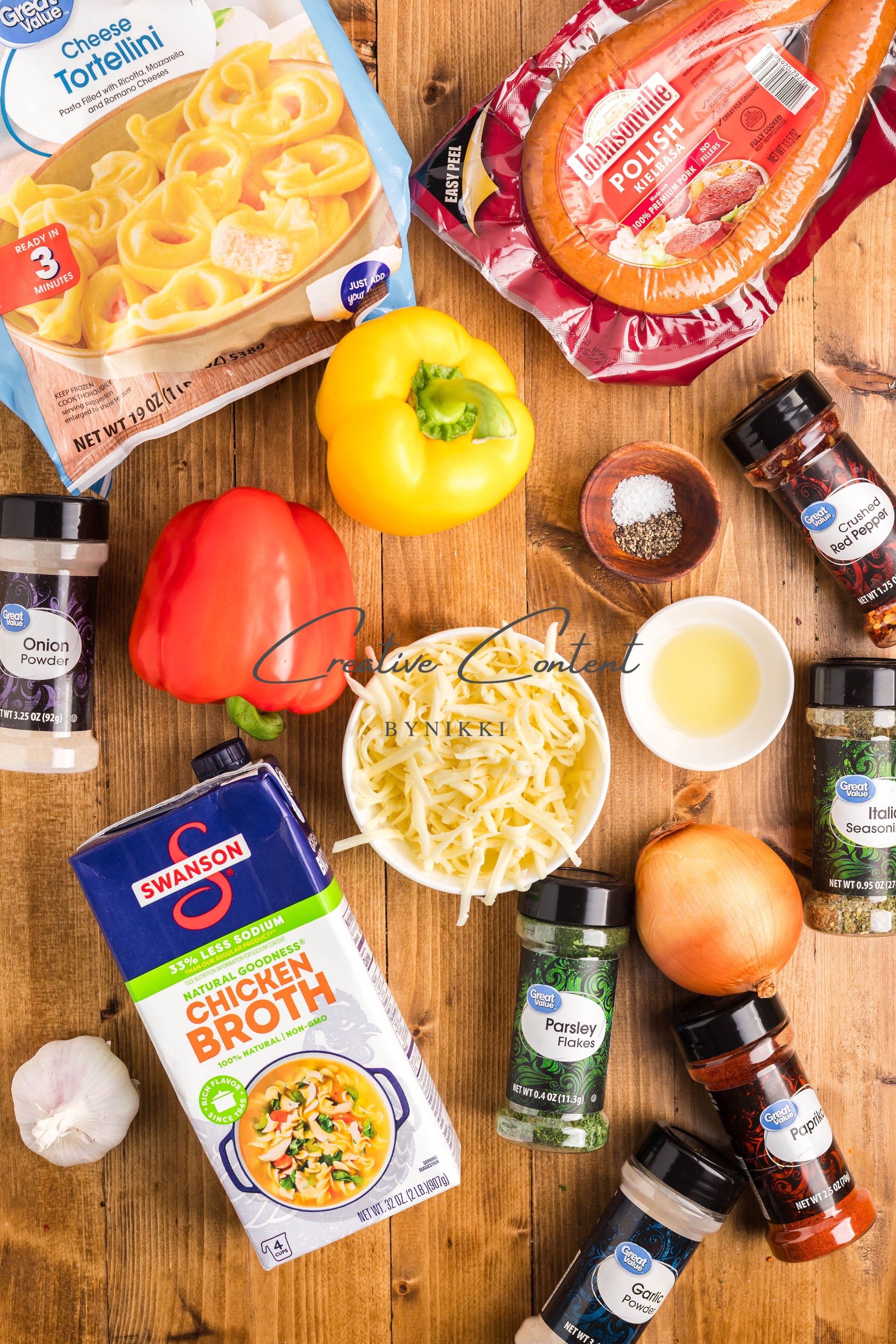 - Ingredients: avocado oil, kielbasa, red bell pepper, yellow onion, kosher salt, black pepper, garlic, cheese tortellini, chicken stock, Italian seasoning, sweet paprika, red pepper flakes, mozzarella cheese, dried parsley