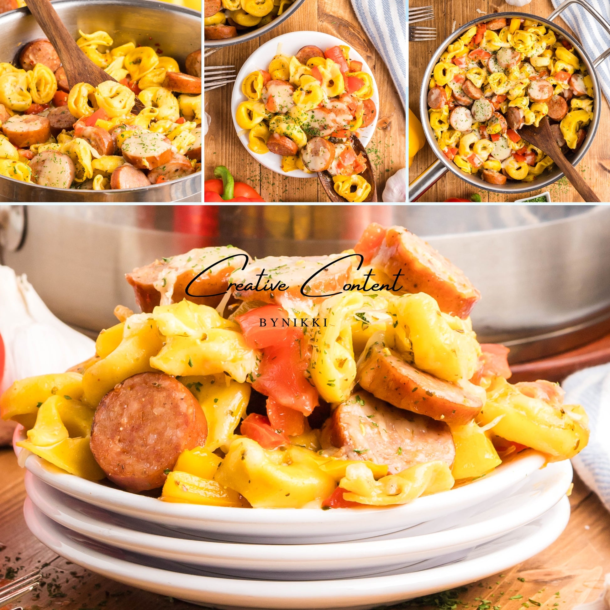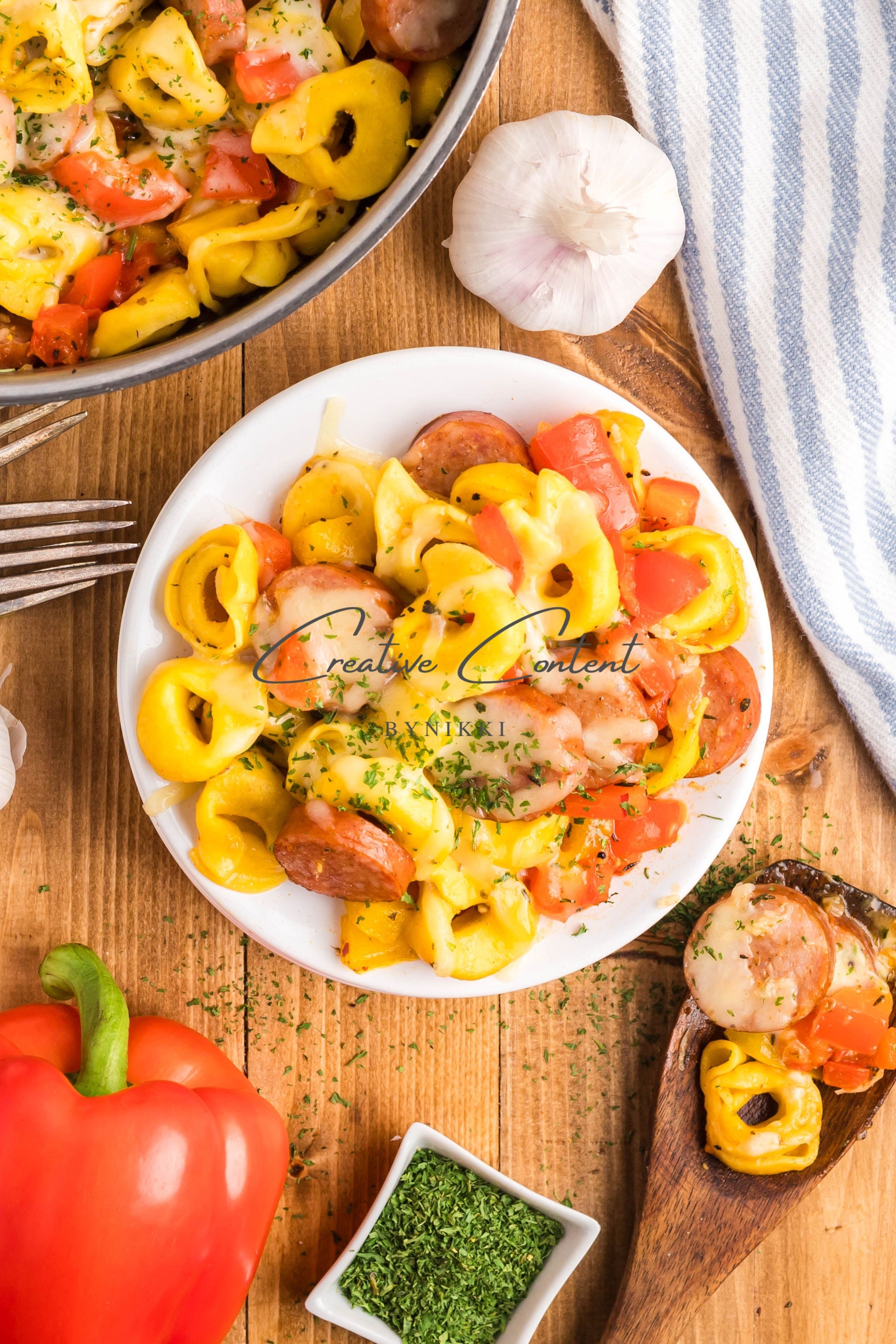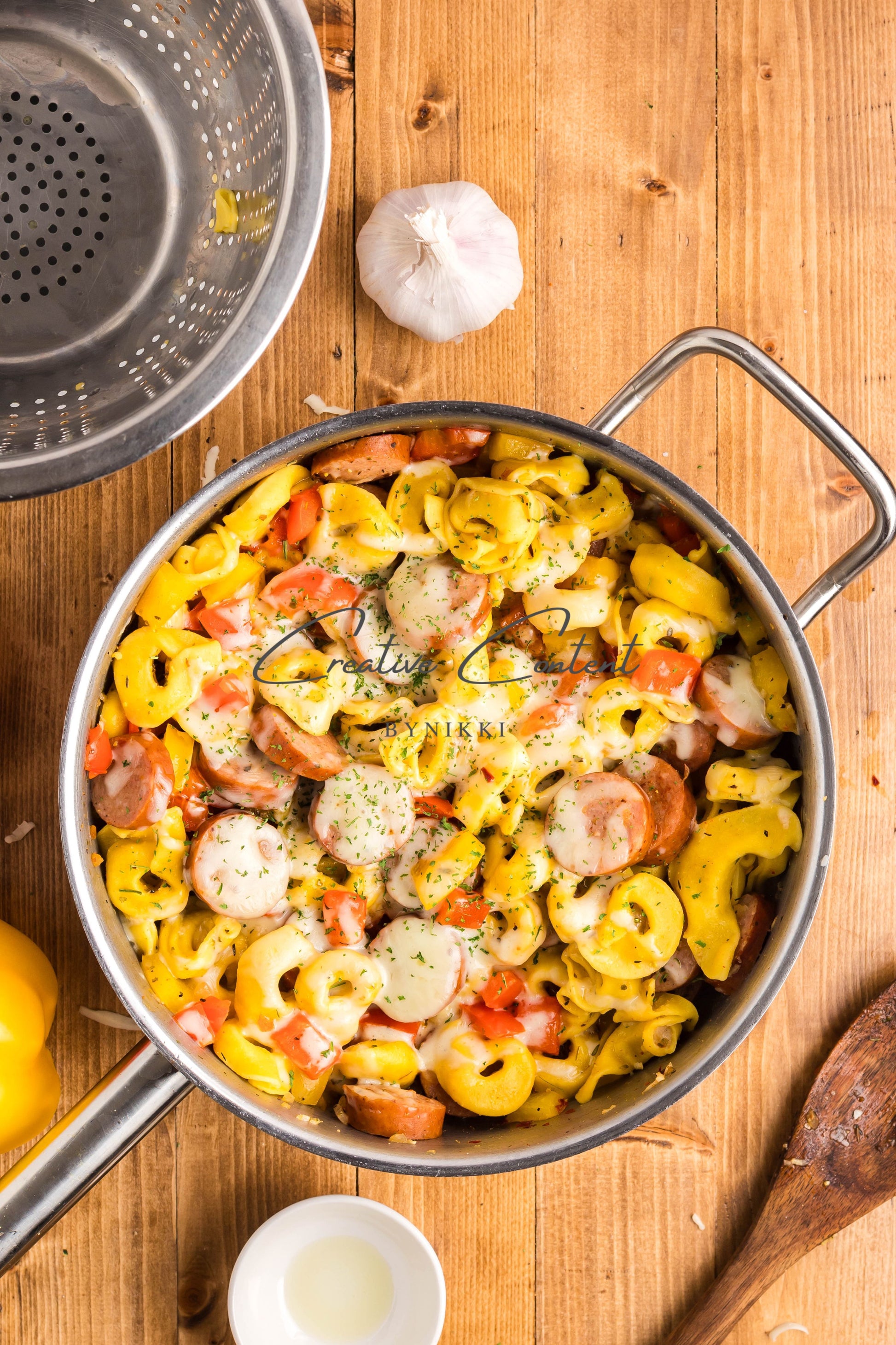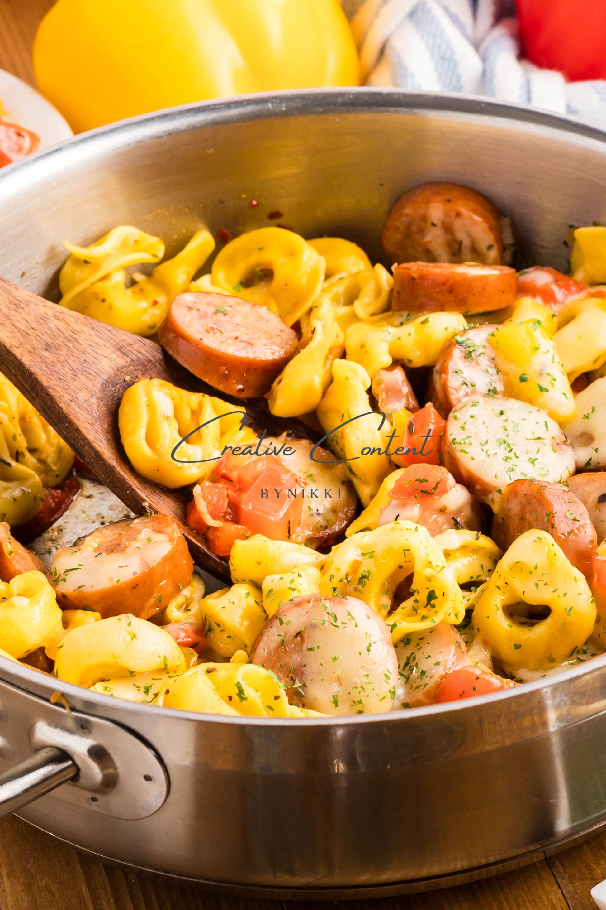 - Ingredients: avocado oil, kielbasa, red bell pepper, yellow onion, kosher salt, black pepper, garlic, cheese tortellini, chicken stock, Italian seasoning, sweet paprika, red pepper flakes, mozzarella cheese, dried parsley