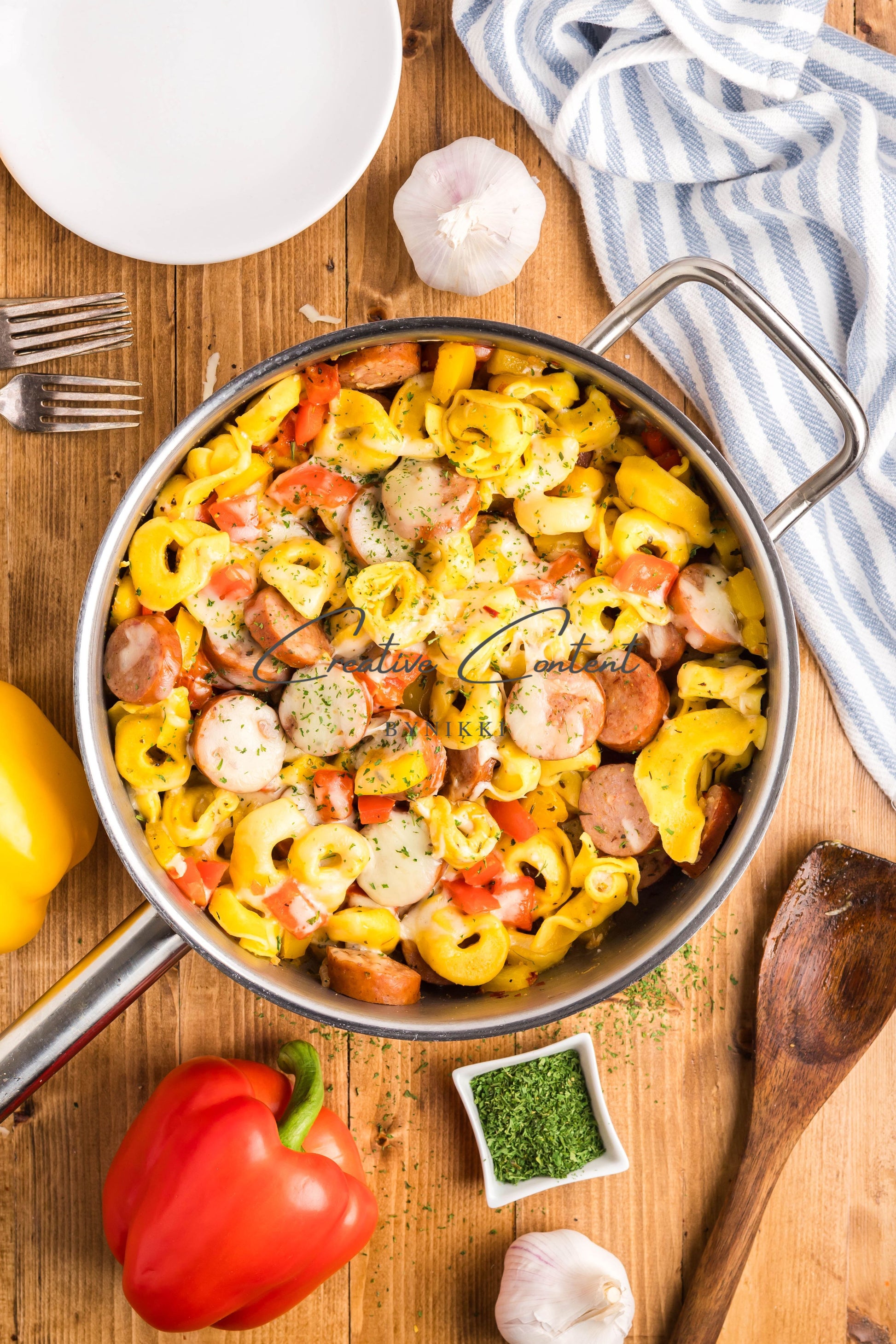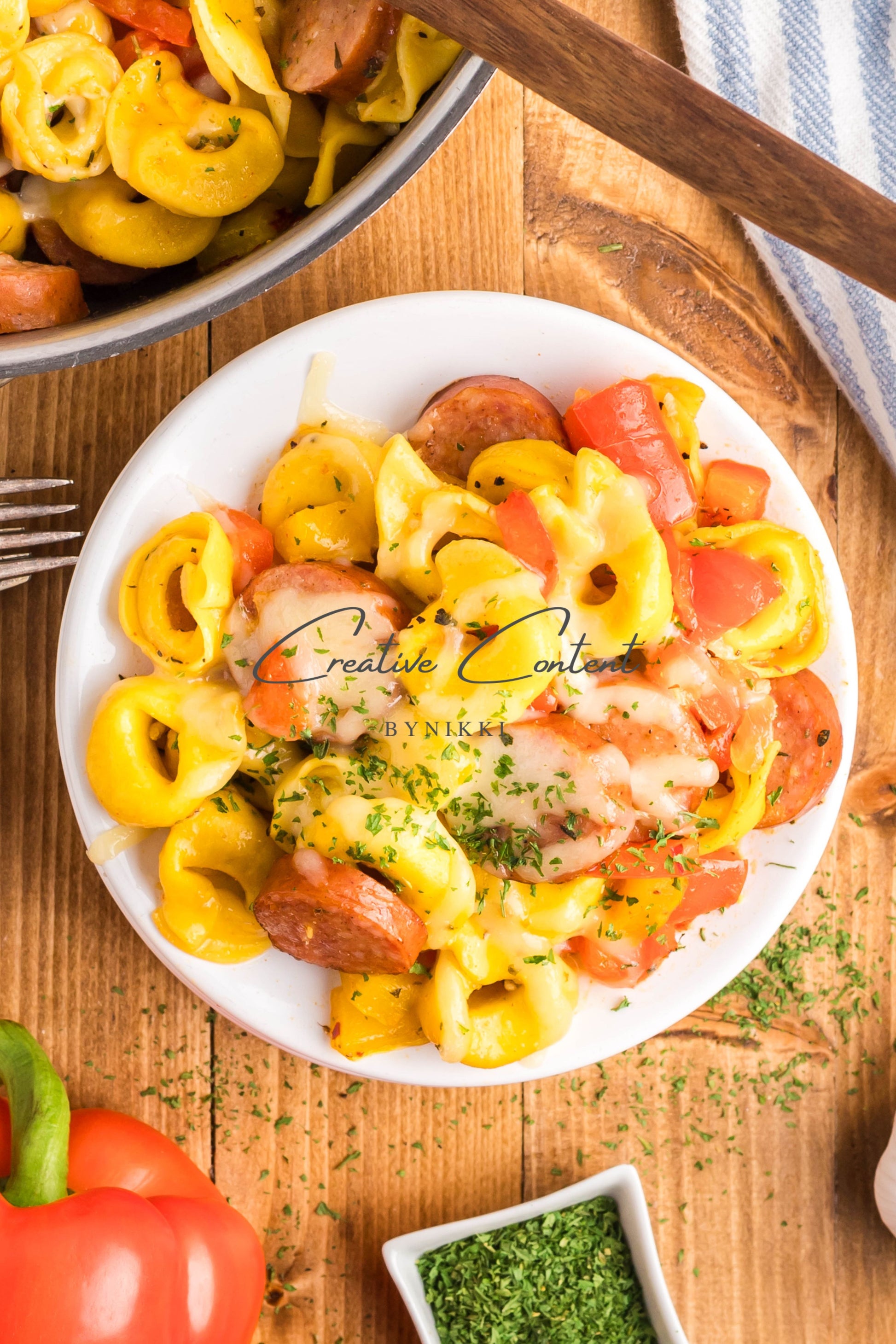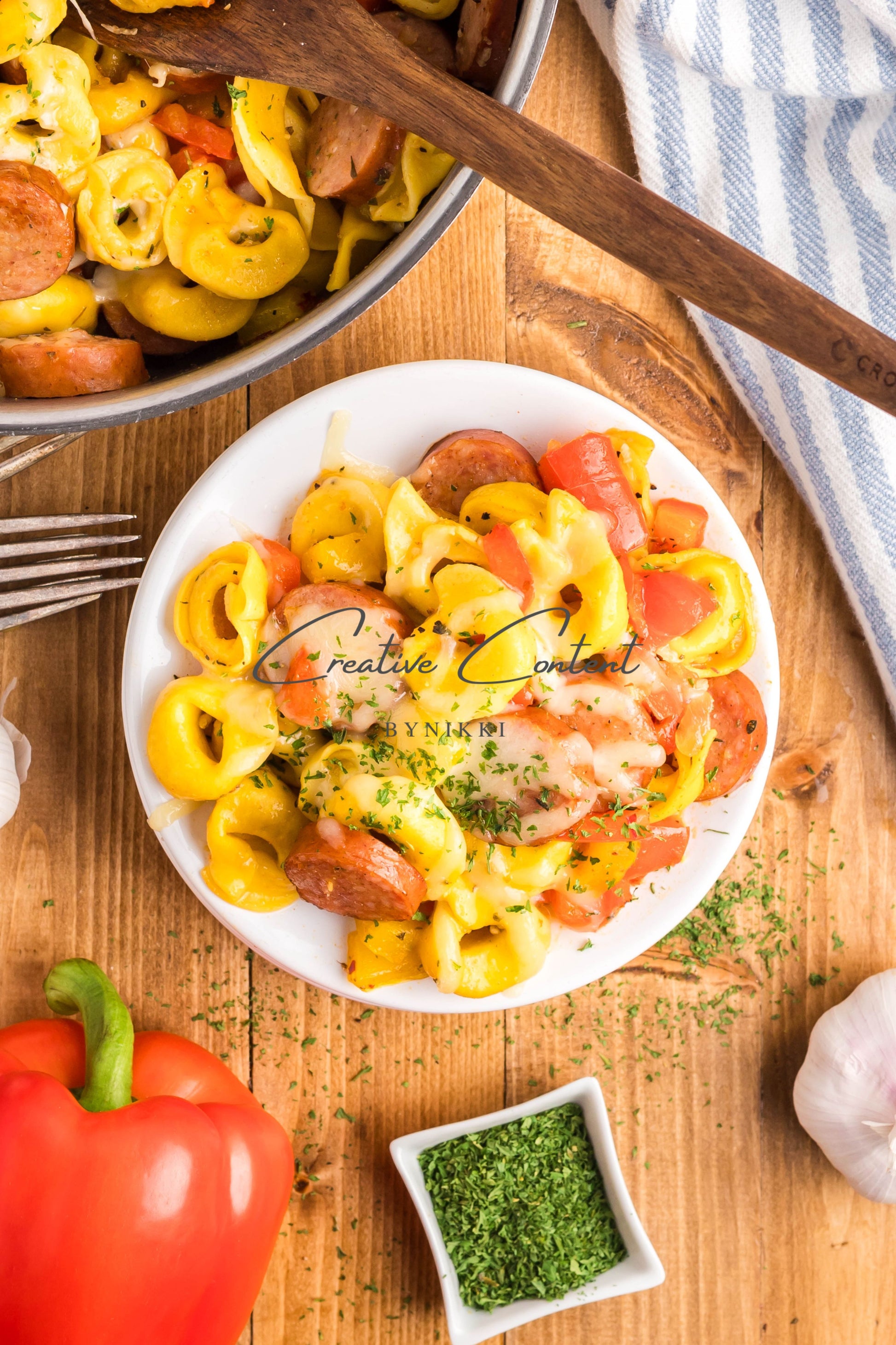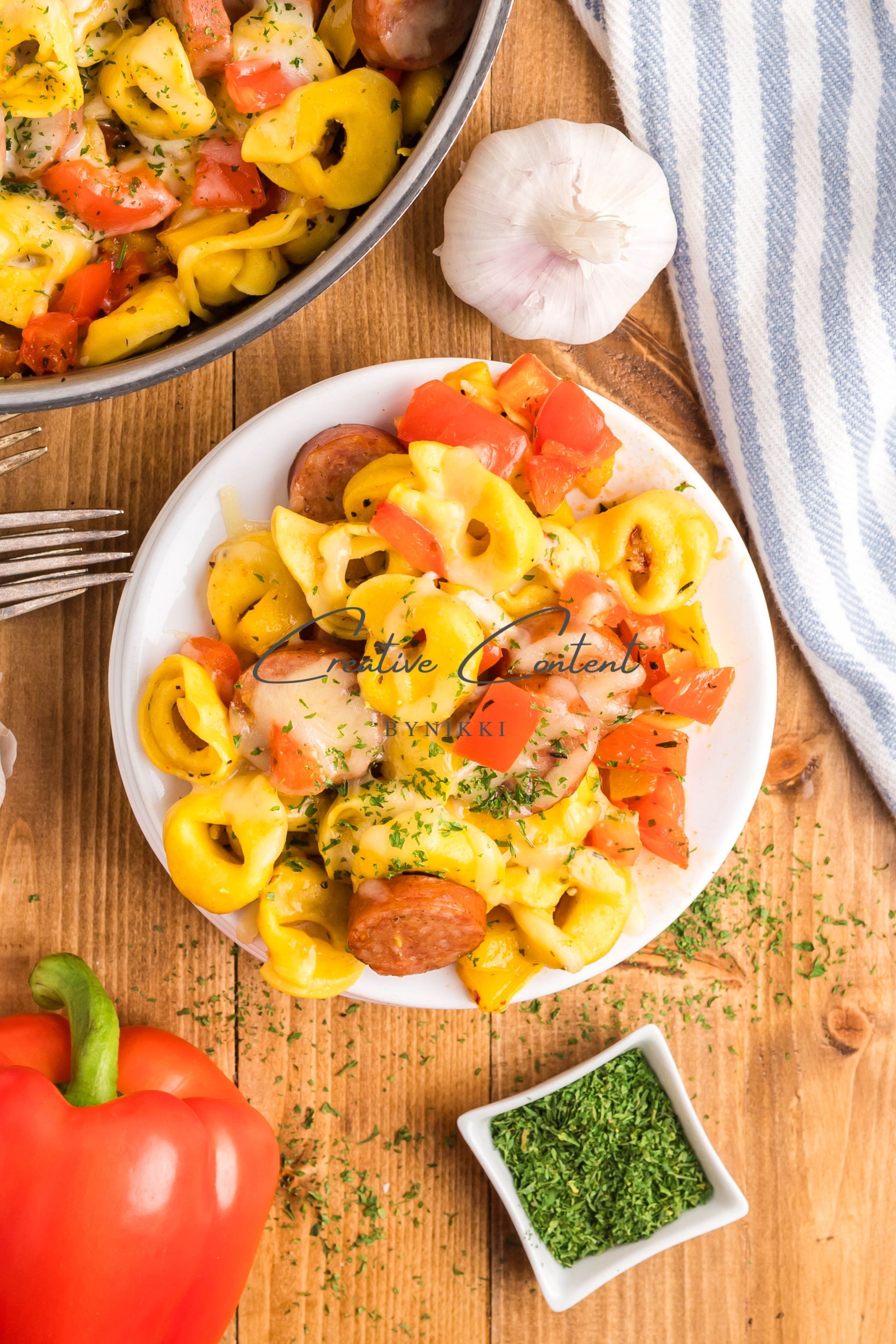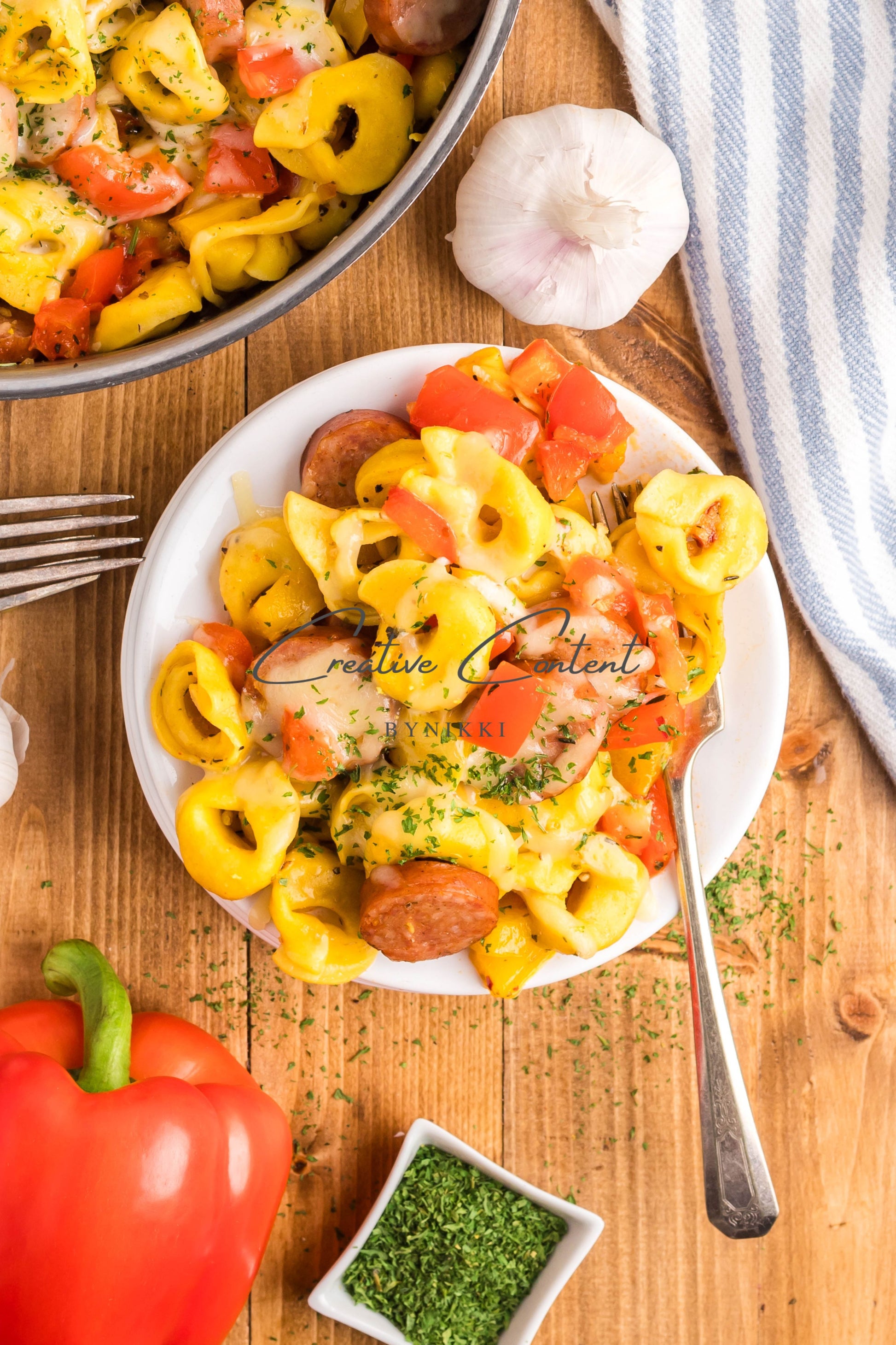 - Ingredients: avocado oil, kielbasa, red bell pepper, yellow onion, kosher salt, black pepper, garlic, cheese tortellini, chicken stock, Italian seasoning, sweet paprika, red pepper flakes, mozzarella cheese, dried parsley