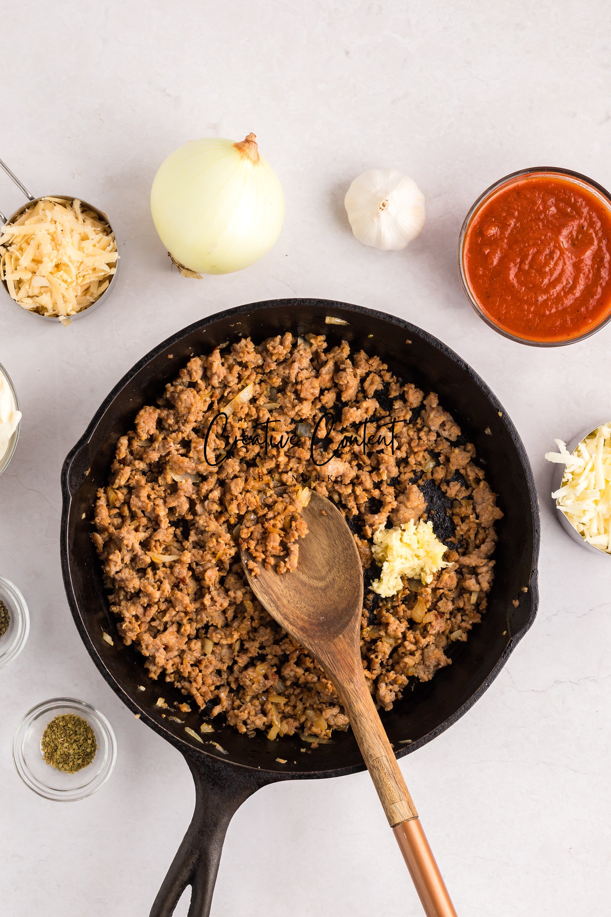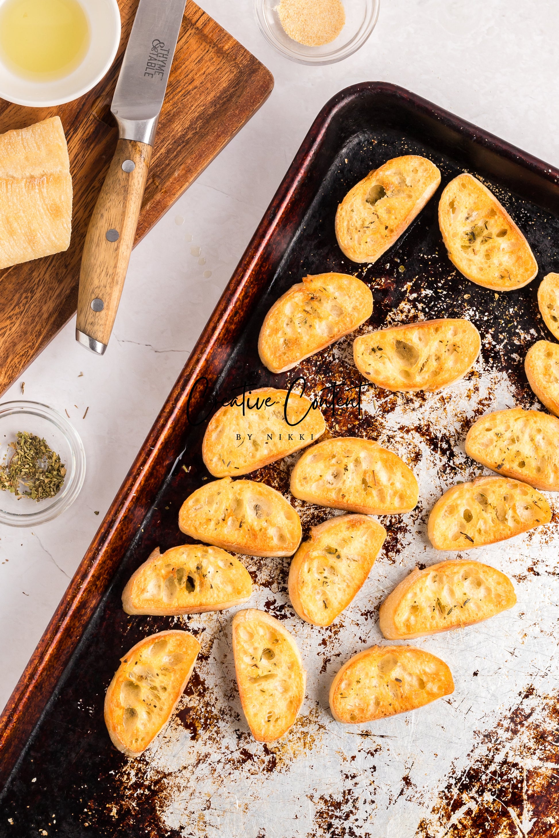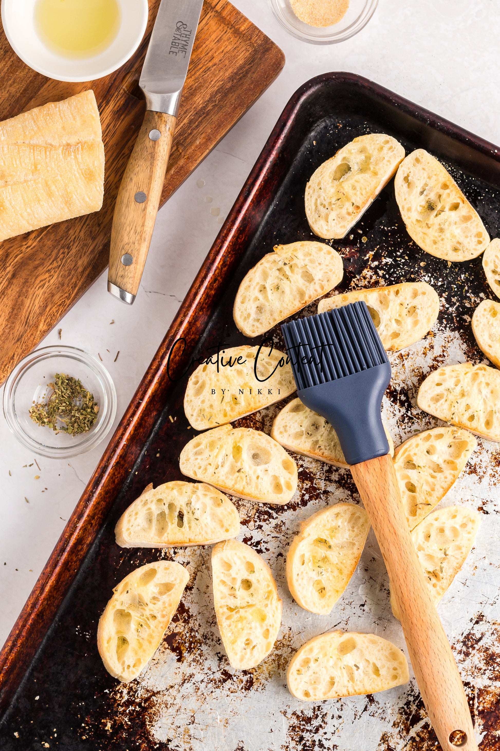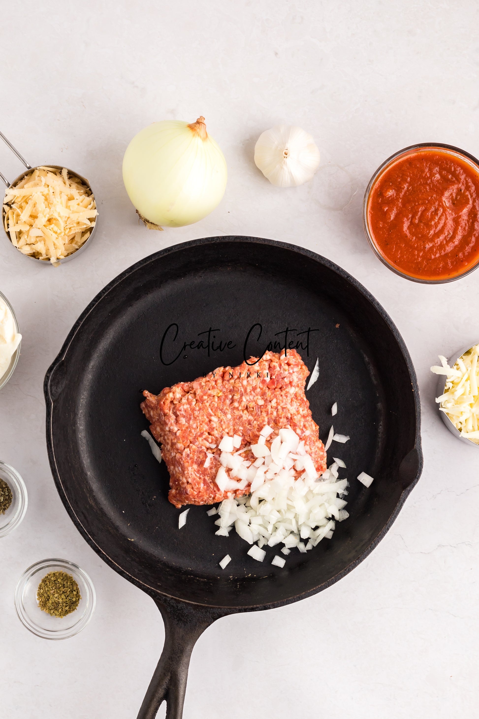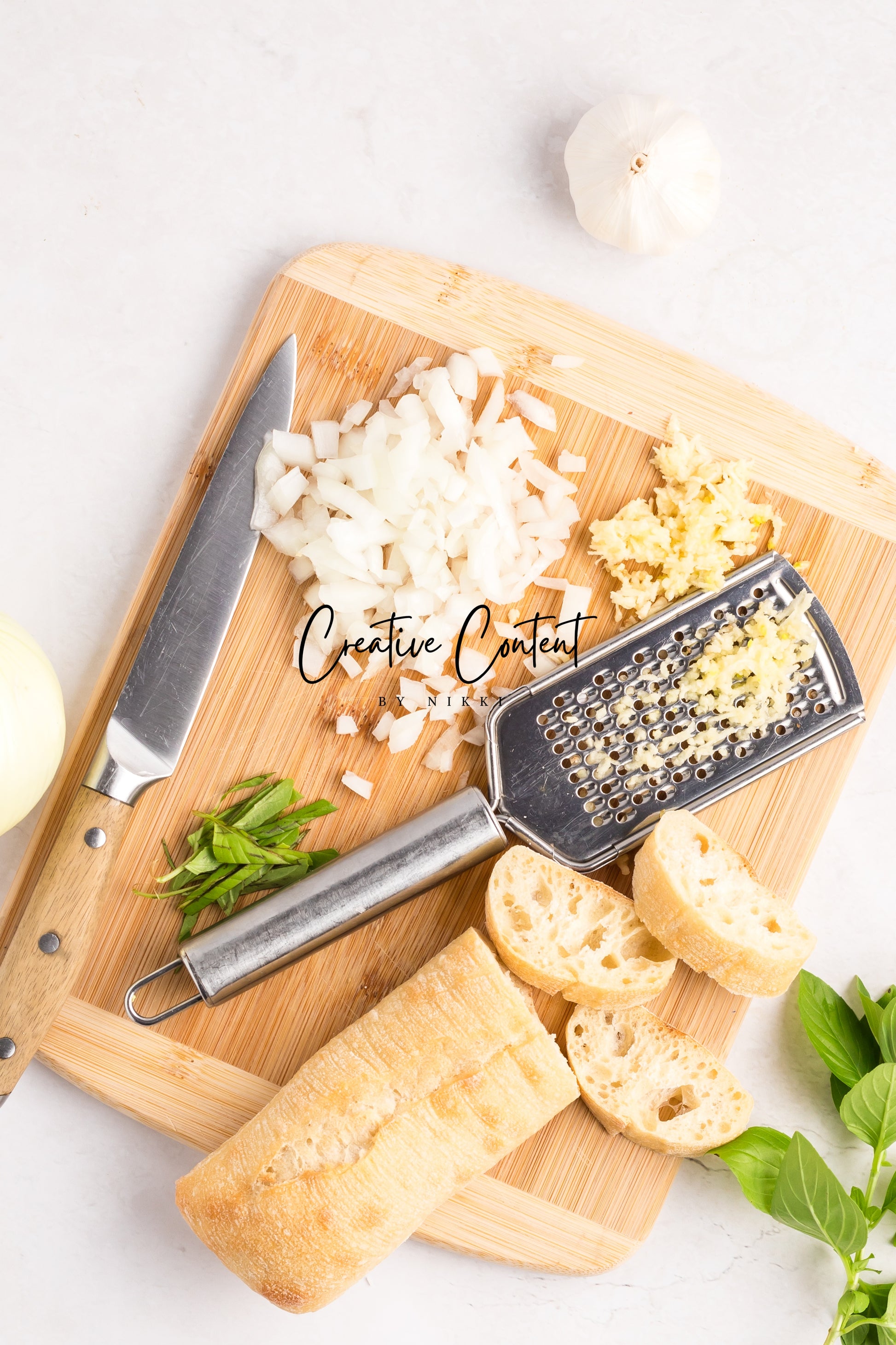 - Featured Ingredients; baguette, avocado oil, seasonings, Italian sausage, yellow onion, garlic cloves, marinara sauce, ricotta cheese, mozzarella cheese, parmesan cheese, and basil leaves.