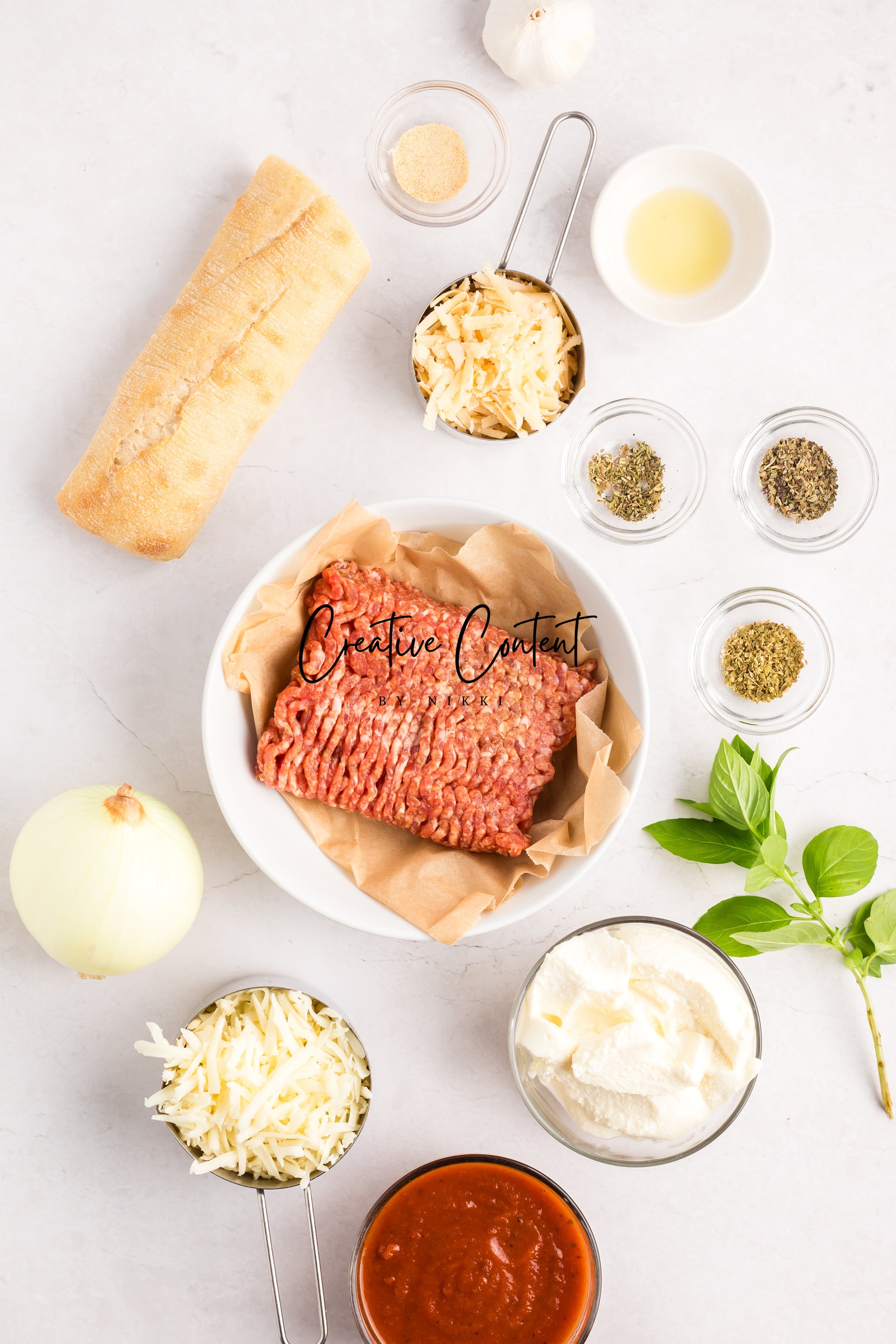 - Featured Ingredients; baguette, avocado oil, seasonings, Italian sausage, yellow onion, garlic cloves, marinara sauce, ricotta cheese, mozzarella cheese, parmesan cheese, and basil leaves.