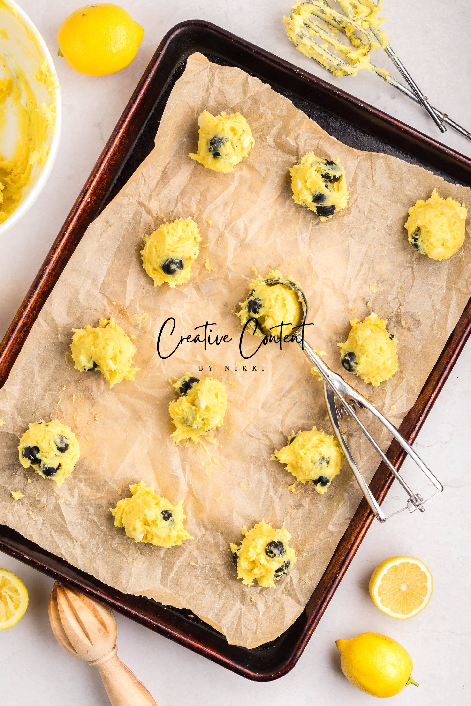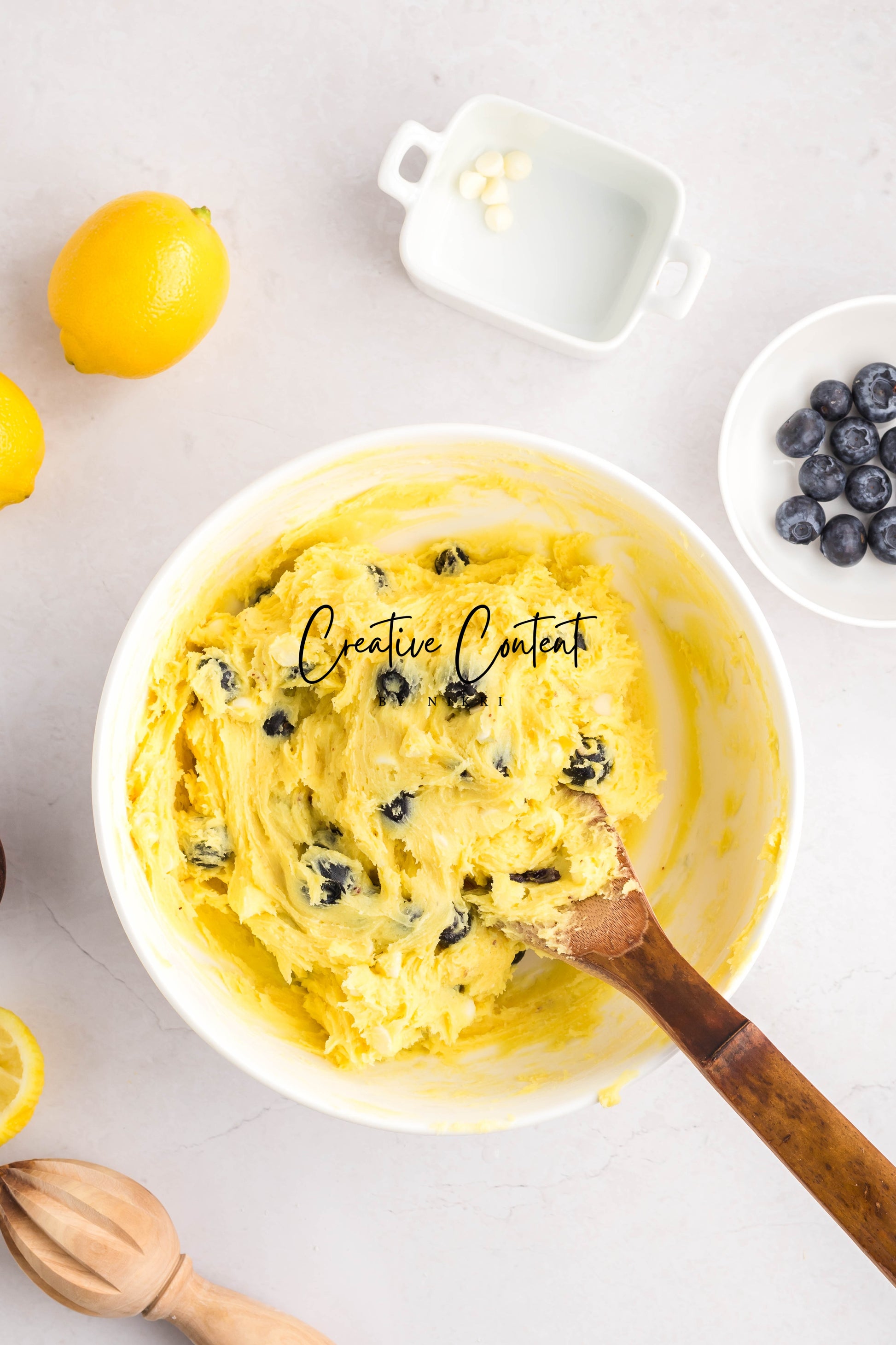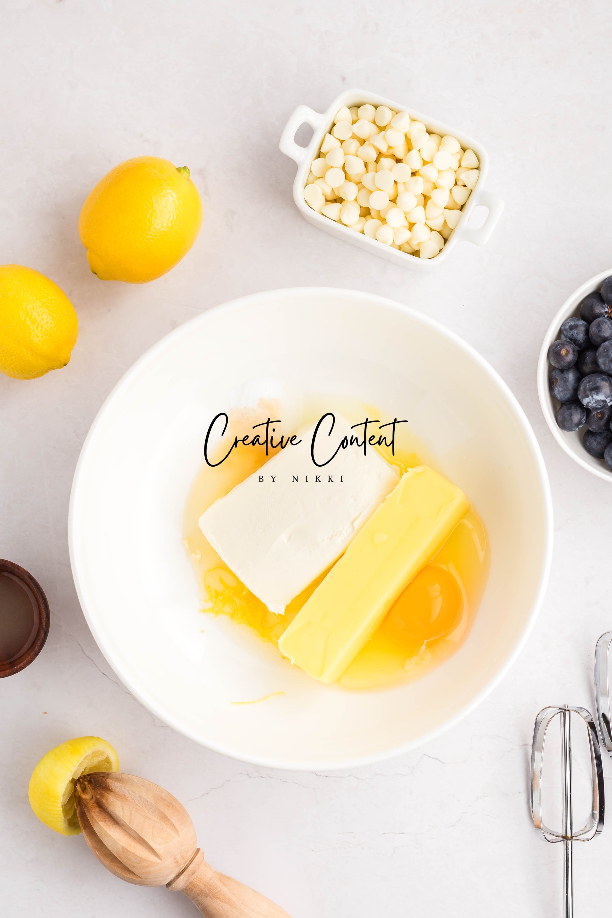 - Ingredients: cream cheese, butter, egg, lemon juice, baking powder, vanilla extract, lemon cake mix, blueberries, white chocolate chips, and powdered sugar.