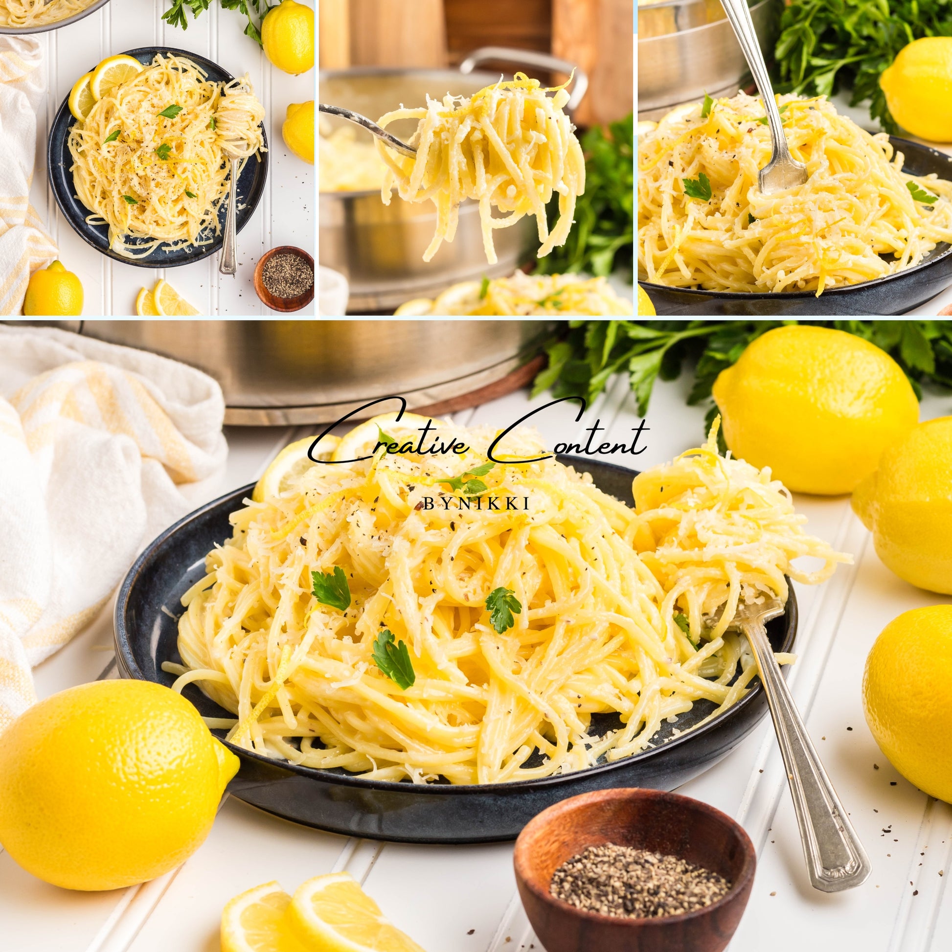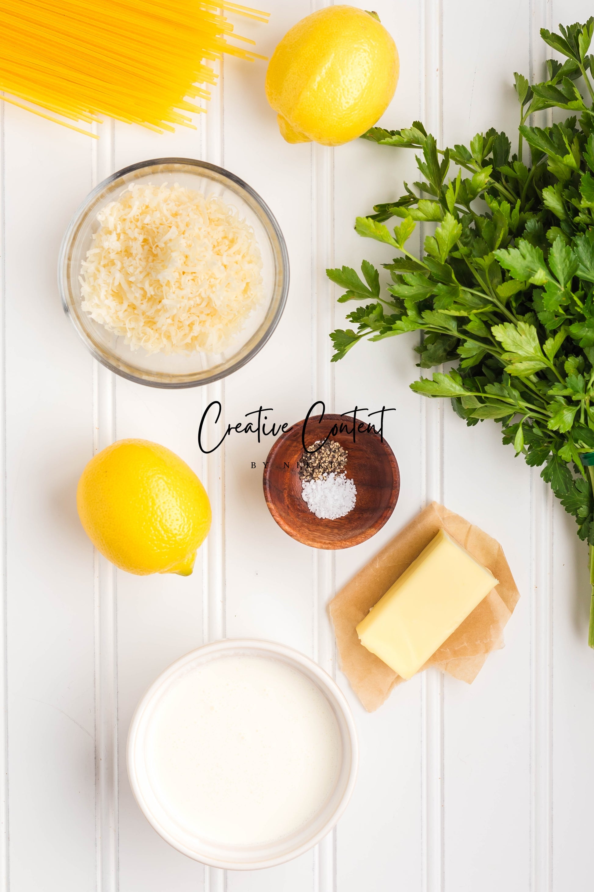 - Ingredients: spaghetti, unsalted butter, lemon zest, lemon juice, heavy cream, coarse kosher salt, black pepper, grated parmesan cheese, Italian parsley leaves