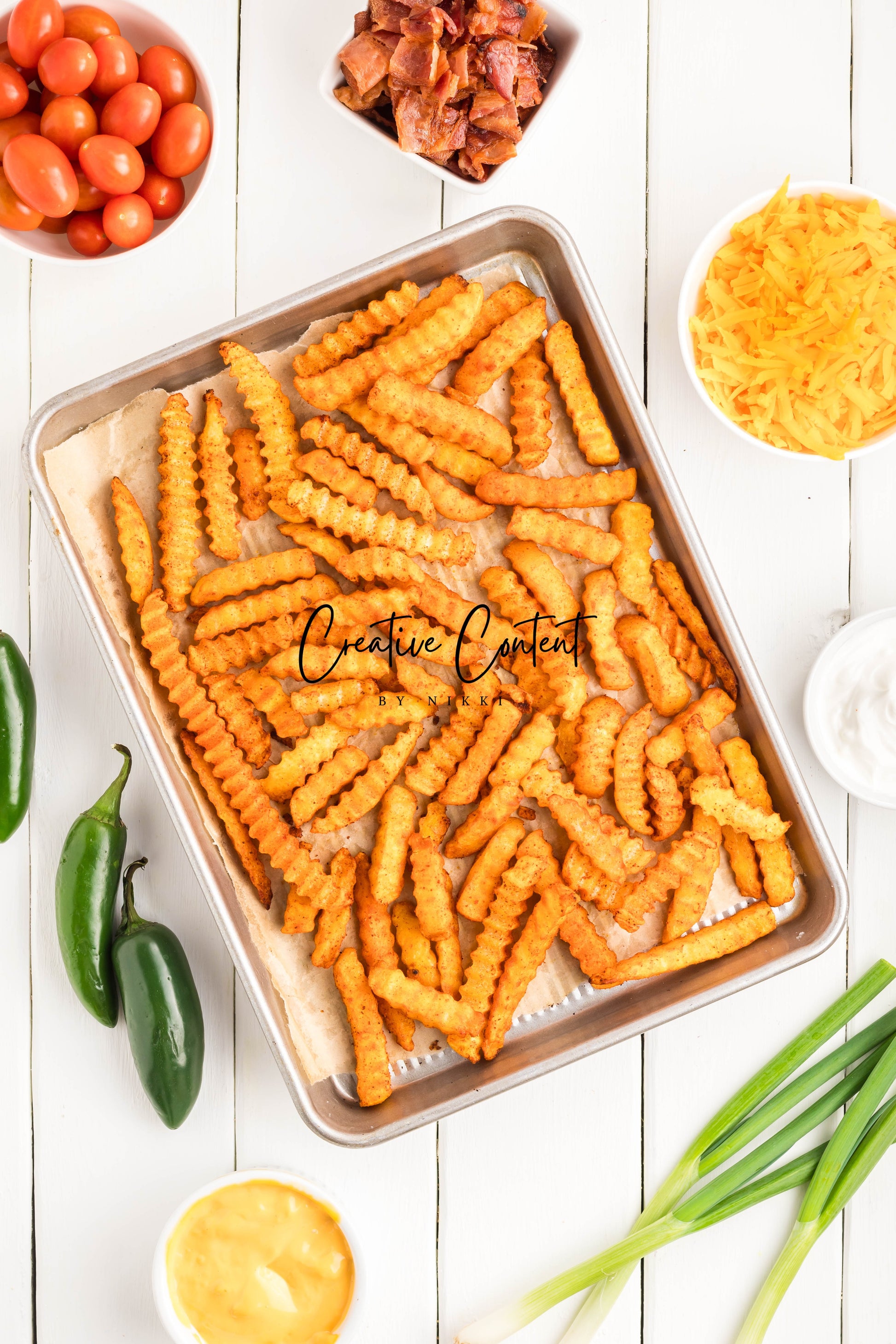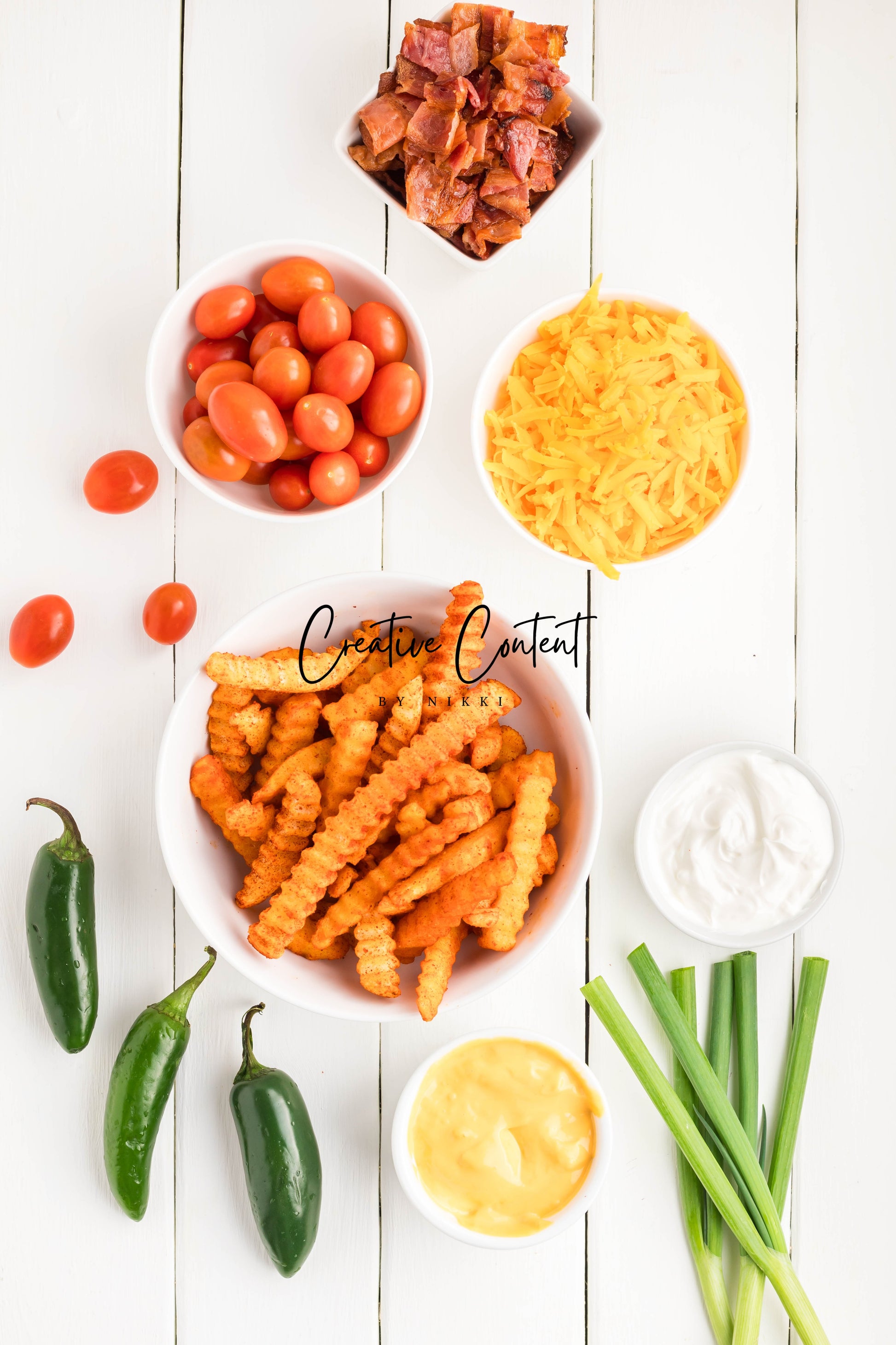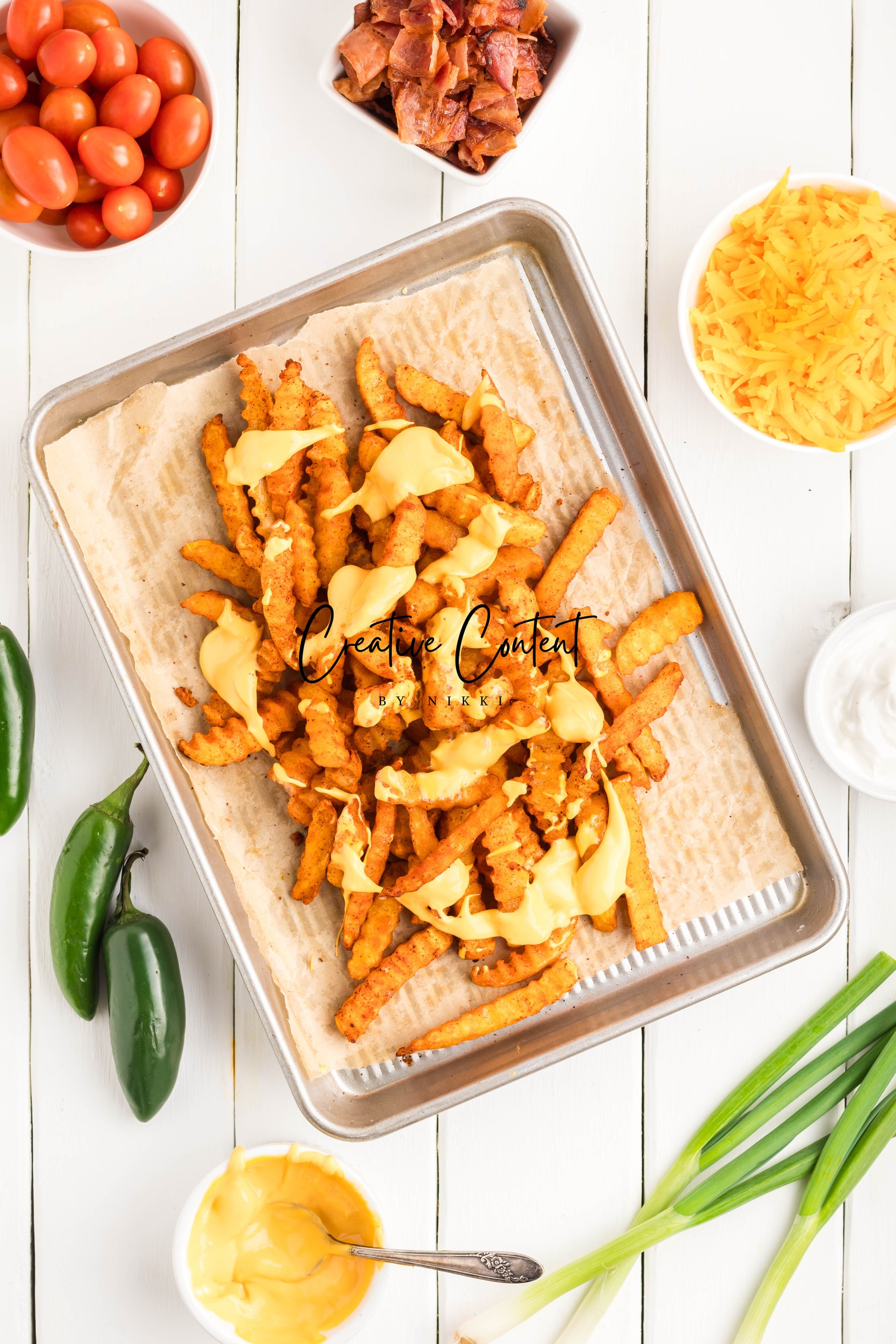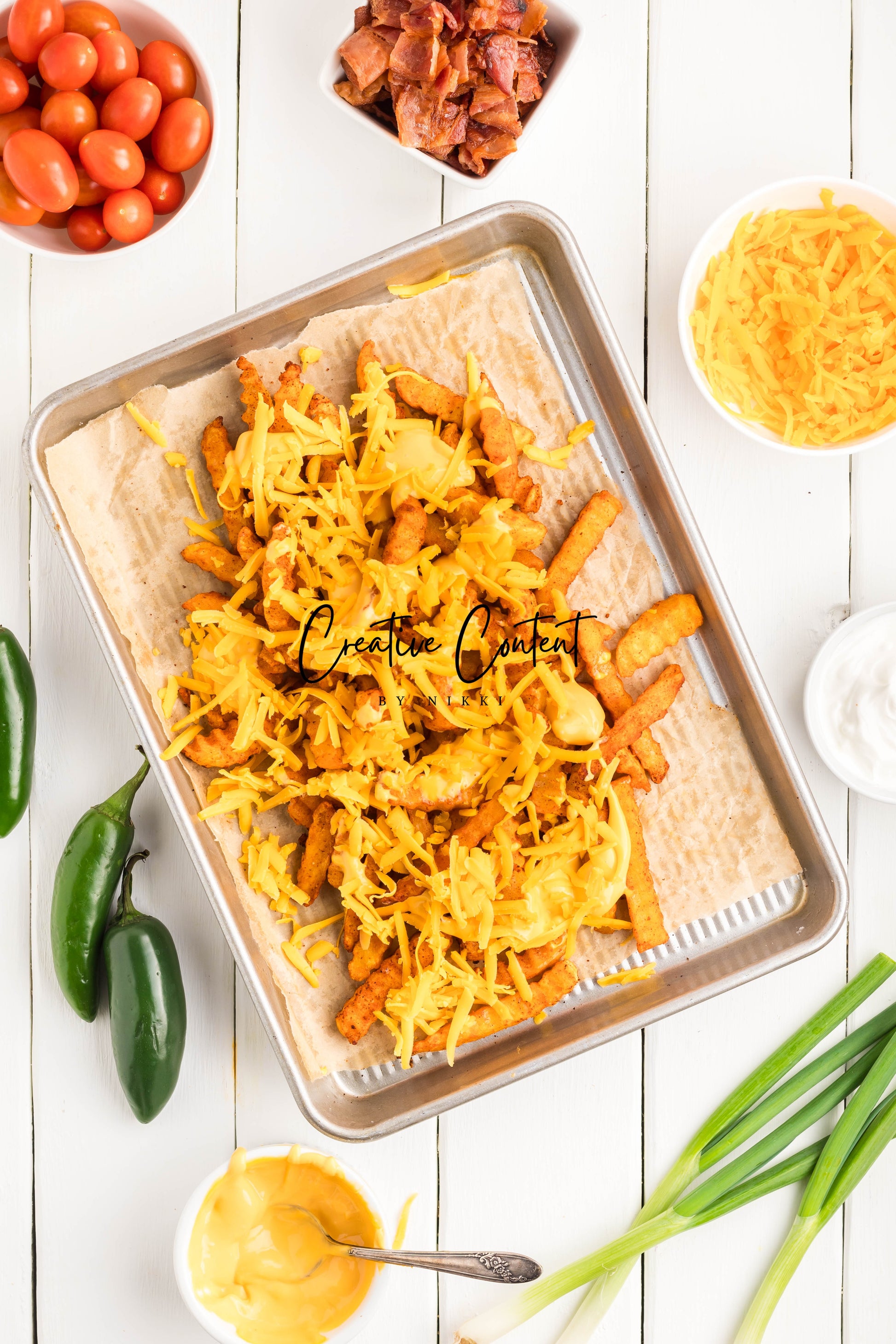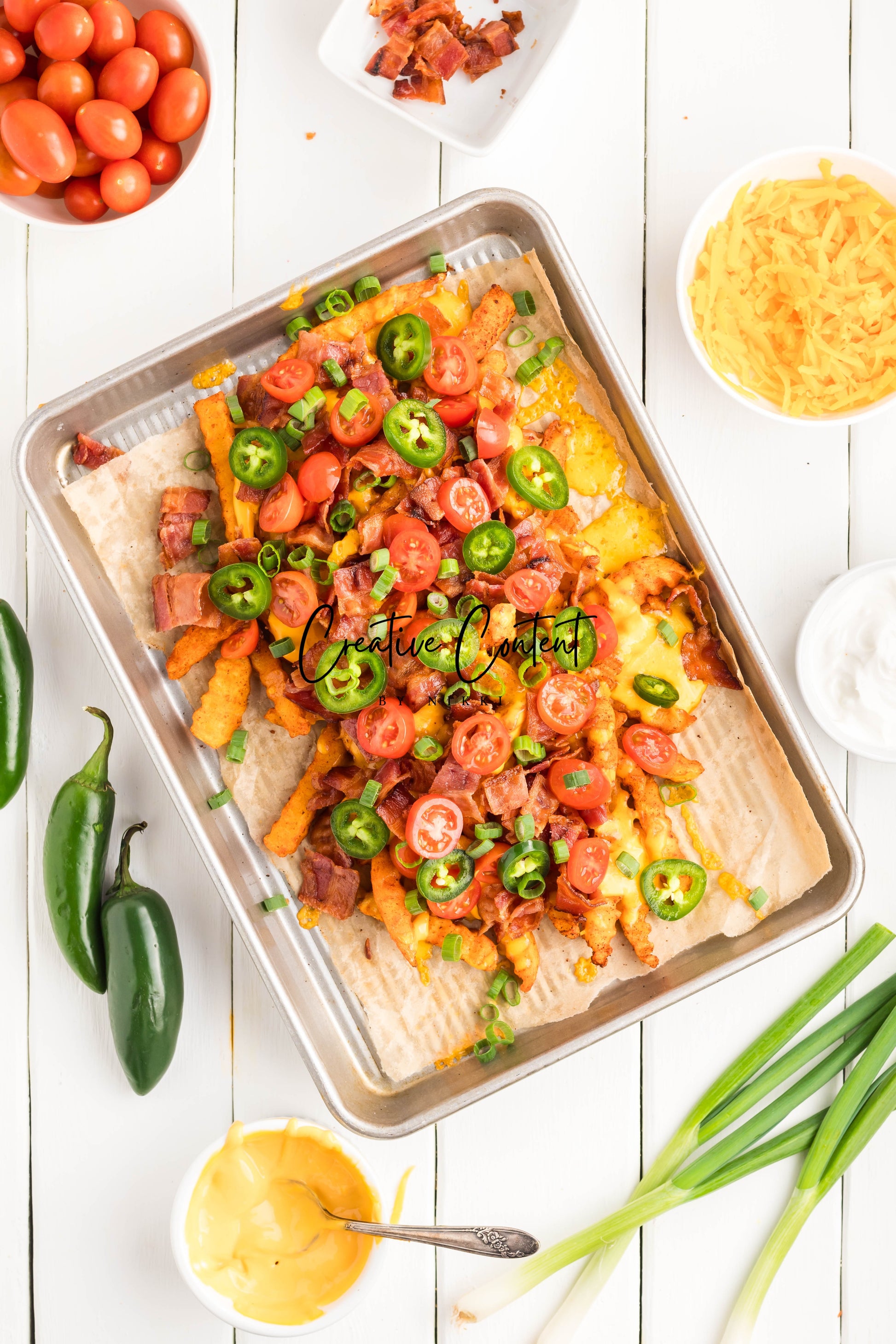 - Ingredients: frozen French fries, cheese dip, shredded cheddar cheese, crumbled bacon, cherry tomatoes, jalapenos, and sour cream