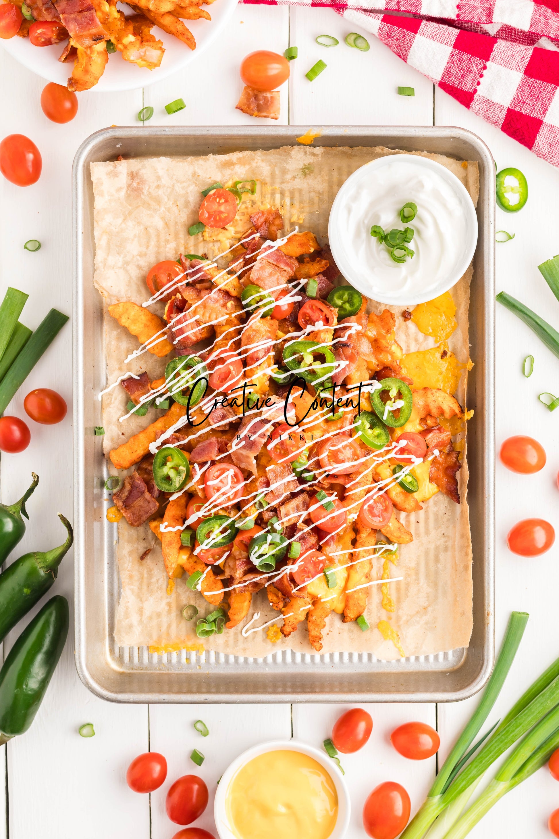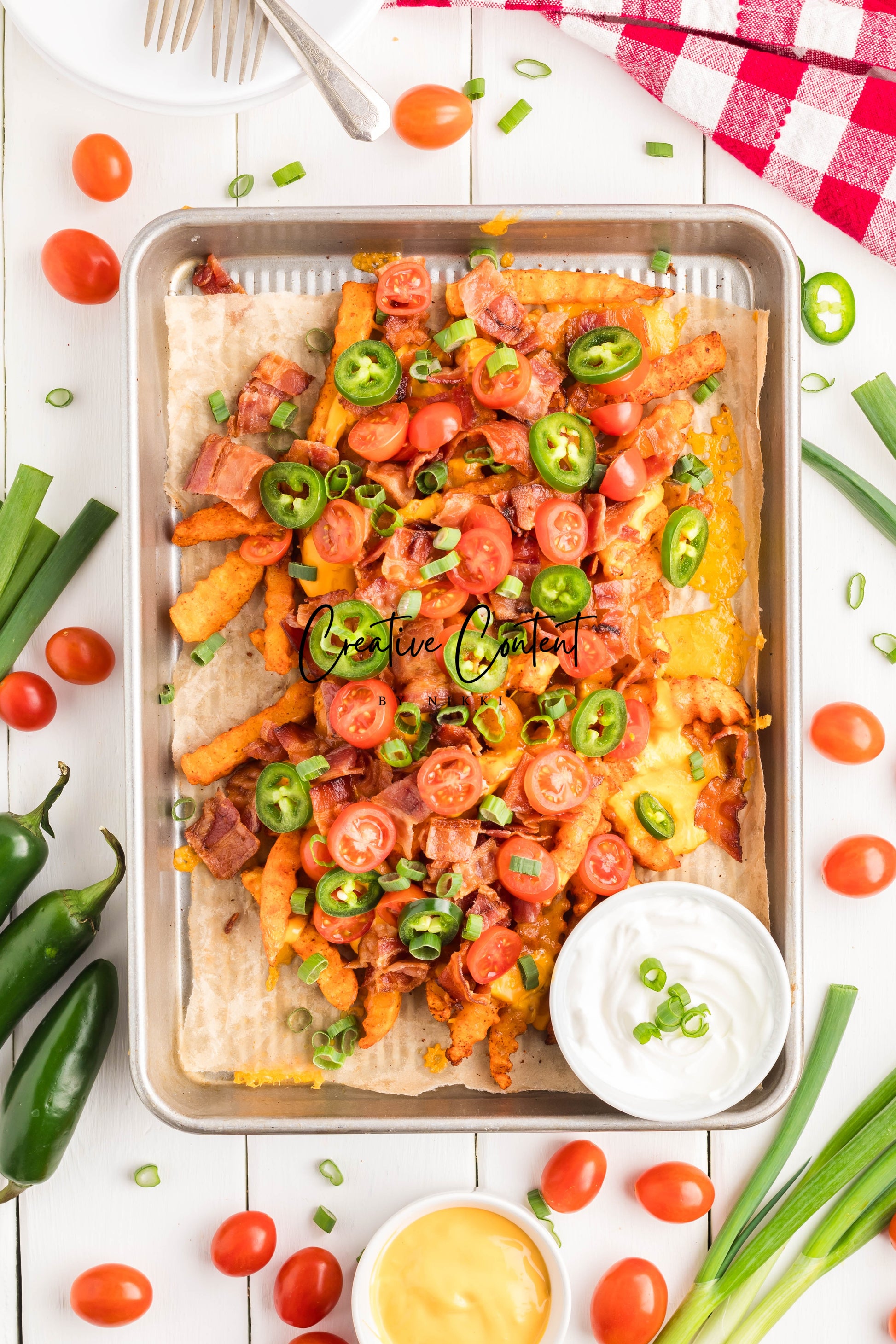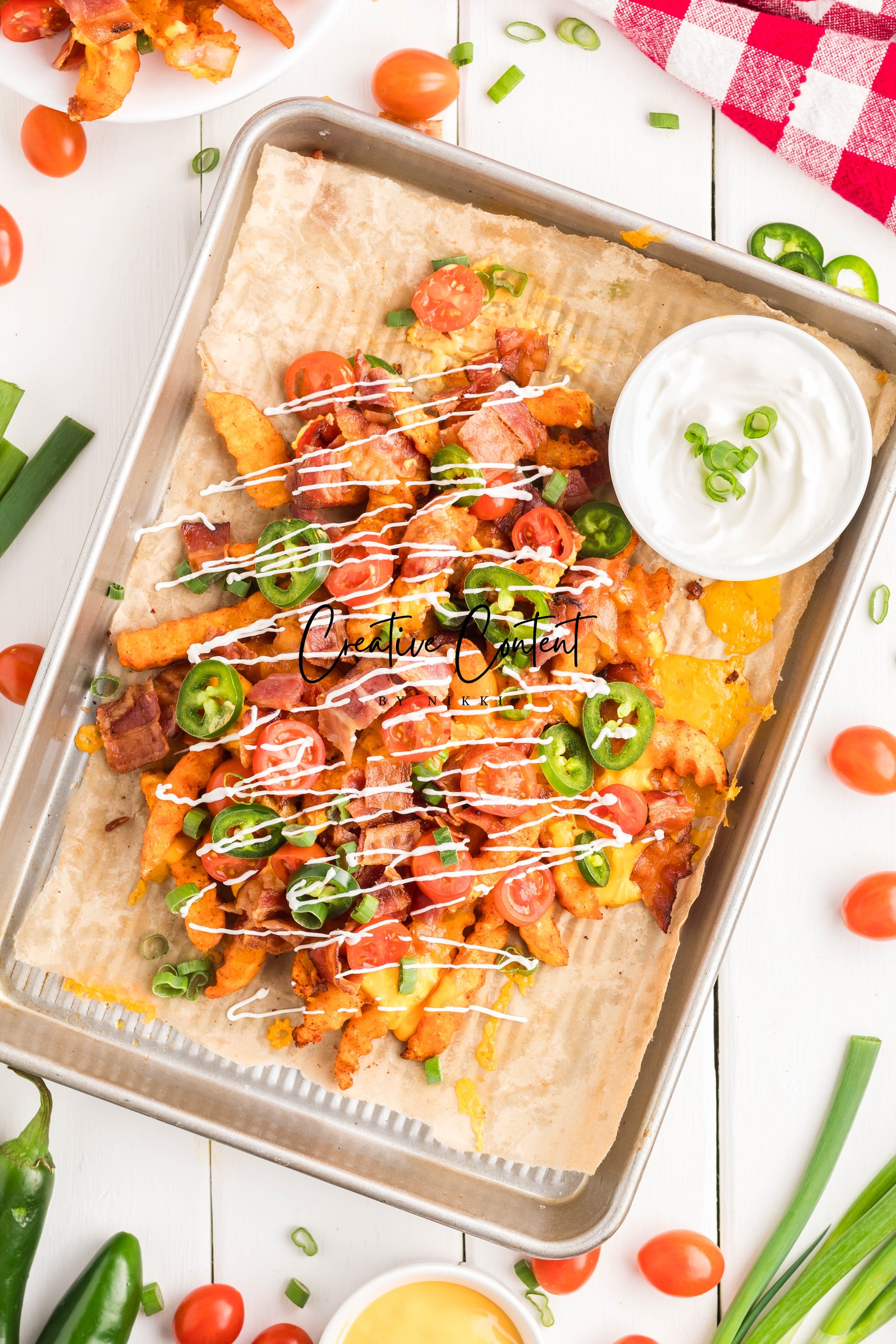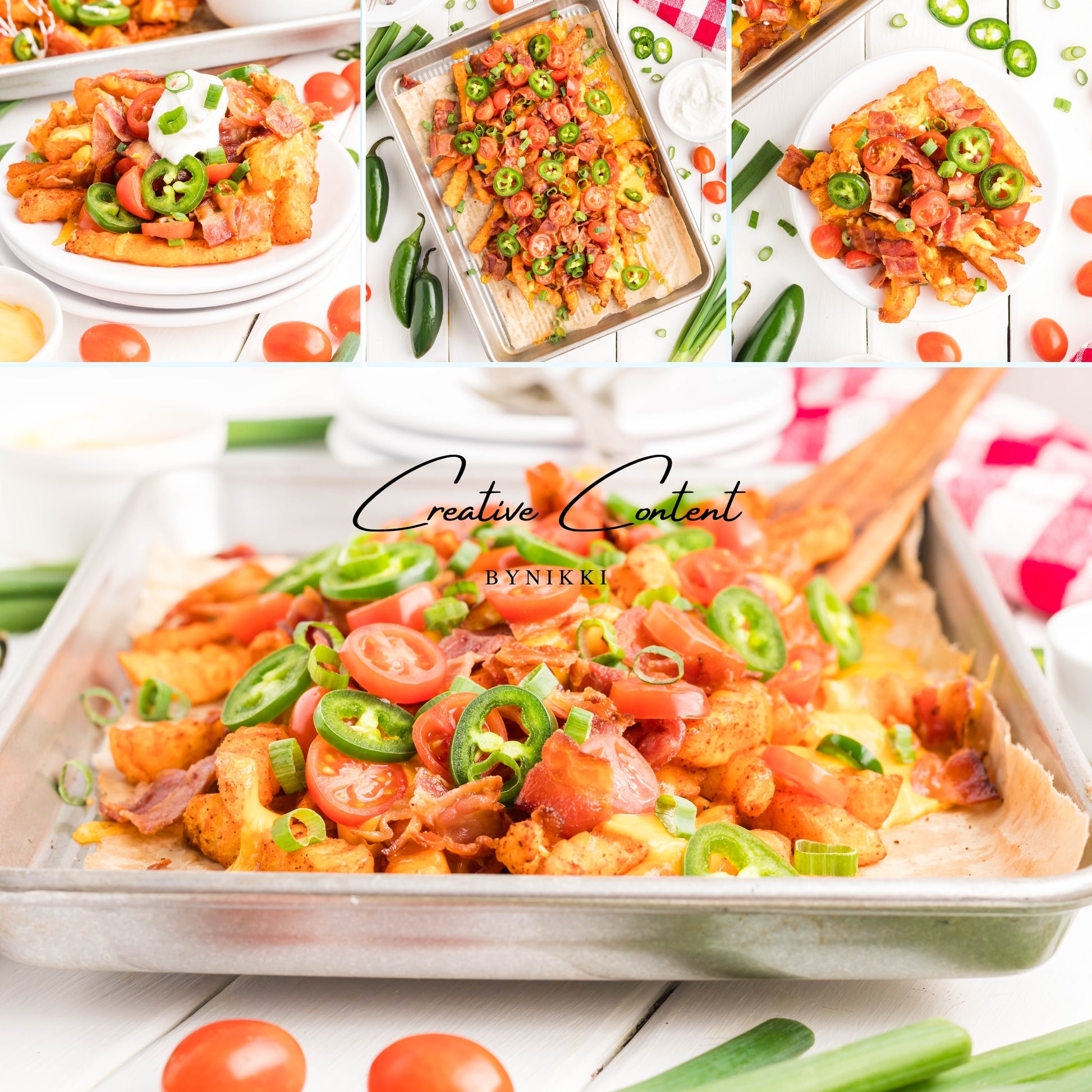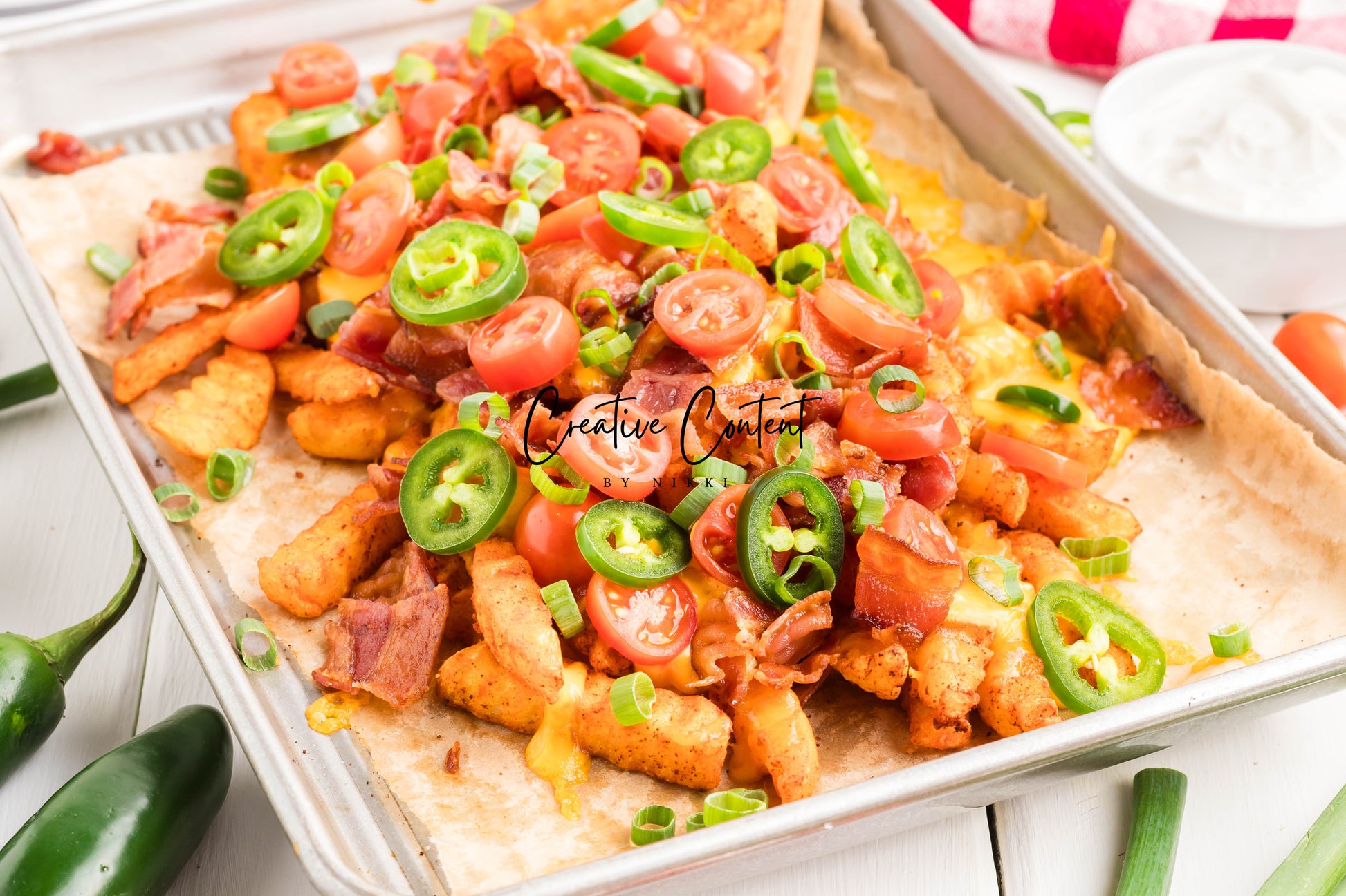 - Ingredients: frozen French fries, cheese dip, shredded cheddar cheese, crumbled bacon, cherry tomatoes, jalapenos, and sour cream