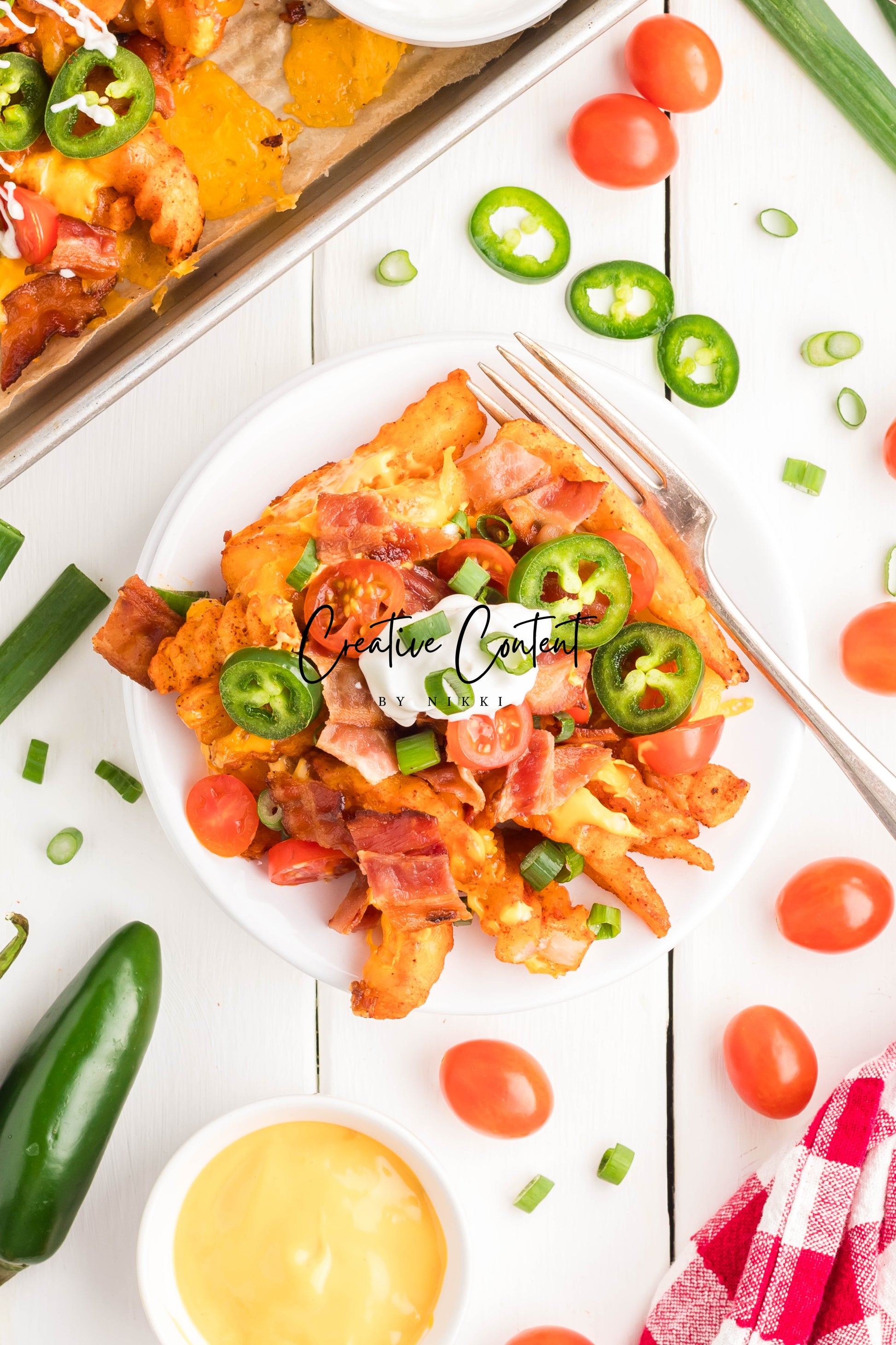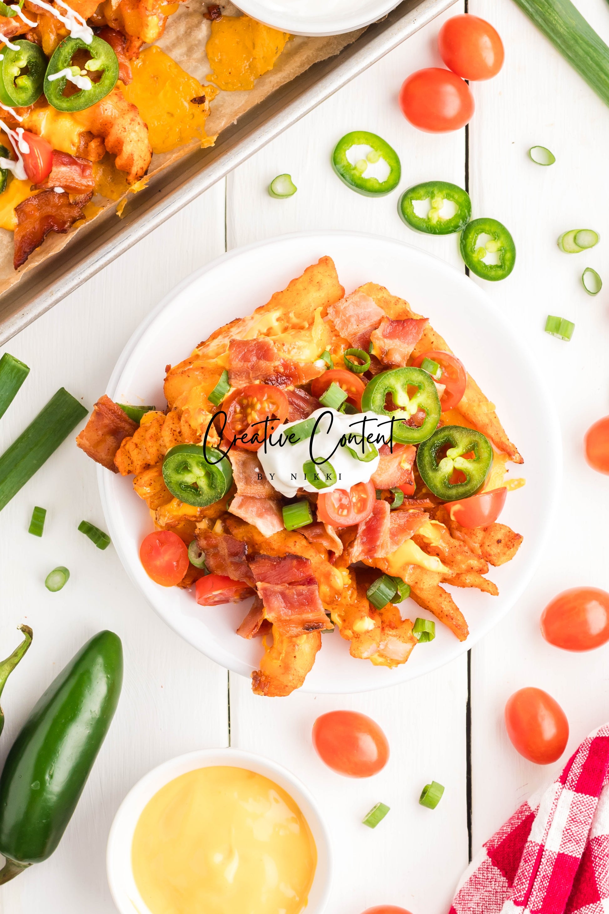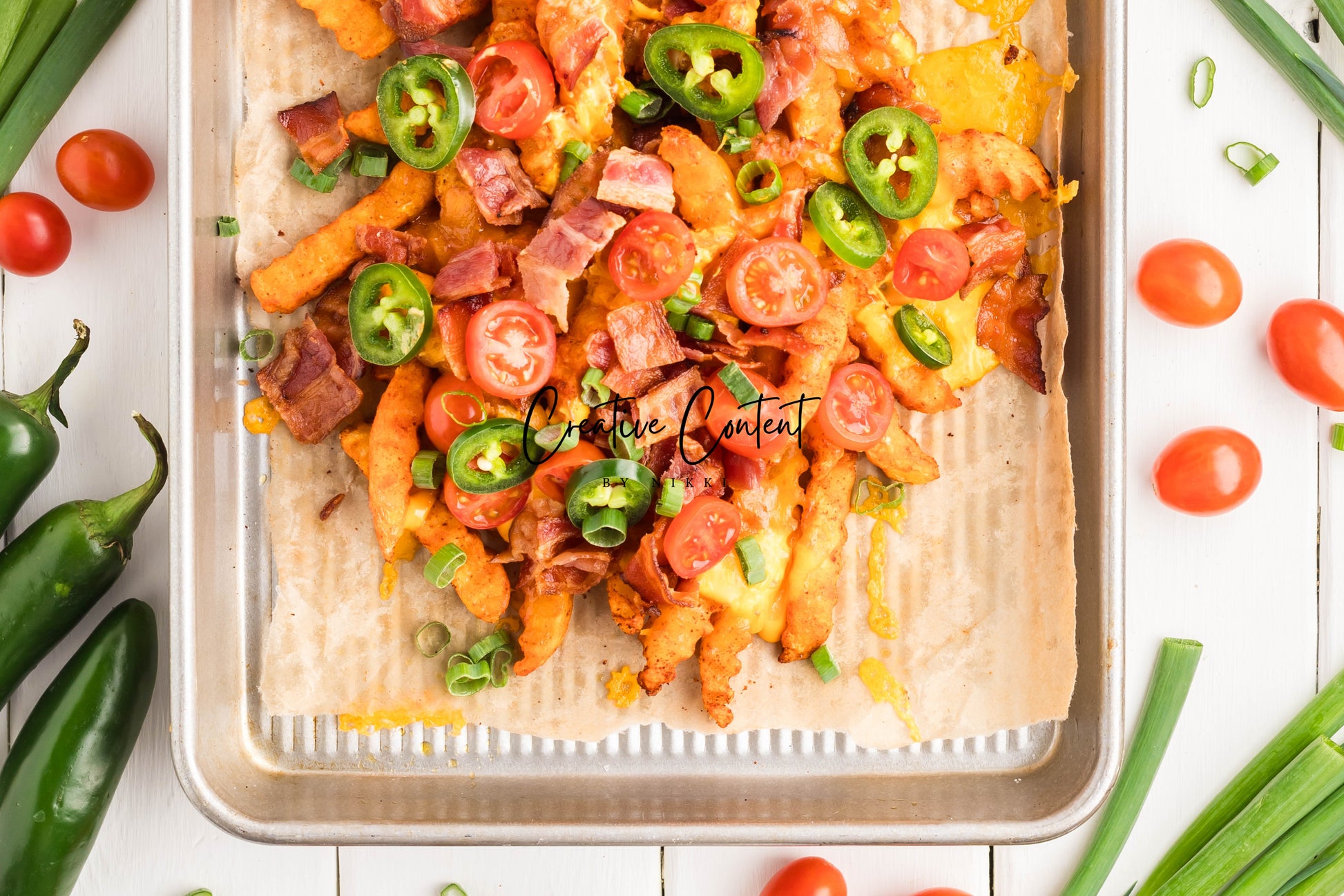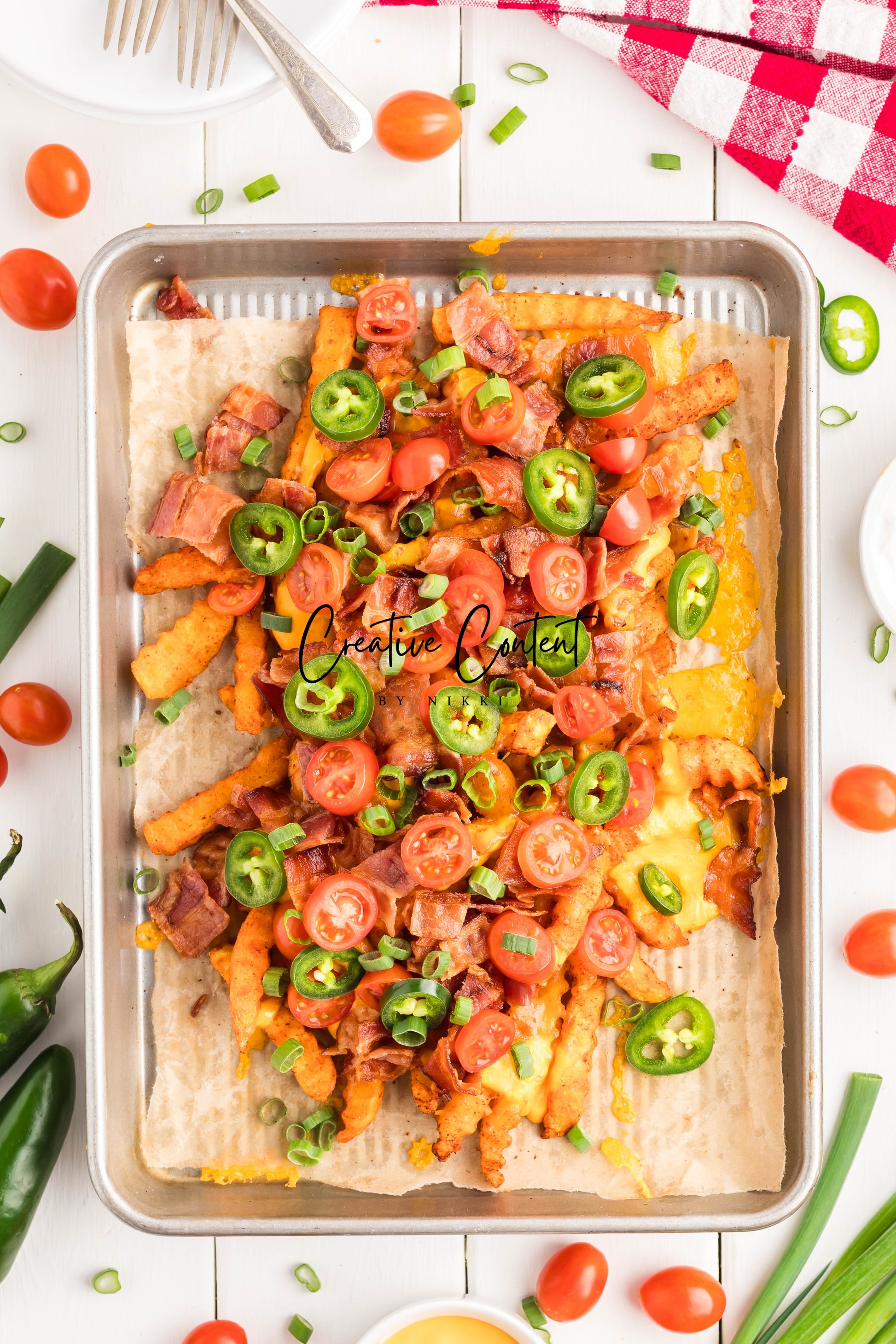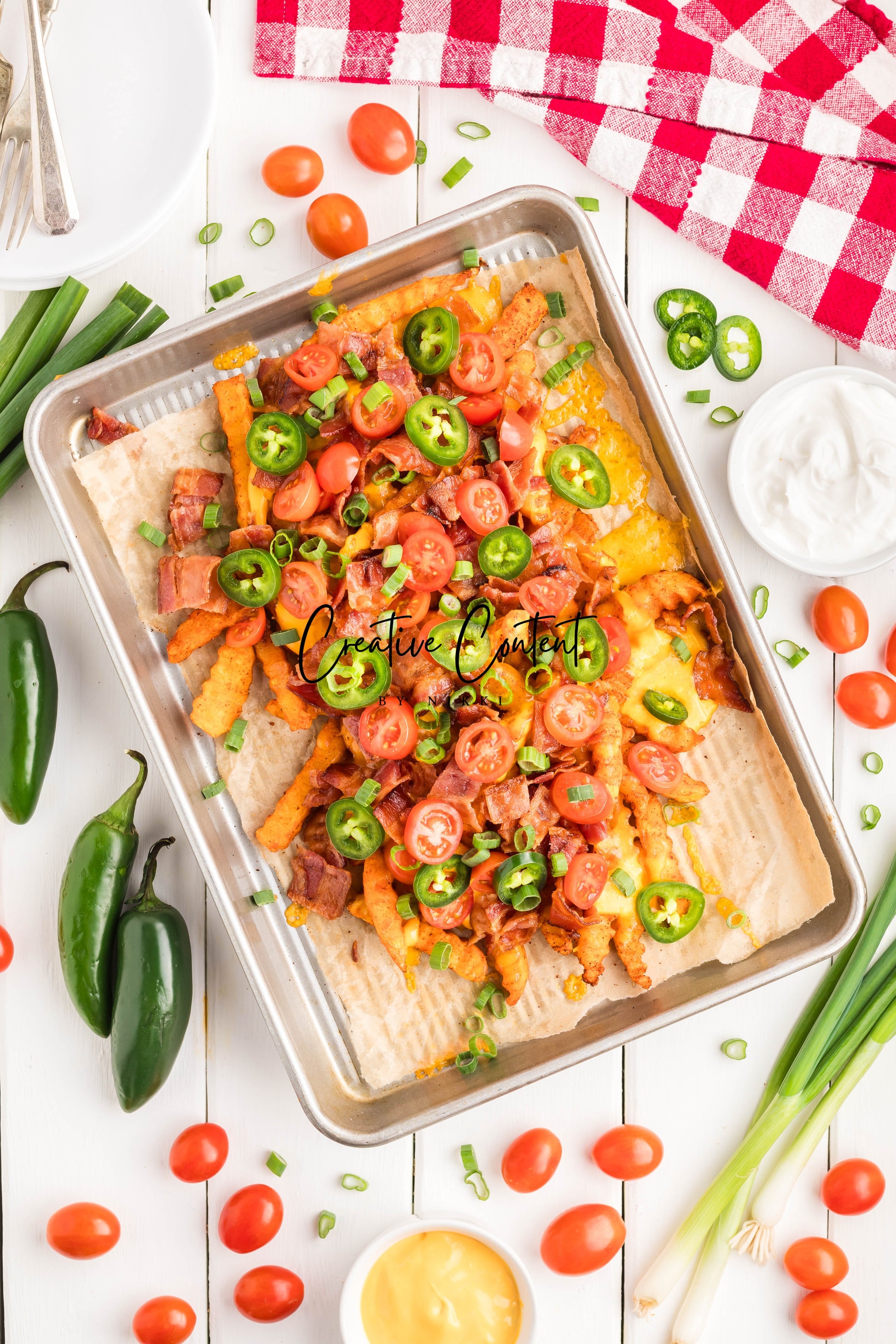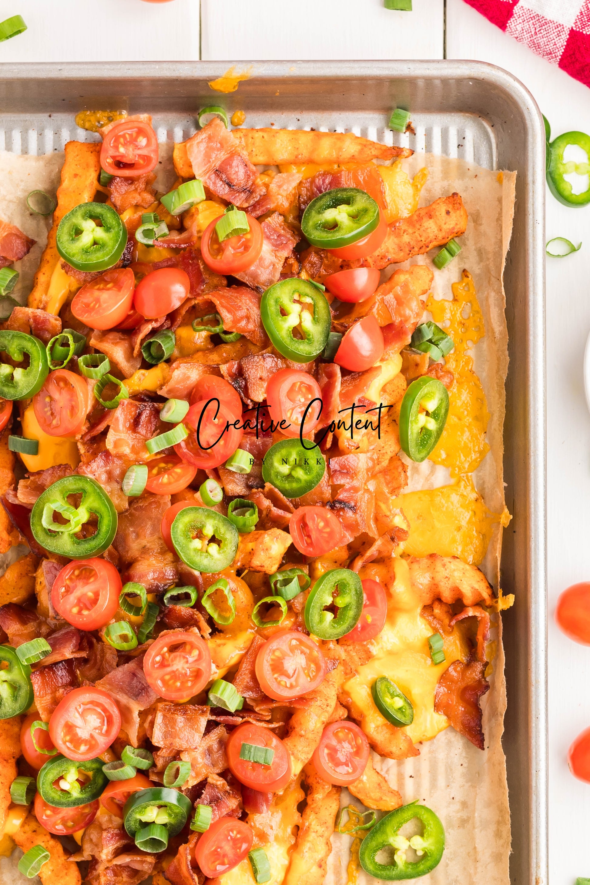 - Ingredients: frozen French fries, cheese dip, shredded cheddar cheese, crumbled bacon, cherry tomatoes, jalapenos, and sour cream