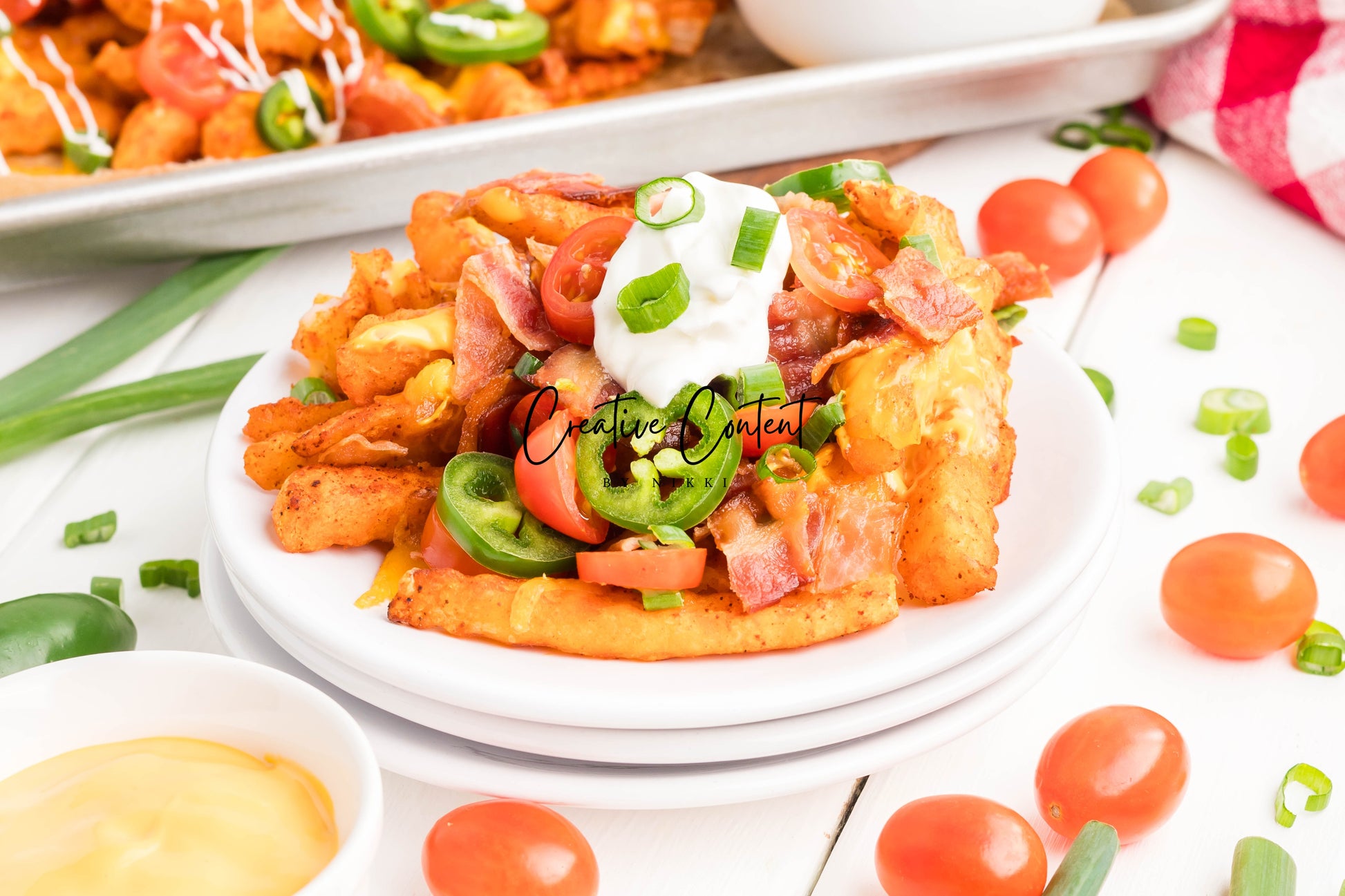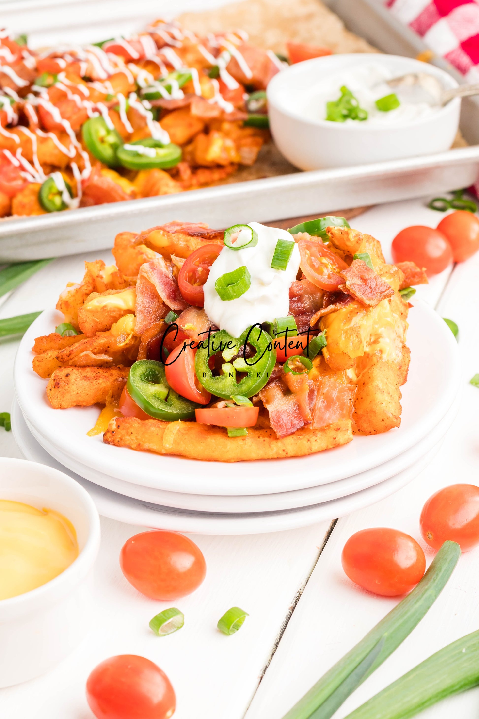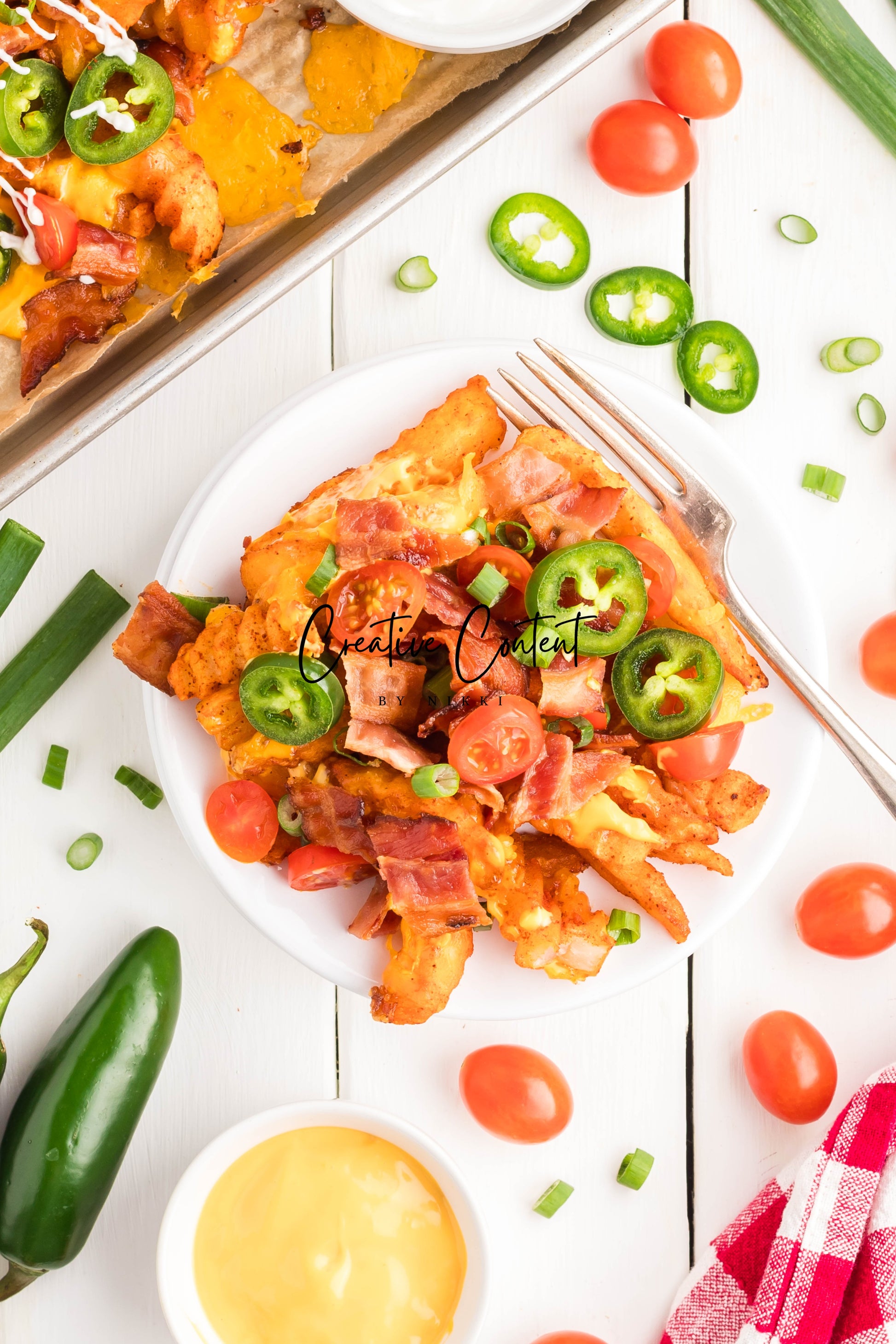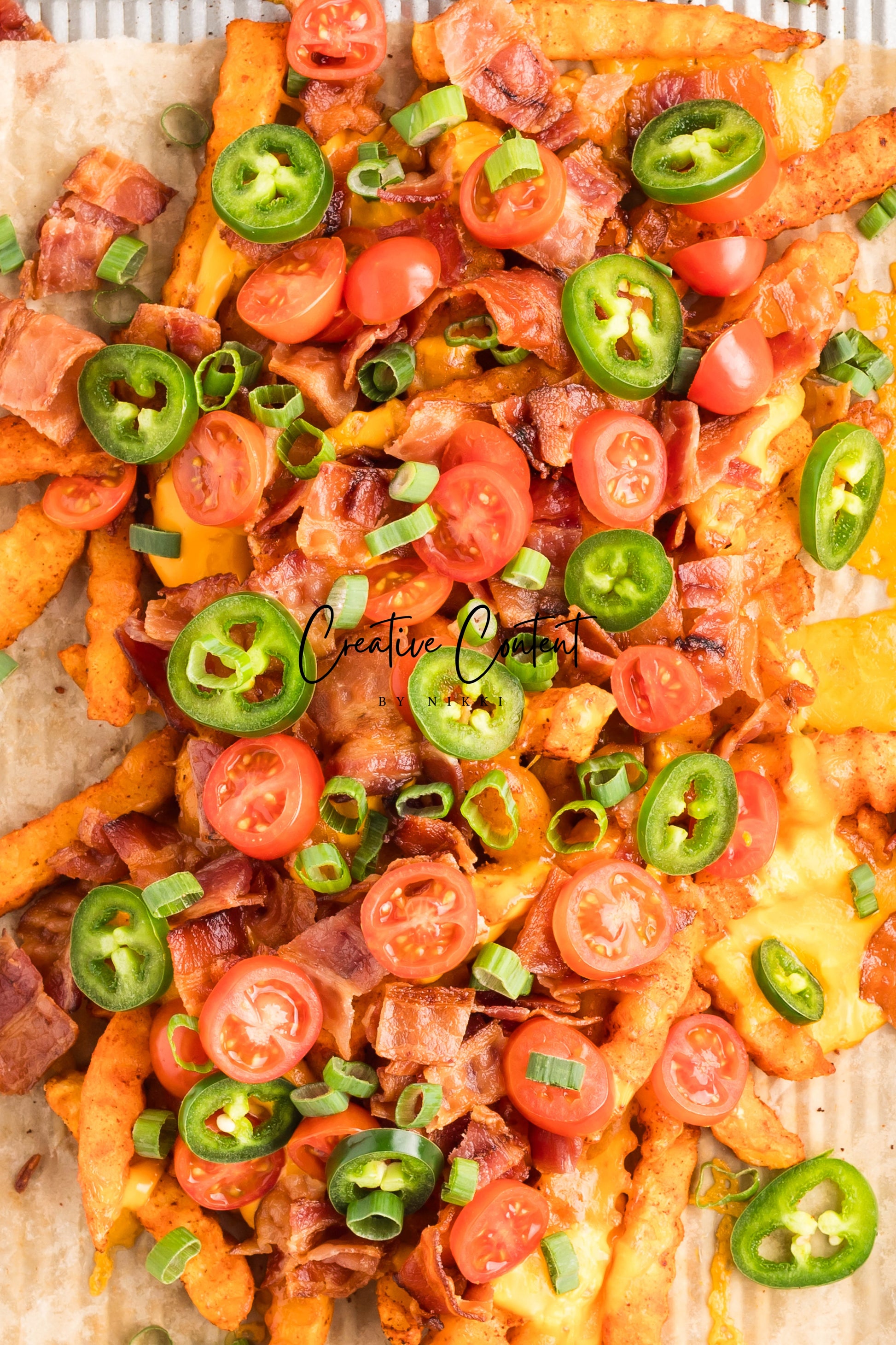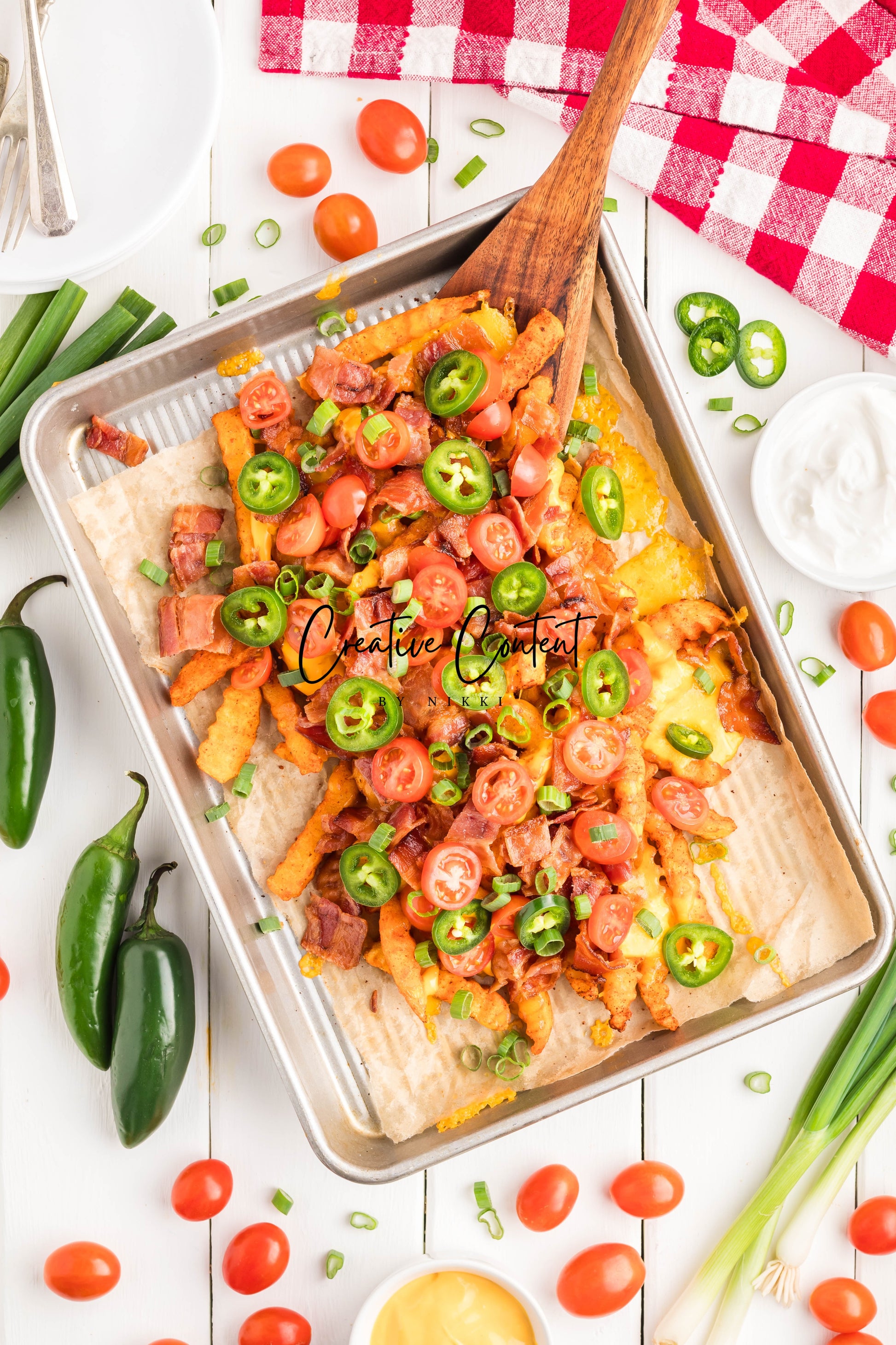 - Ingredients: frozen French fries, cheese dip, shredded cheddar cheese, crumbled bacon, cherry tomatoes, jalapenos, and sour cream