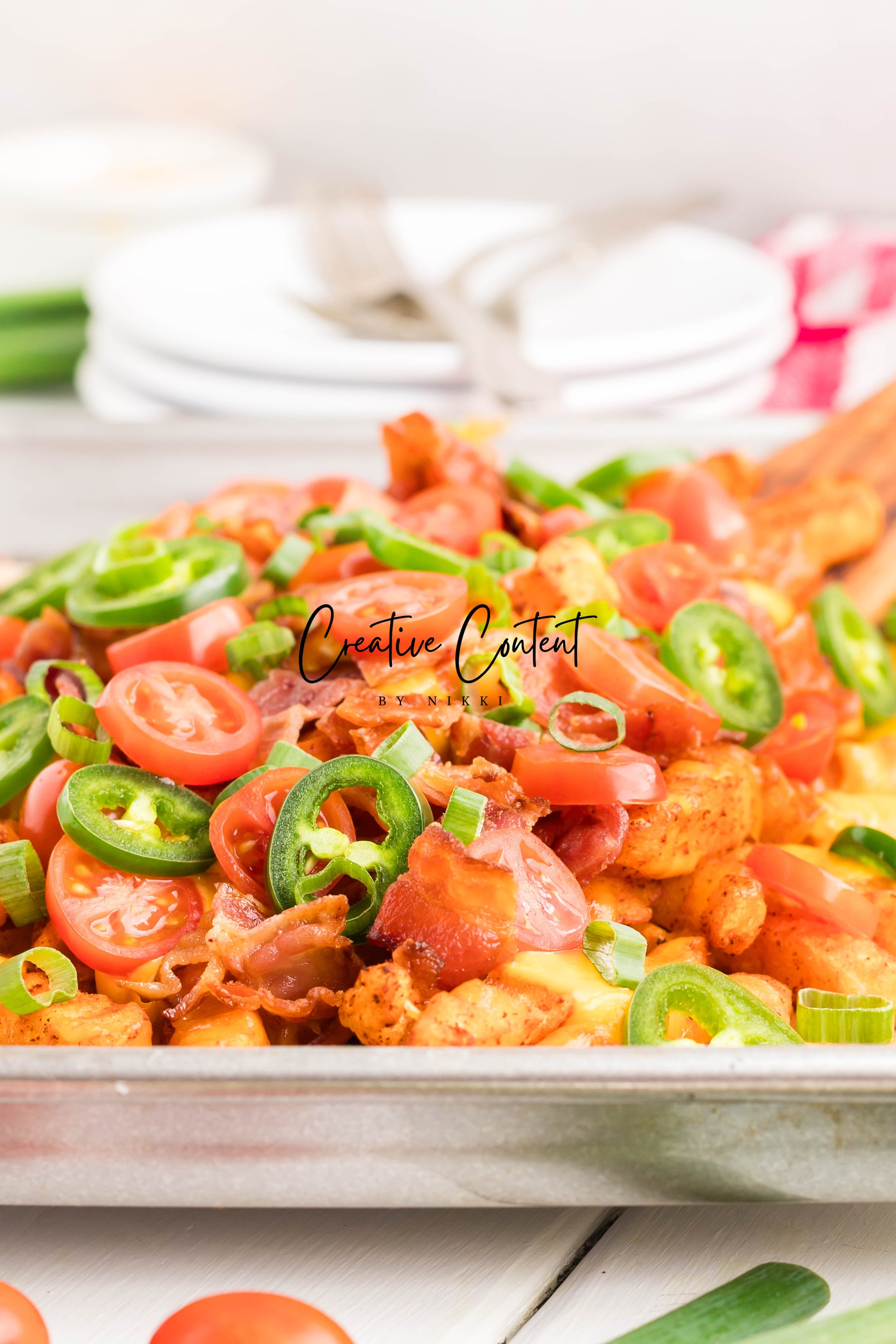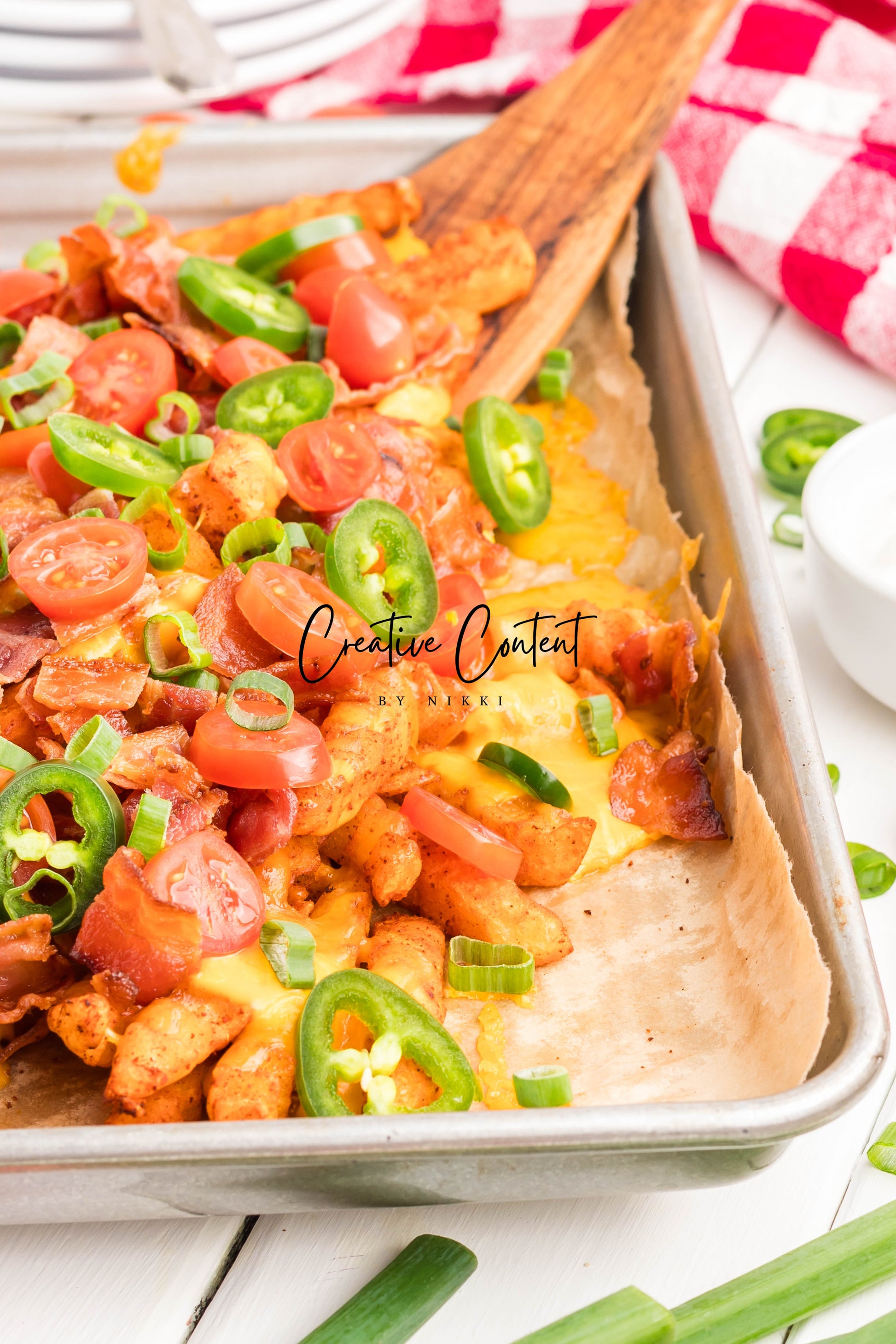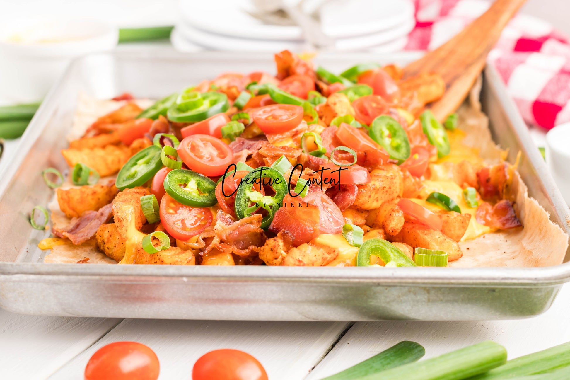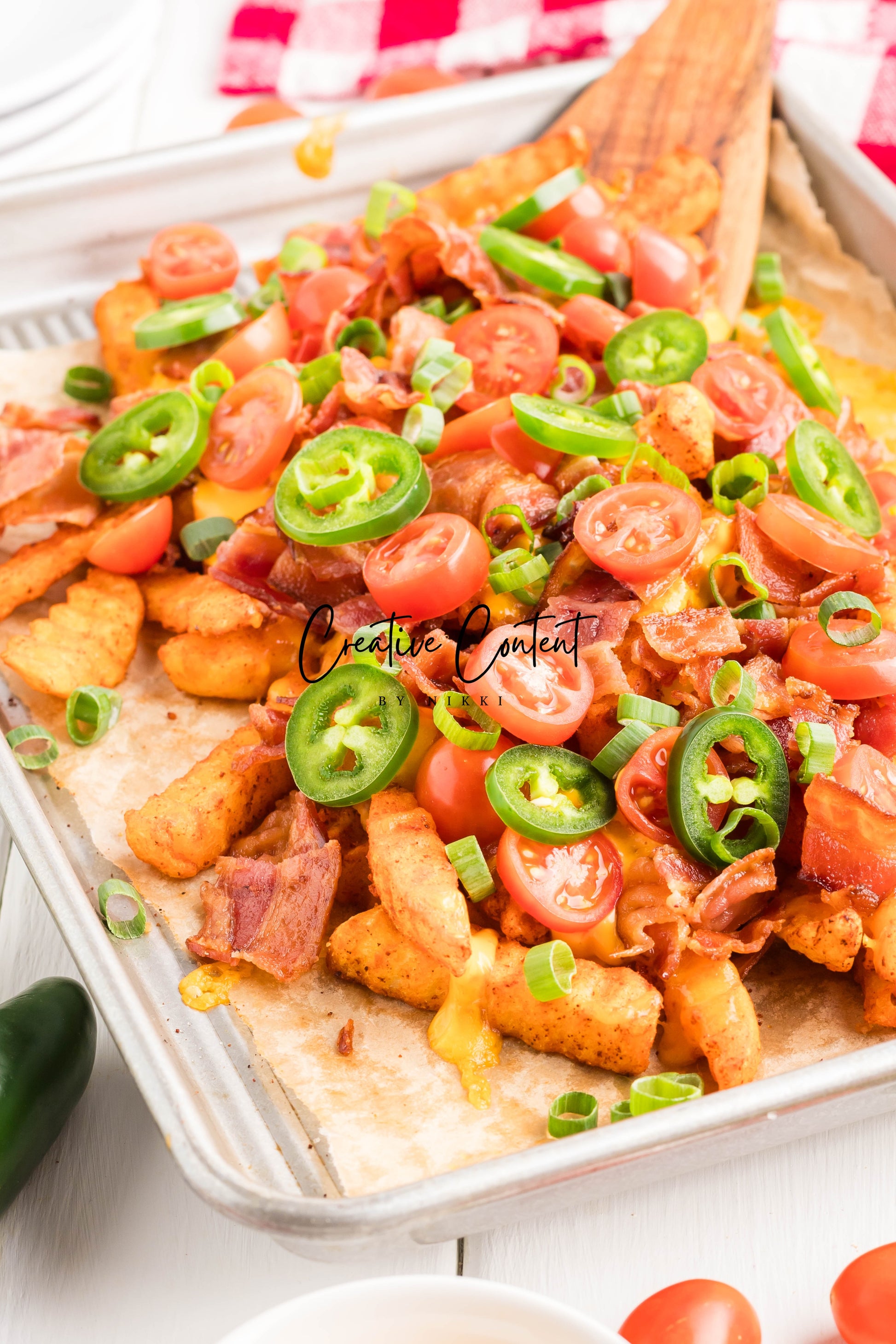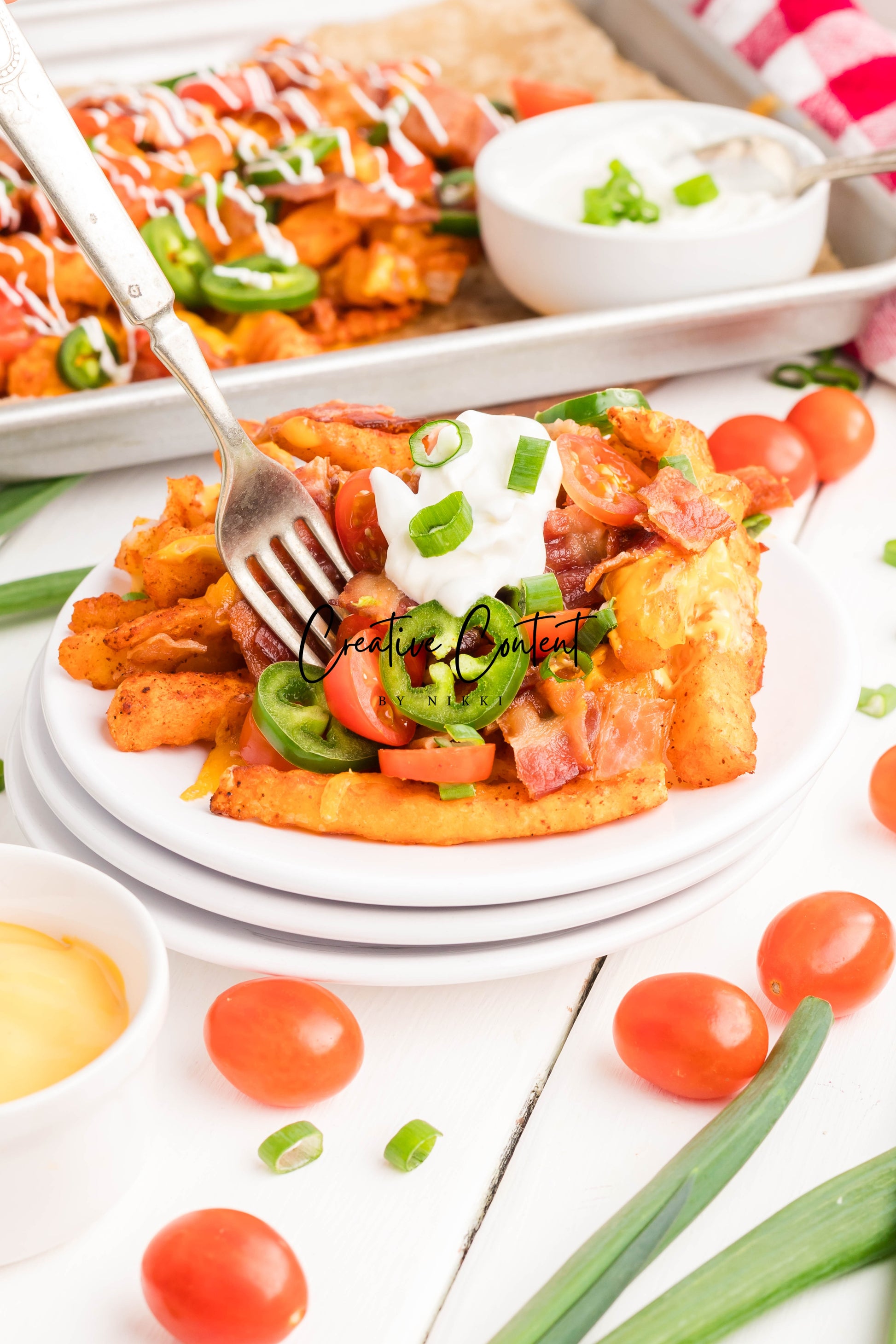 - Ingredients: frozen French fries, cheese dip, shredded cheddar cheese, crumbled bacon, cherry tomatoes, jalapenos, and sour cream