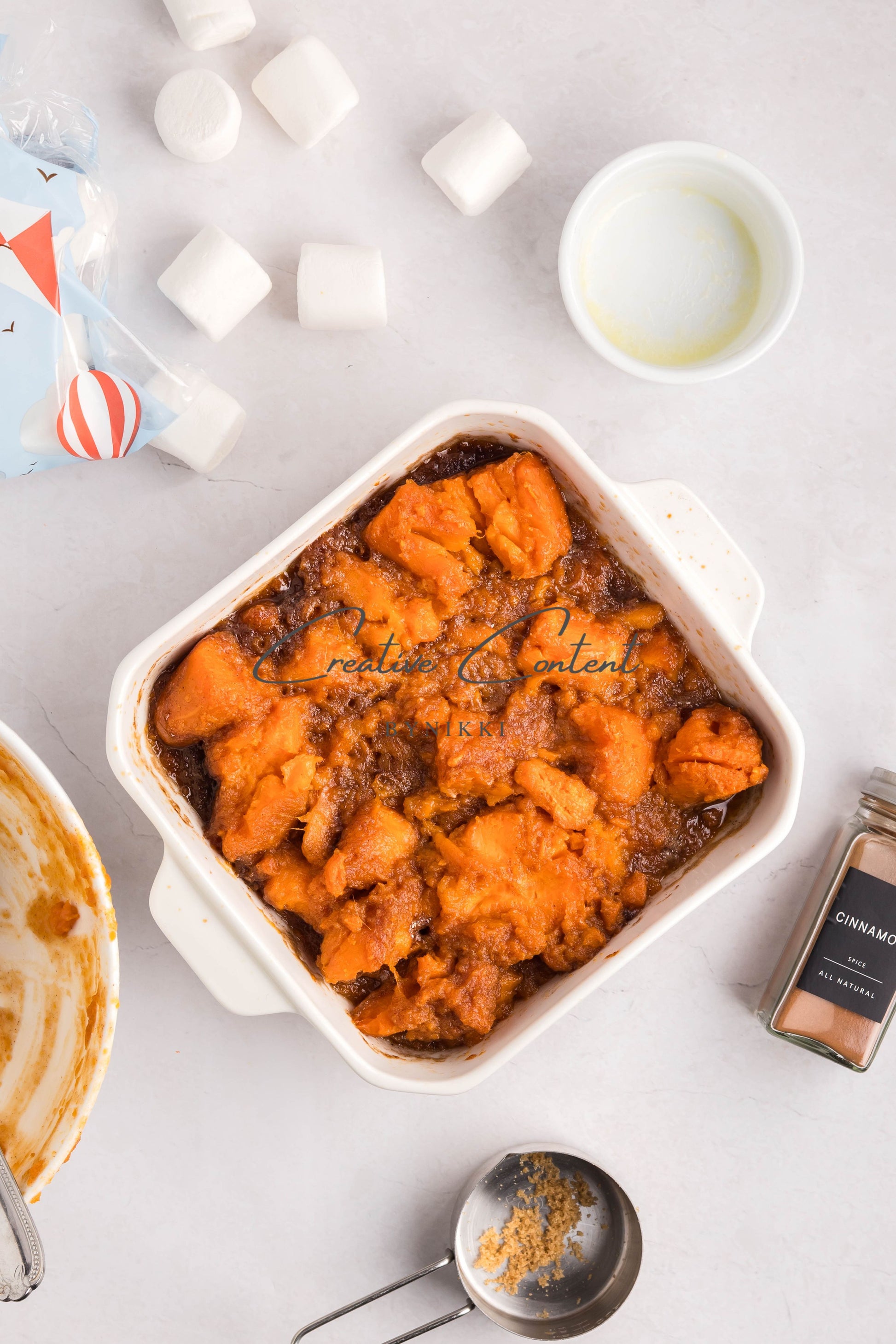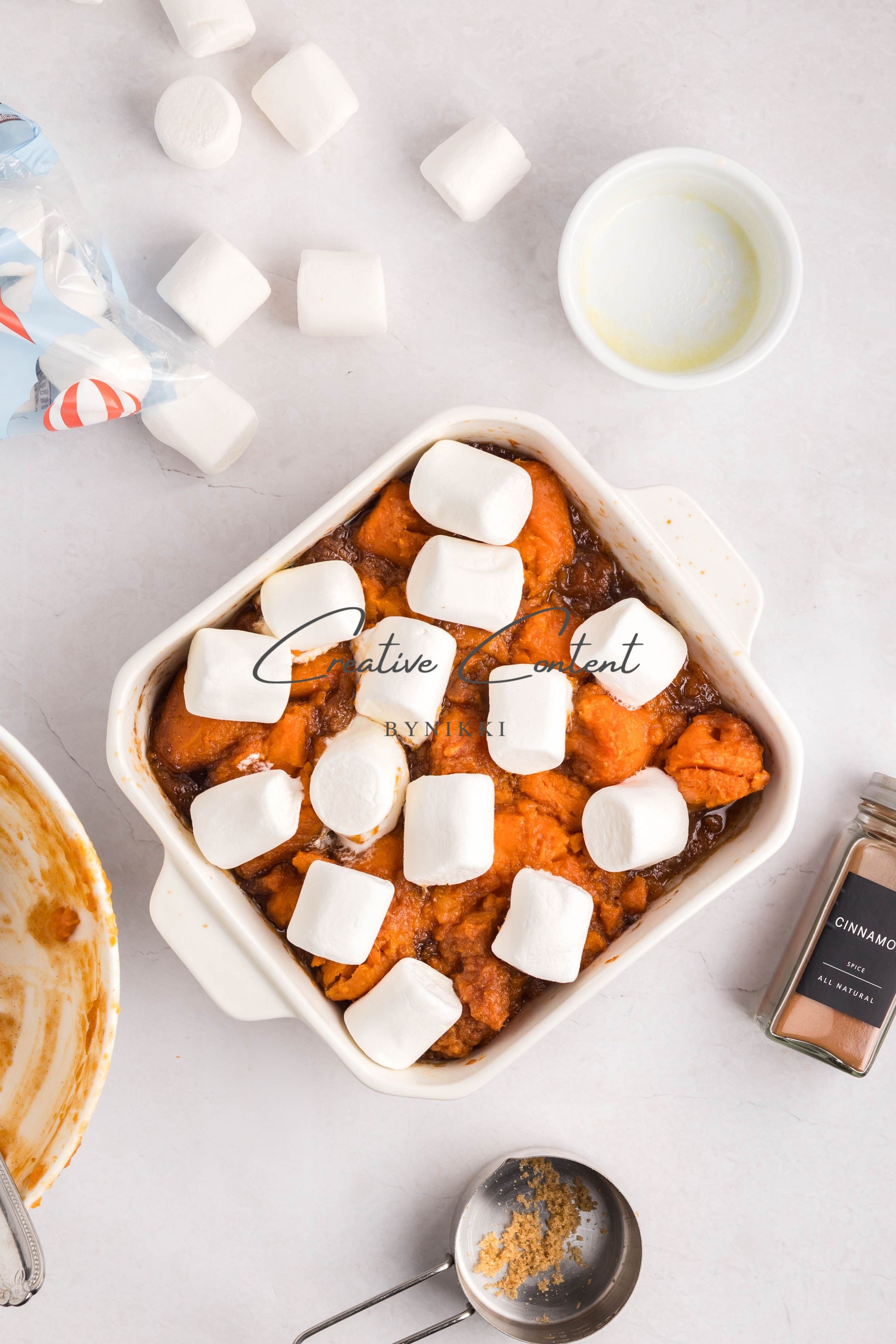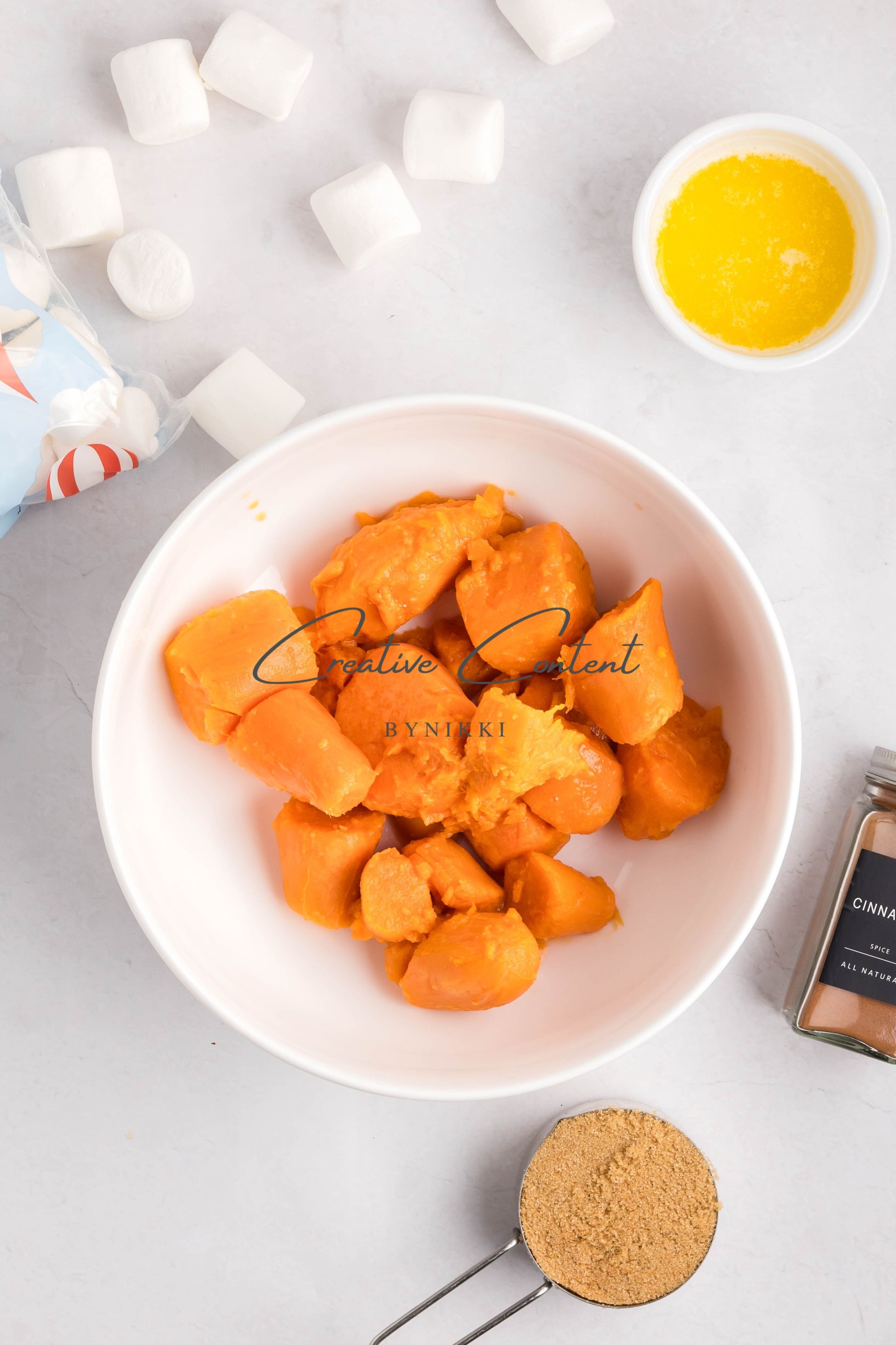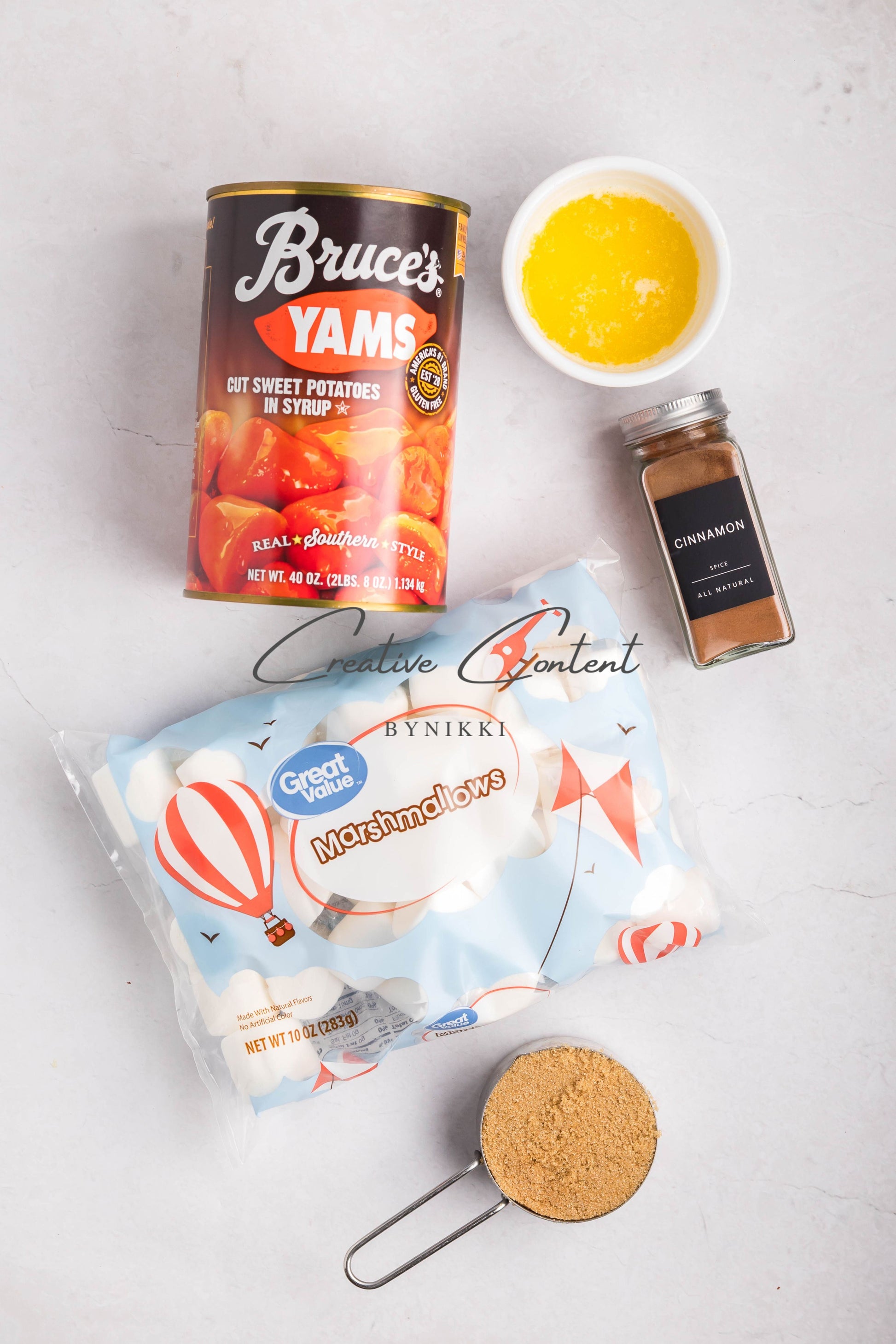 - Ingredients: canned sweet potatoes, brown sugar, cinnamon, salted butter, marshmallows