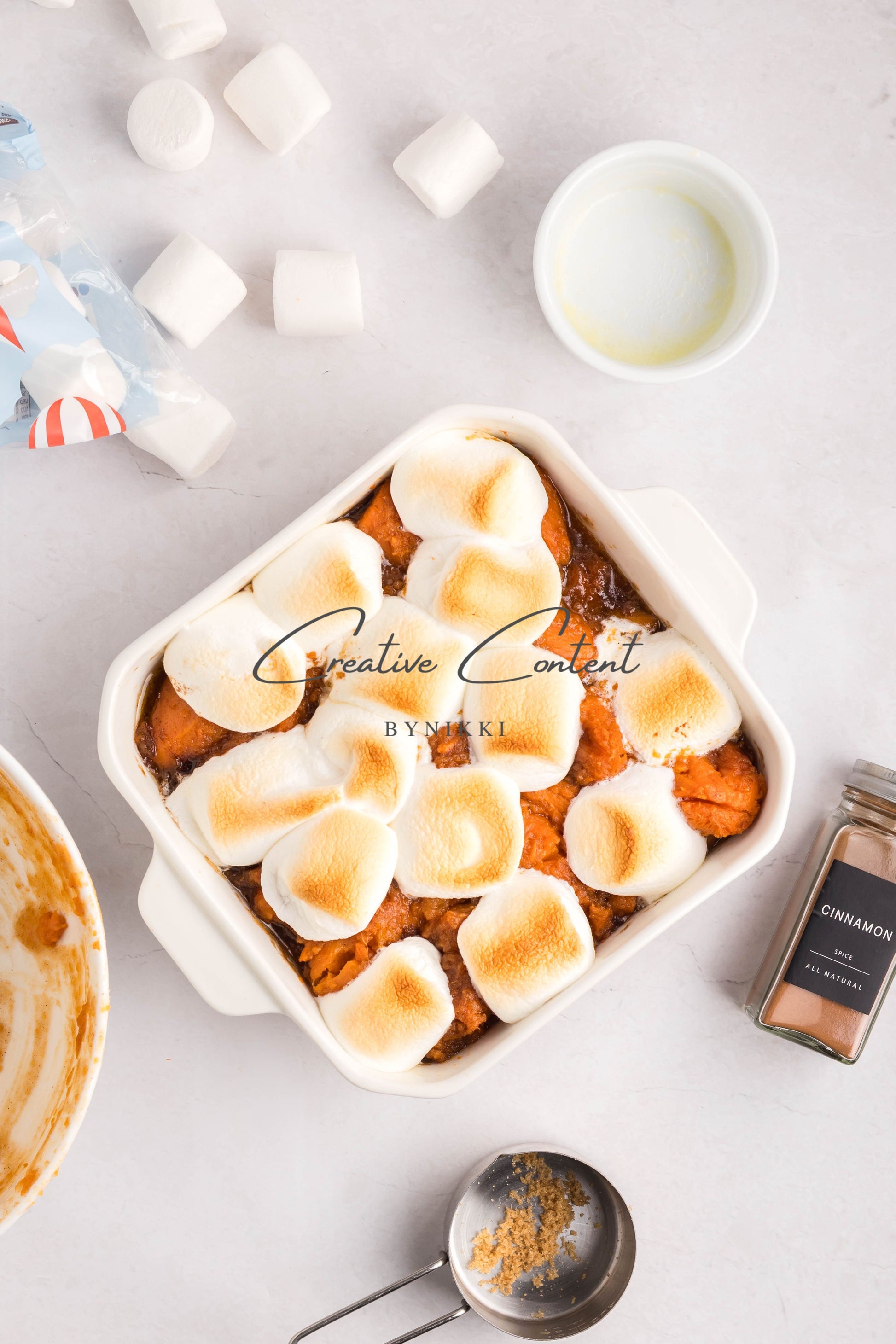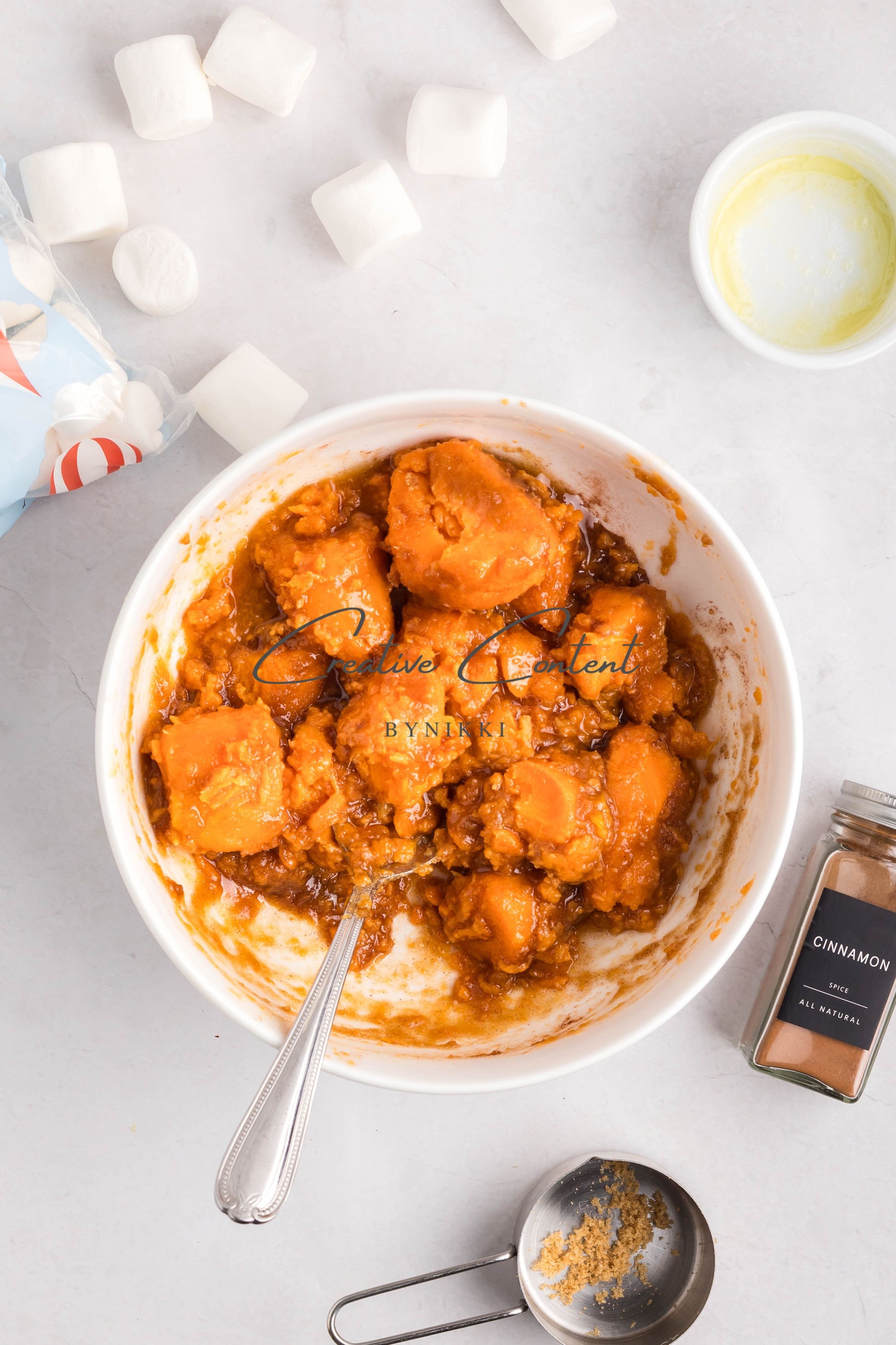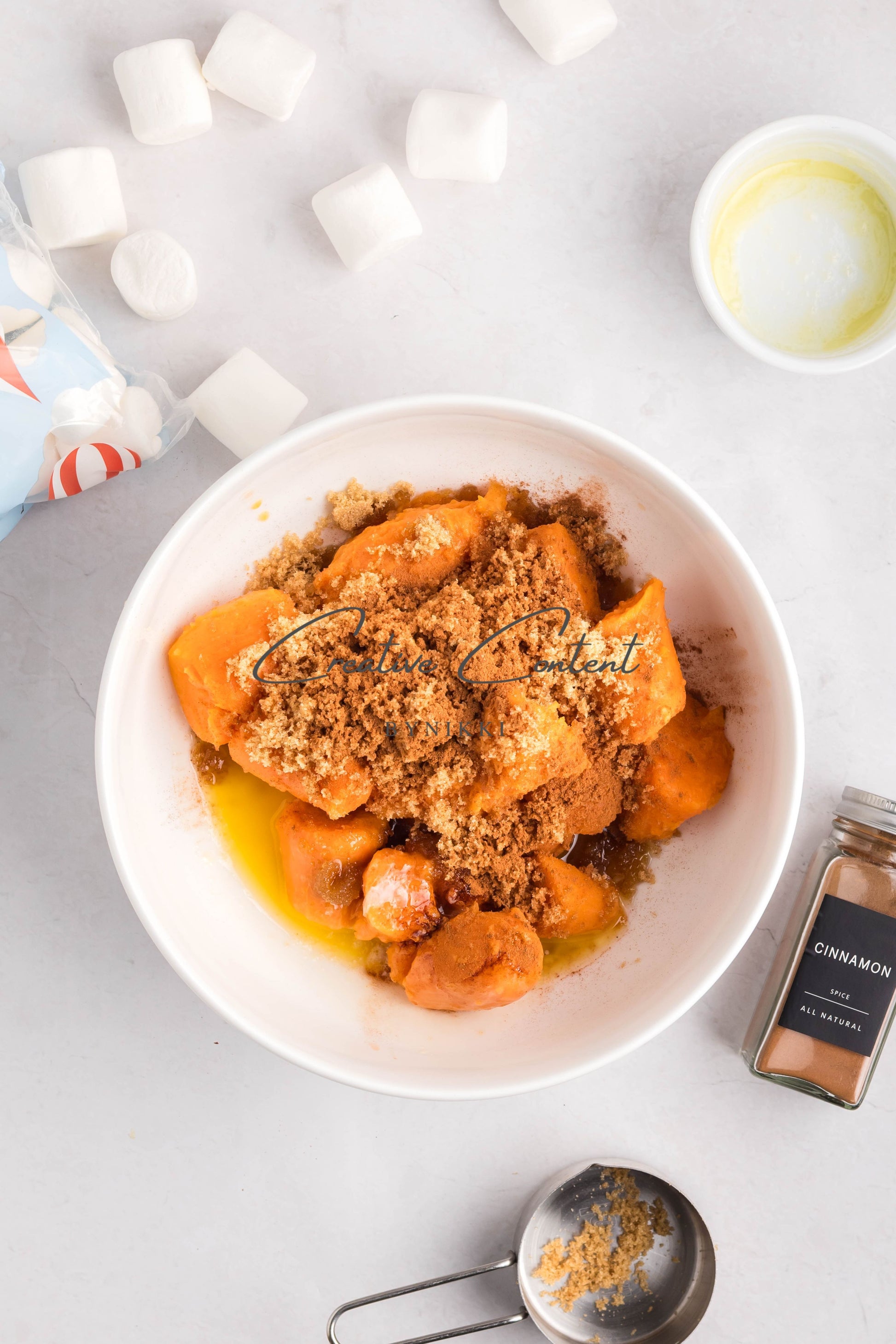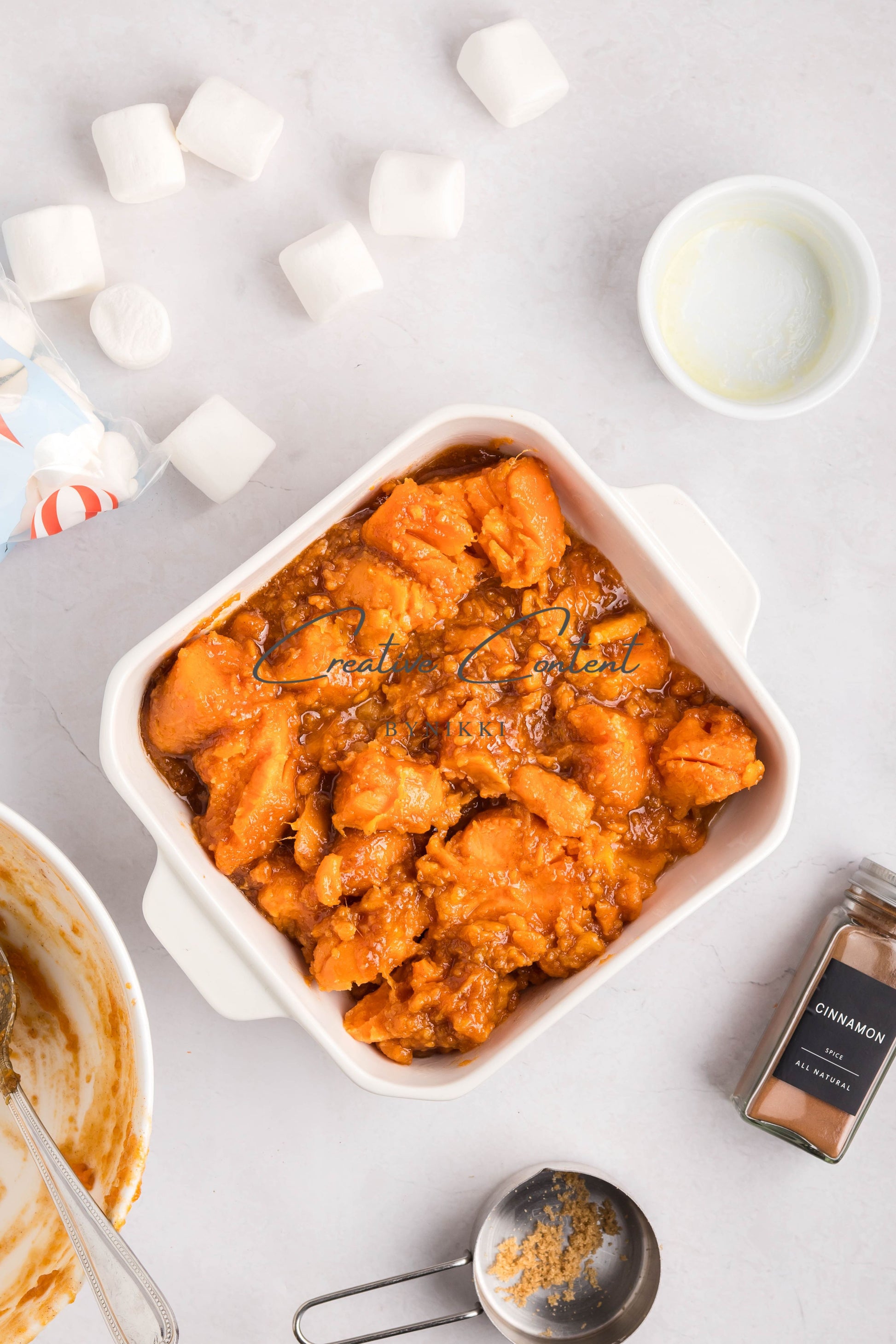 - Ingredients: canned sweet potatoes, brown sugar, cinnamon, salted butter, marshmallows