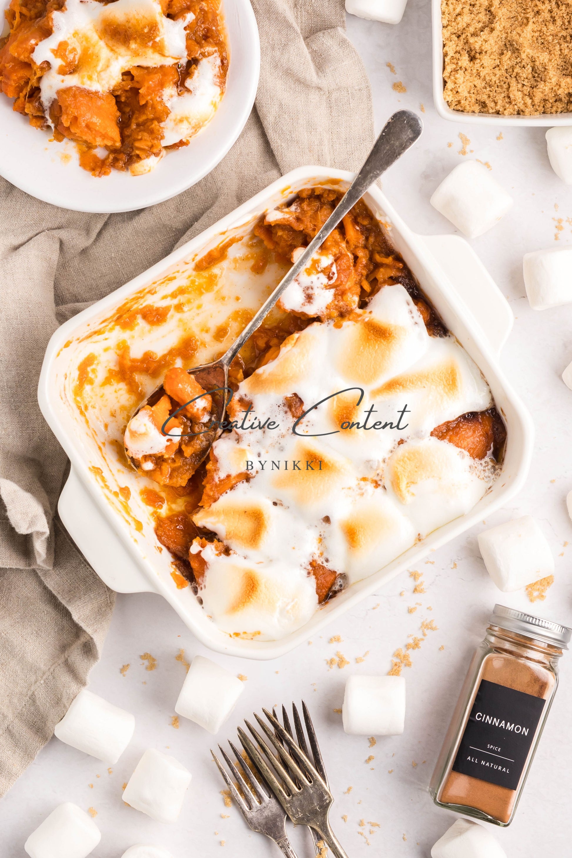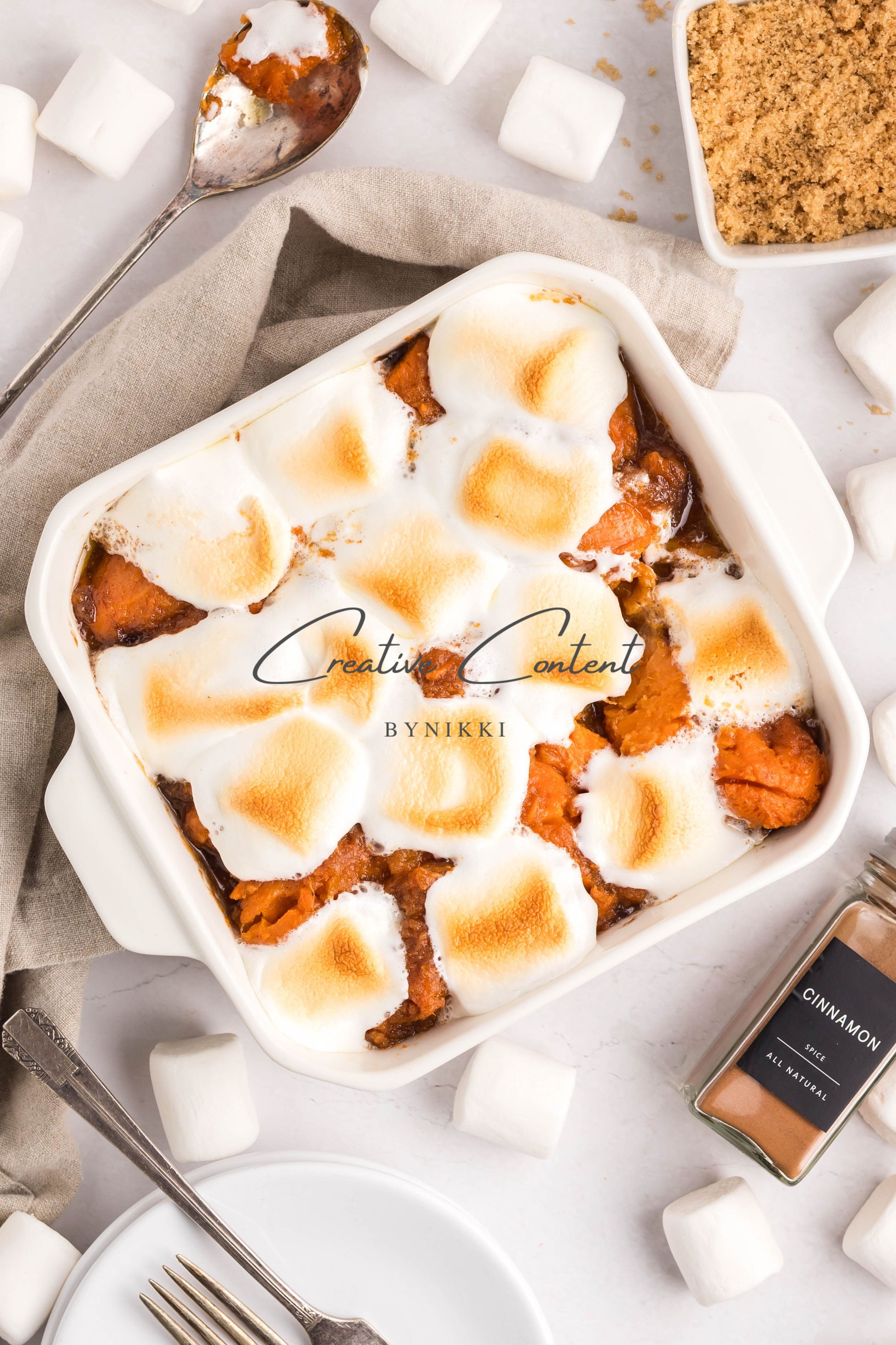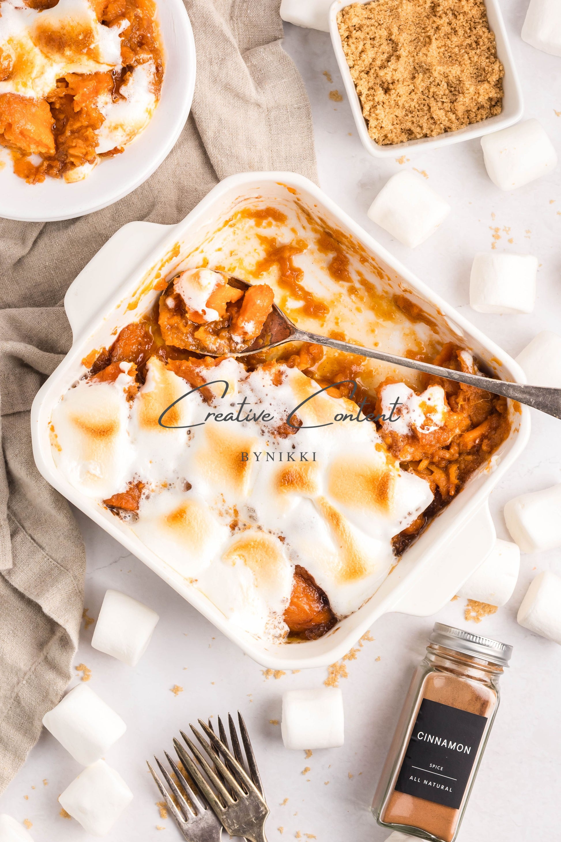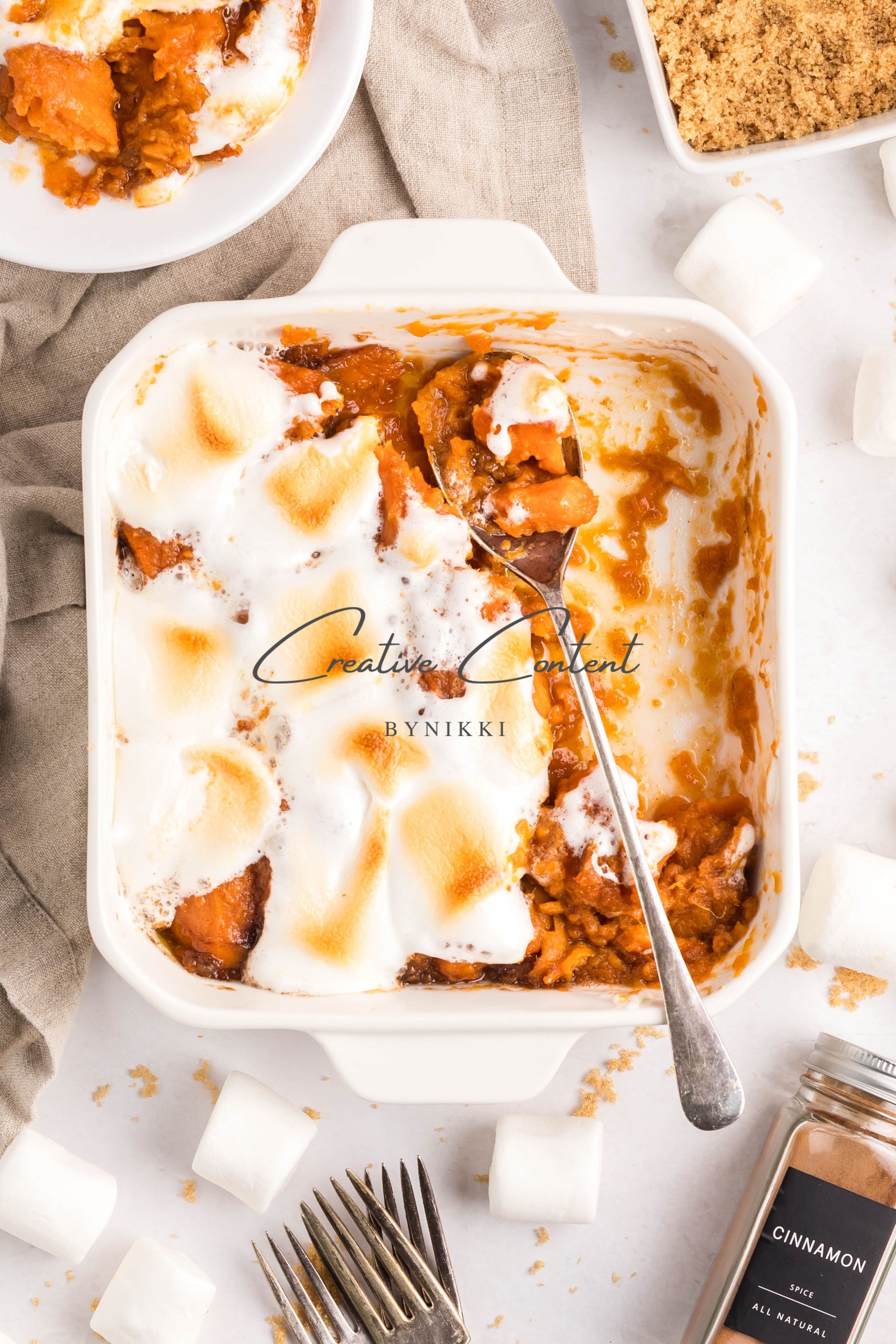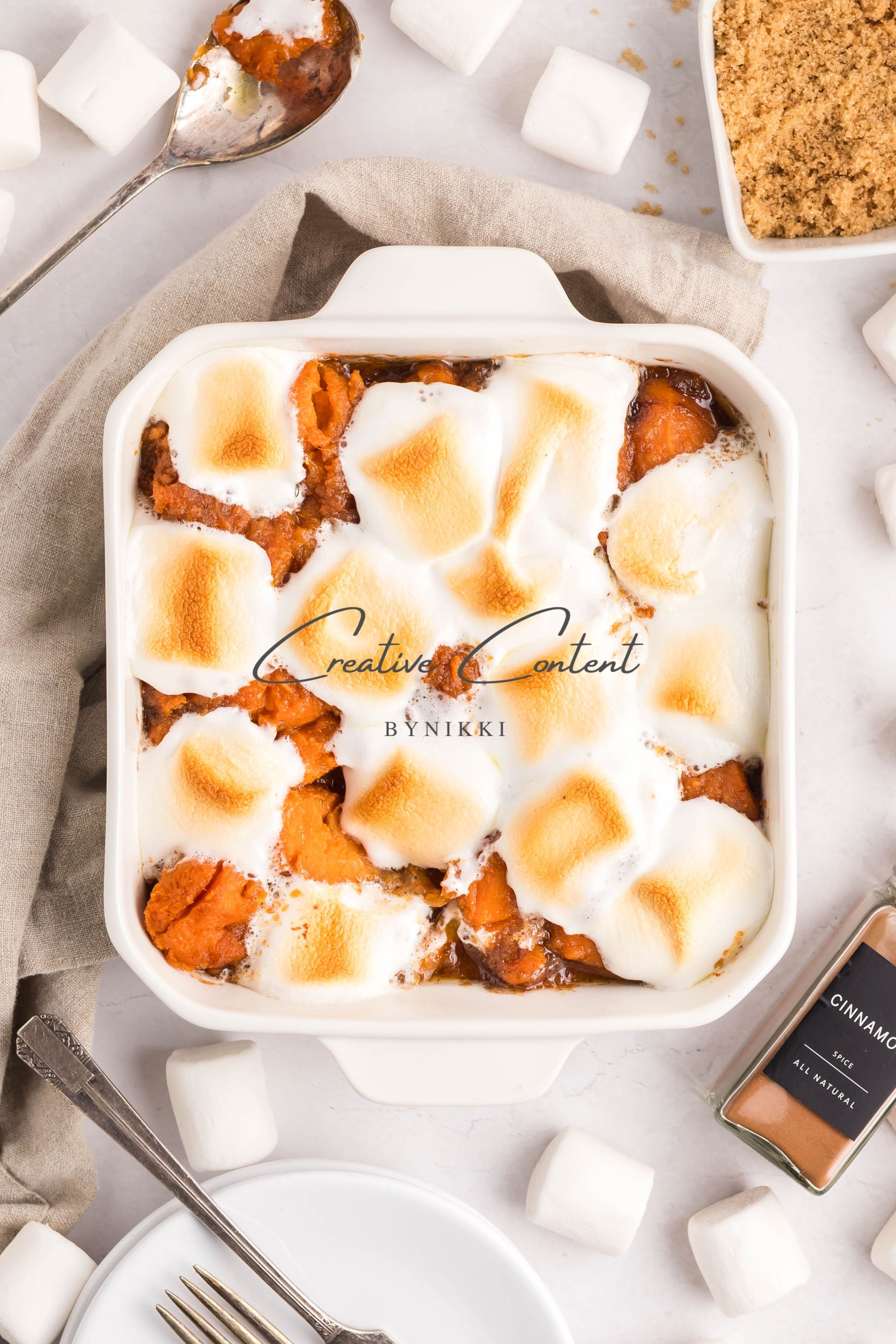 - Ingredients: canned sweet potatoes, brown sugar, cinnamon, salted butter, marshmallows