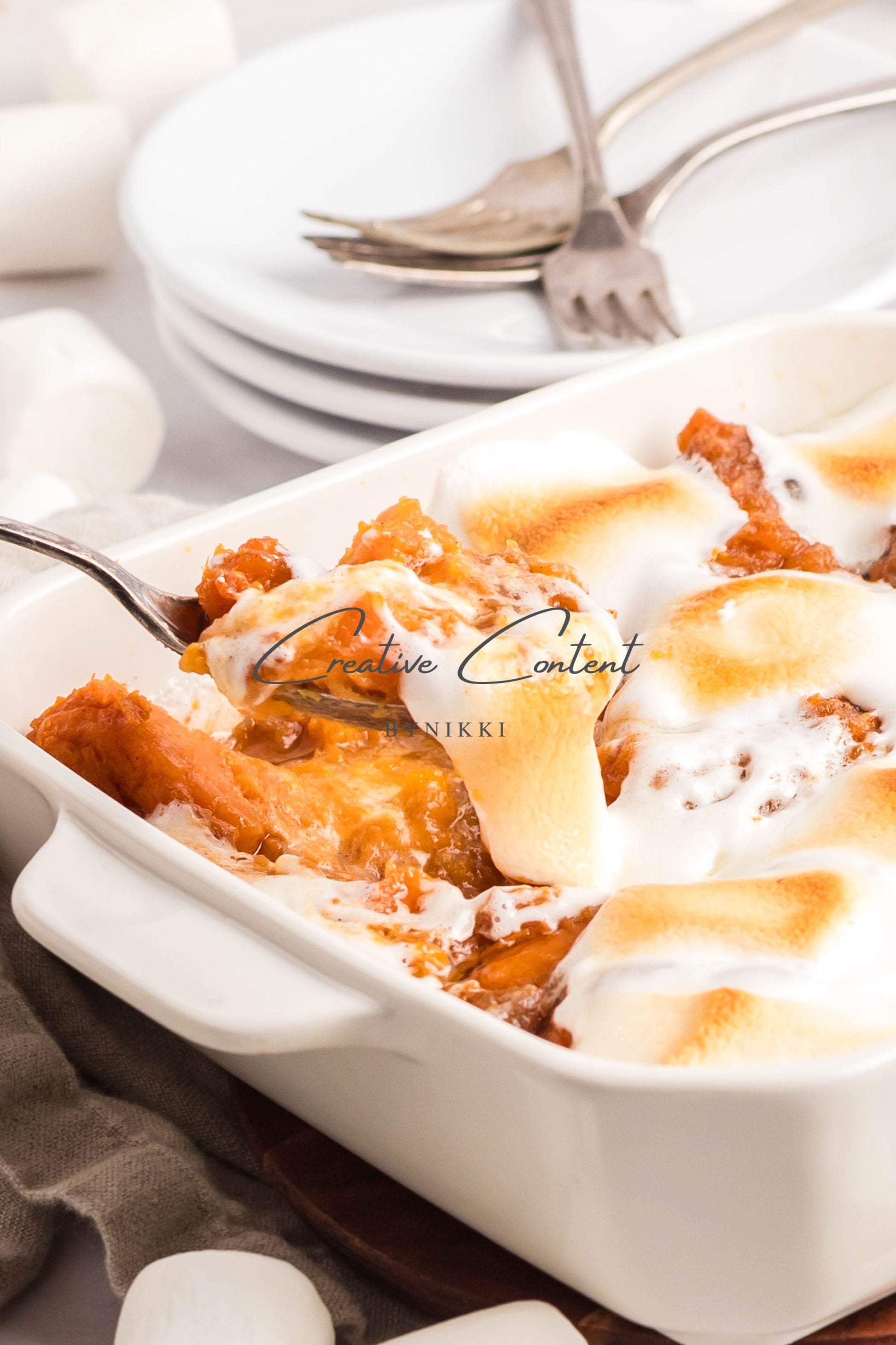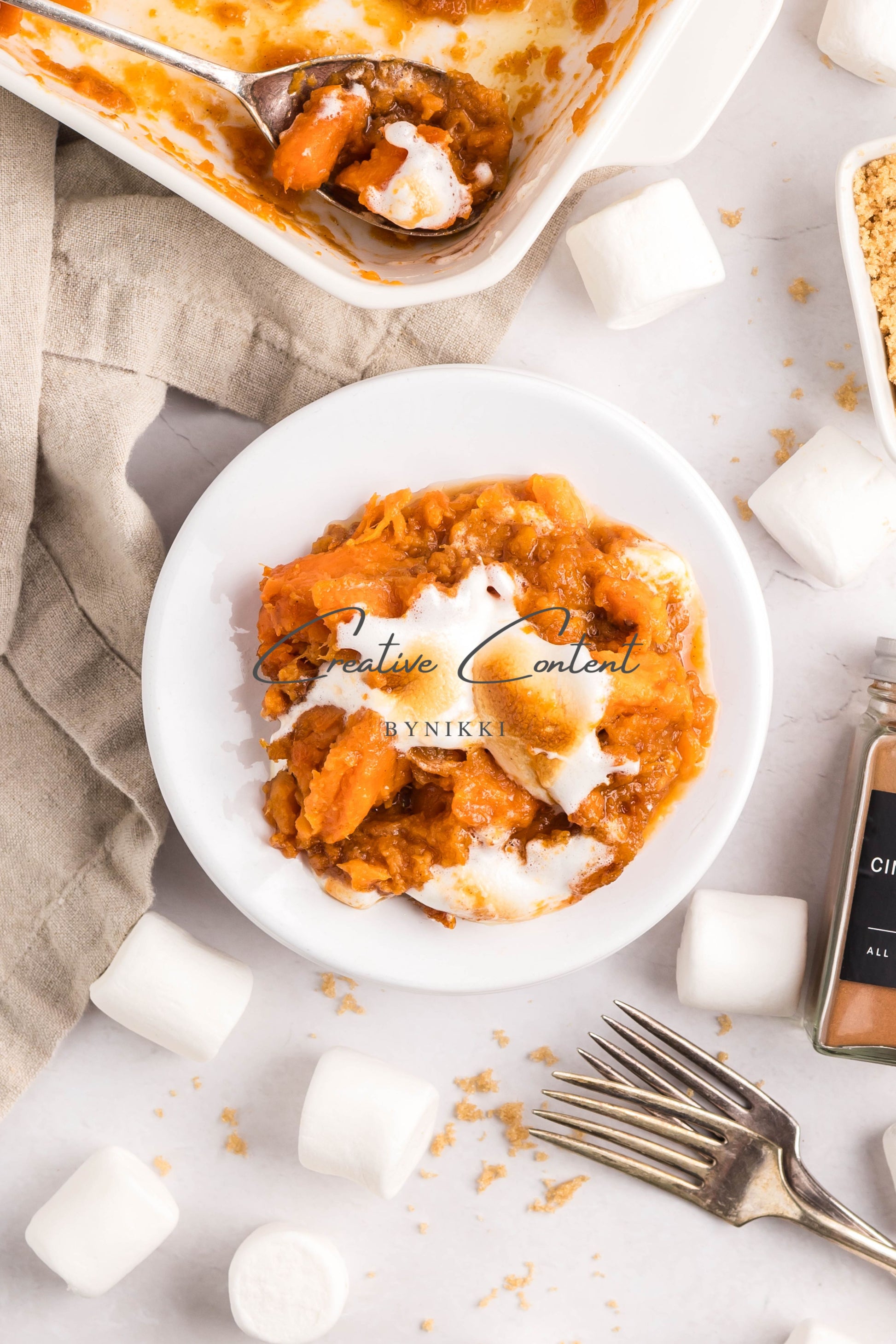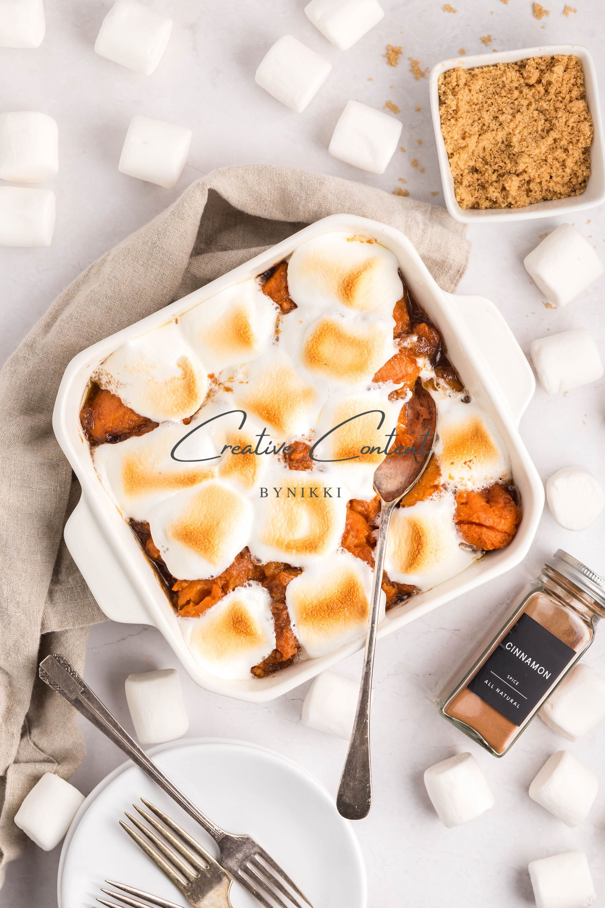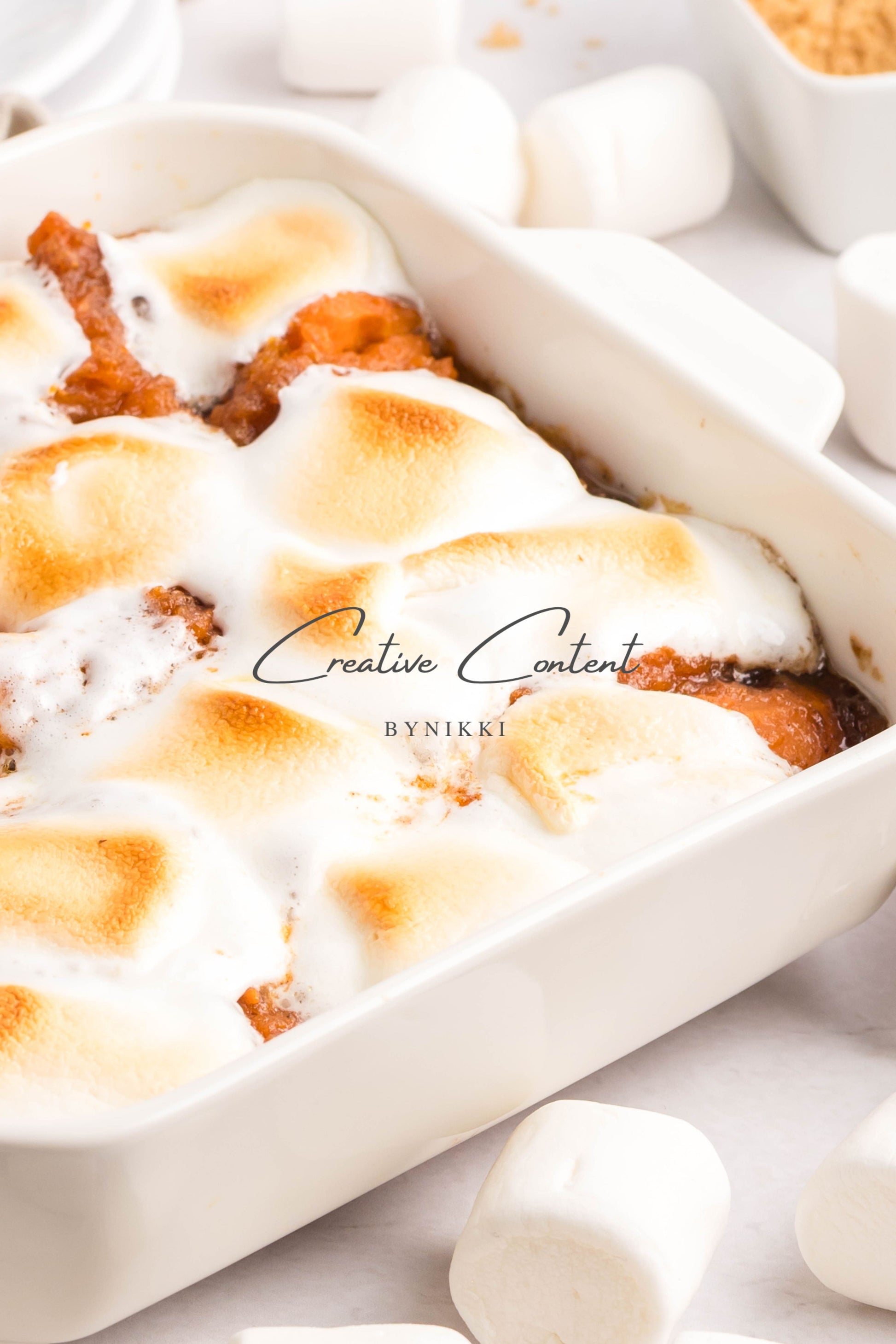 - Ingredients: canned sweet potatoes, brown sugar, cinnamon, salted butter, marshmallows