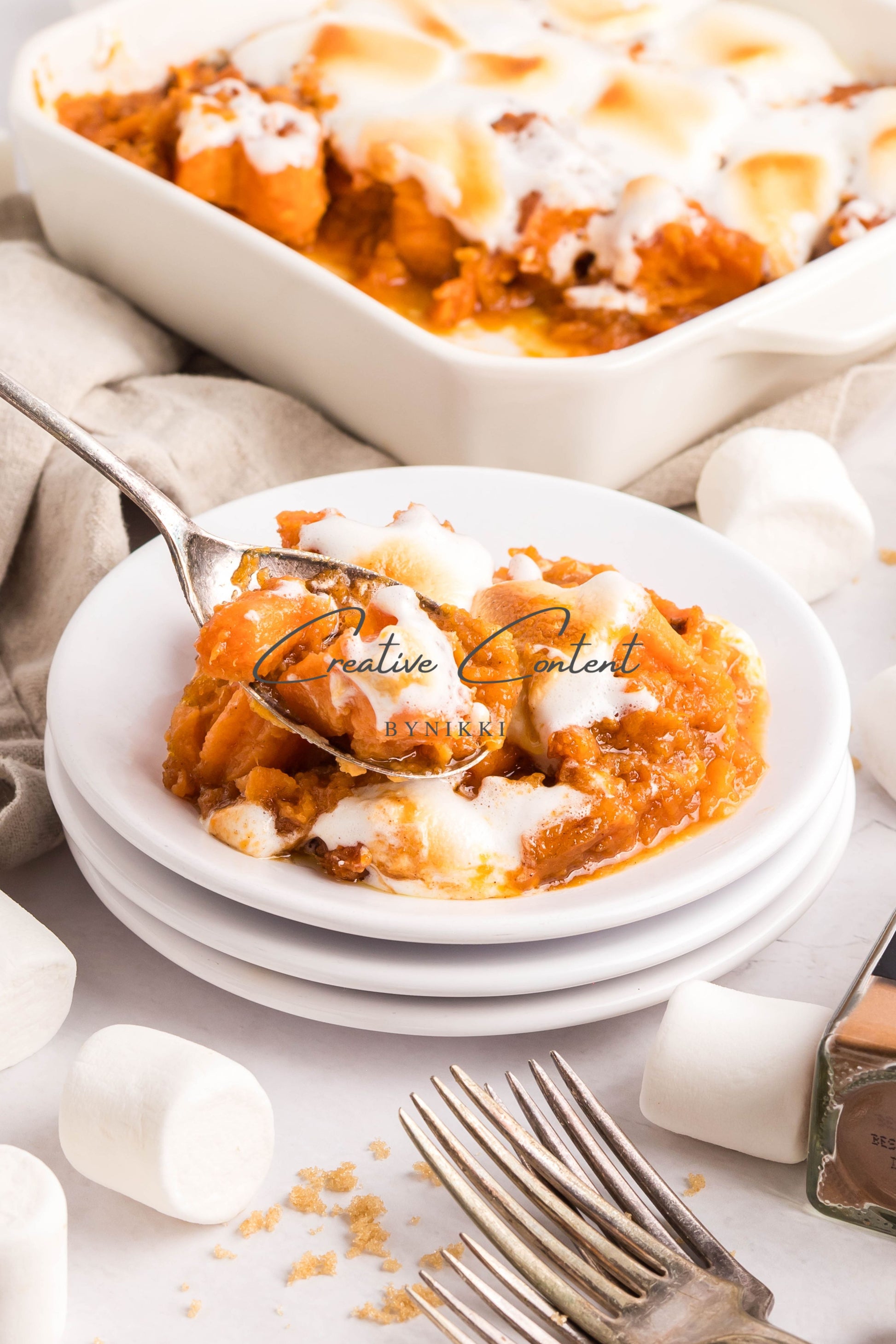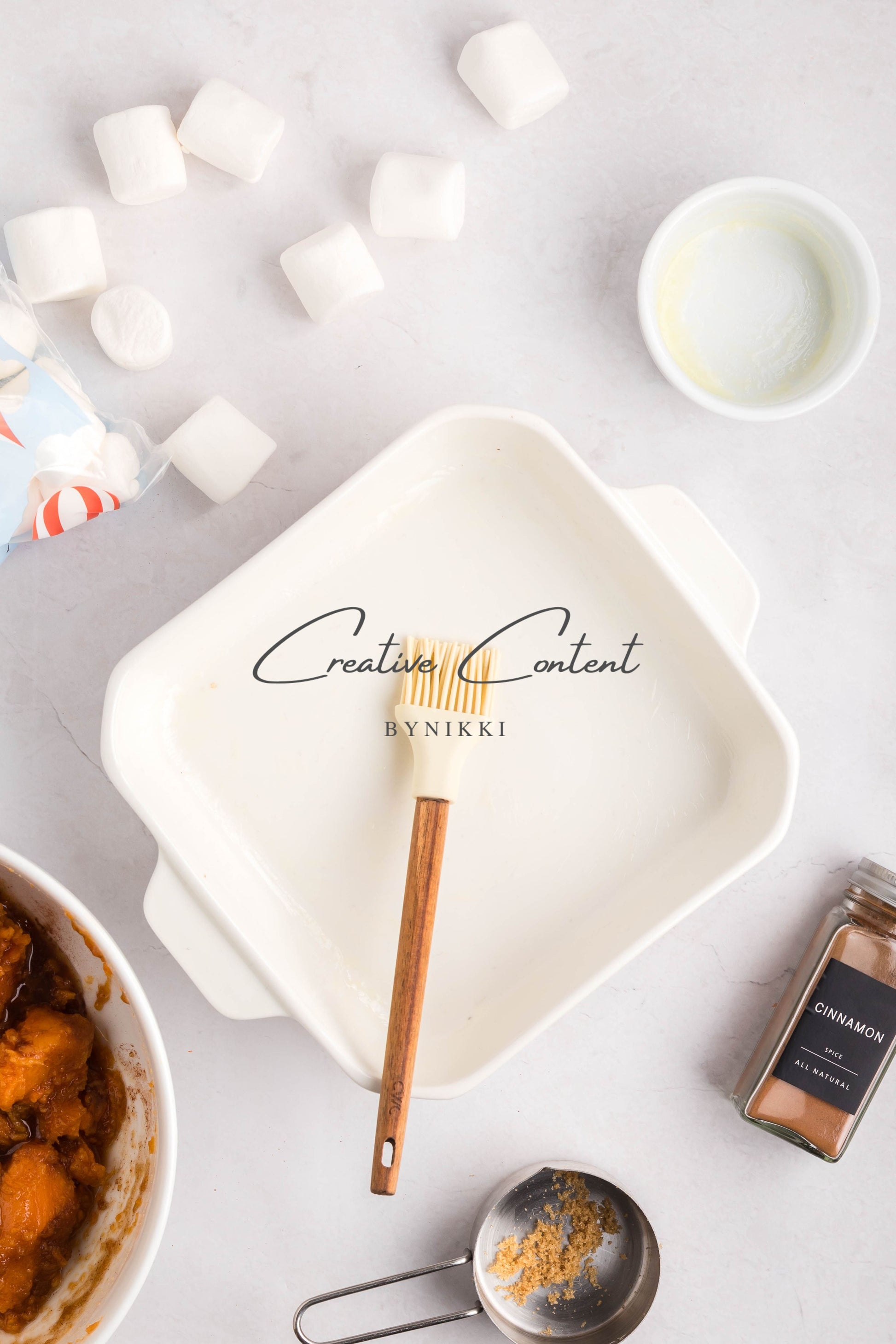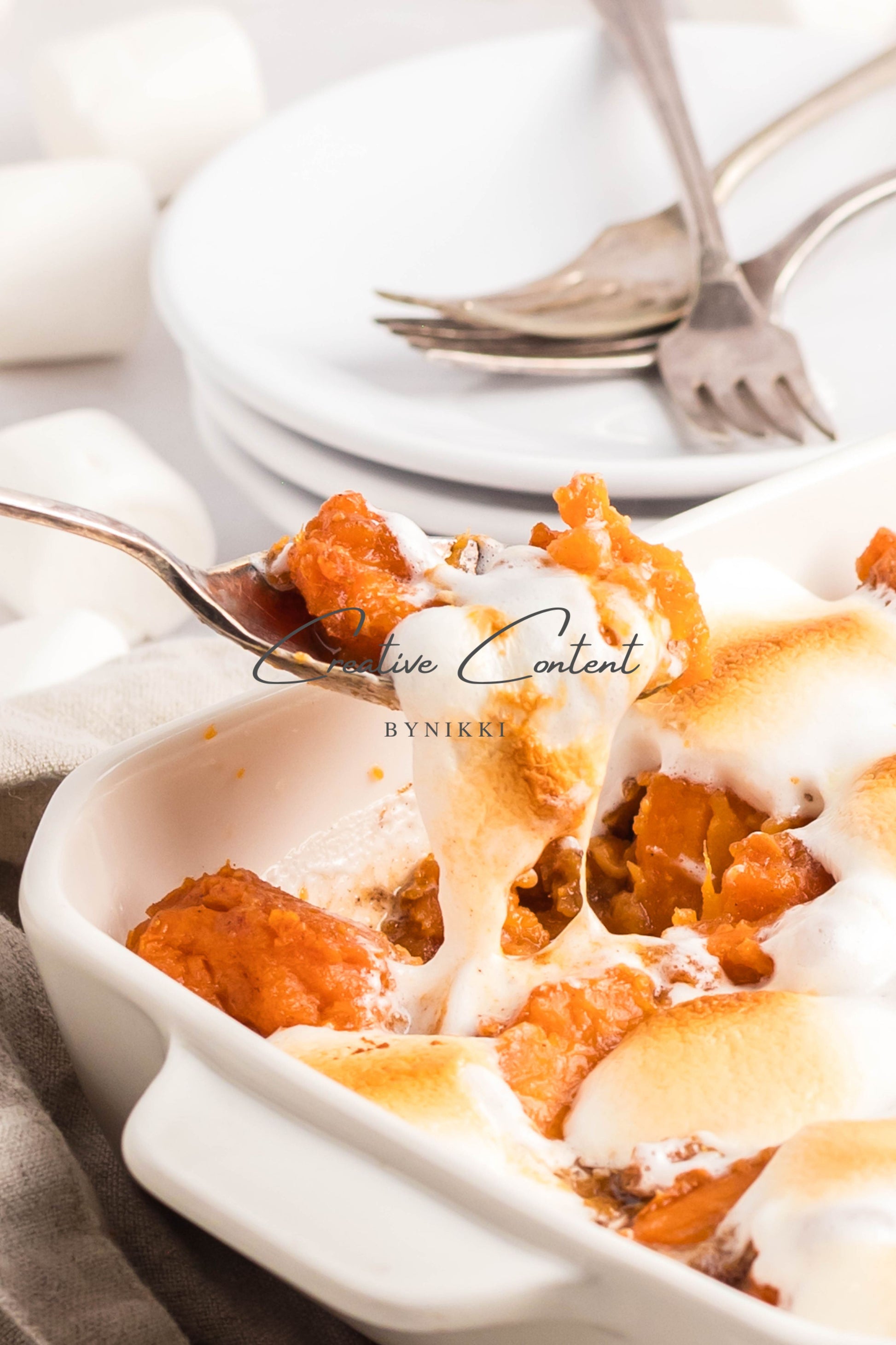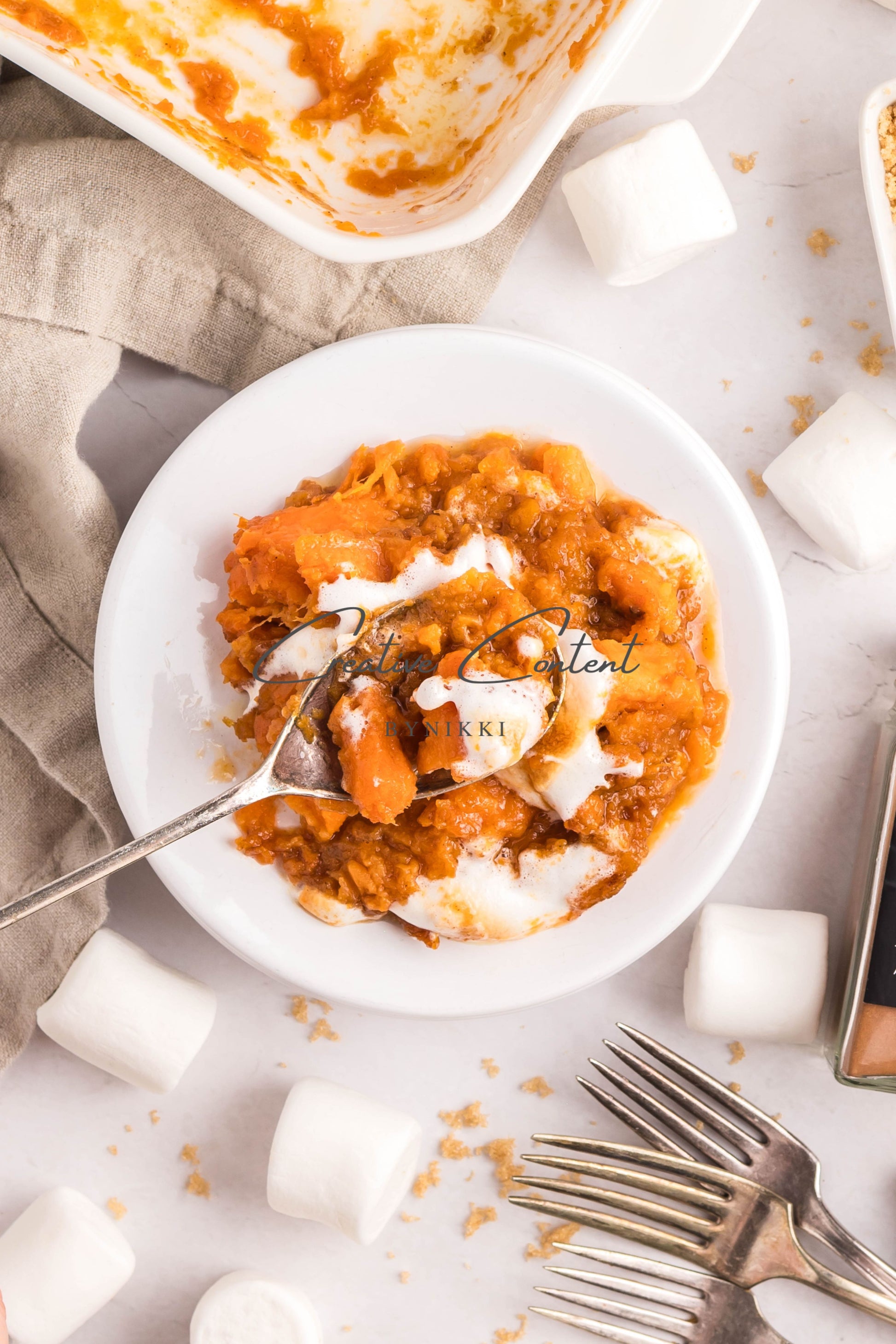 - Ingredients: canned sweet potatoes, brown sugar, cinnamon, salted butter, marshmallows