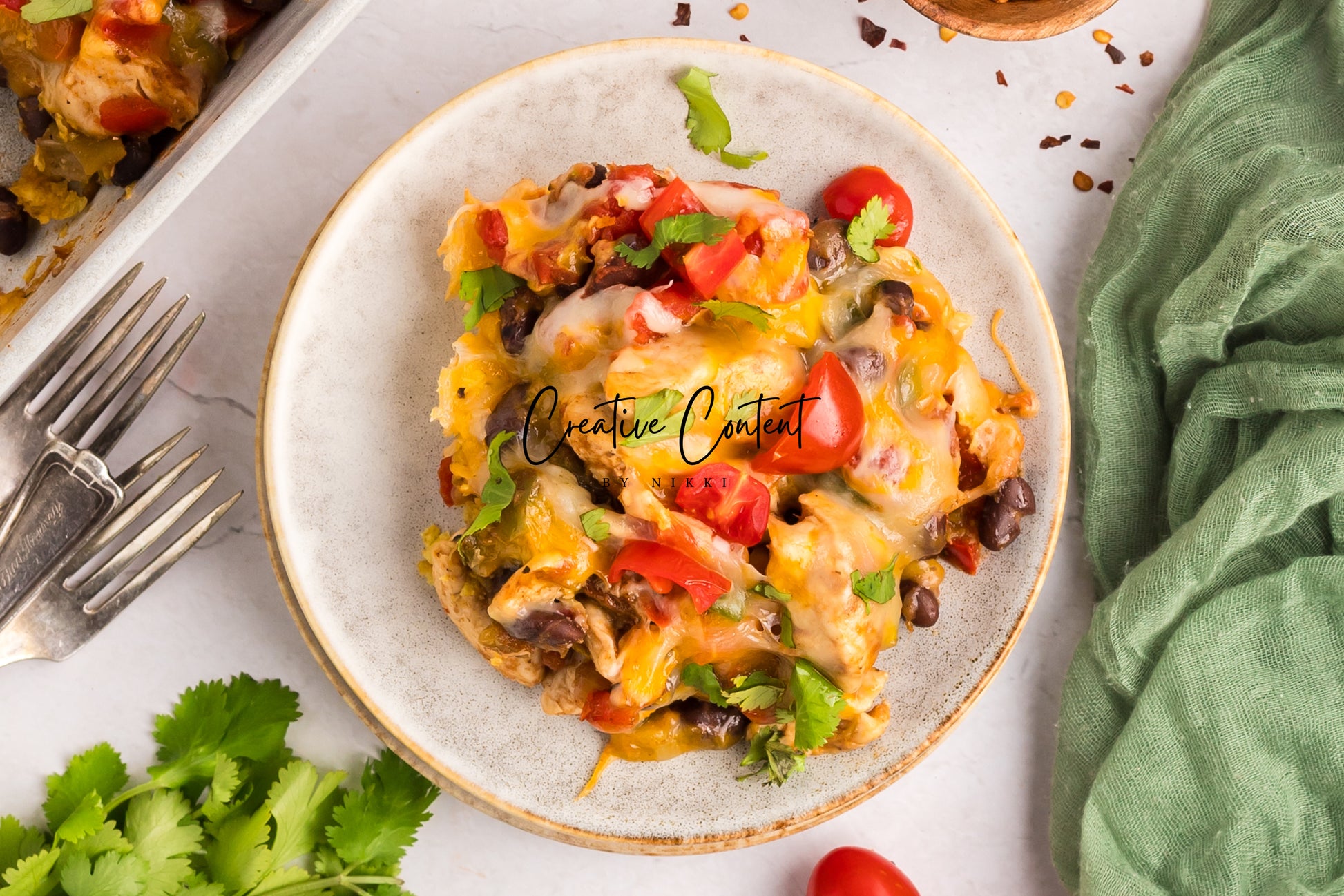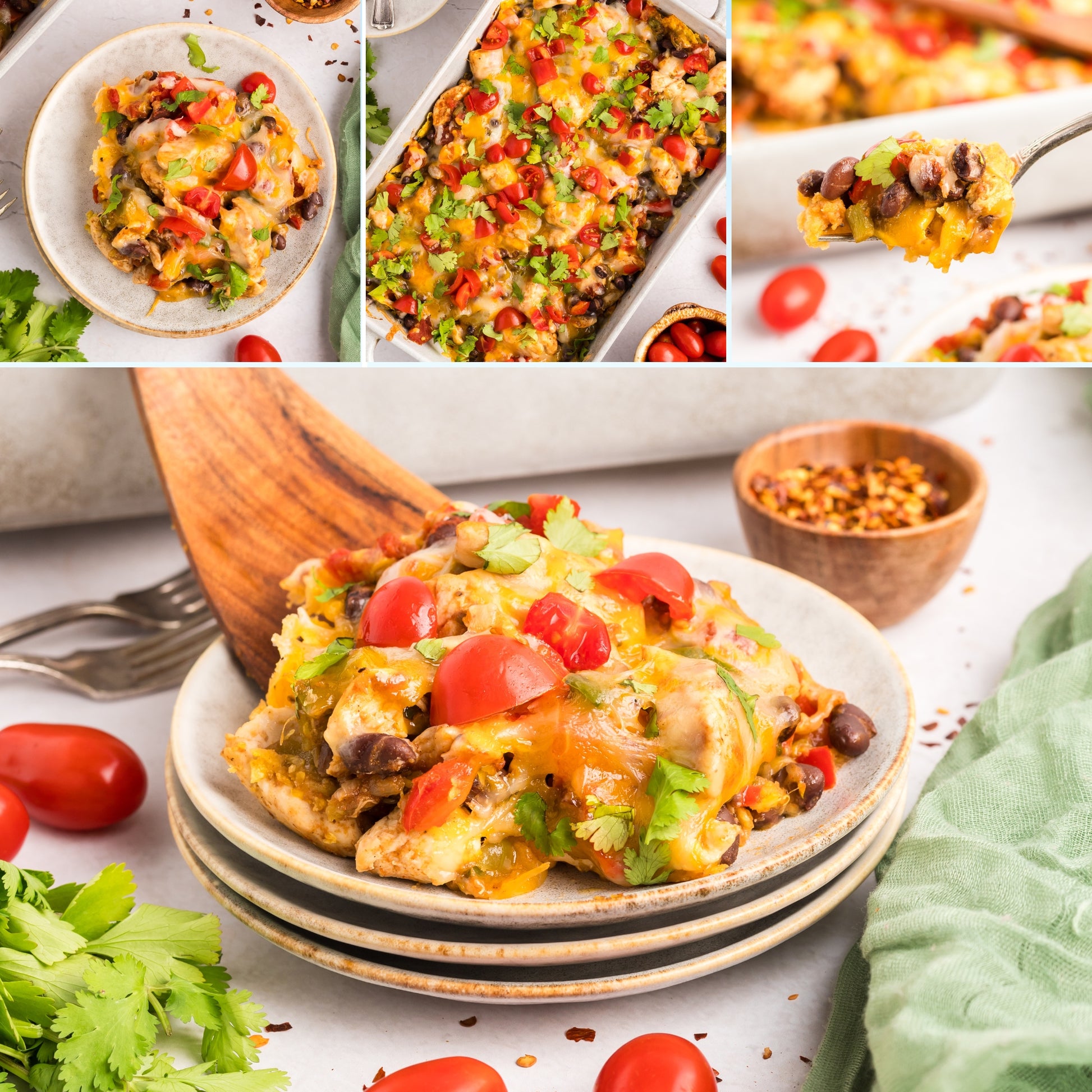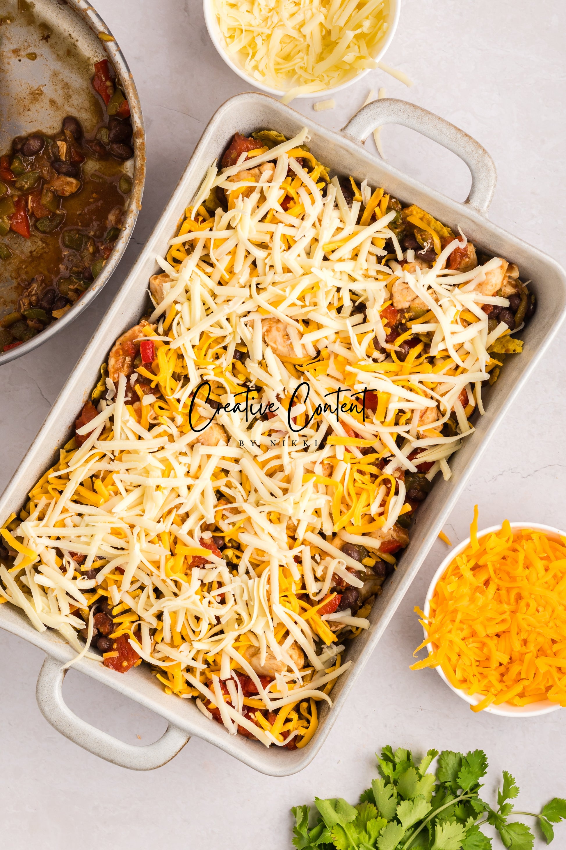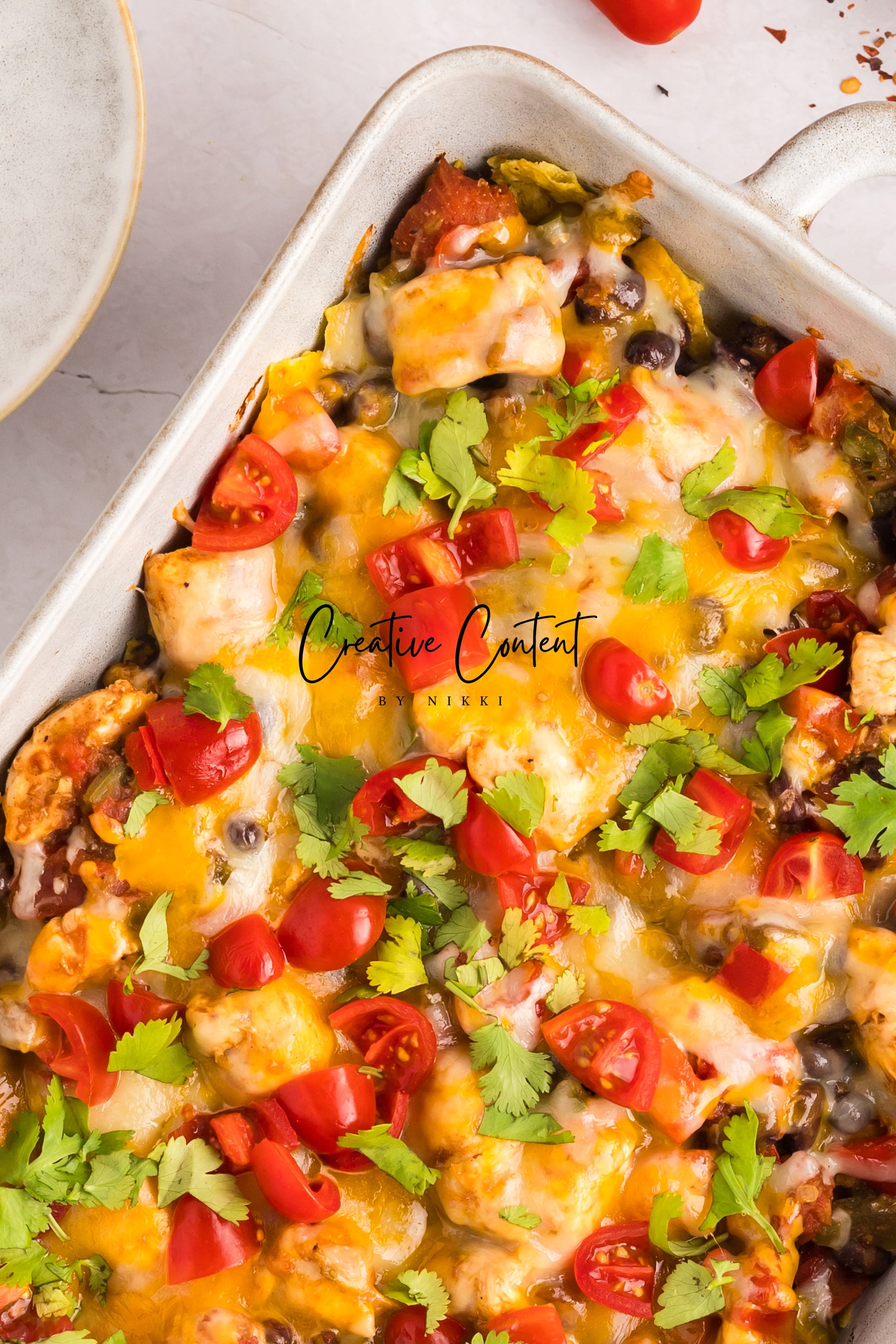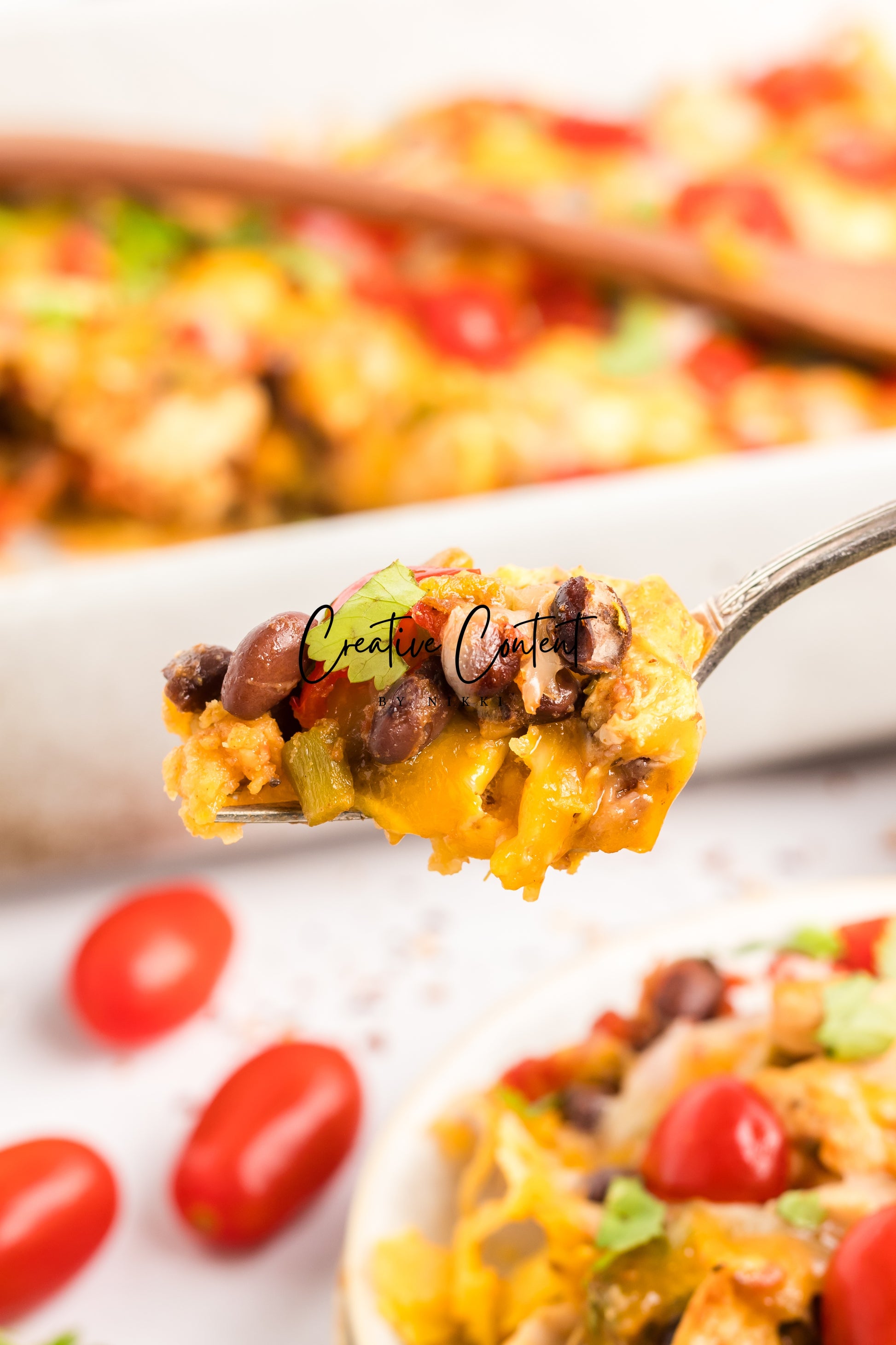 This Mexican Chicken Casserole has so much flavor from the cumin, chili powder, fresh garlic, bell peppers, and green chiles. If you are serving the family or a crowd this is a great dish to make. I love taking this dish as an appetizer when I need to take something to share.