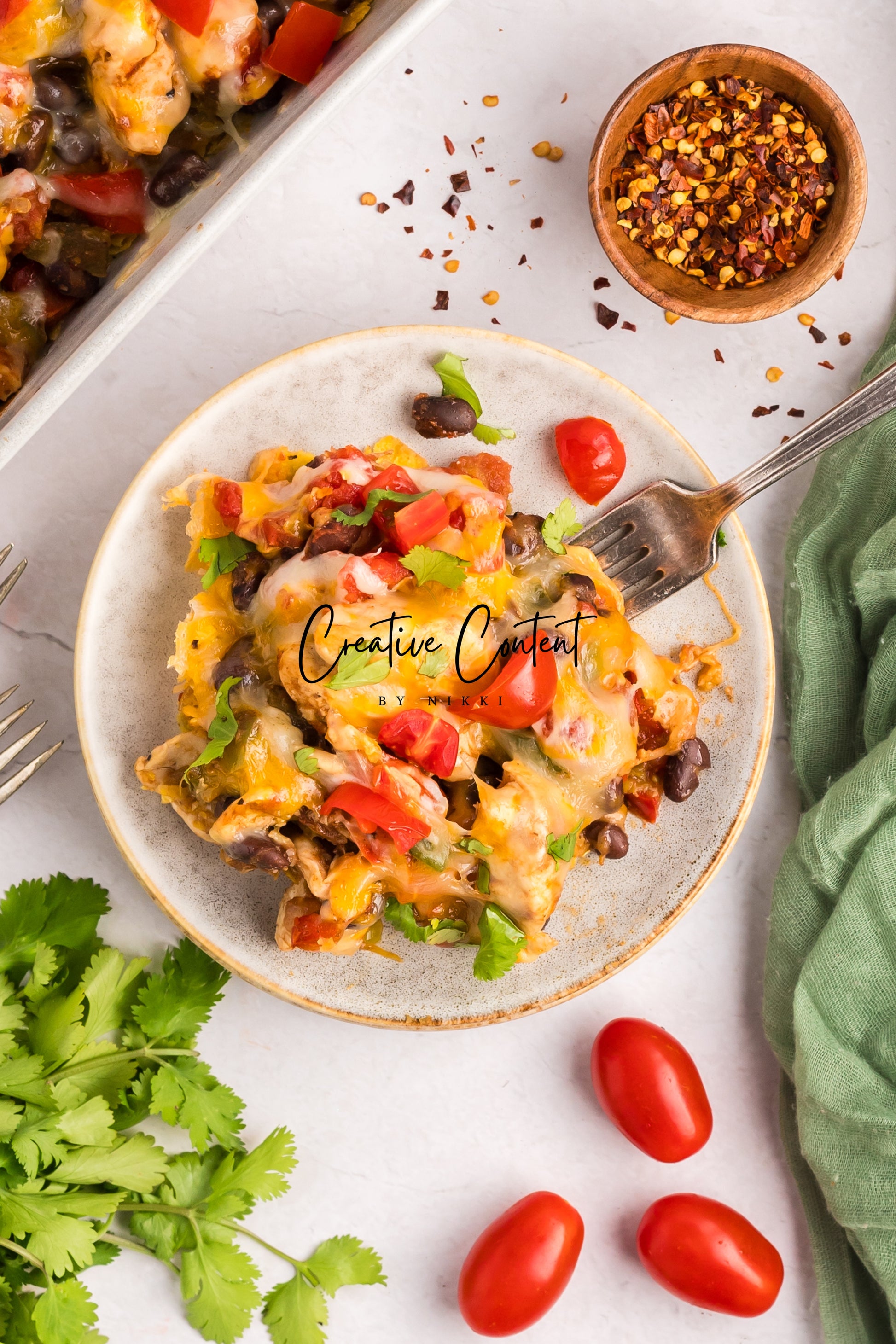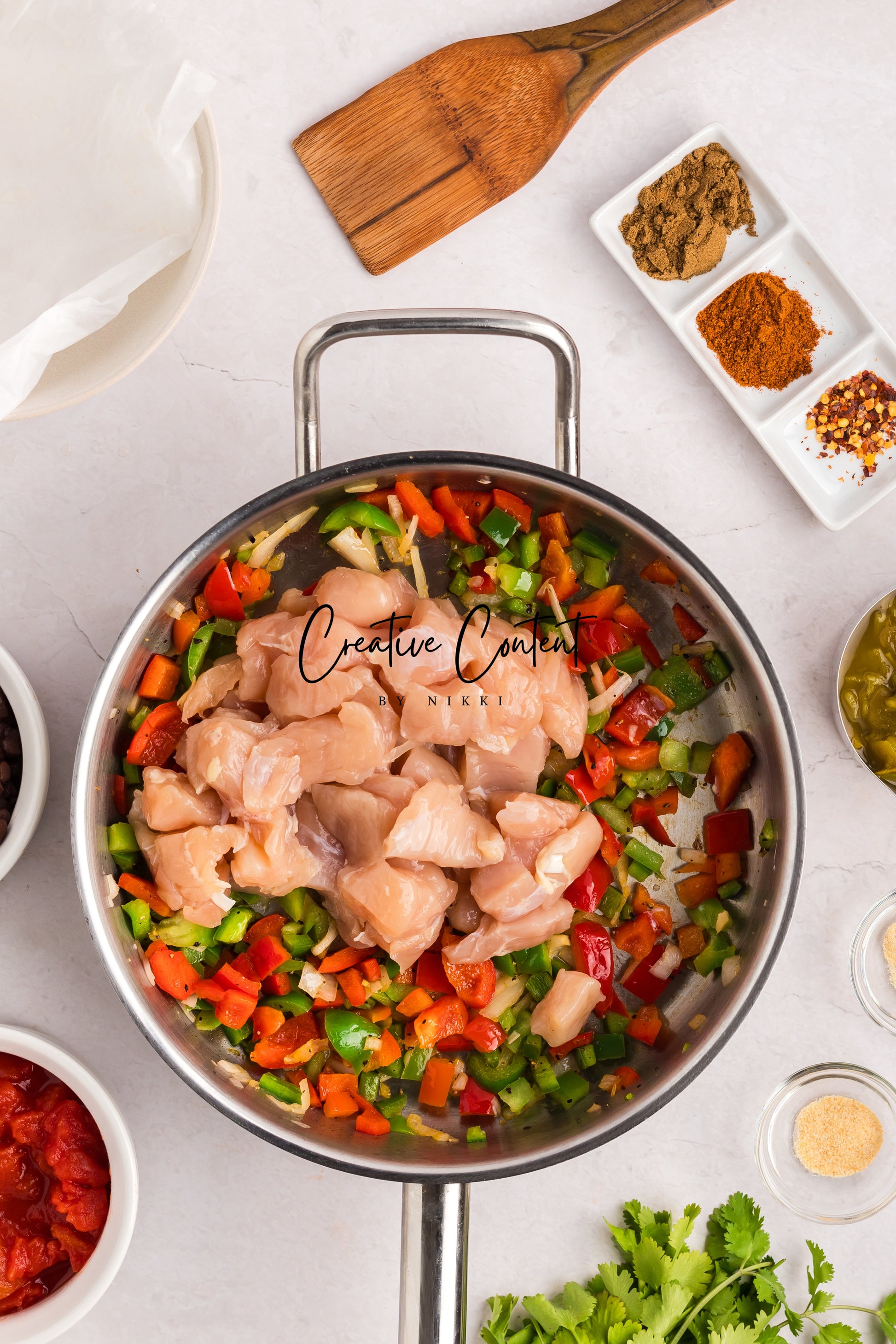 - Featured Ingredients; avocado oil, bell peppers, yellow onions, chicken breasts, garlic cloves, petite diced tomatoes, black beans, green chiles, seasonings, tortilla chips, shredded cheese, cherry tomatoes, and cilantro.