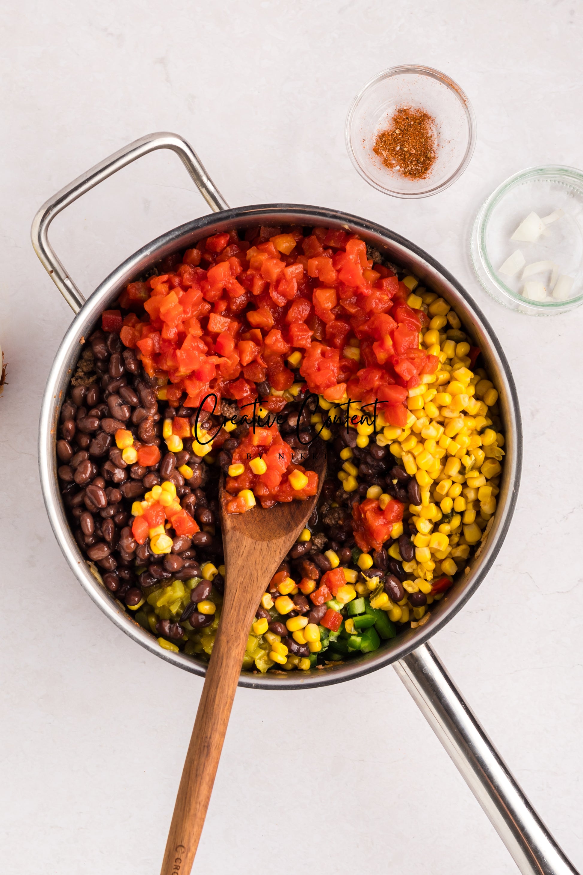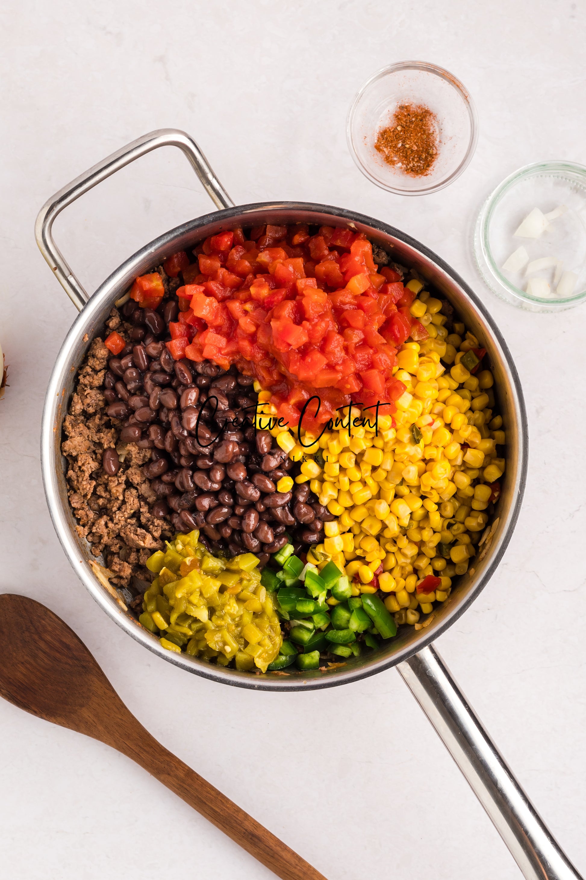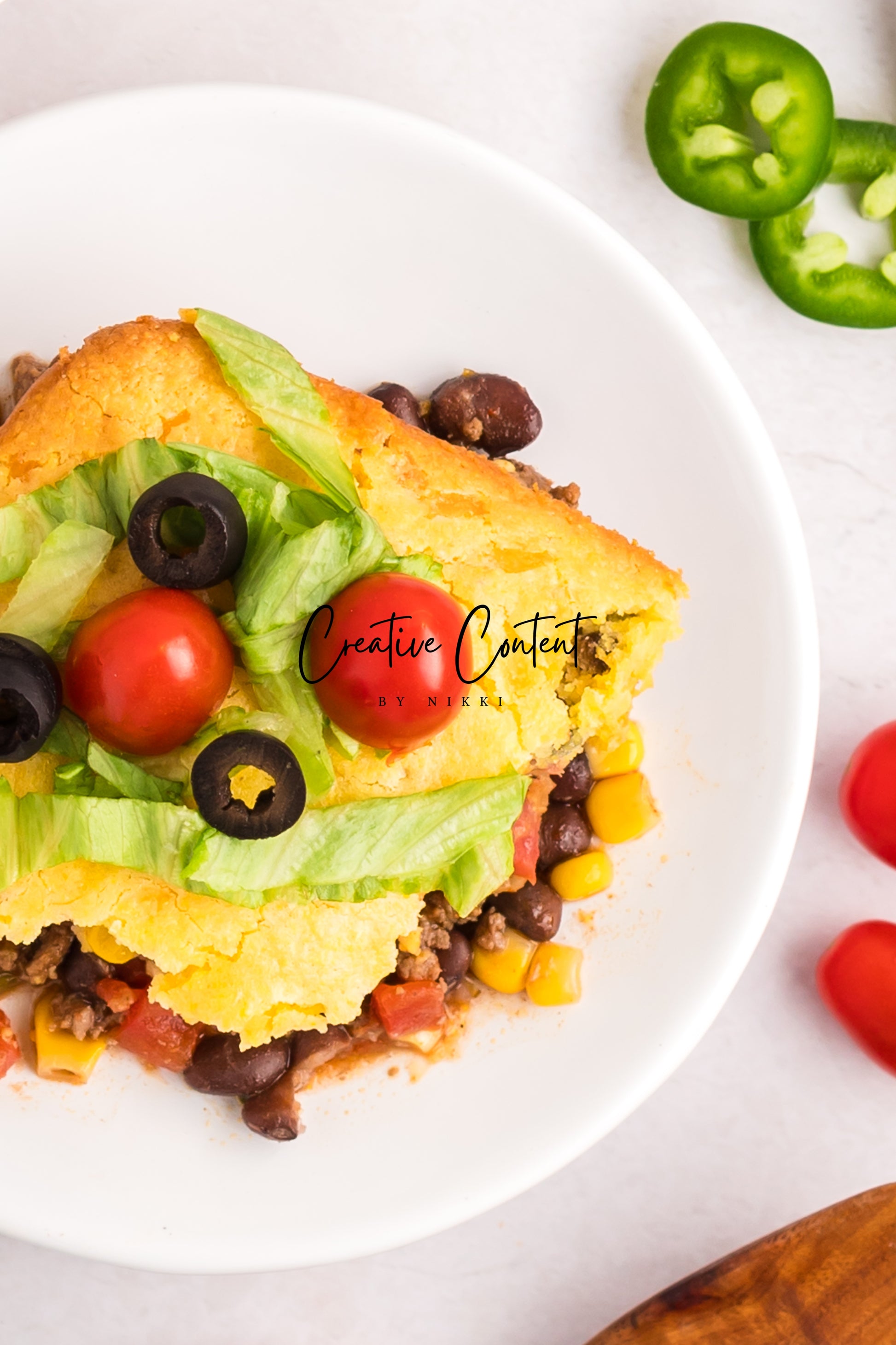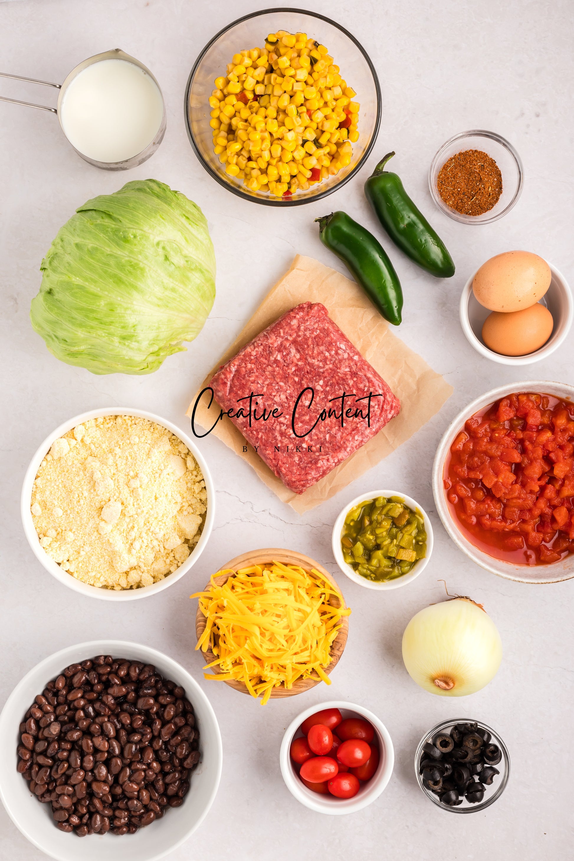 - Ingredients needed; ground beef, yellow onion, taco seasoning mix, black beans, Southwest corn, petite diced tomatoes, jalapenos, corn muffin mix, eggs, milk, shredded cheese, canned green chiles, cherry tomatoes, iceberg lettuce, and black olives.