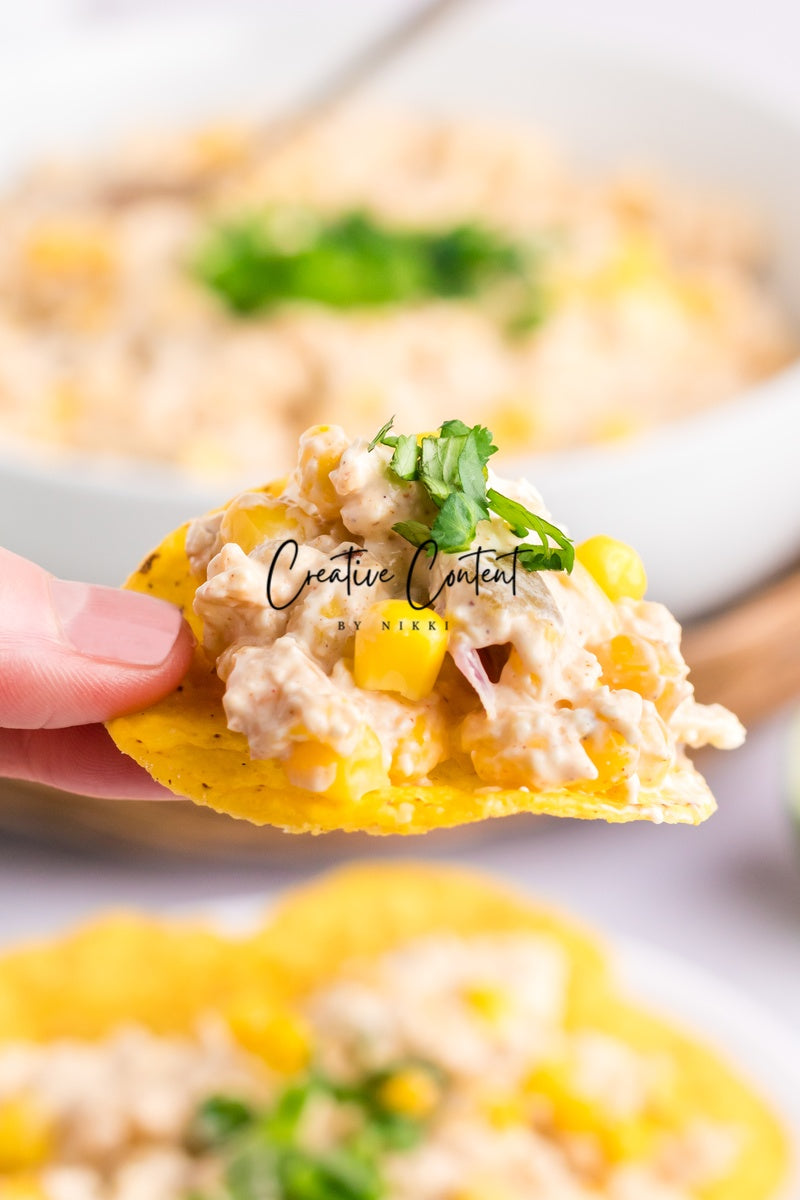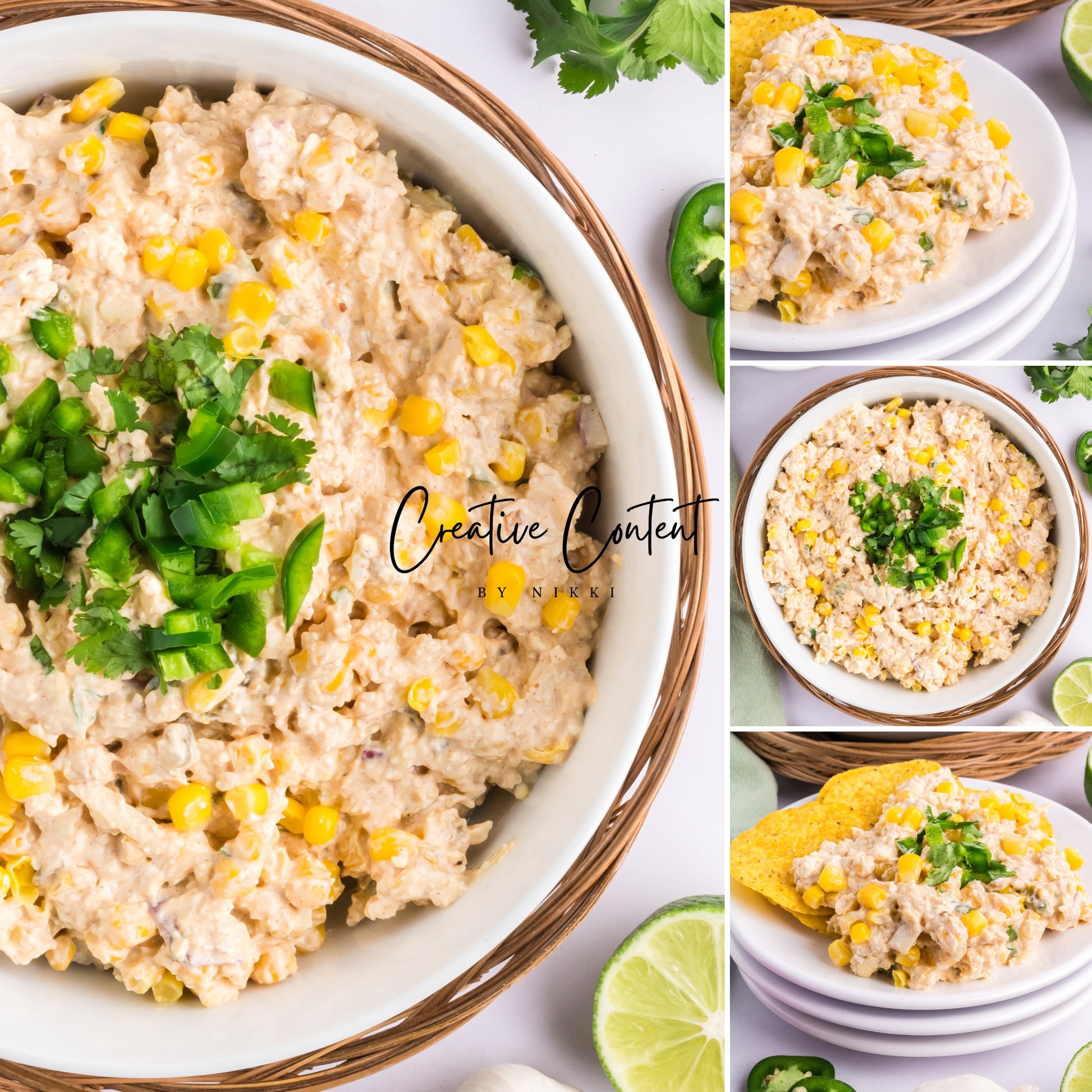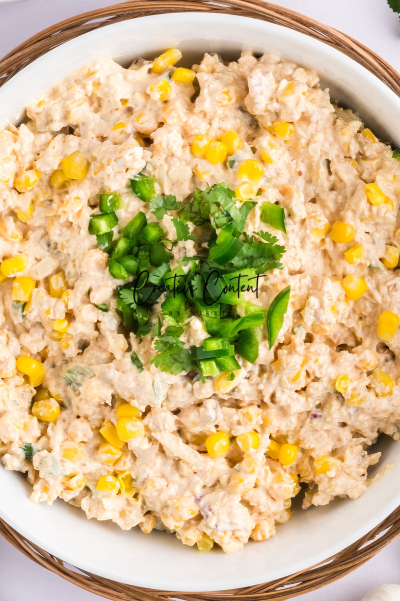 This Mexican street corn dip is cream, spicy, and full of flavor. The pepper jack cheese, cumin, jalapenos, green chilies, and red pepper flake give this dip a great kick. The heat mixed in with the cream cheese, sour cream, and mayonnaise is the perfect combination. This is a dip that I make every summer, as corn is a family favorite of ours.