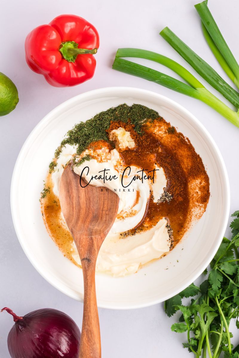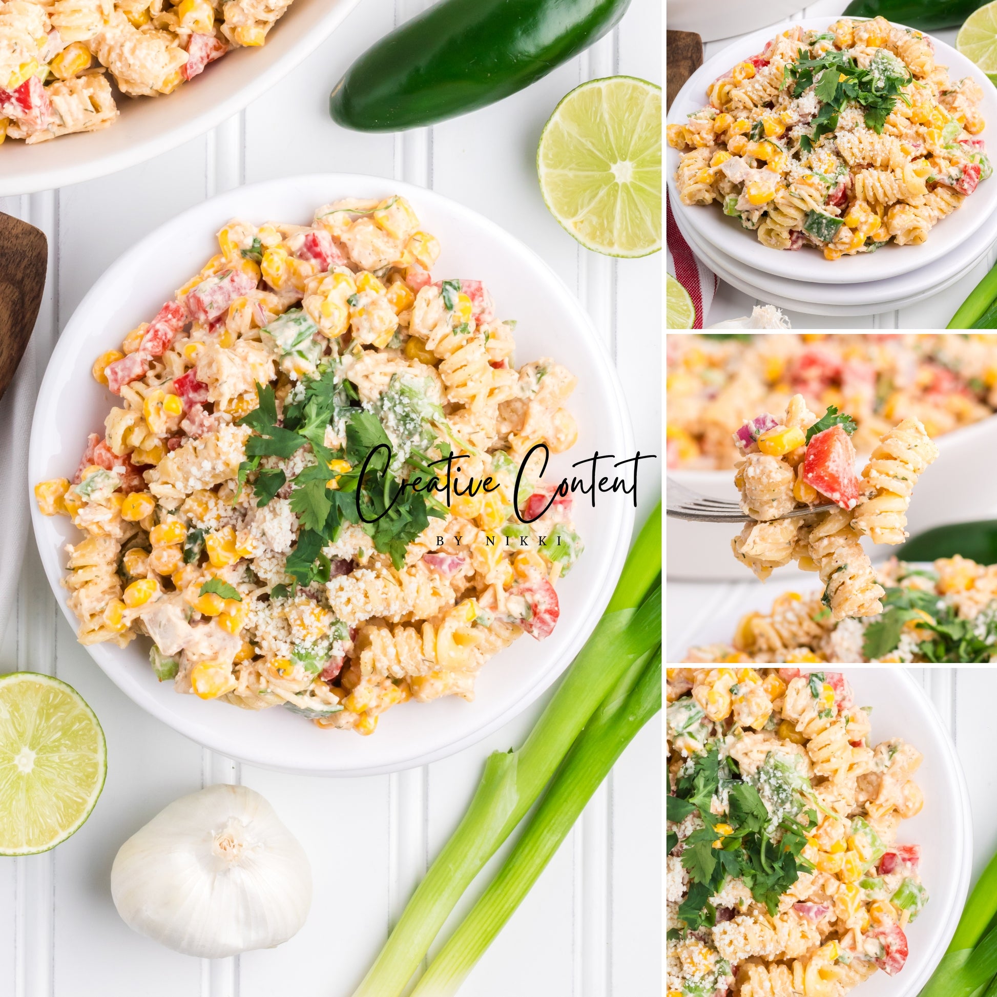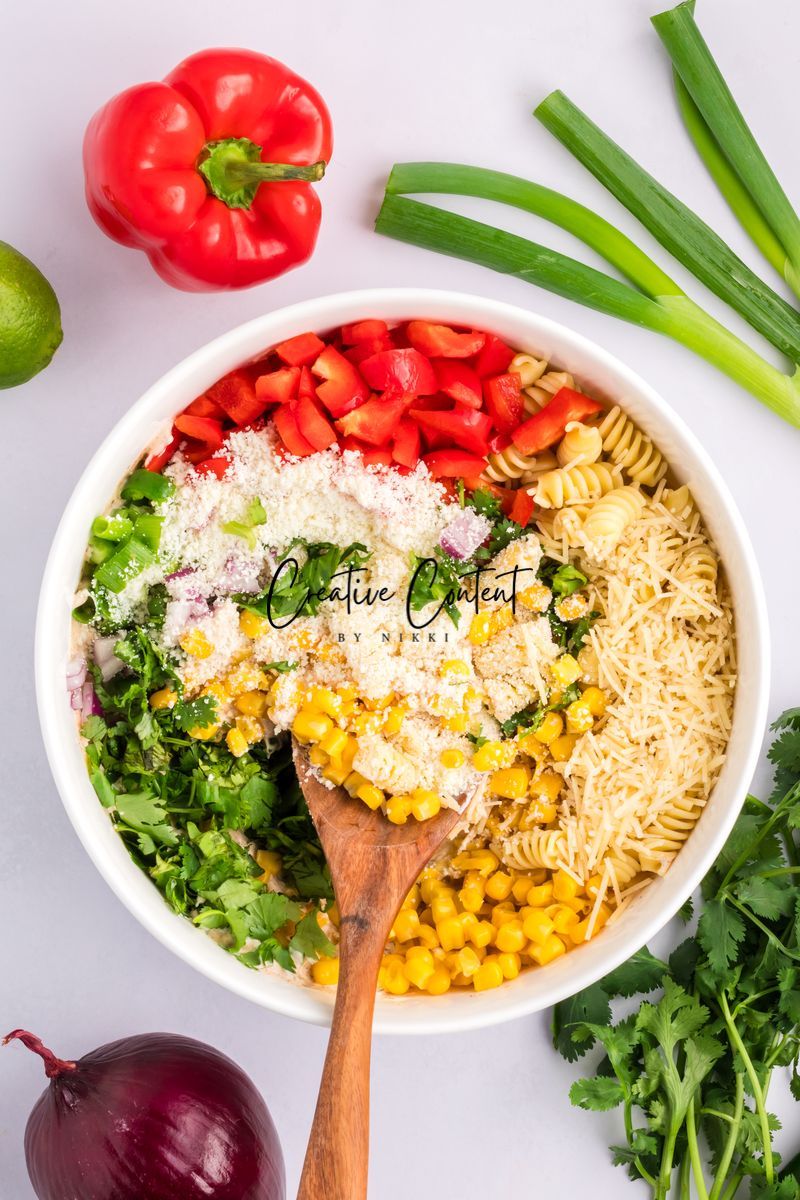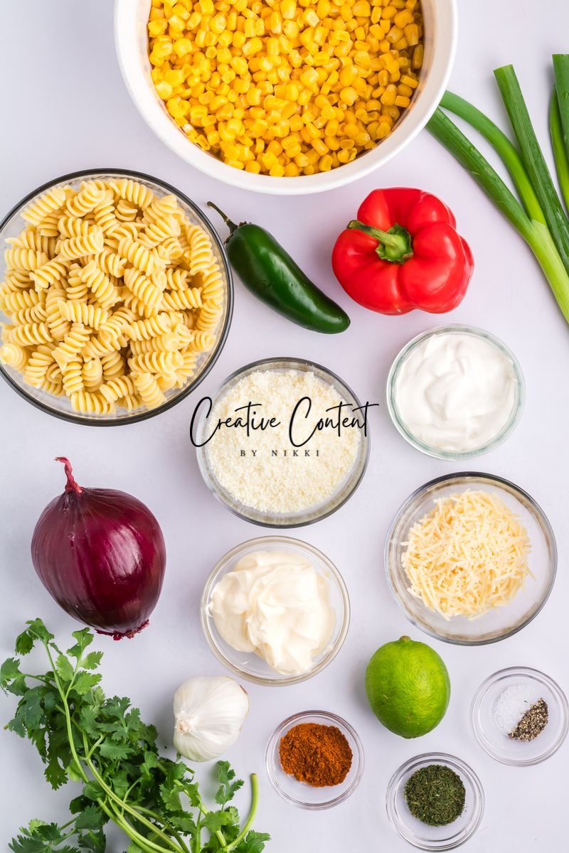 - Featured Ingredients; corn, pasta, mayonnaise, sour cream, lime juice, garlic cloves, chile powder, dried dill, coarse kosher salt, black pepper, frozen corn, pasta, red bell pepper, red onion, green onions, jalapenos, Cotija cheese, parmesan cheese, and cilantro.