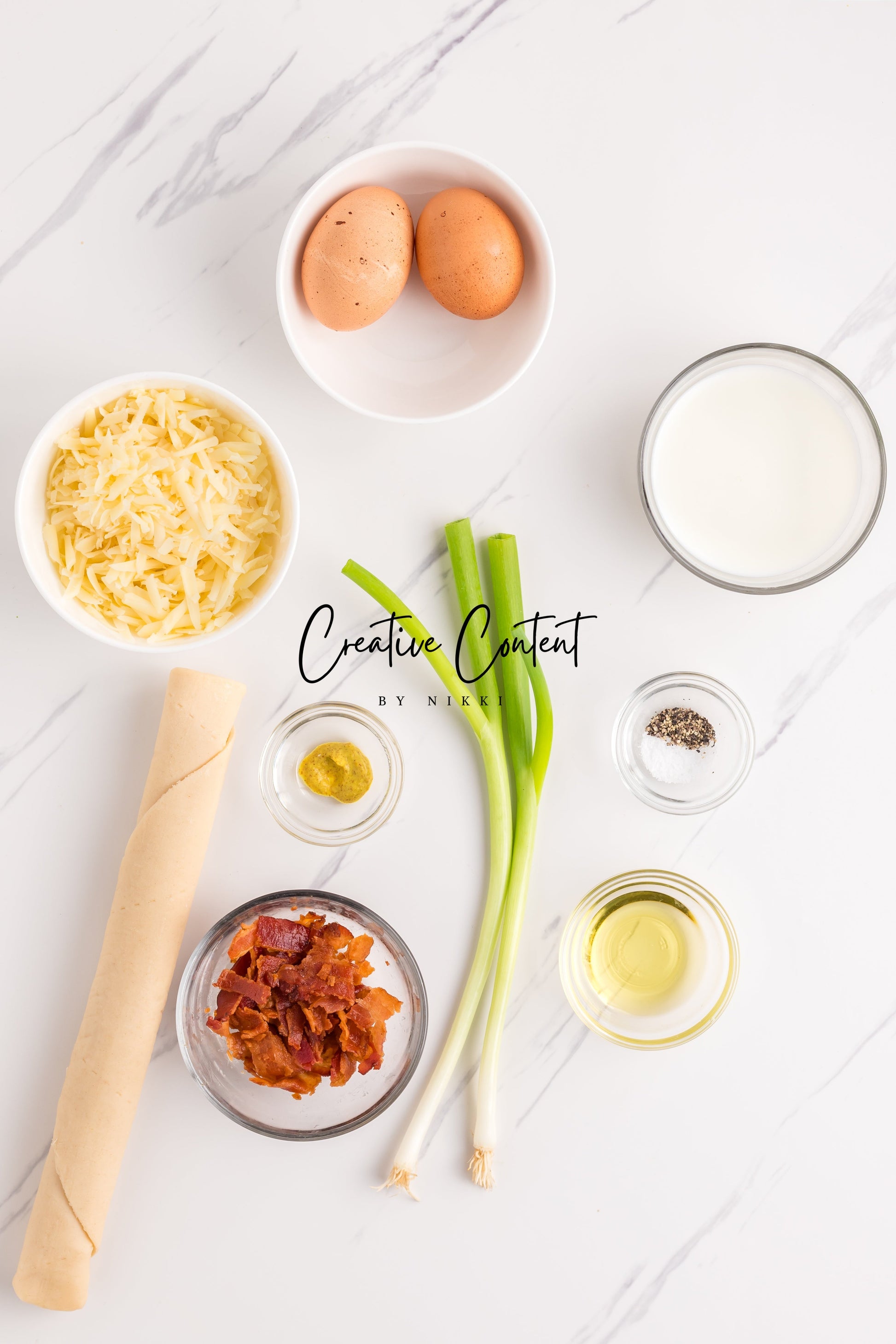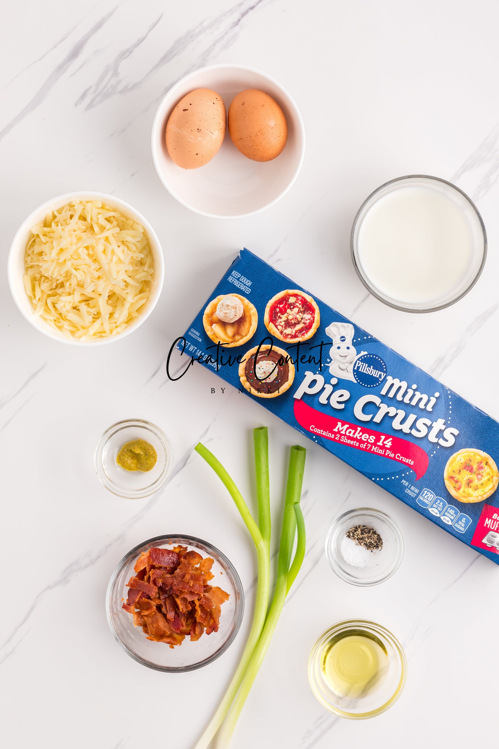- Featured Ingredients; avocado oil, mini pie crusts, bacon, swiss cheese, green onions, milk, eggs, Dijon mustard, coarse kosher salt, and black pepper.