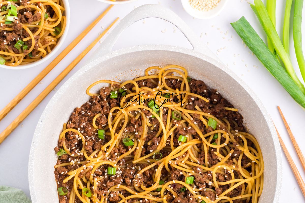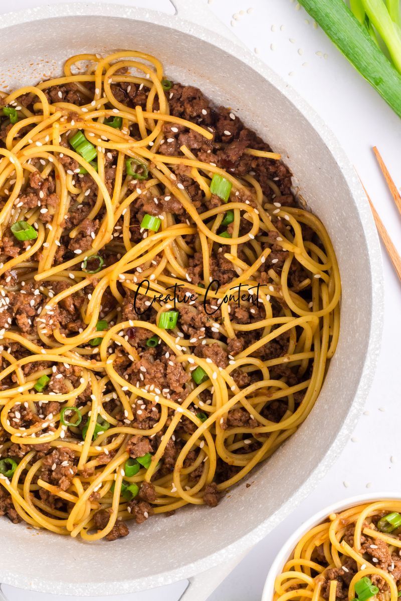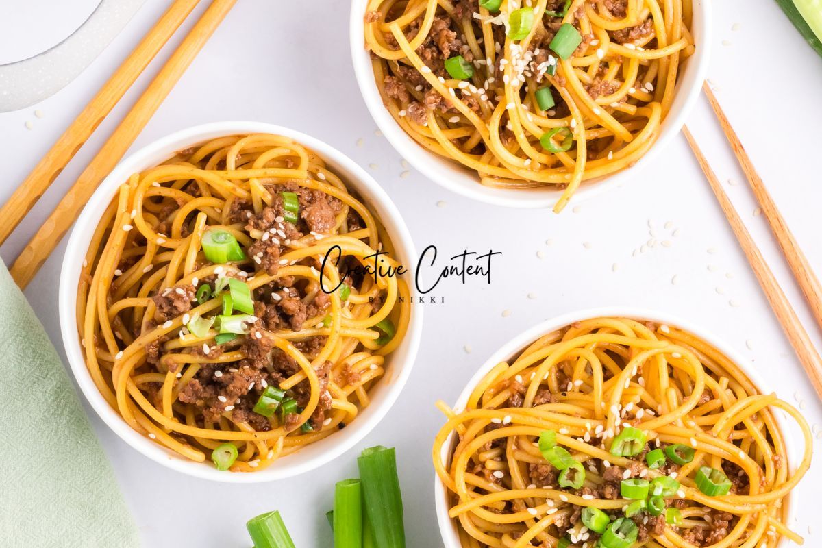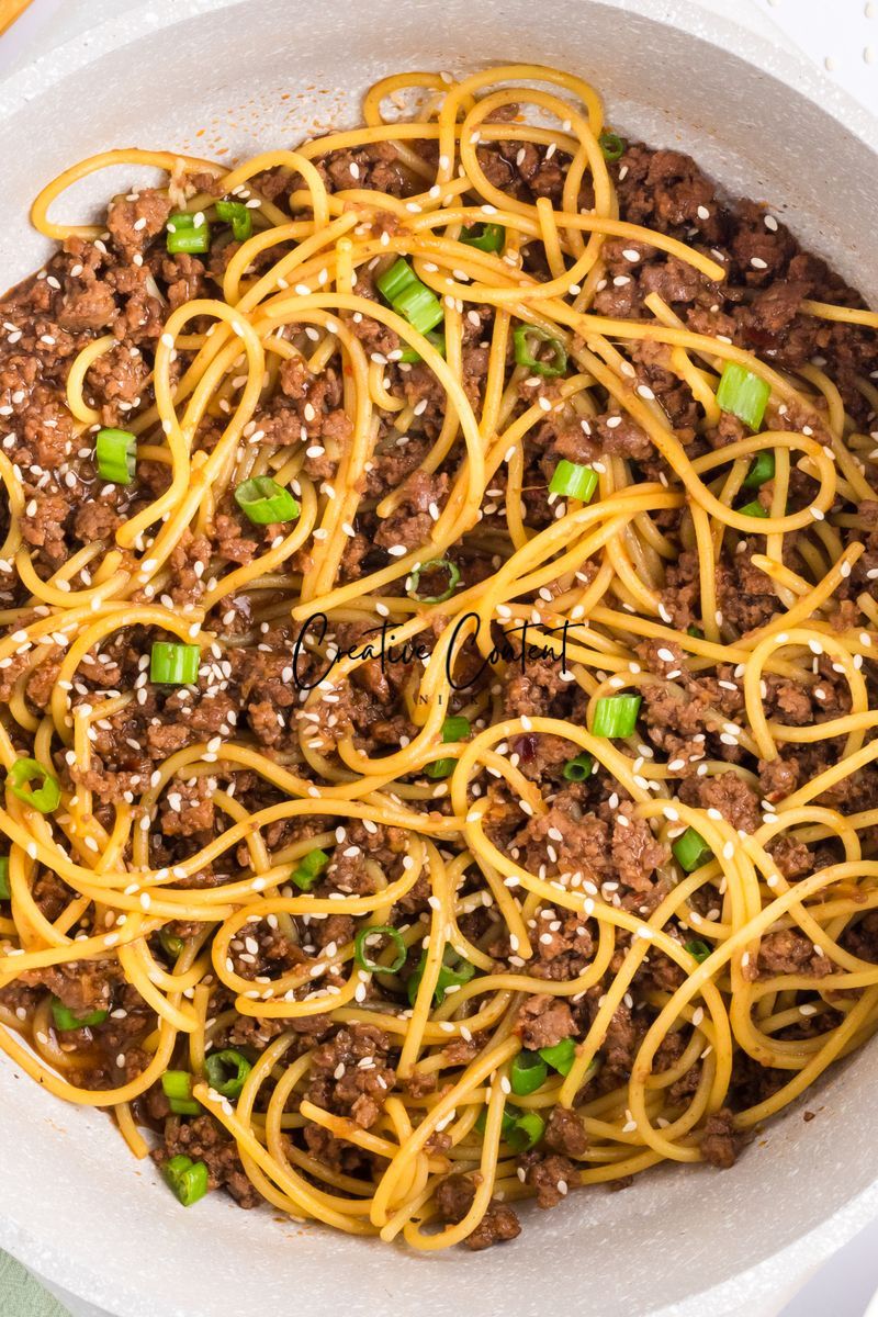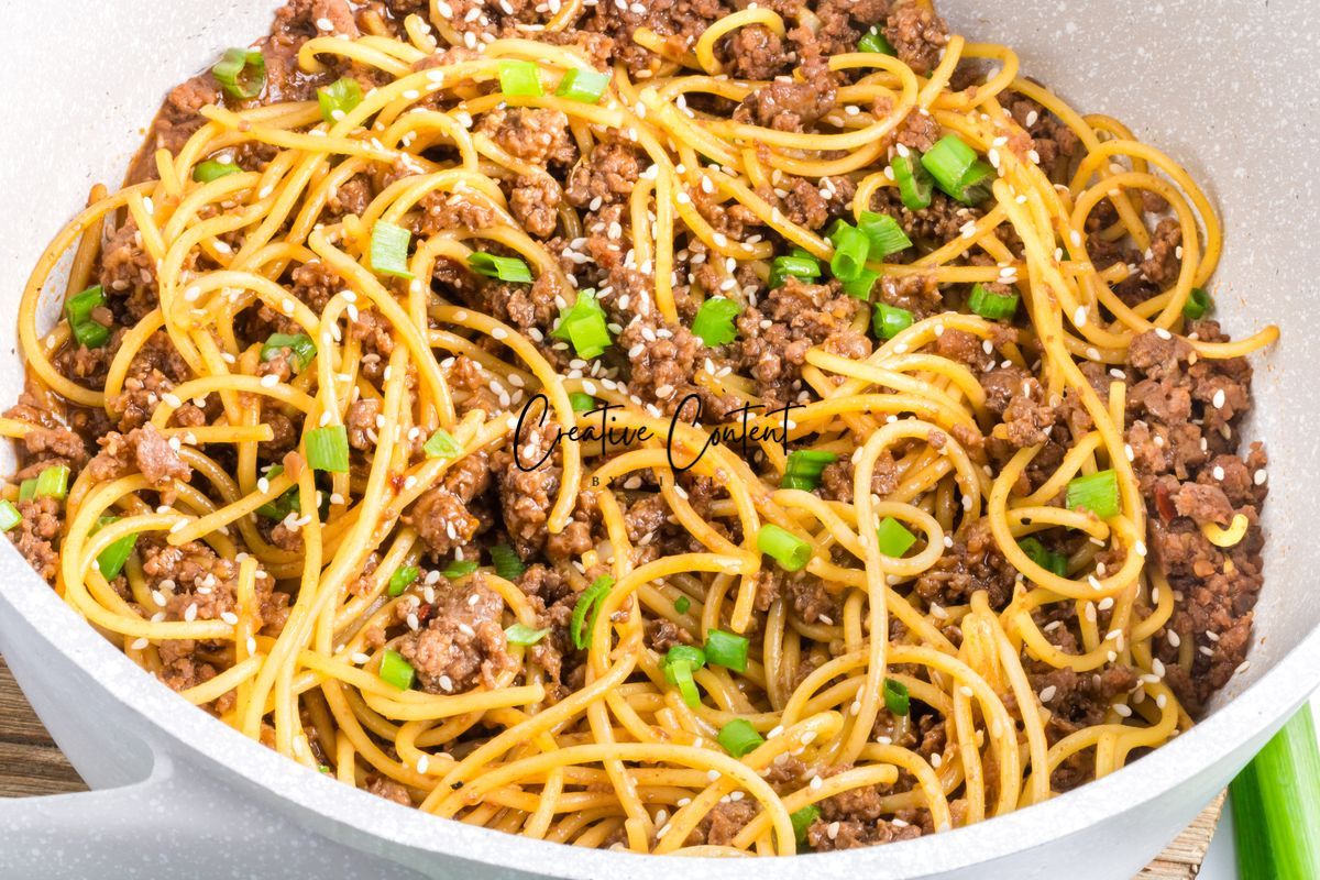 Featured Ingredients; Spaghetti, ground beef, sesame oil, garlic cloves, tomato paste, low sodium soy sauce, honey, low sodium beef broth, hoisin sauce, ginger, red pepper flakes, black pepper, coarse kosher salt, cornstarch, green onions, and sesame seeds.