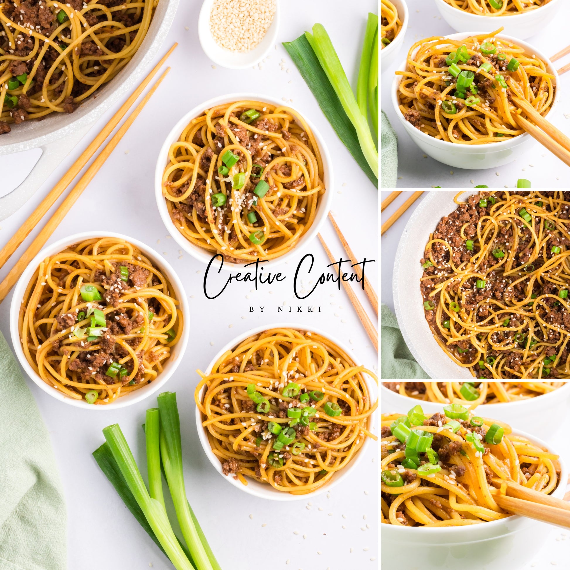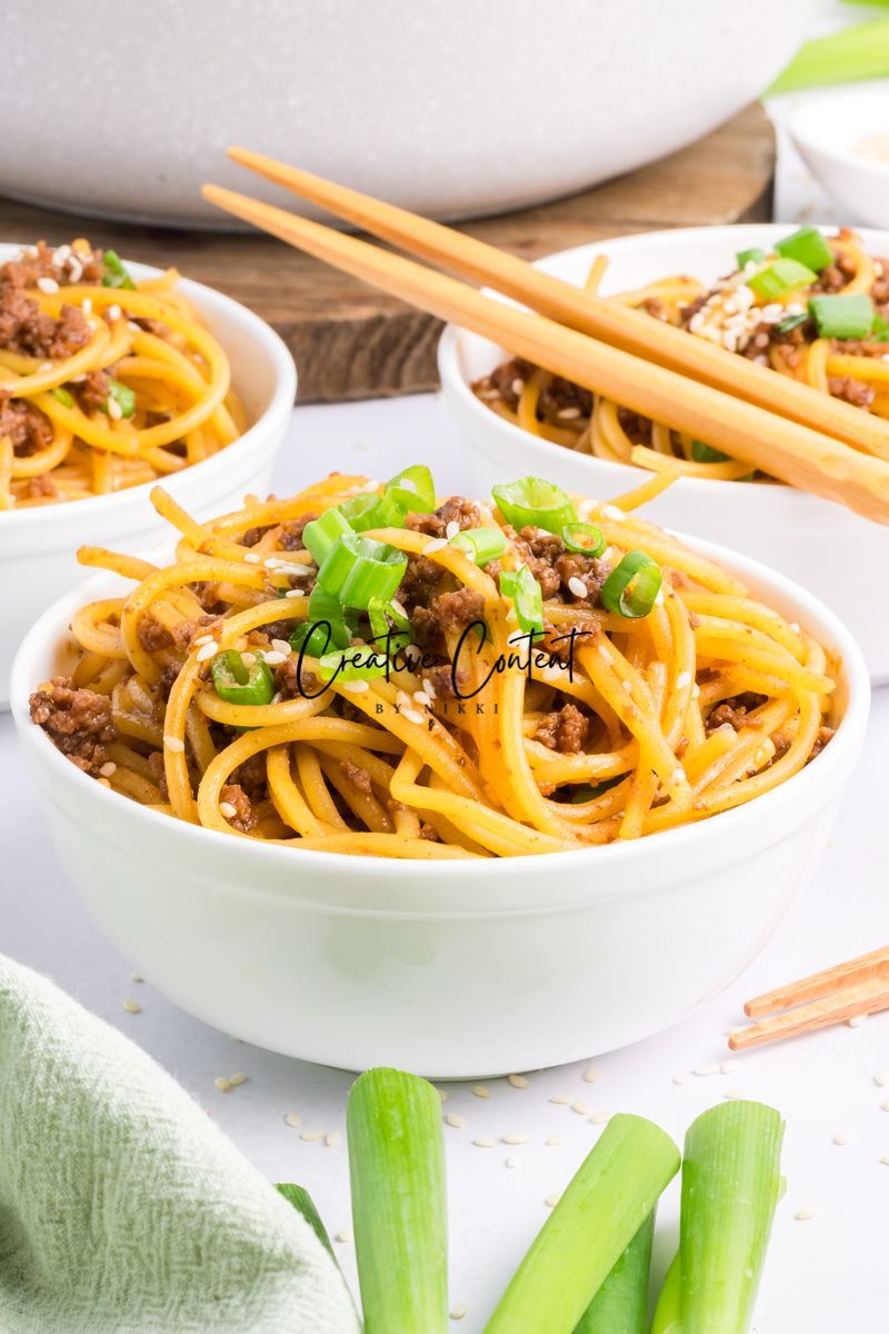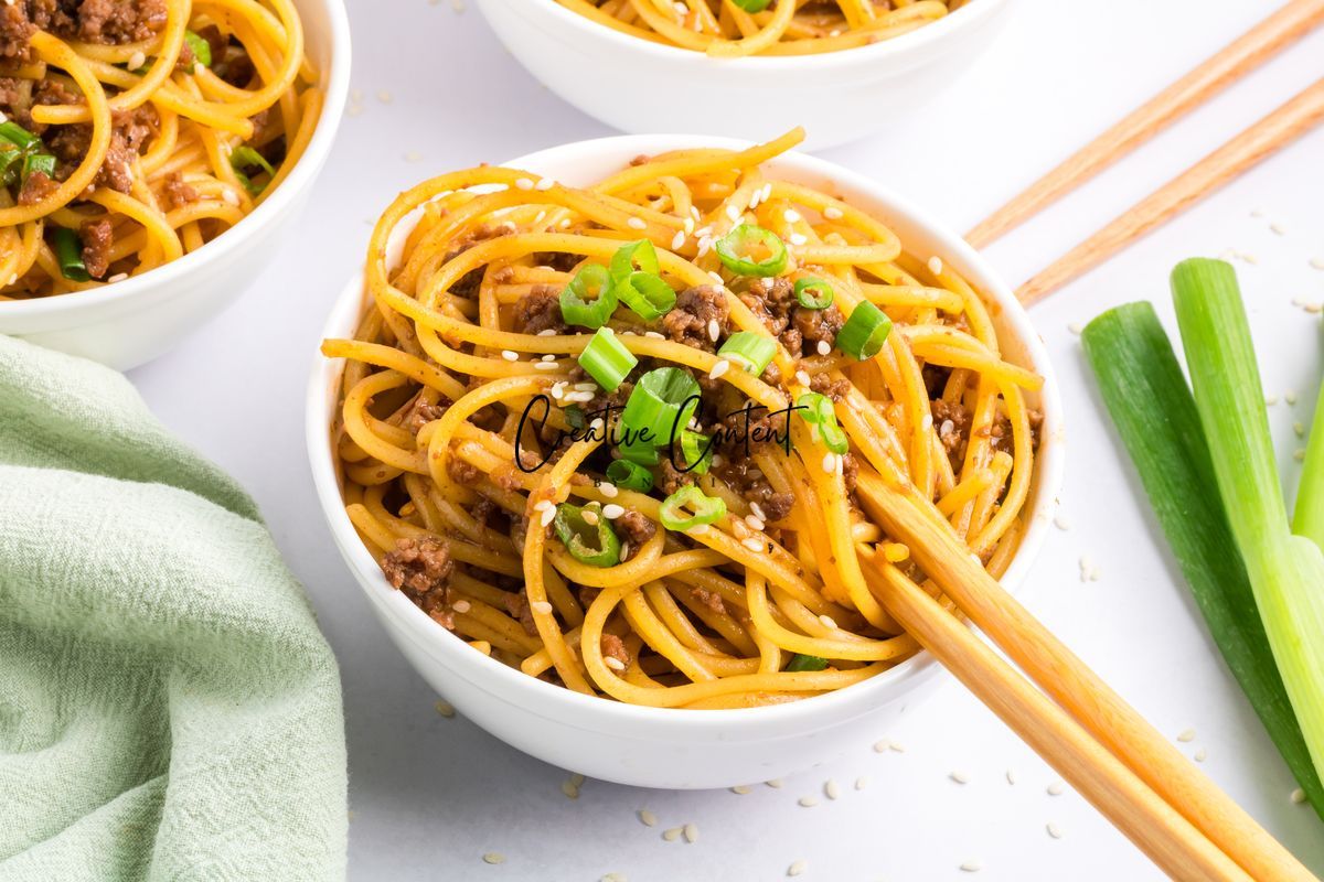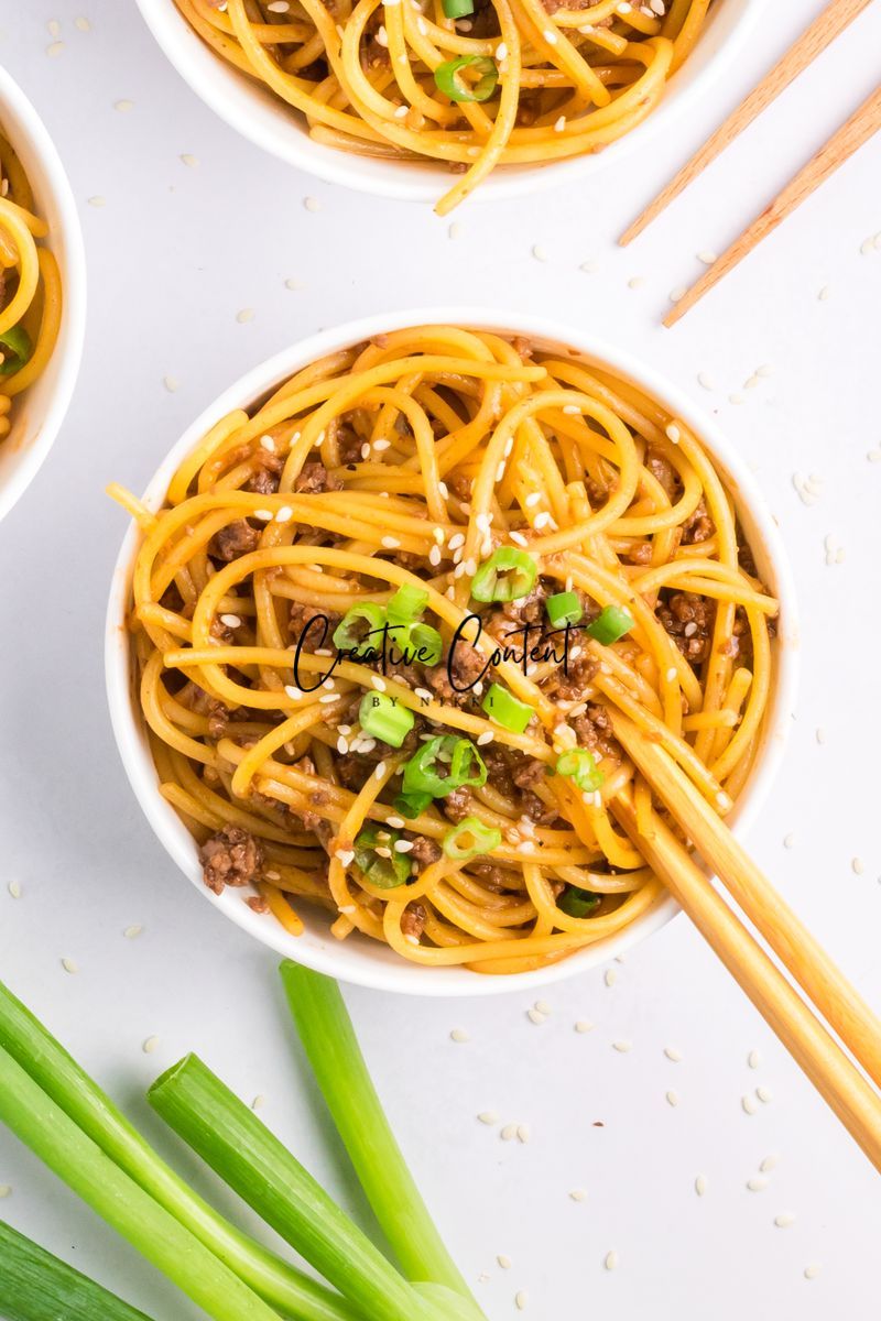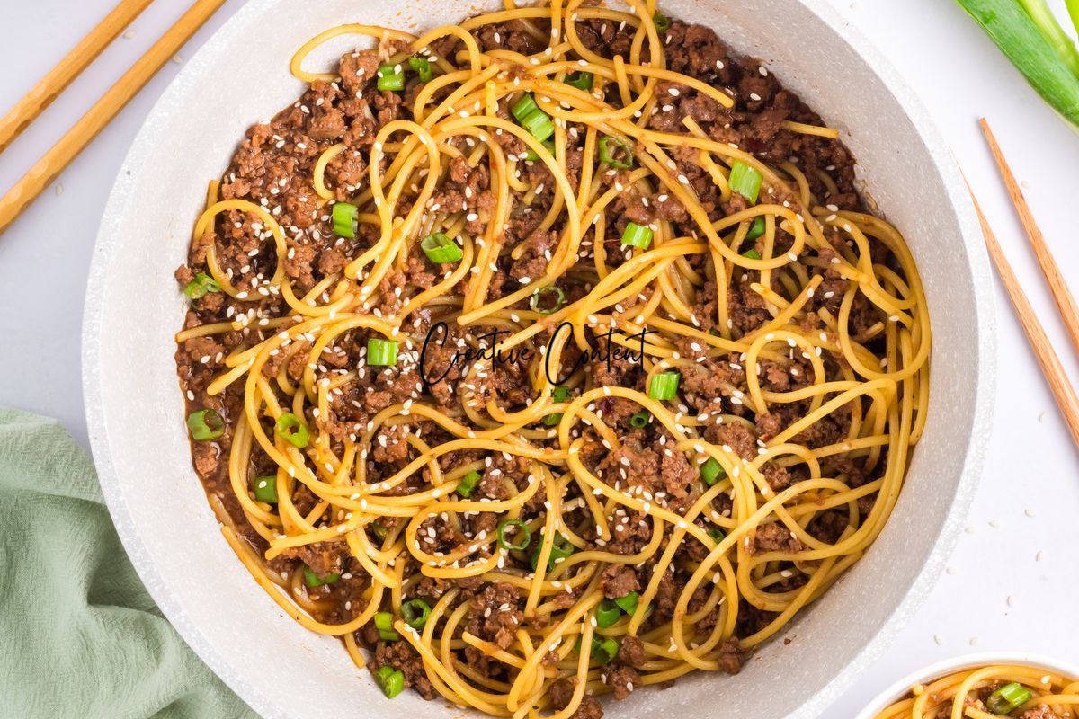 Featured Ingredients; Spaghetti, ground beef, sesame oil, garlic cloves, tomato paste, low sodium soy sauce, honey, low sodium beef broth, hoisin sauce, ginger, red pepper flakes, black pepper, coarse kosher salt, cornstarch, green onions, and sesame seeds.