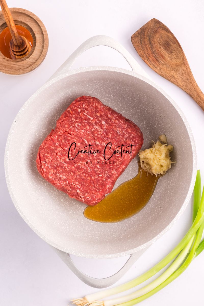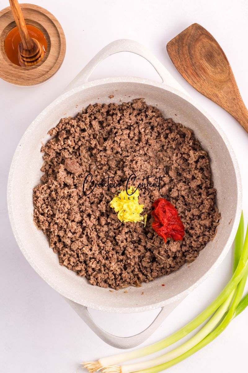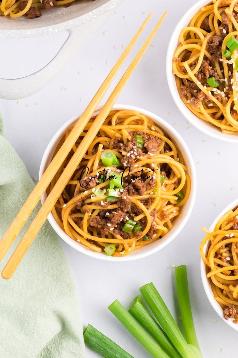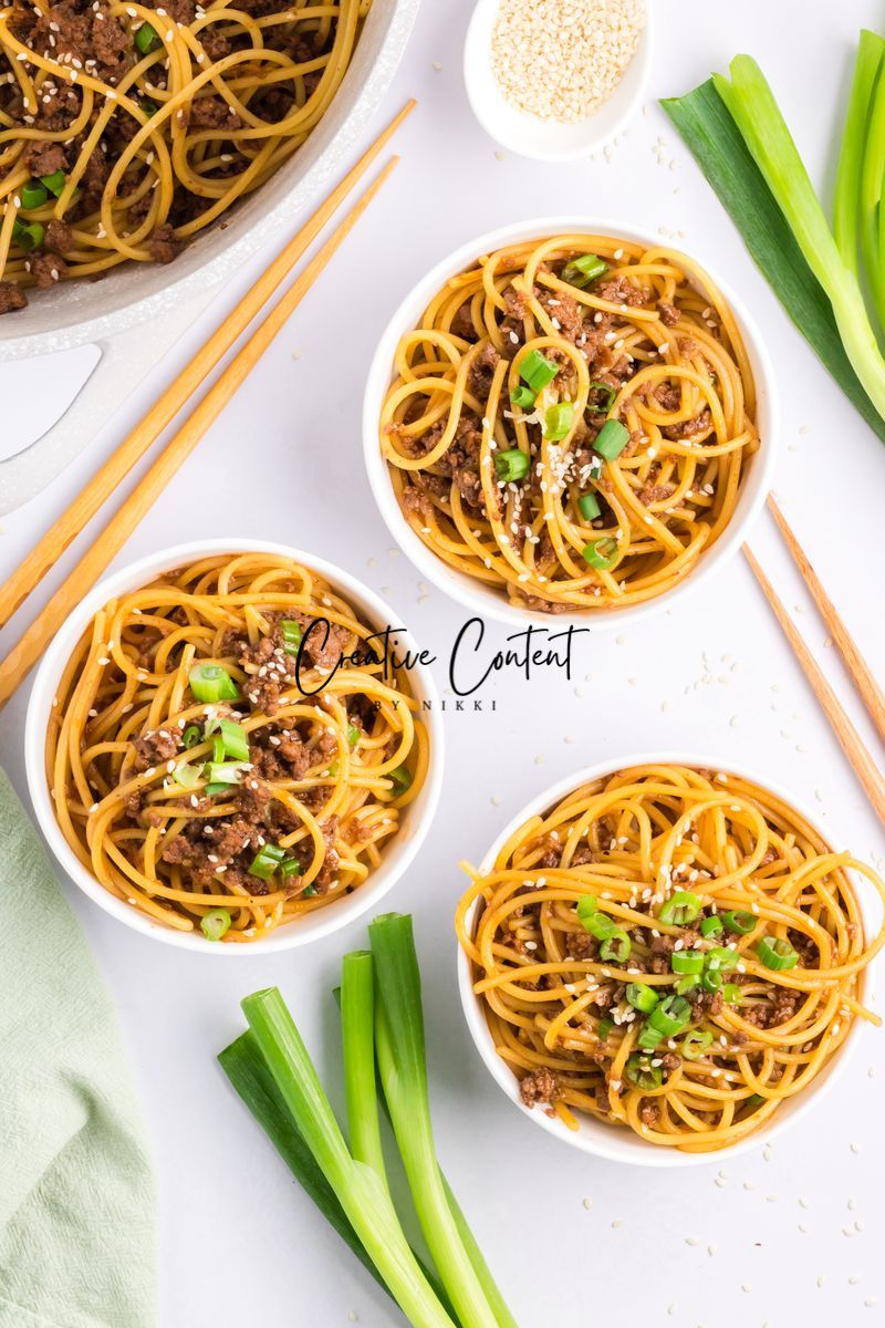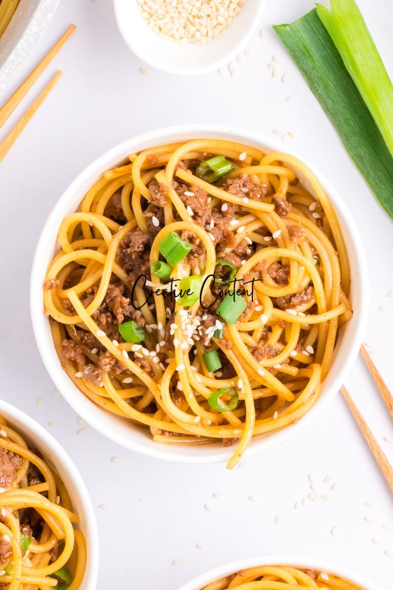 Featured Ingredients; Spaghetti, ground beef, sesame oil, garlic cloves, tomato paste, low sodium soy sauce, honey, low sodium beef broth, hoisin sauce, ginger, red pepper flakes, black pepper, coarse kosher salt, cornstarch, green onions, and sesame seeds.