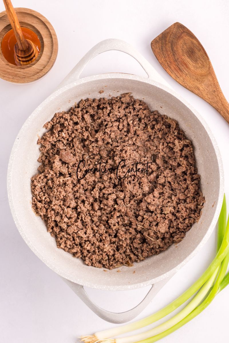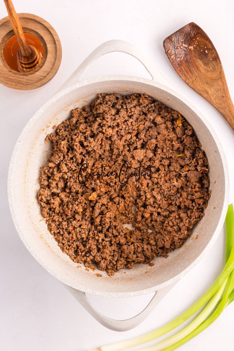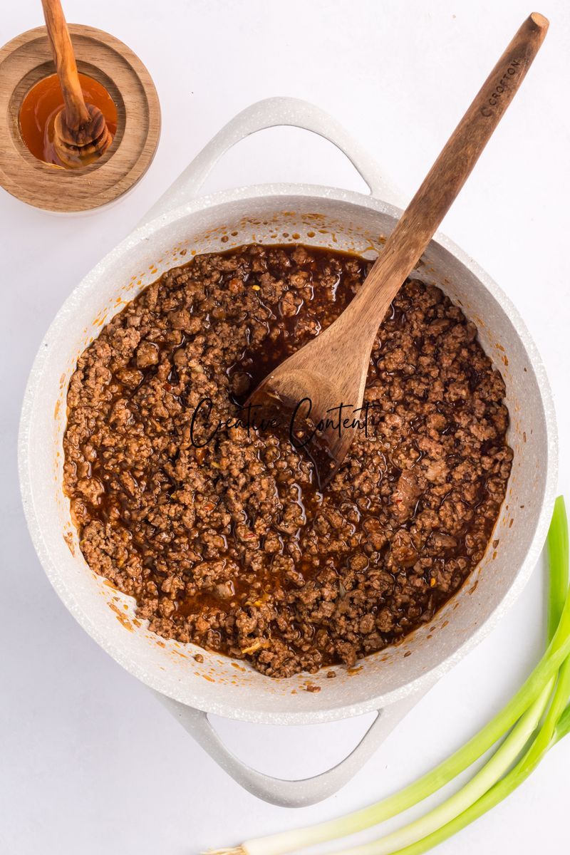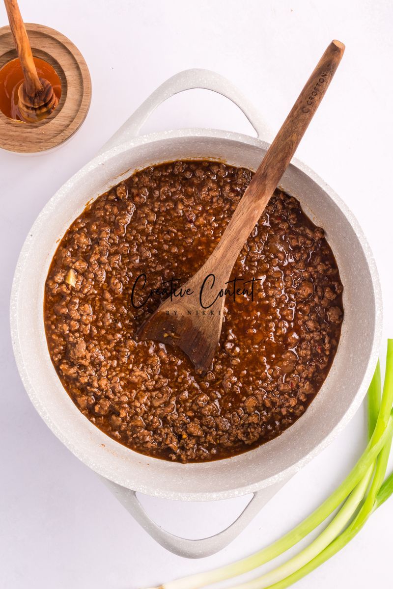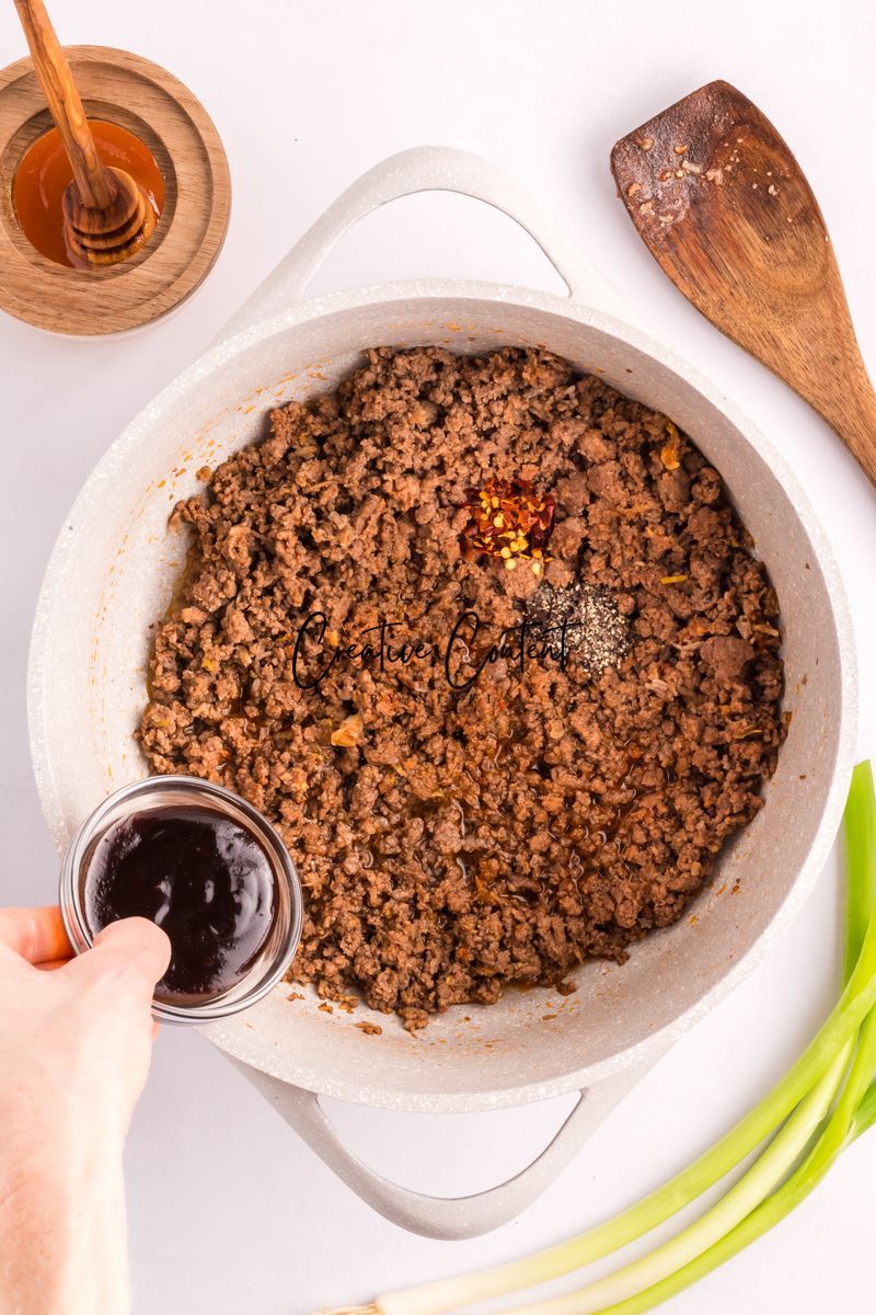 Featured Ingredients; Spaghetti, ground beef, sesame oil, garlic cloves, tomato paste, low sodium soy sauce, honey, low sodium beef broth, hoisin sauce, ginger, red pepper flakes, black pepper, coarse kosher salt, cornstarch, green onions, and sesame seeds.