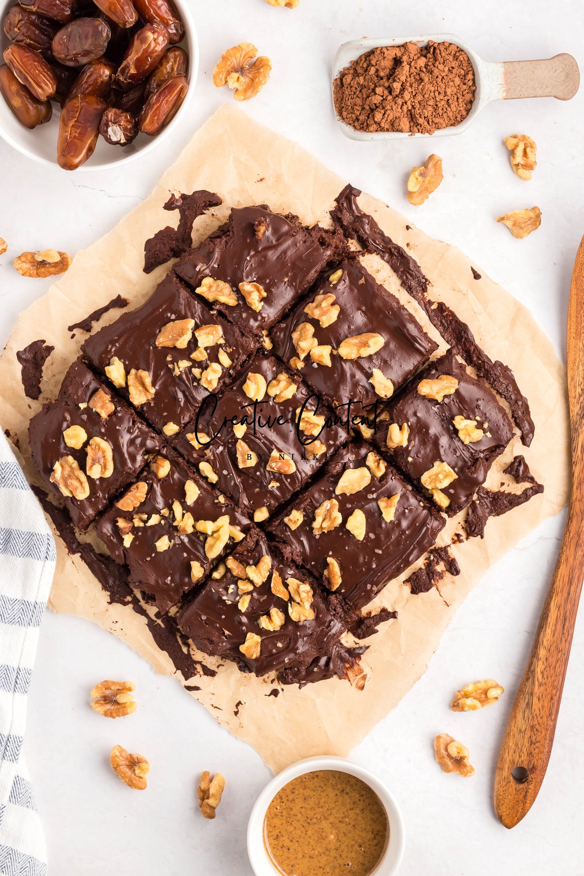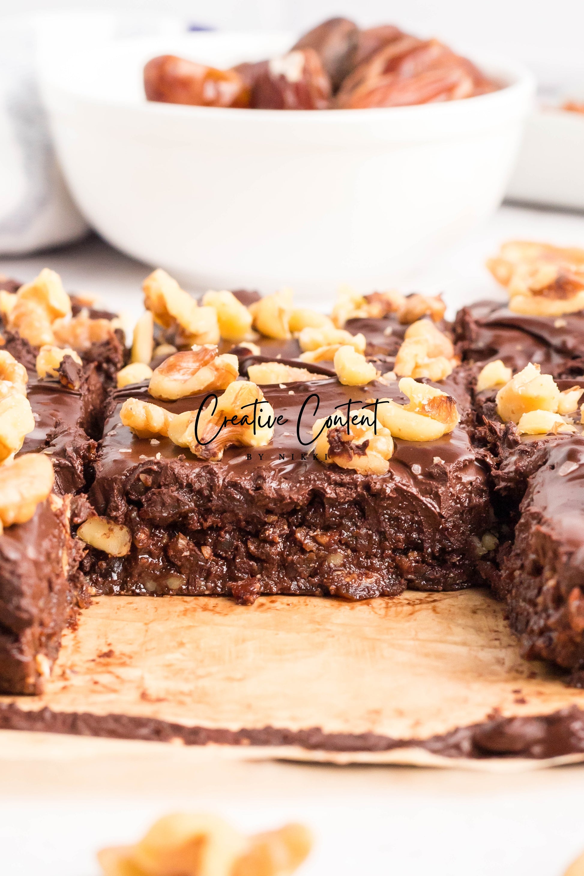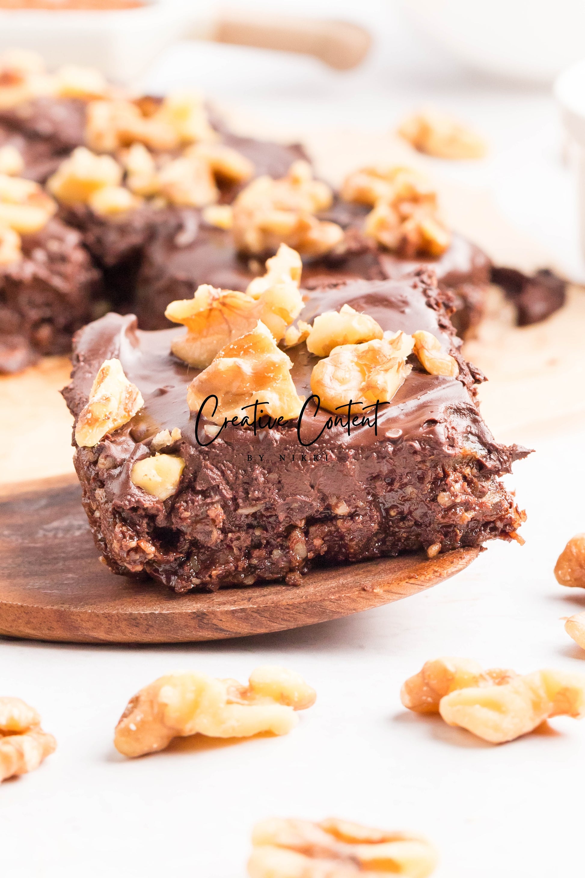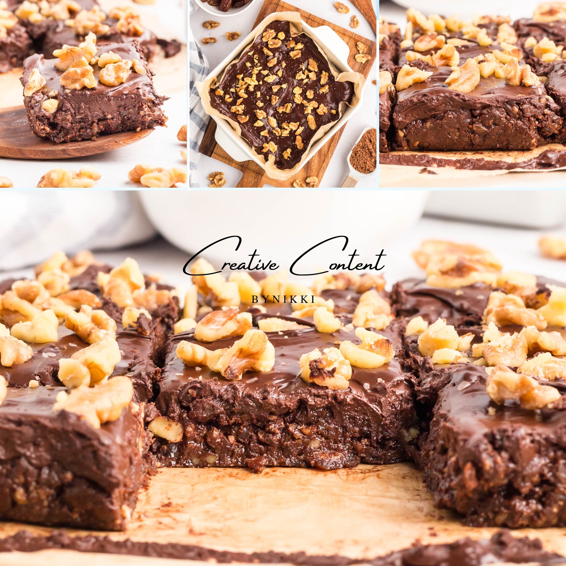 - Ingredients: dates, nut butter, cocoa powder, coconut cream, maple syrup, chopped walnuts