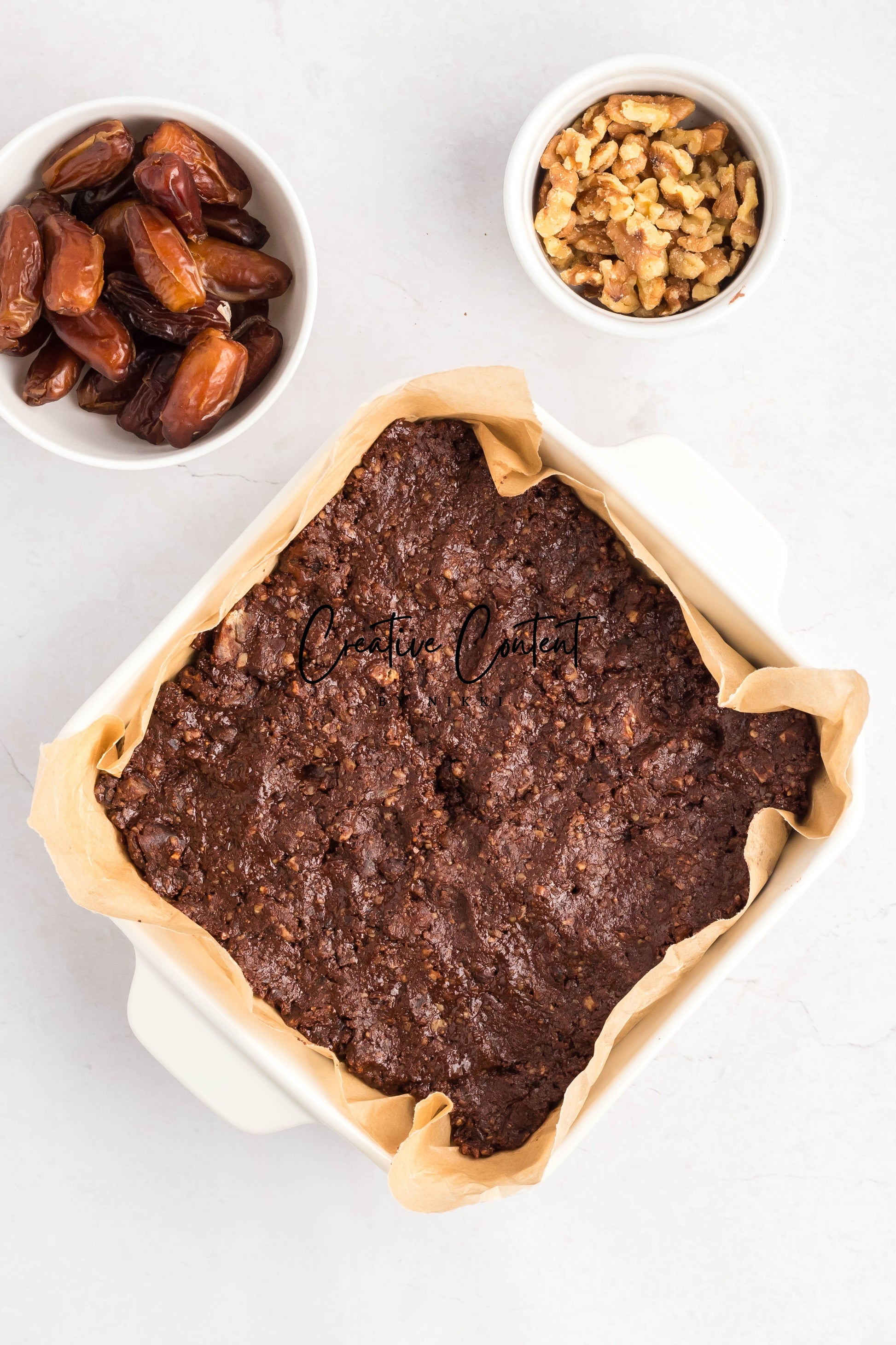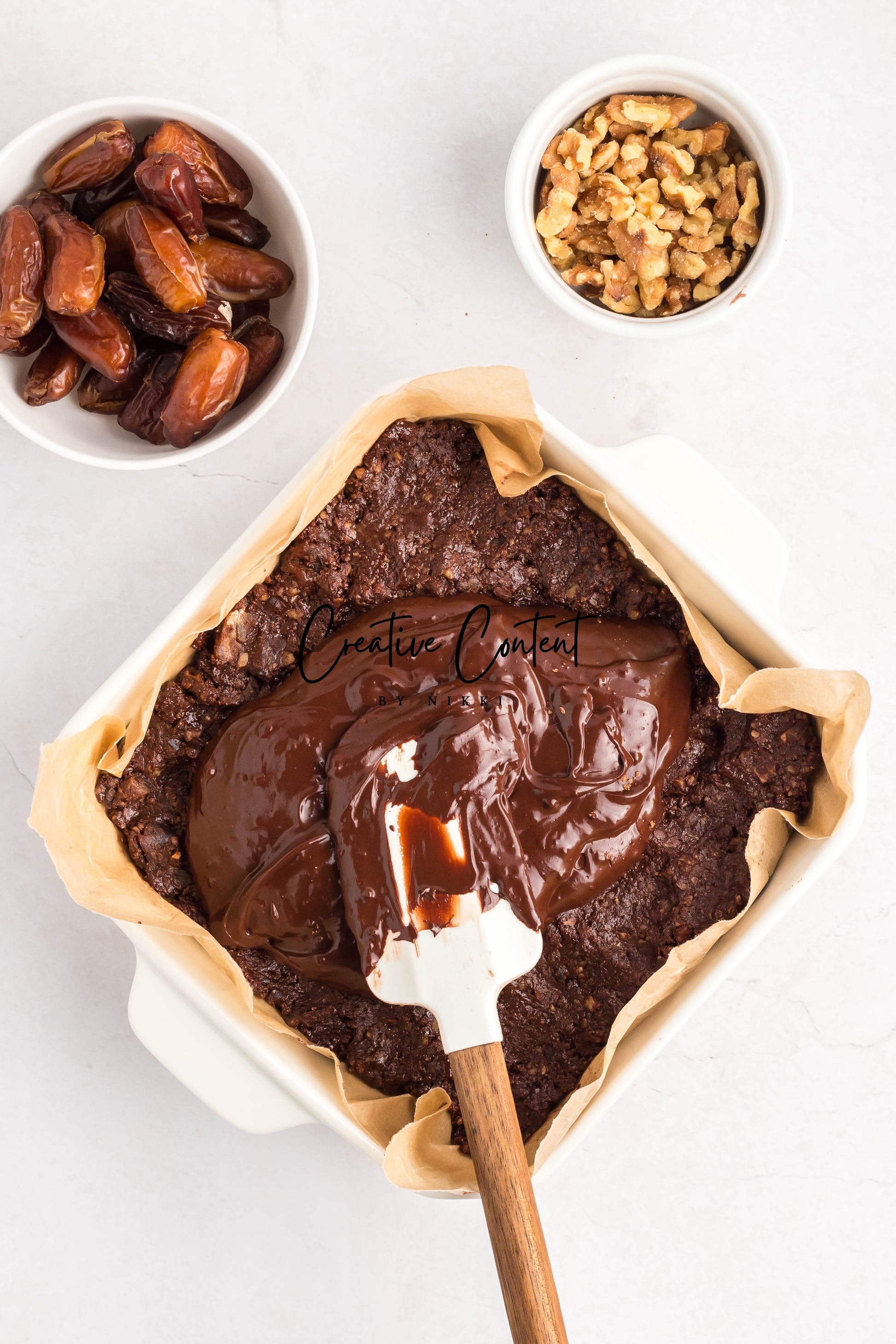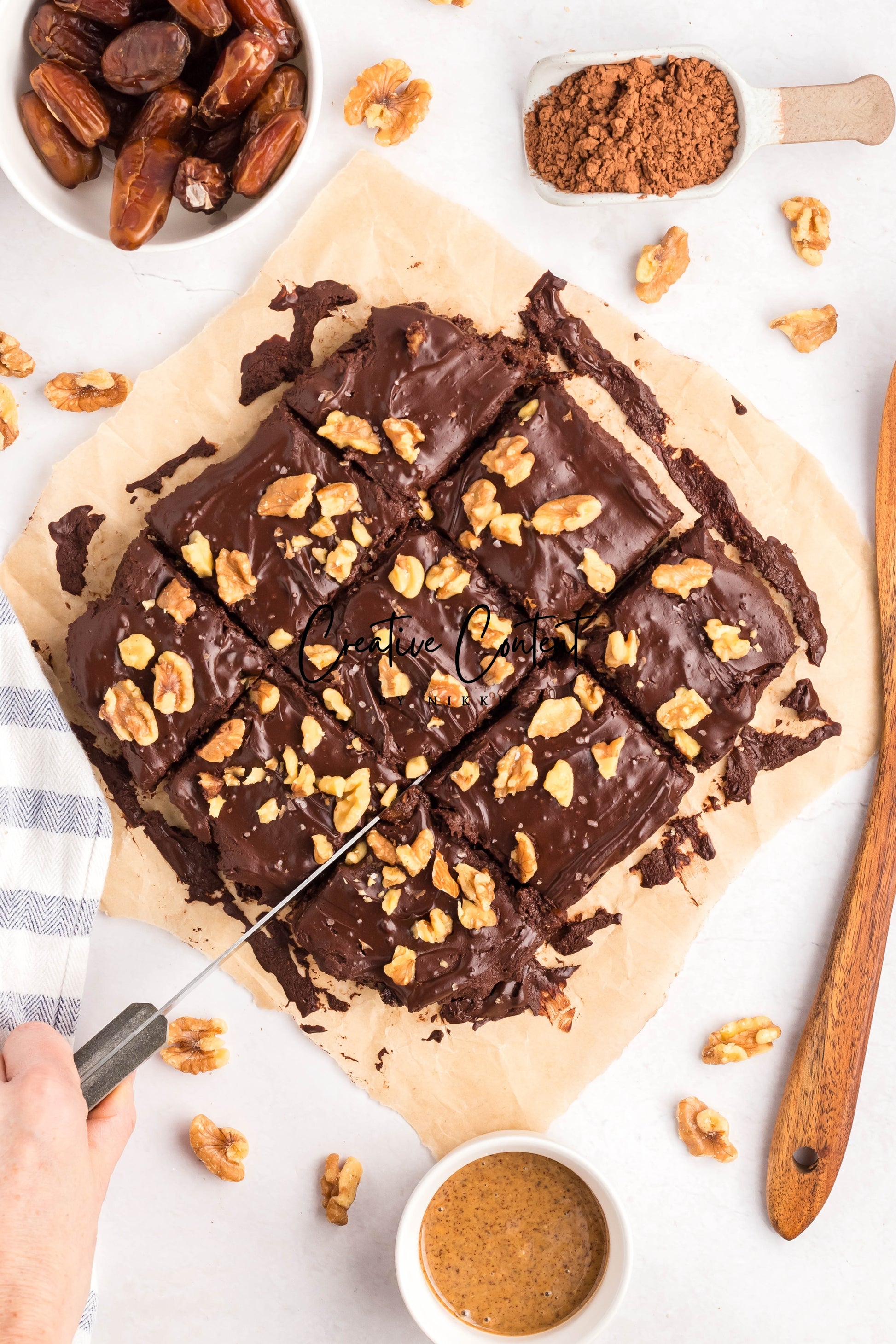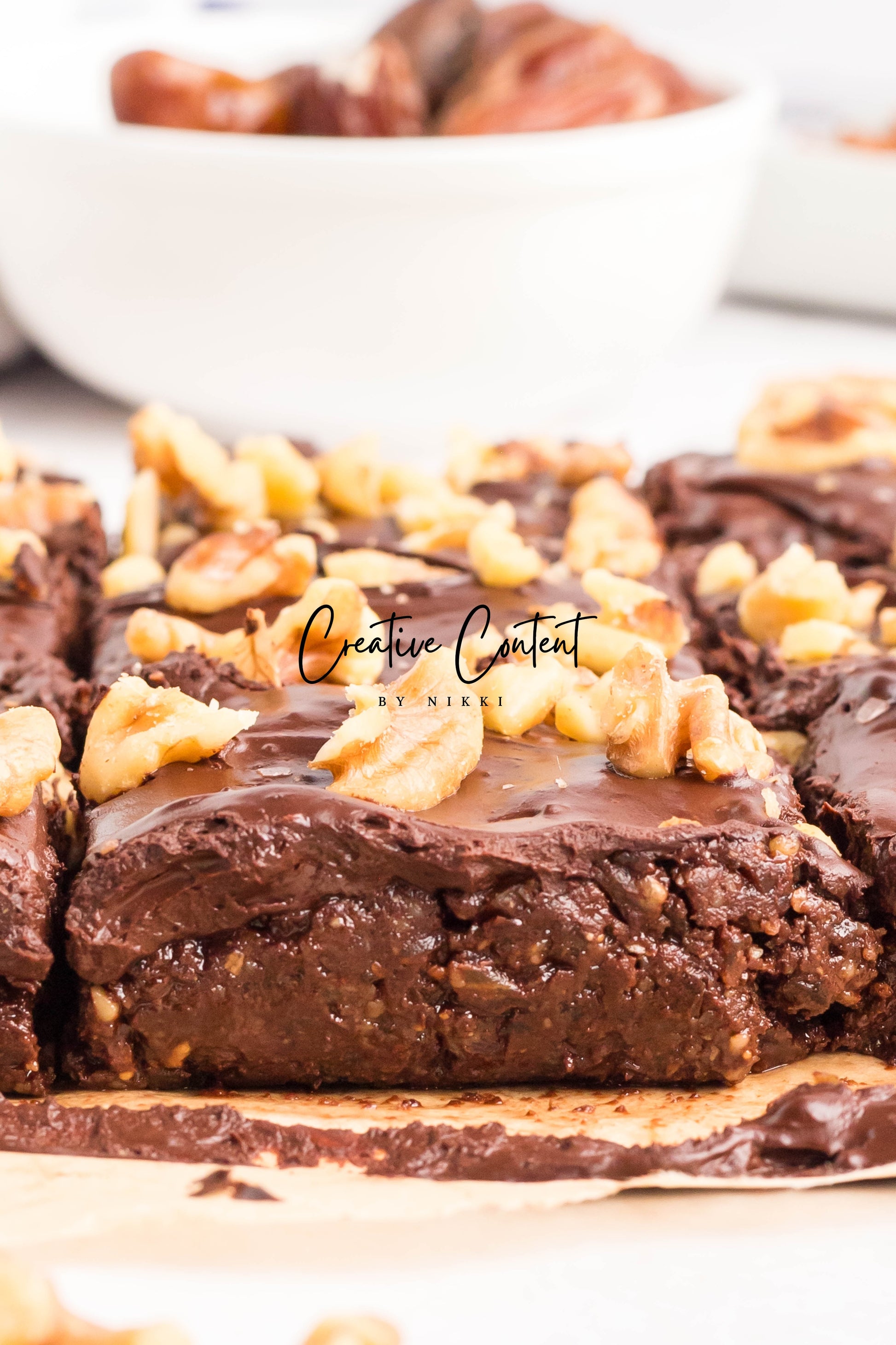 - Ingredients: dates, nut butter, cocoa powder, coconut cream, maple syrup, chopped walnuts