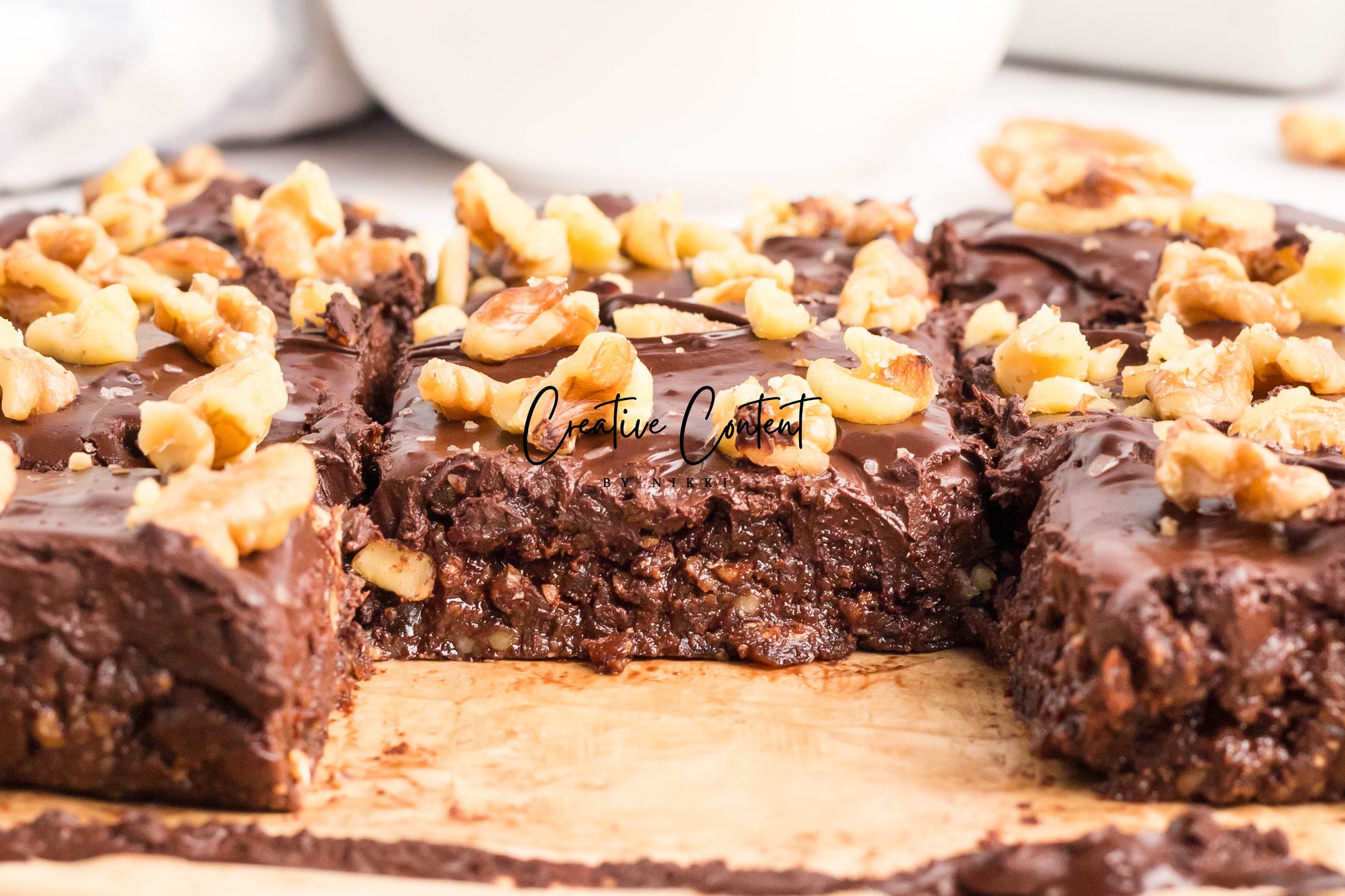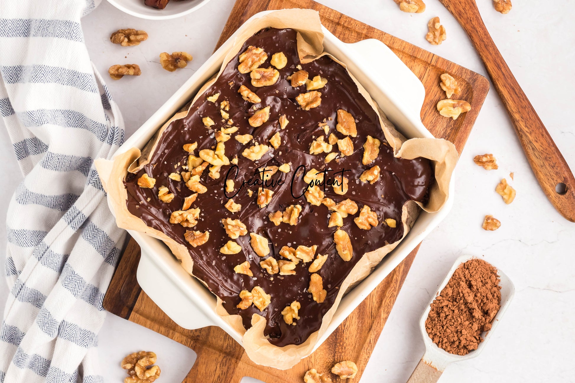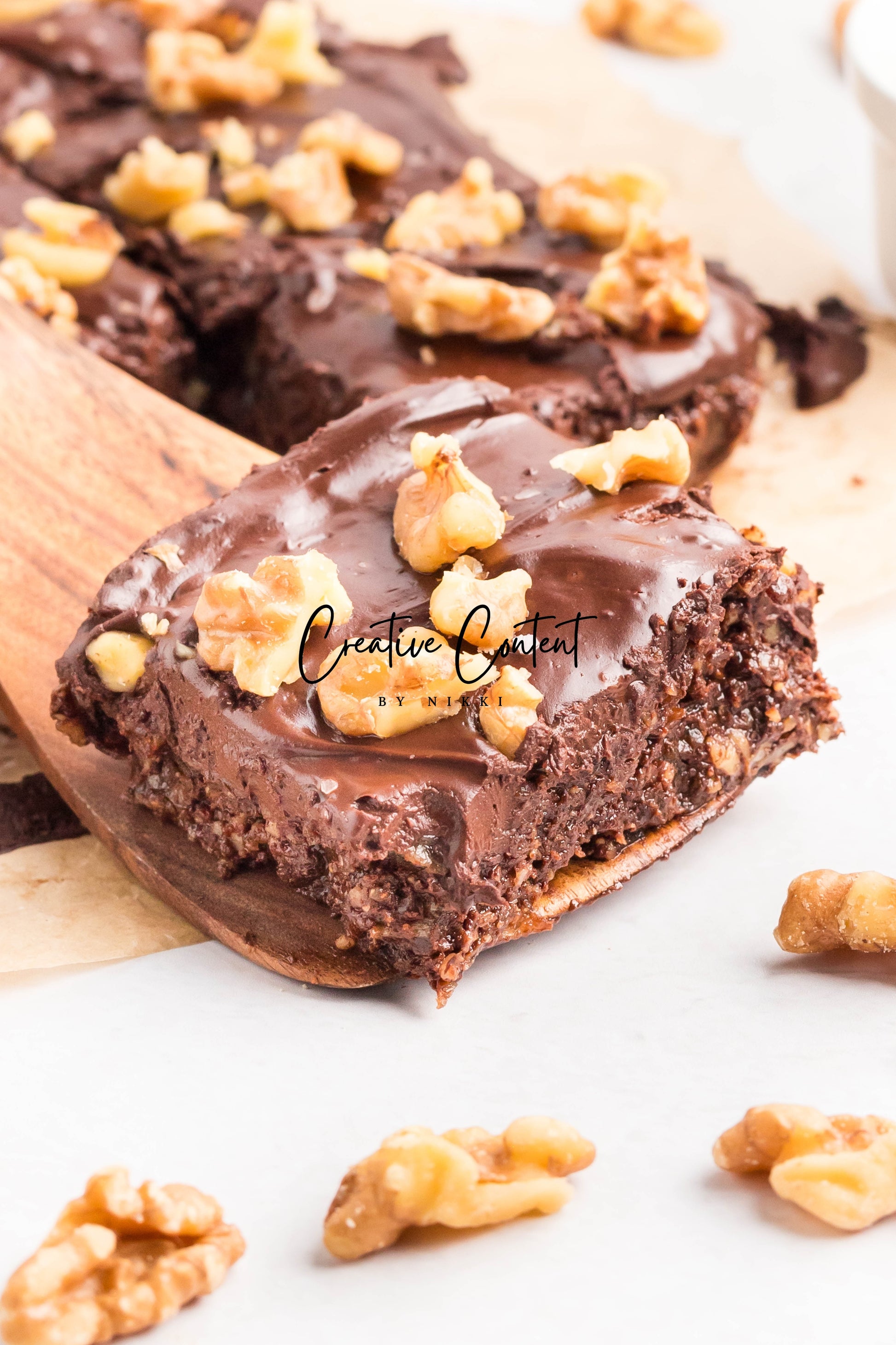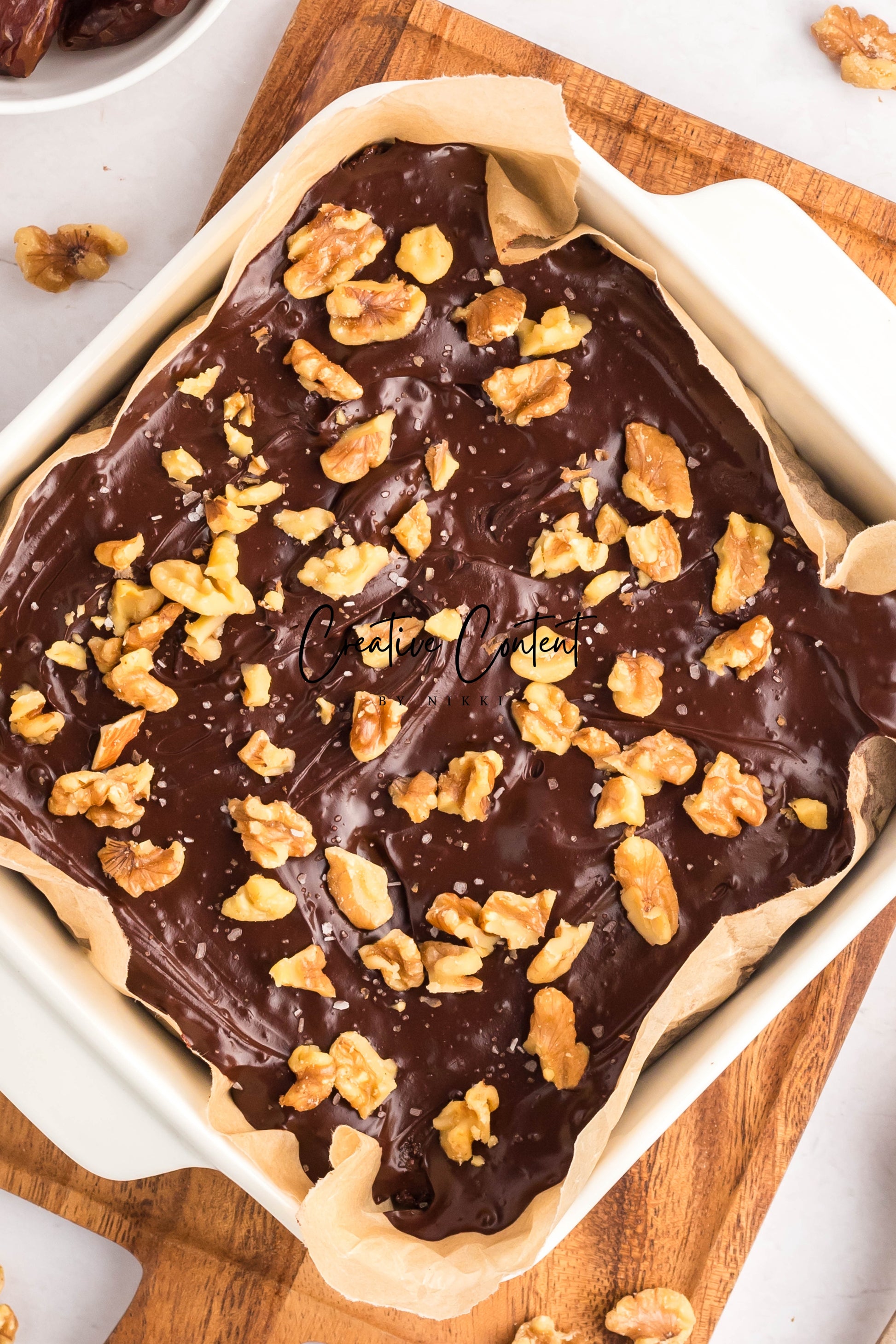 - Ingredients: dates, nut butter, cocoa powder, coconut cream, maple syrup, chopped walnuts