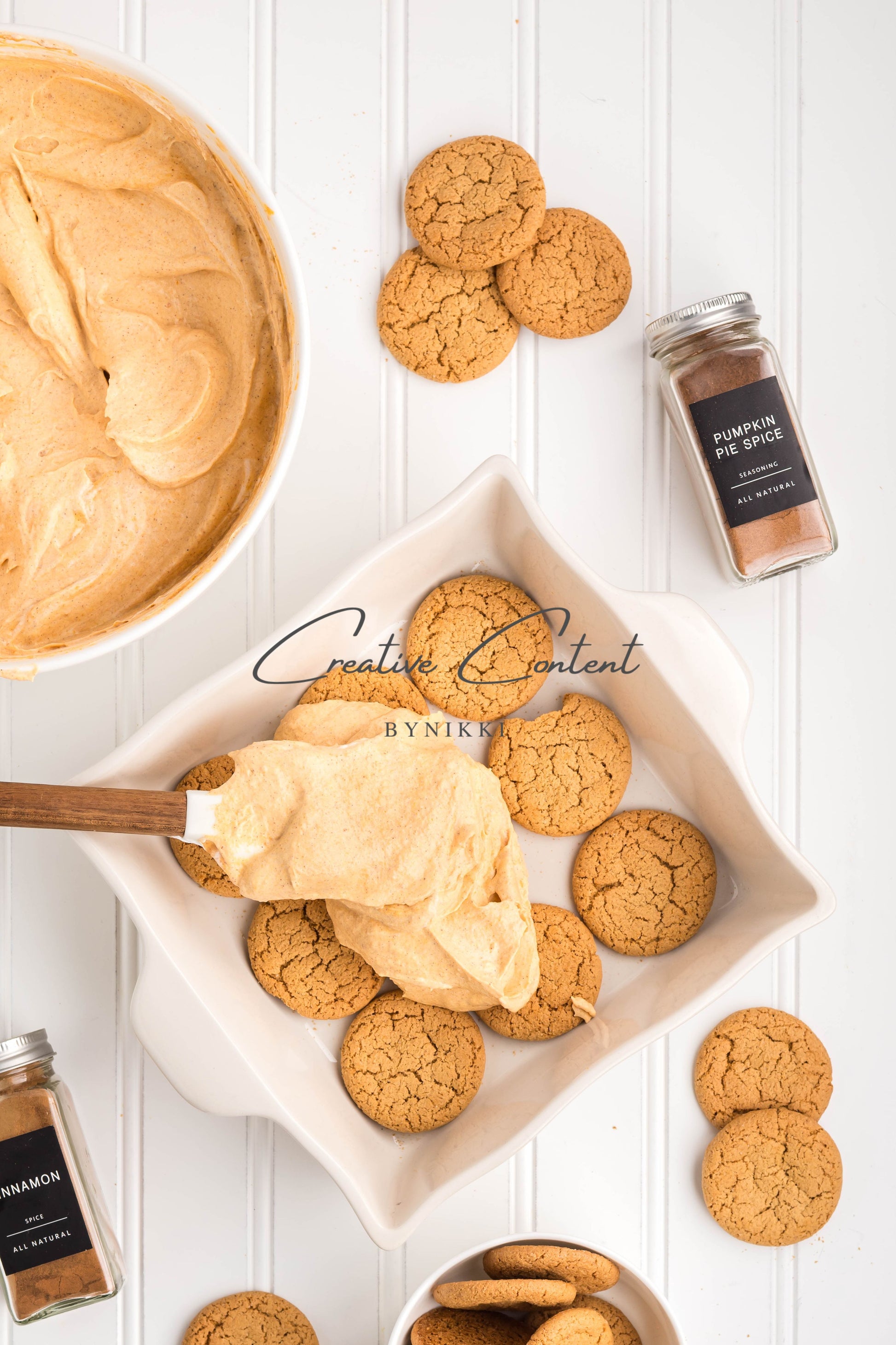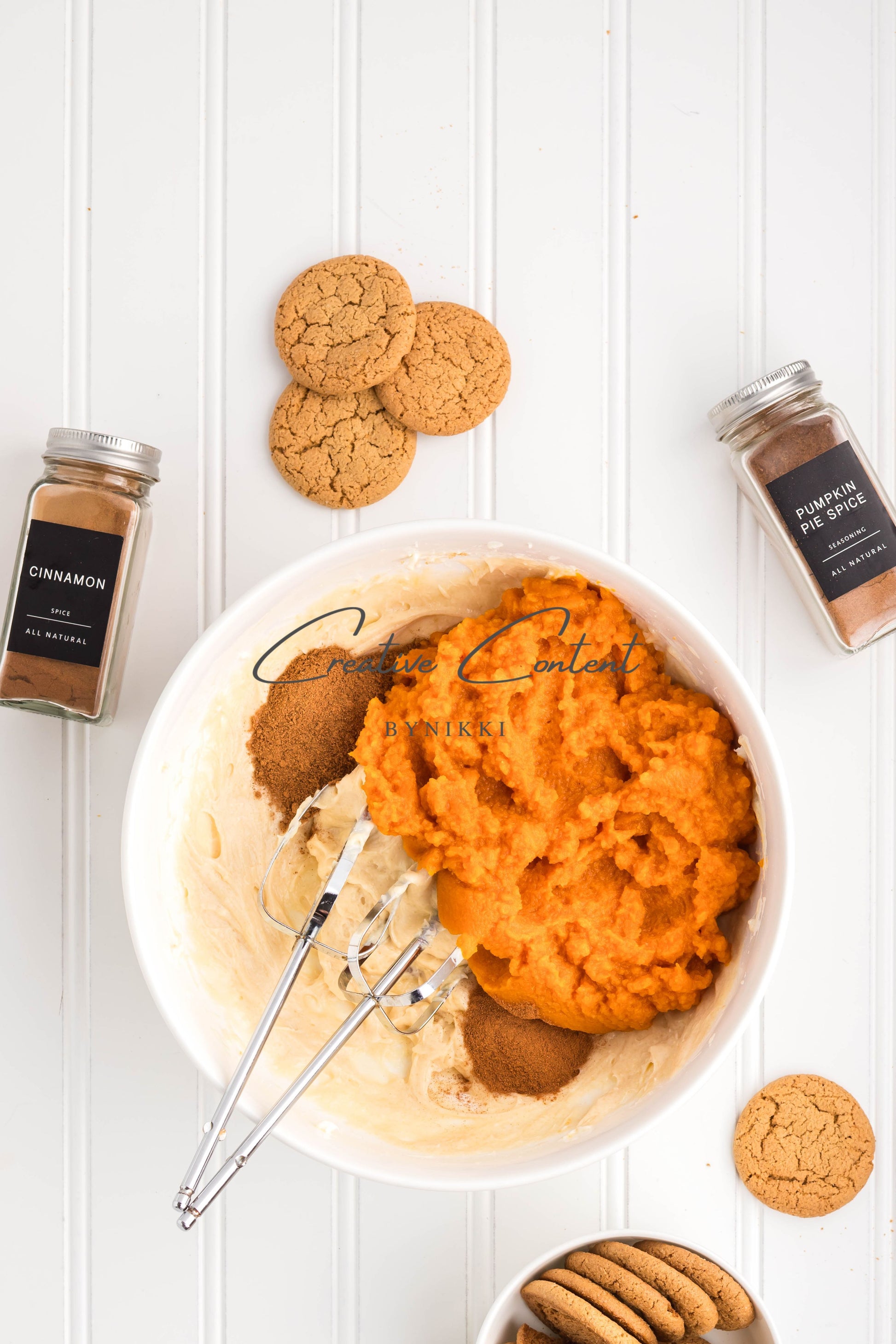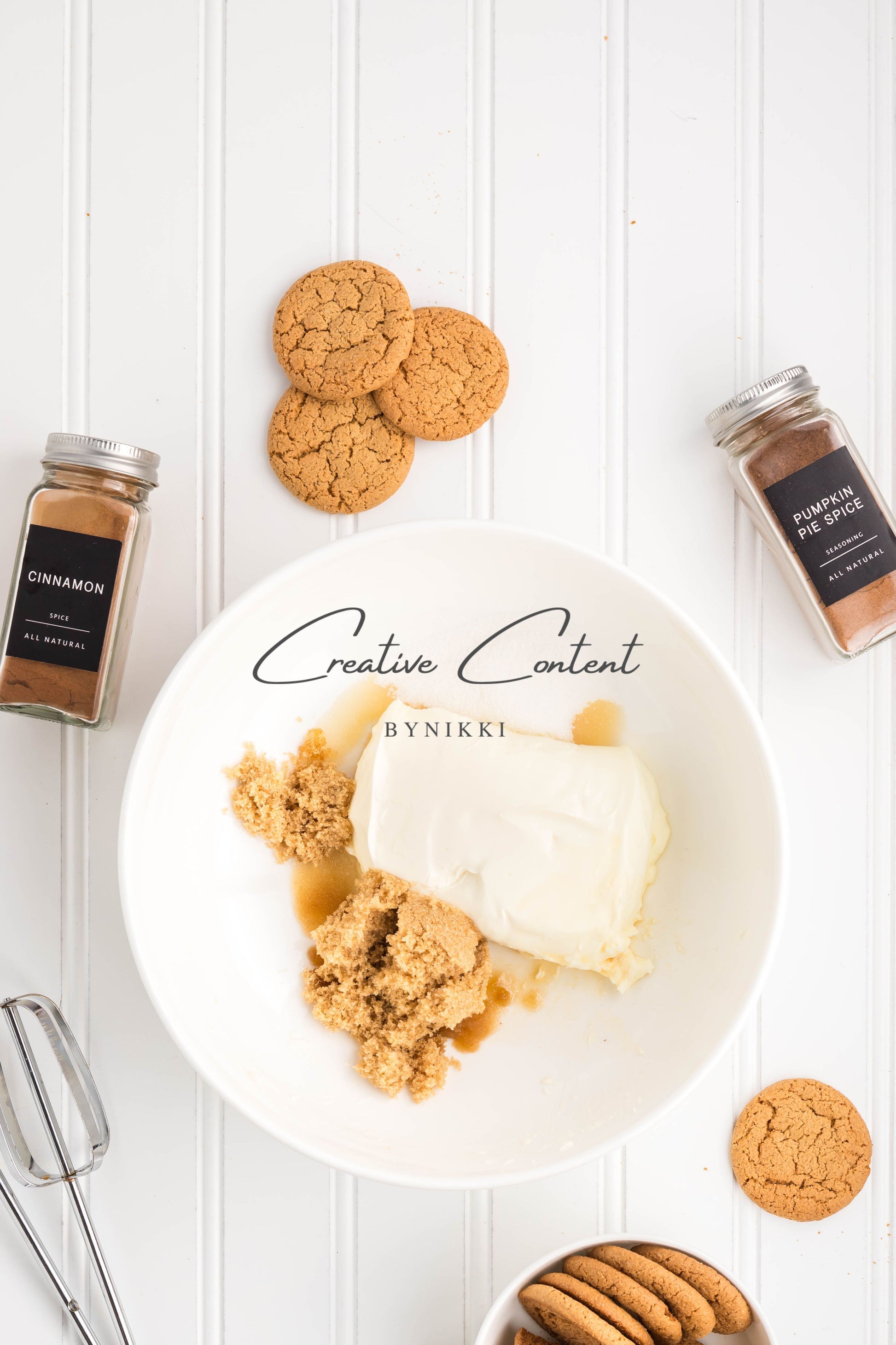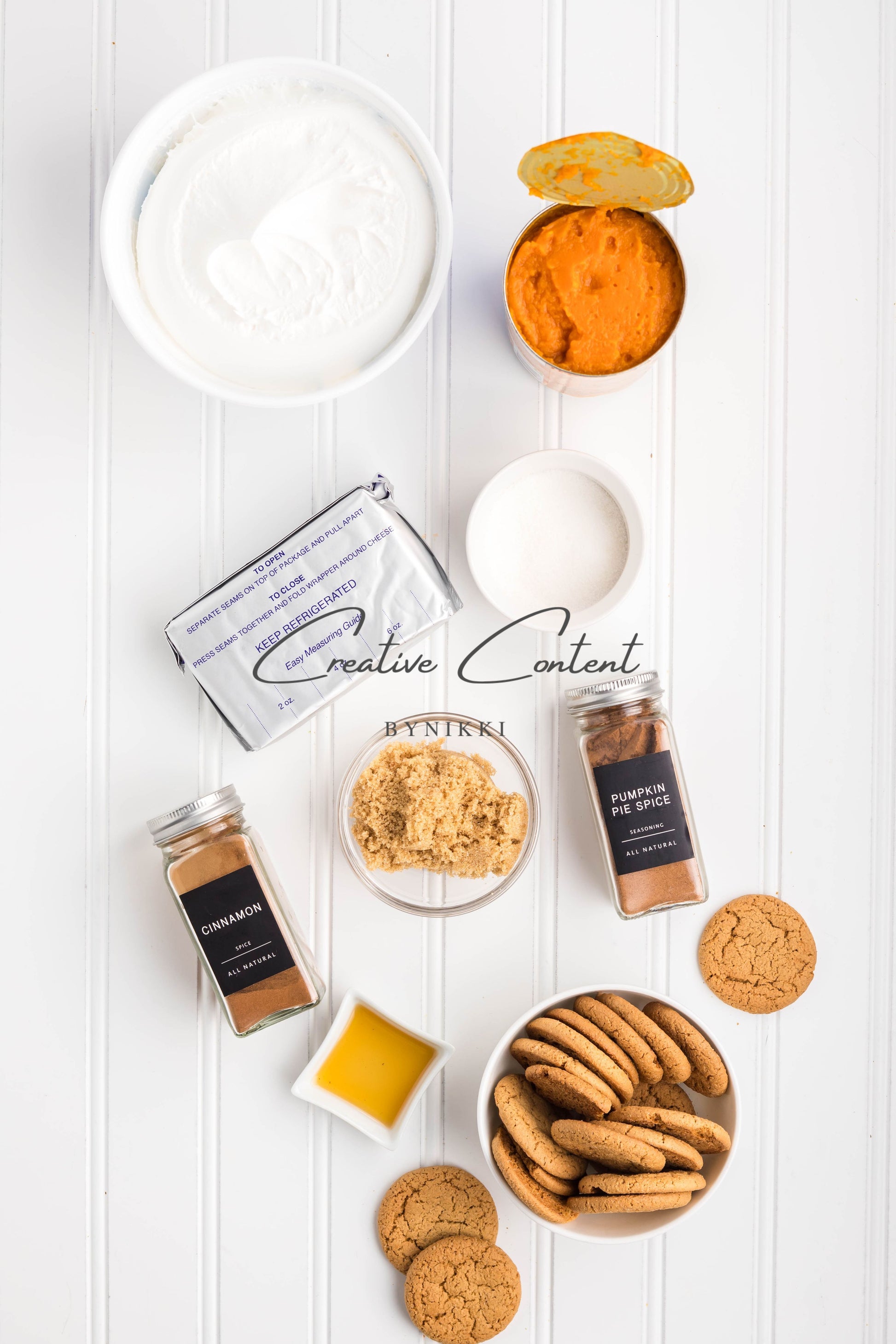 - Ingredients: cream cheese, brown sugar, white sugar, vanilla extract, pumpkin, pumpkin pie spice, cinnamon, cool whip, gingersnaps
