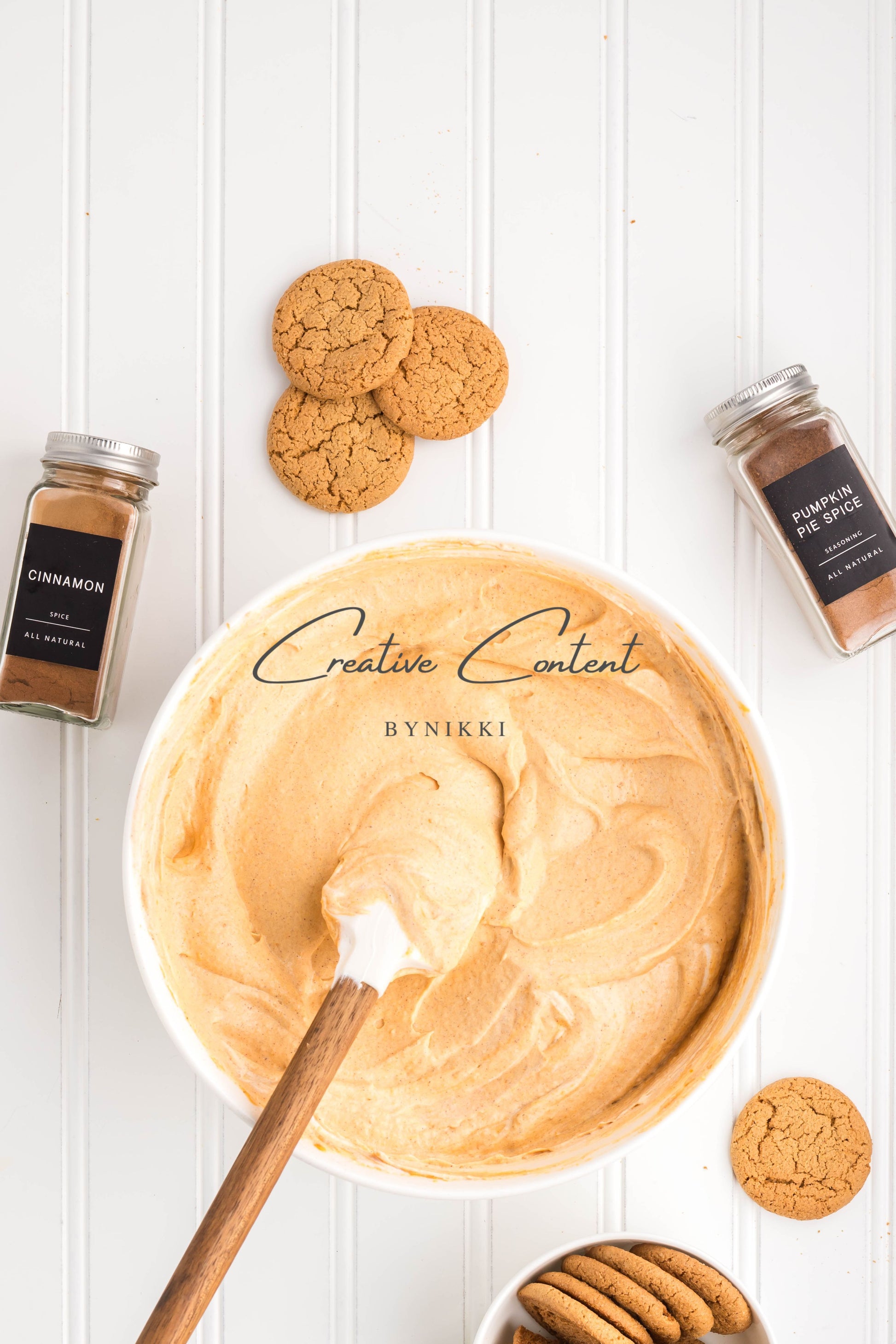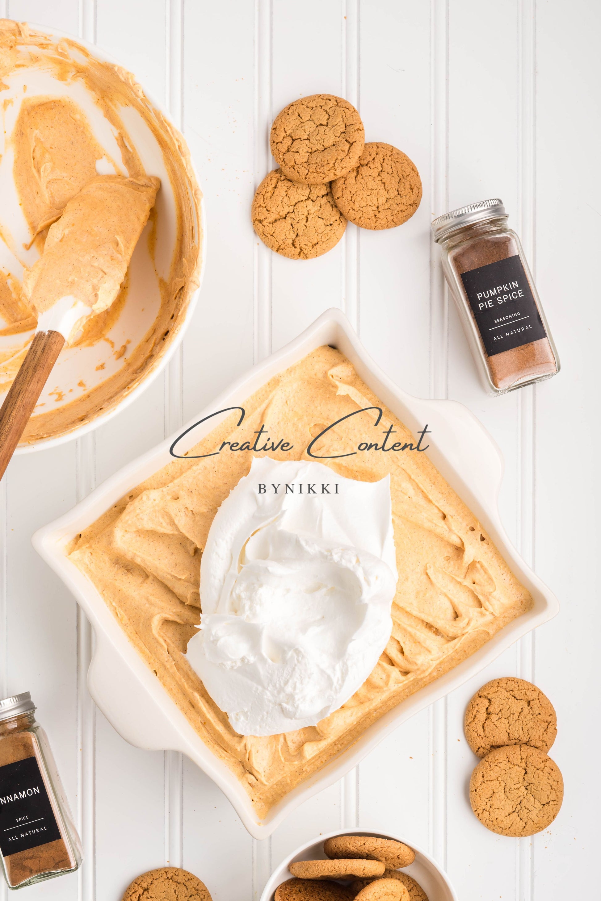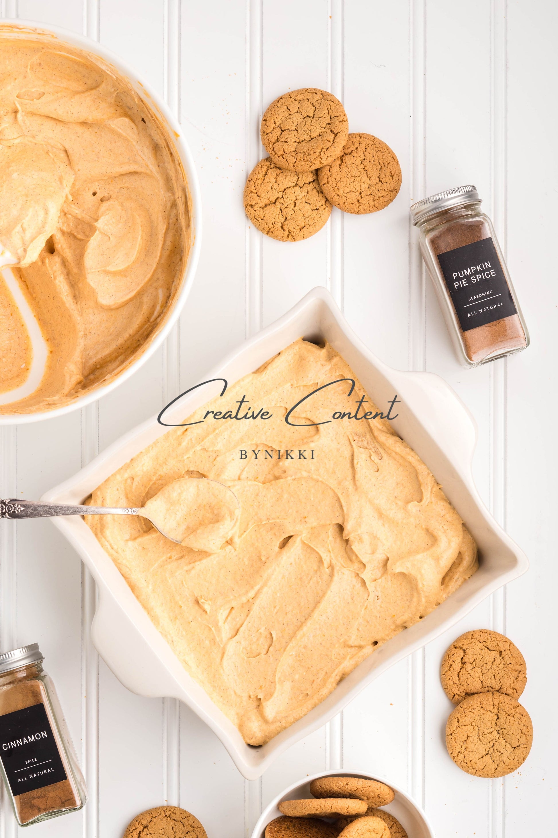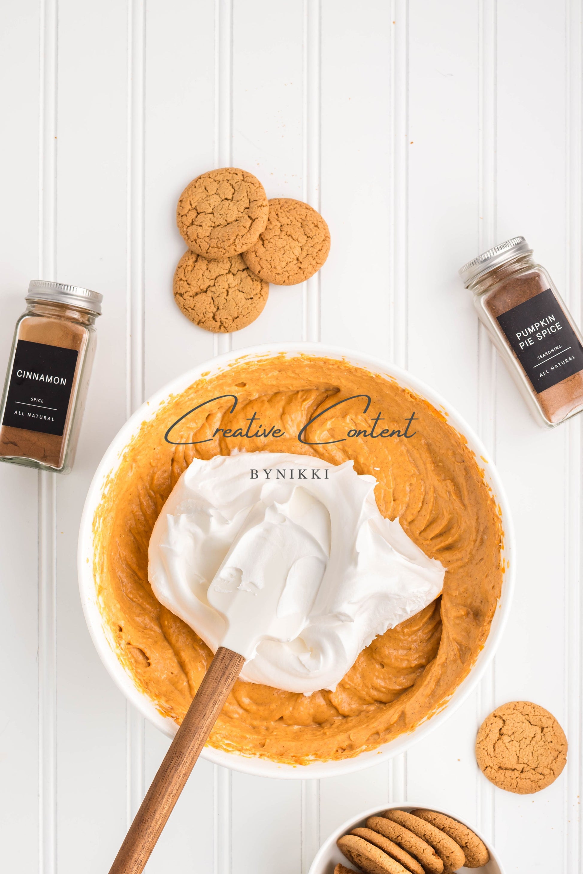 - Ingredients: cream cheese, brown sugar, white sugar, vanilla extract, pumpkin, pumpkin pie spice, cinnamon, cool whip, gingersnaps