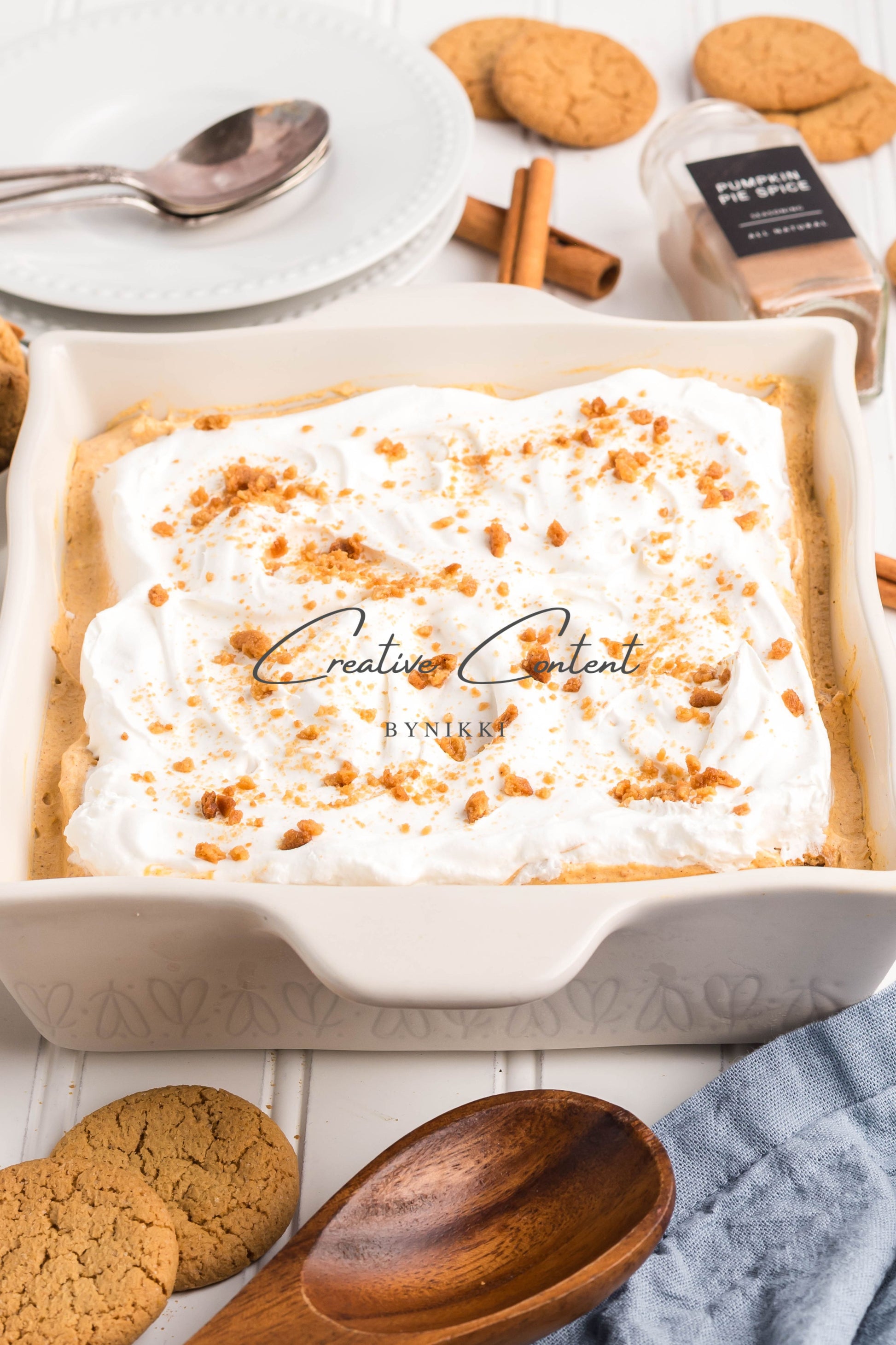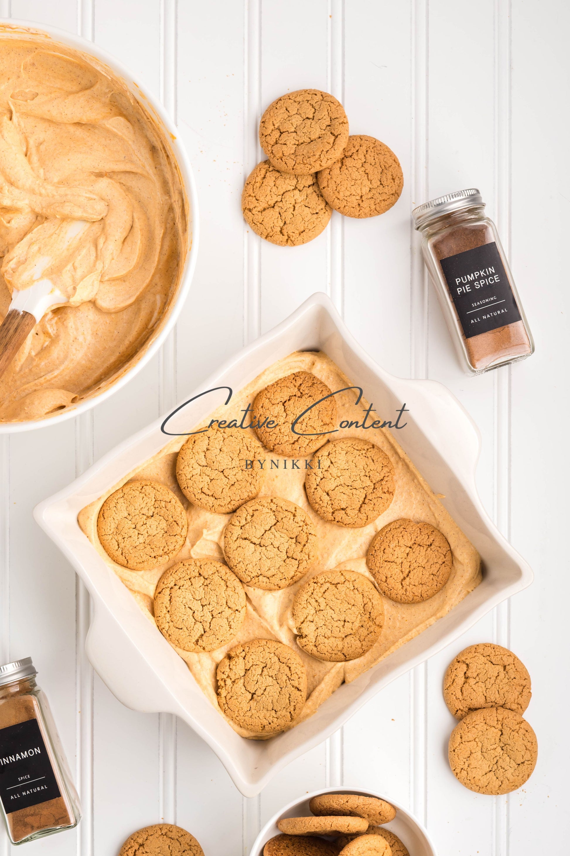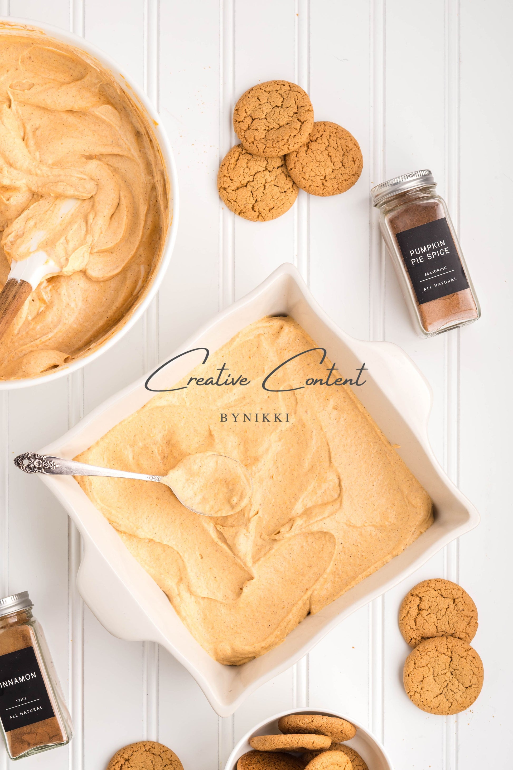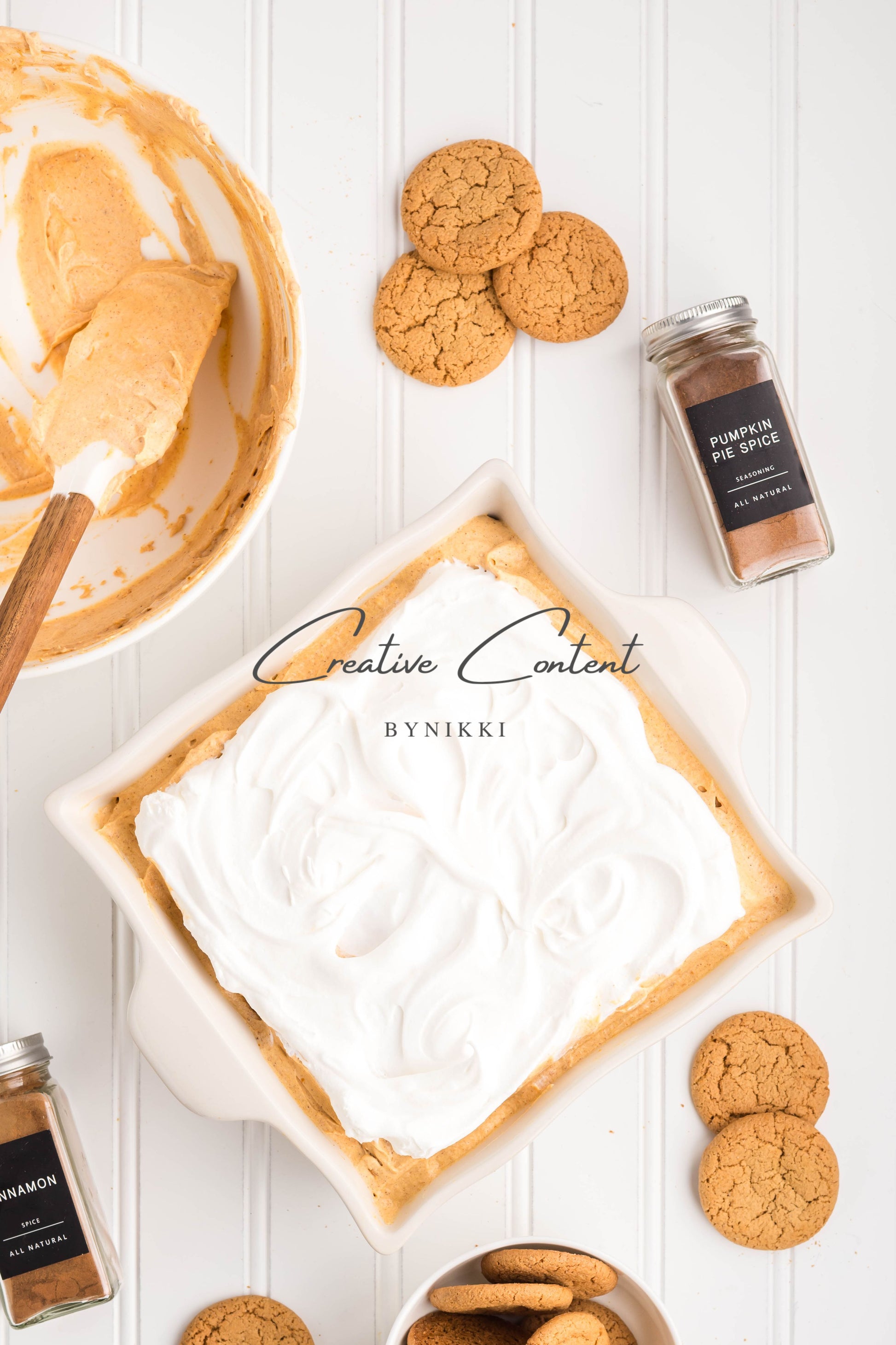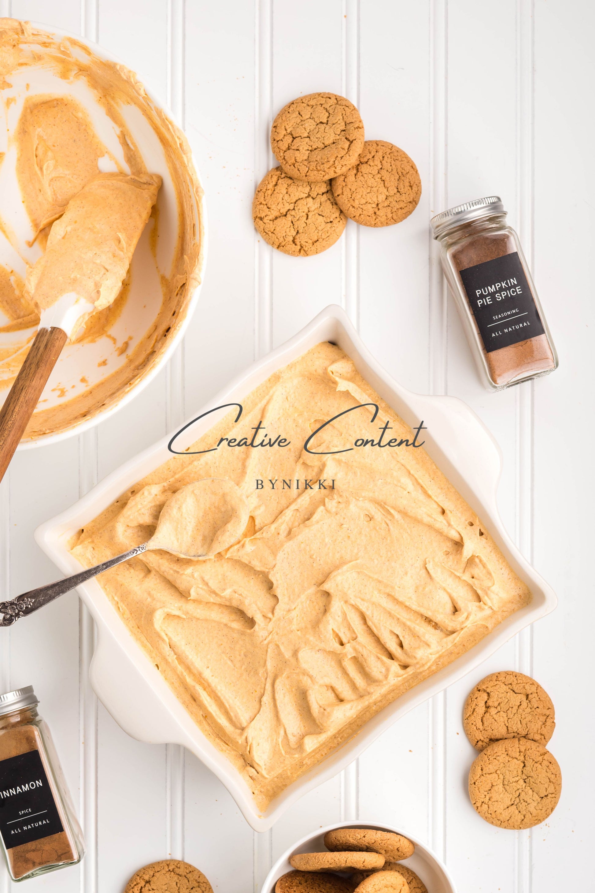 - Ingredients: cream cheese, brown sugar, white sugar, vanilla extract, pumpkin, pumpkin pie spice, cinnamon, cool whip, gingersnaps