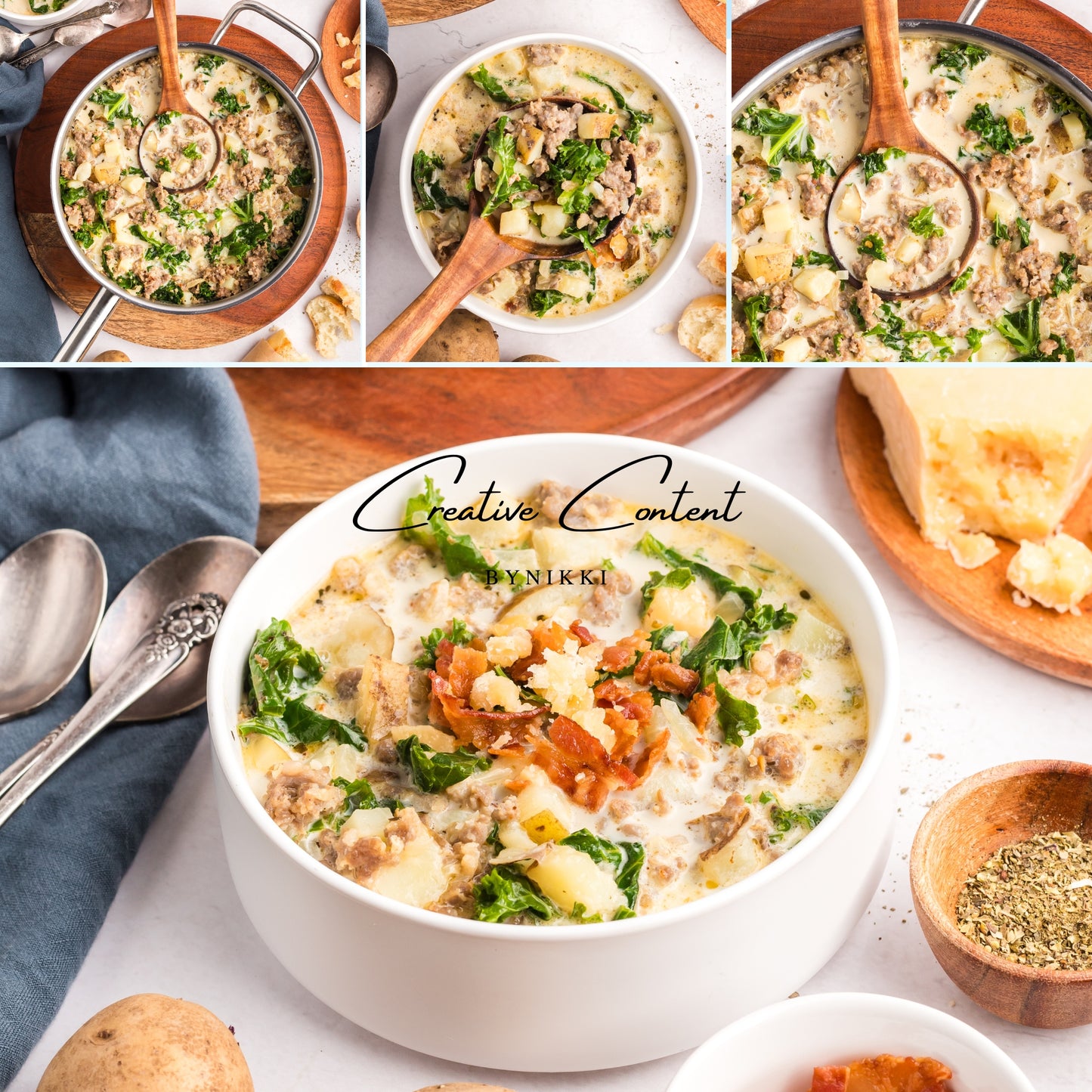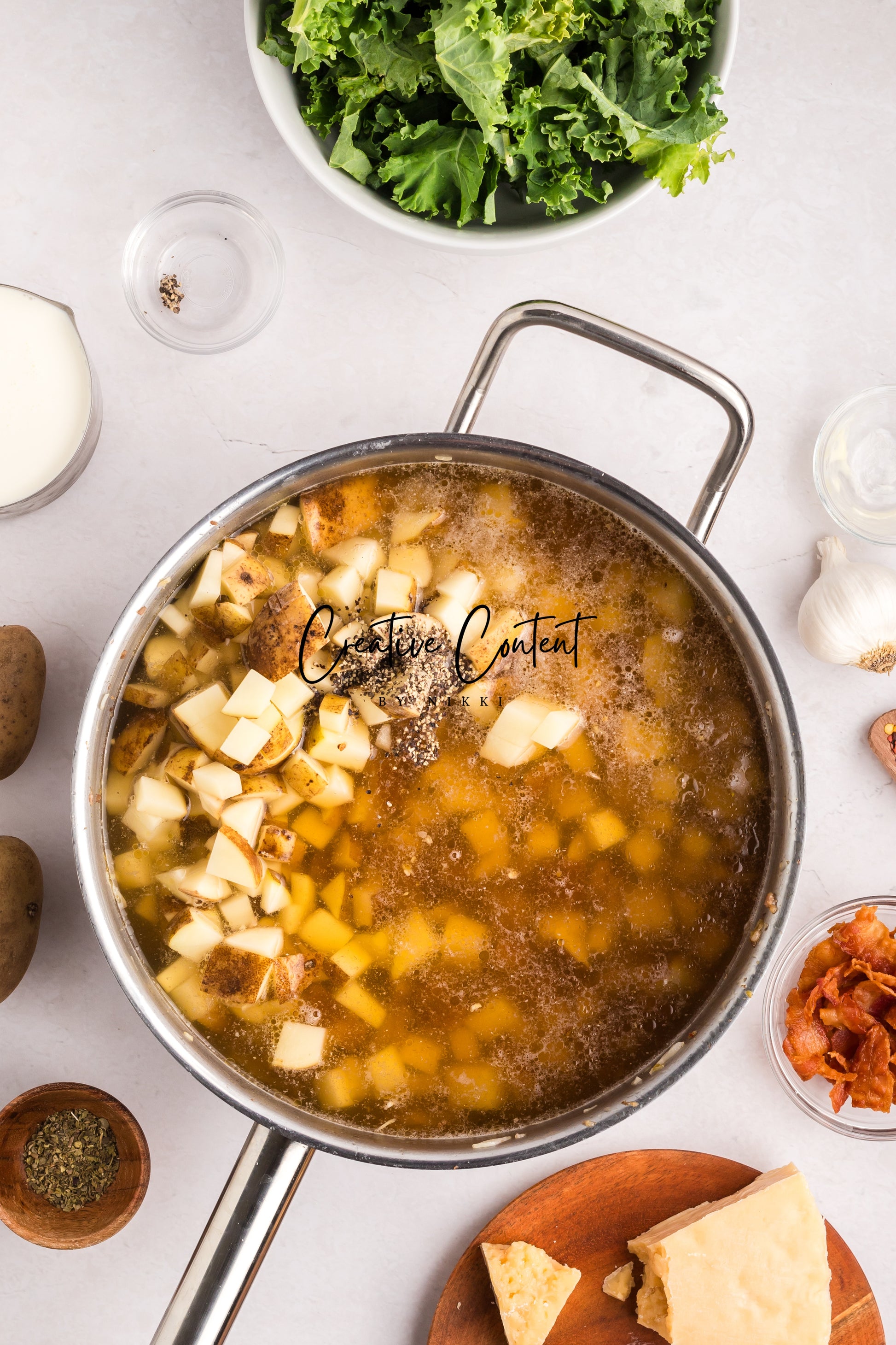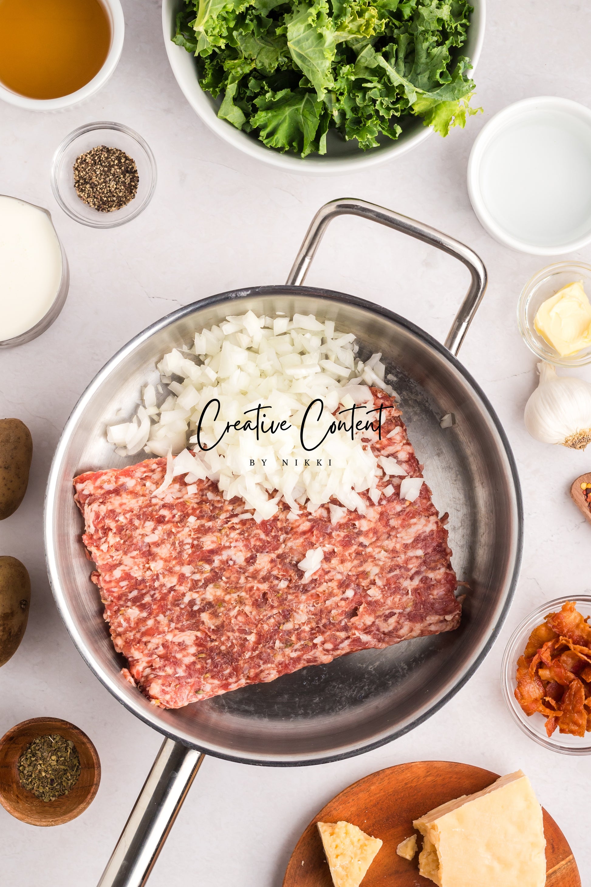 - Featured Ingredients; Italian sausage, yellow onion, garlic cloves, unsalted butter, chicken broth, water, russet potatoes, seasonings, kale, heavy cream, bacon, and parmesan cheese.