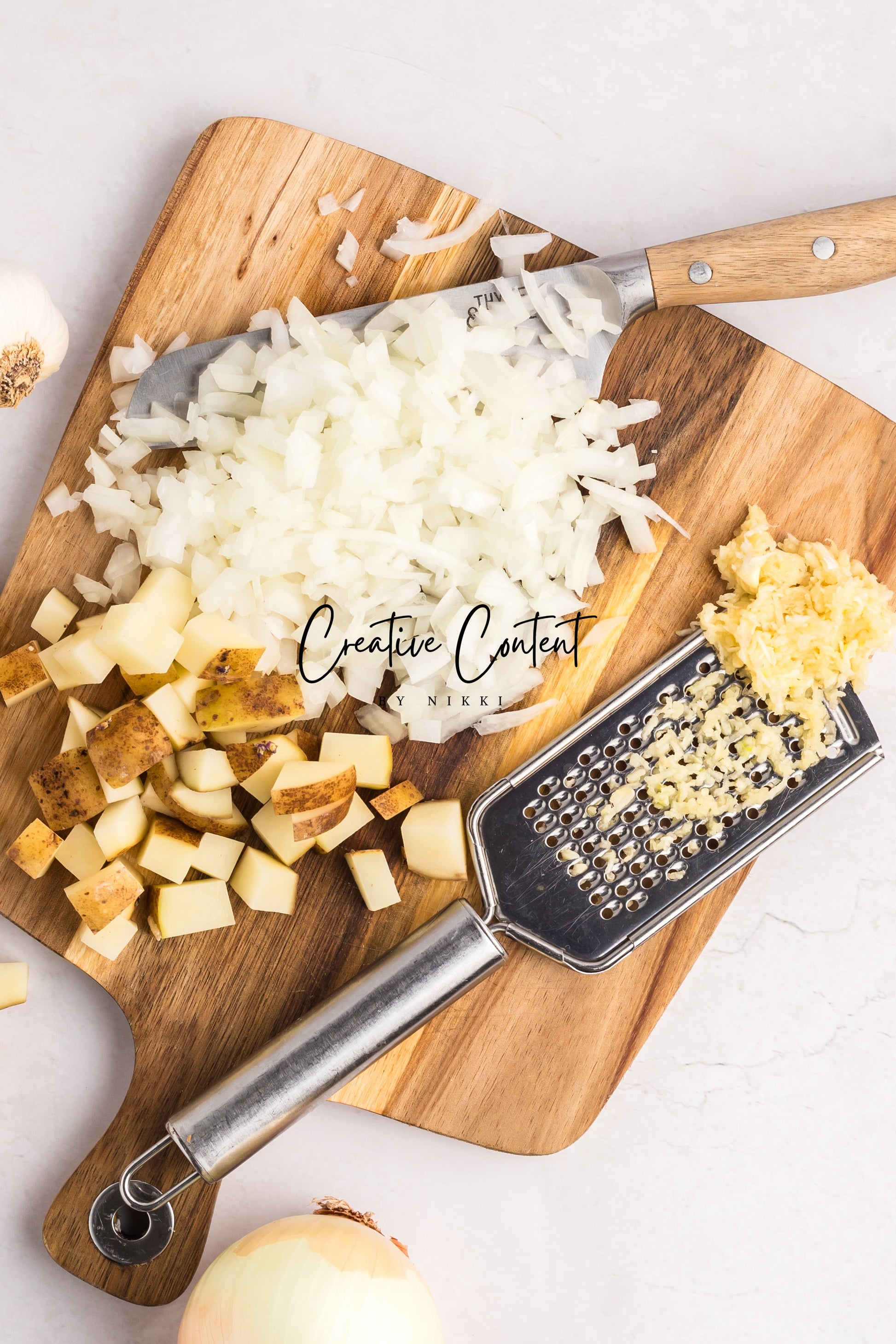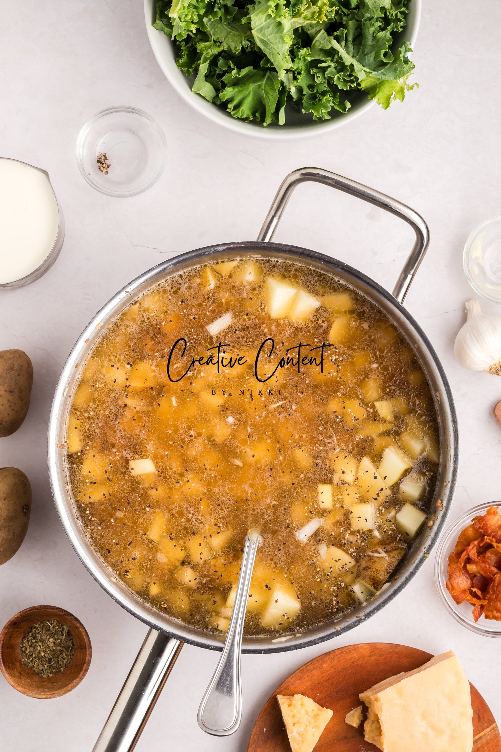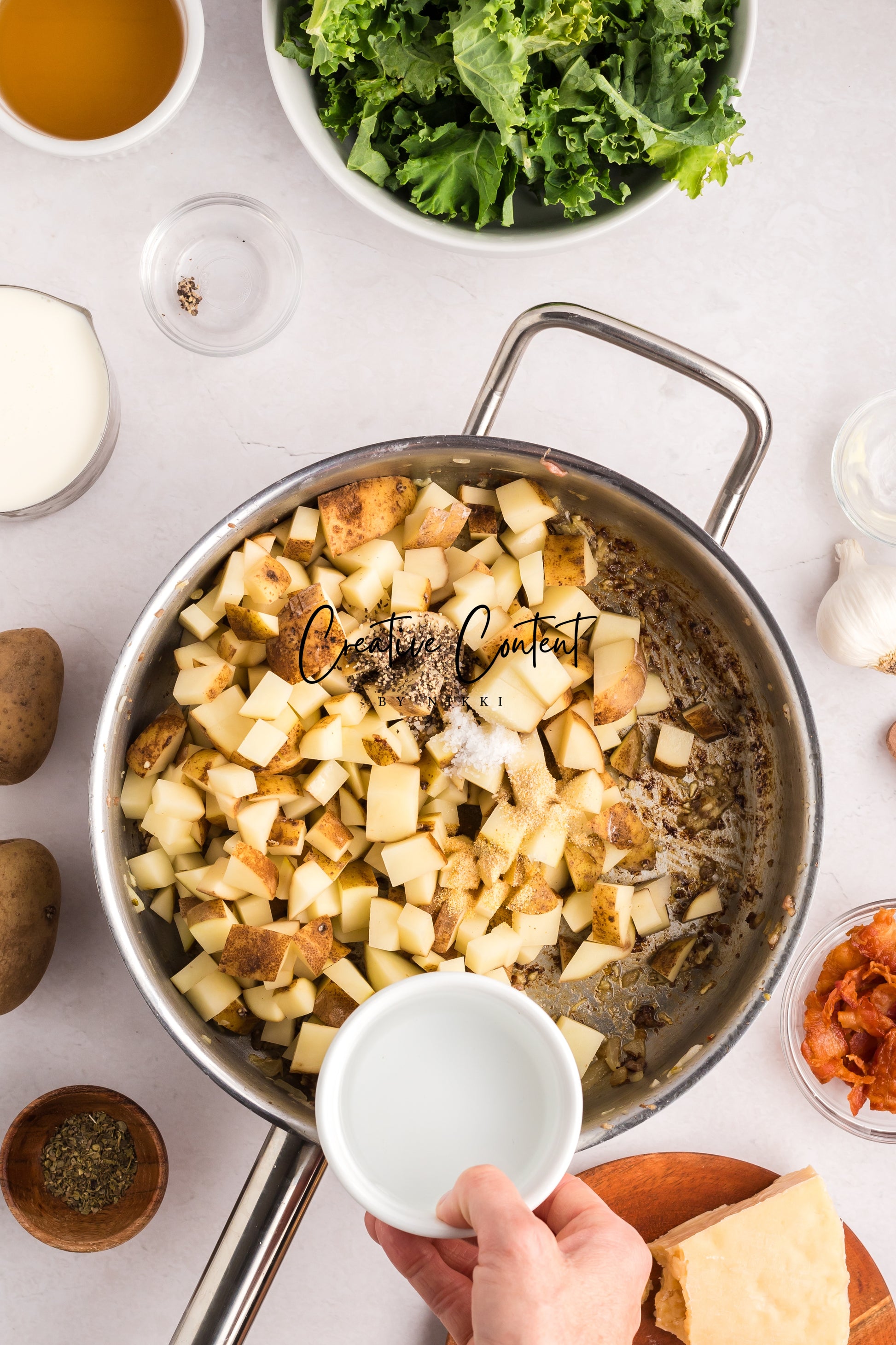 - Featured Ingredients; Italian sausage, yellow onion, garlic cloves, unsalted butter, chicken broth, water, russet potatoes, seasonings, kale, heavy cream, bacon, and parmesan cheese.