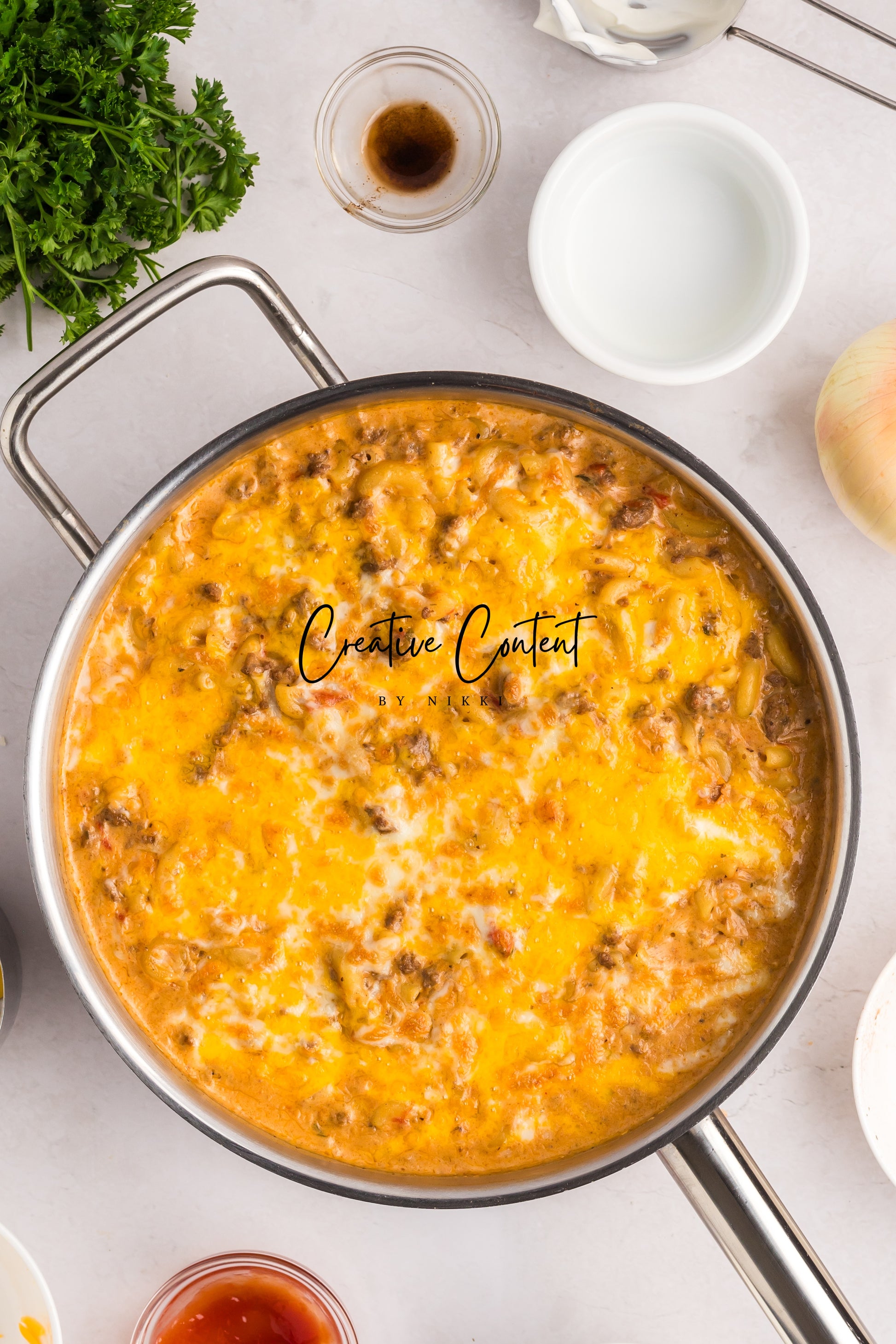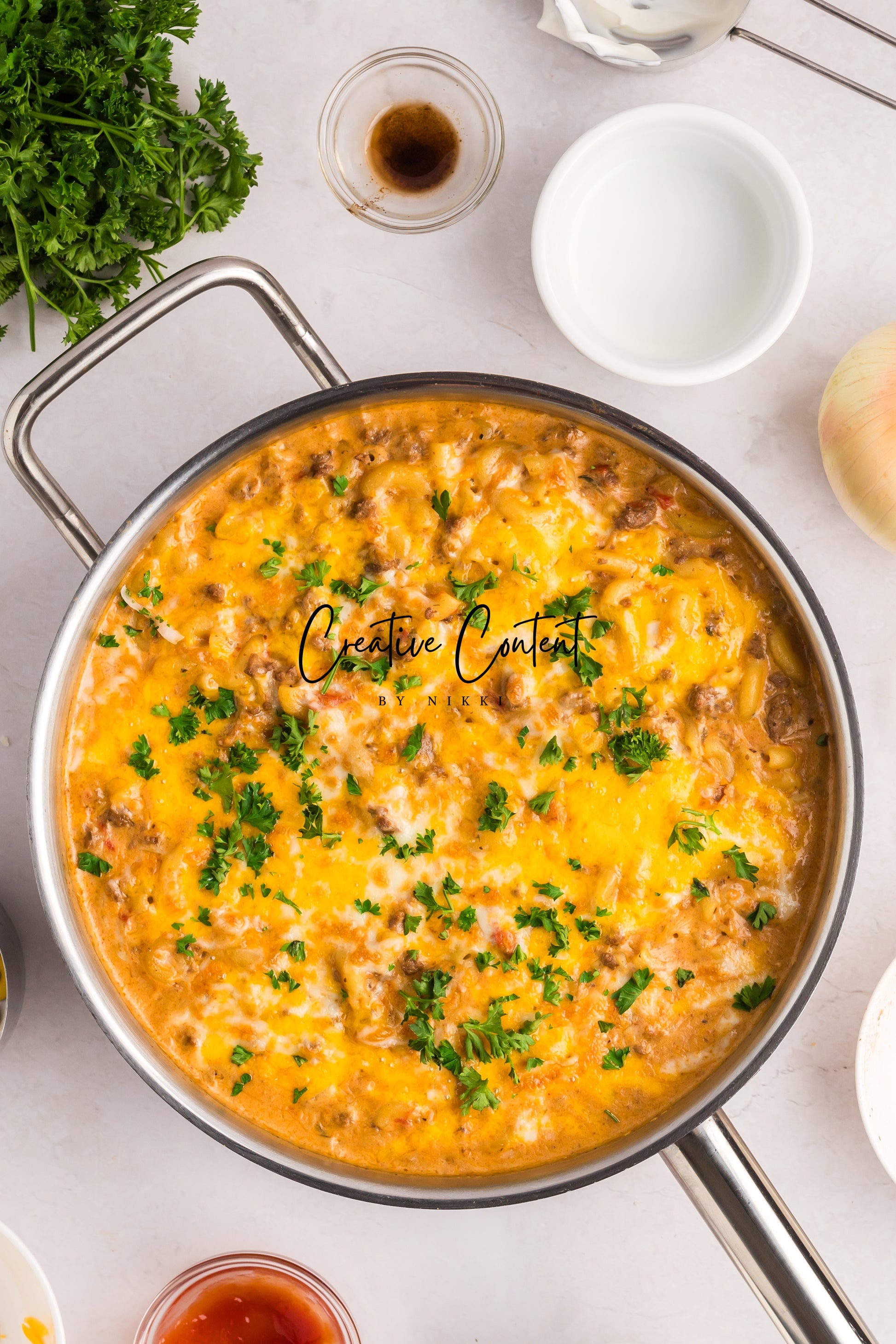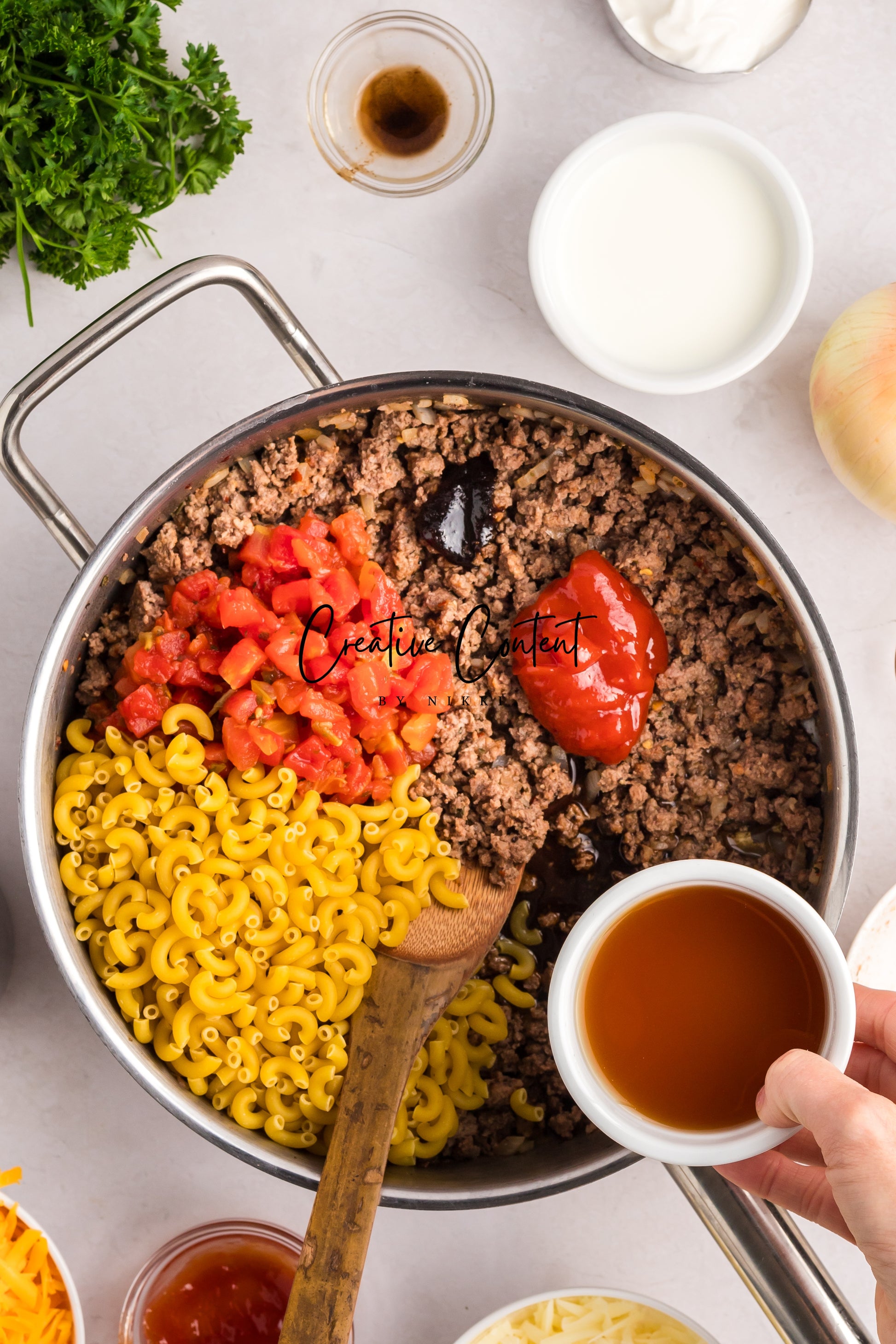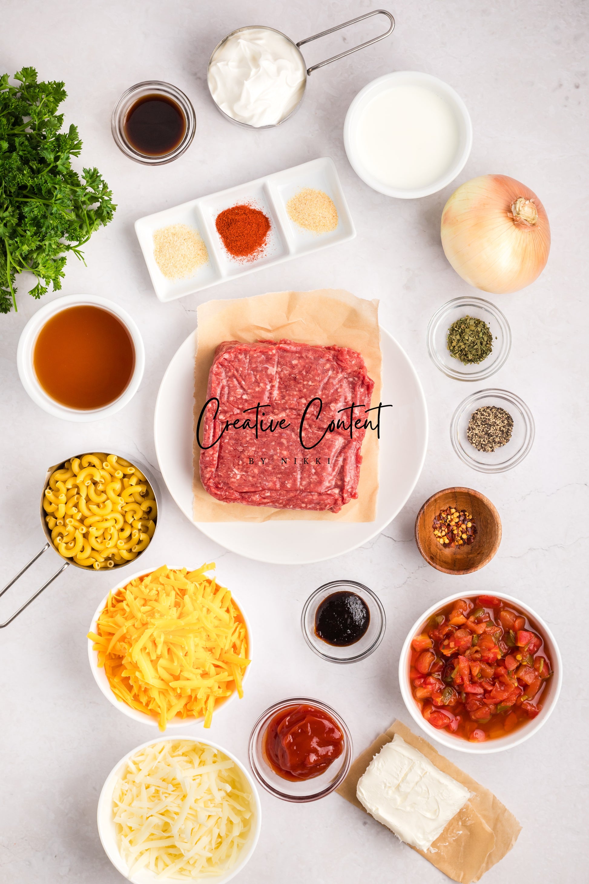 - Featured Ingredients; ground beef, yellow onion, seasonings, beef broth, petite diced tomatoes, Better Than Bouillon, elbow macaroni, ketchup, Worcestershire sauce, cream cheese, sour cream, whole milk, cheddar cheese, mozzarella cheese, and parsley